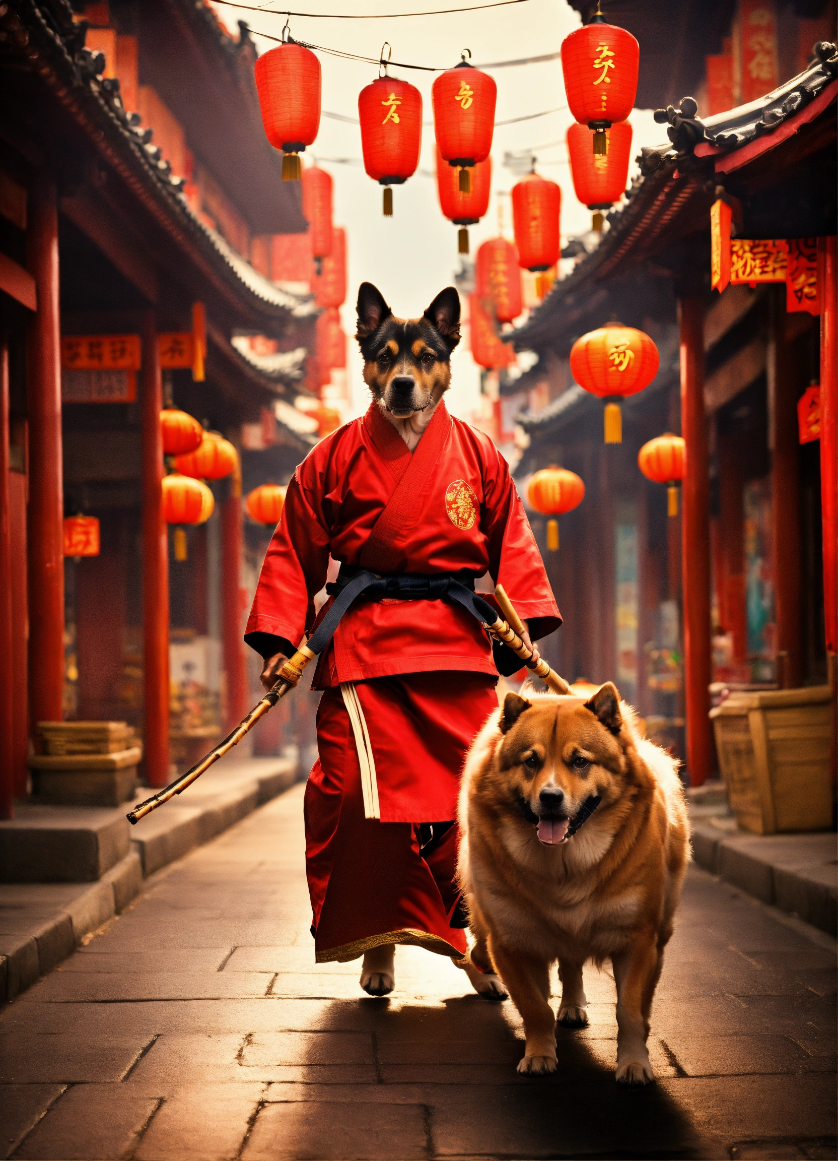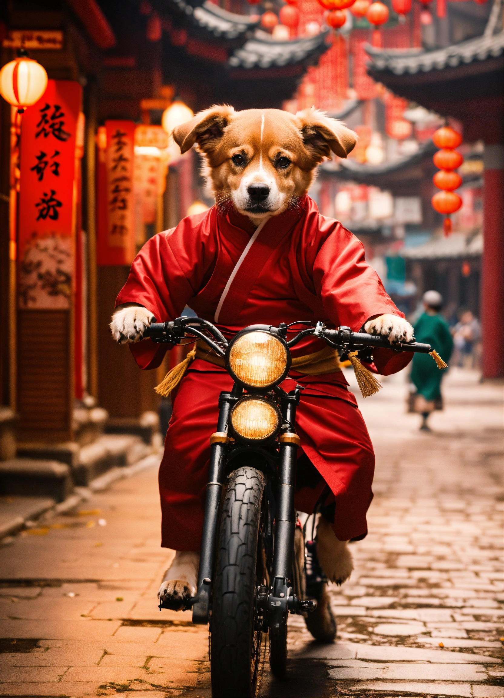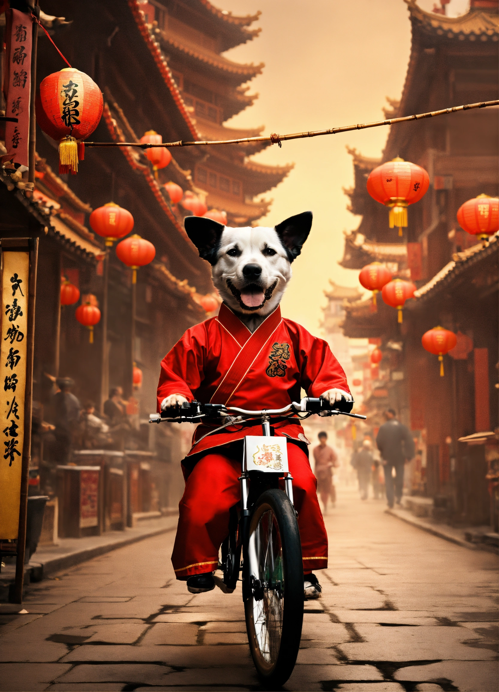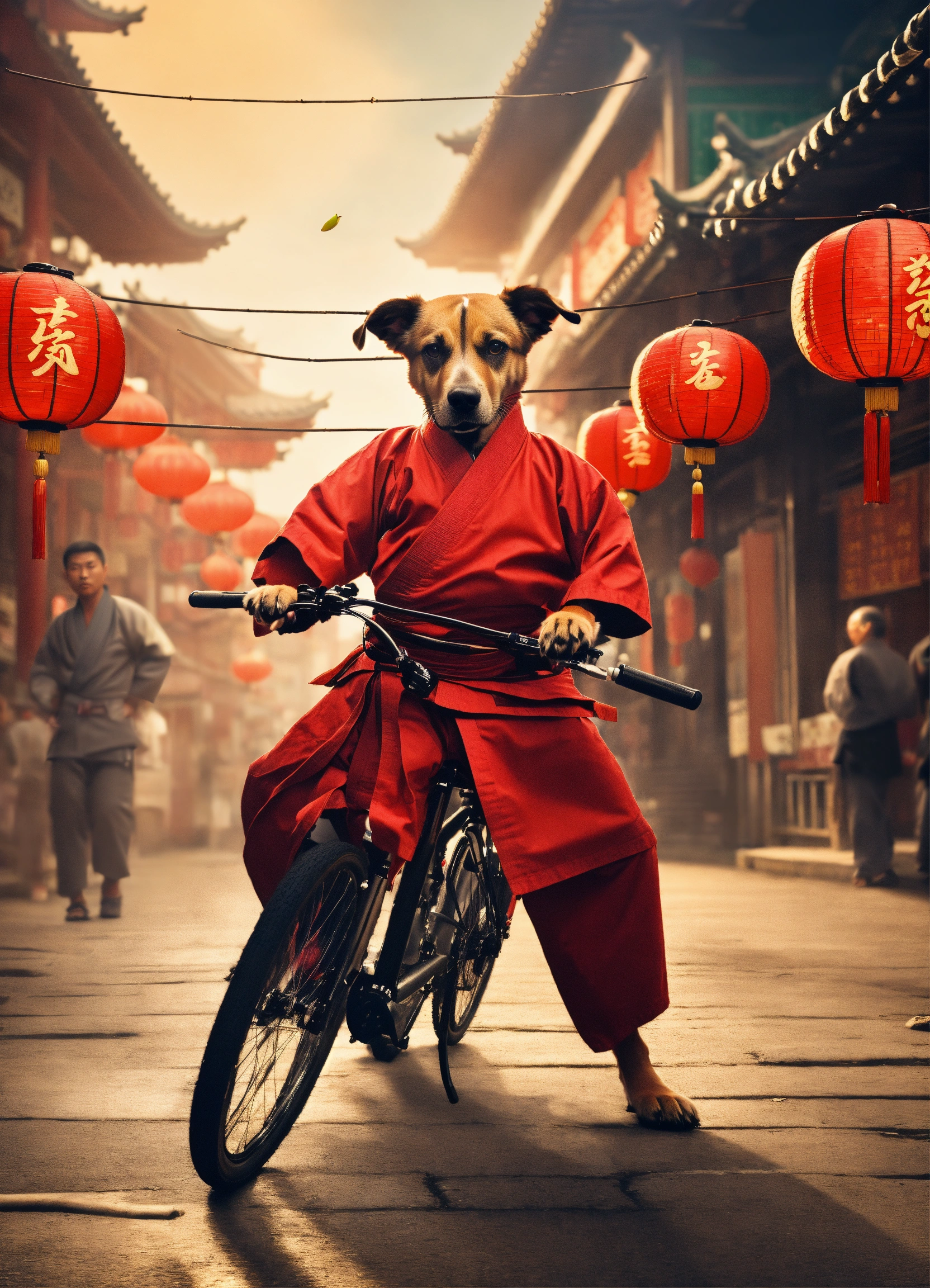 Create a picture of a dog biking through a bustling chinatown as a martial arts master, dressed in a martial arts uniform, with a bamboo staff.