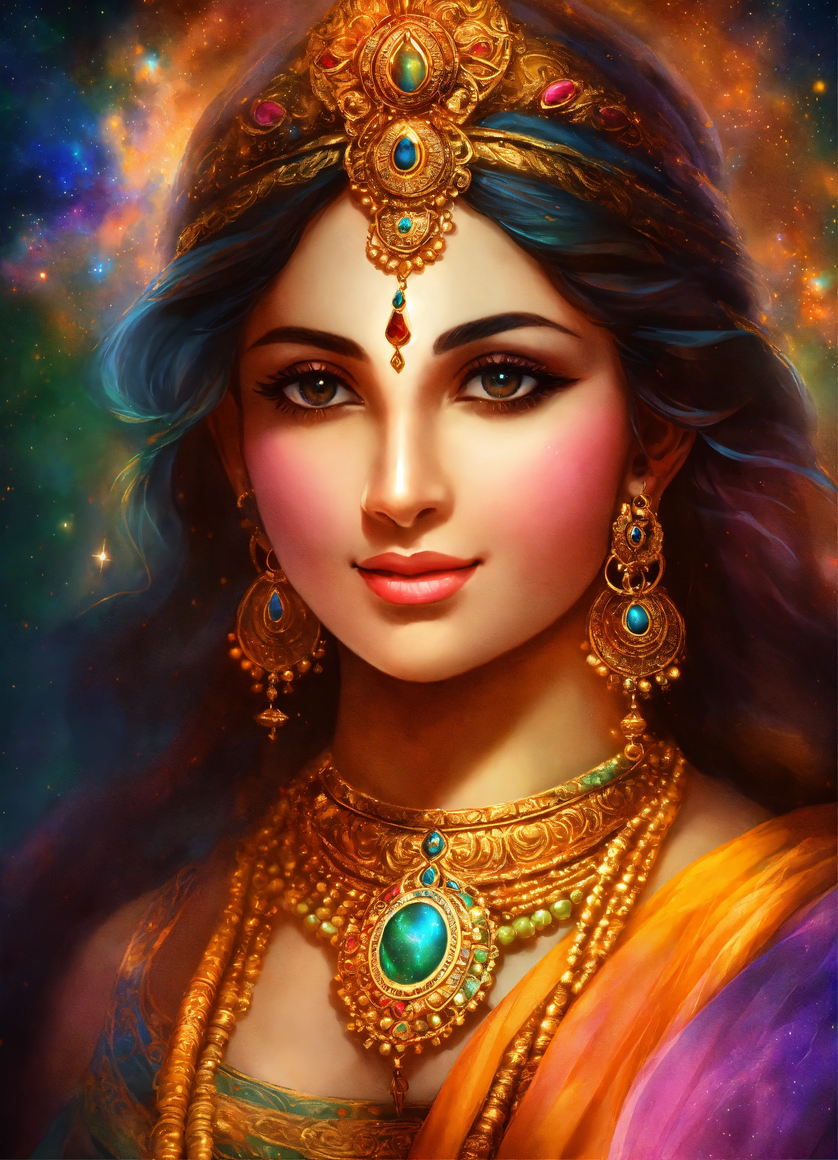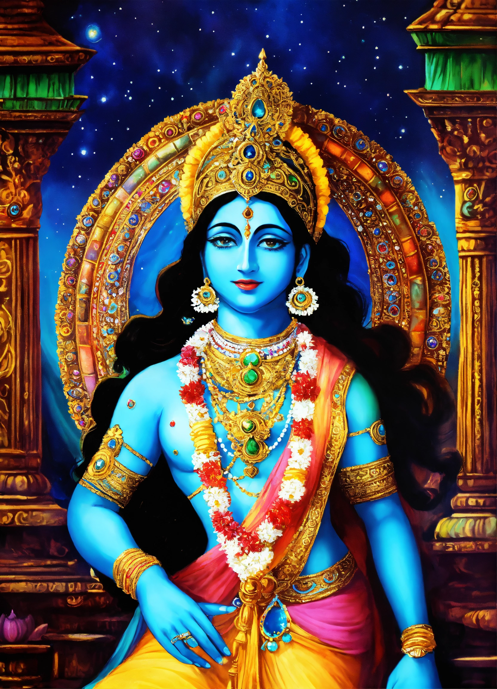 Lord krishna and goddess radha are even more enchanting. lord krishna appears as a cosmic wanderer, his skin reflecting the hues of galaxies, and his attire made of stardust. he wields a celestial flute whose music resonates through the cosmos, drawing all creation toward him. goddess radha, in this divine manifestation, is the very essence of love itself. she is cloaked in the colors of the aurora borealis, and her radiant beauty outshines a thousand suns. together, they dance across the celestial realms, creating a cosmic symphony of love and devotion that resonates throughout the universe, drawing the hearts of all beings into their celestial embrace.