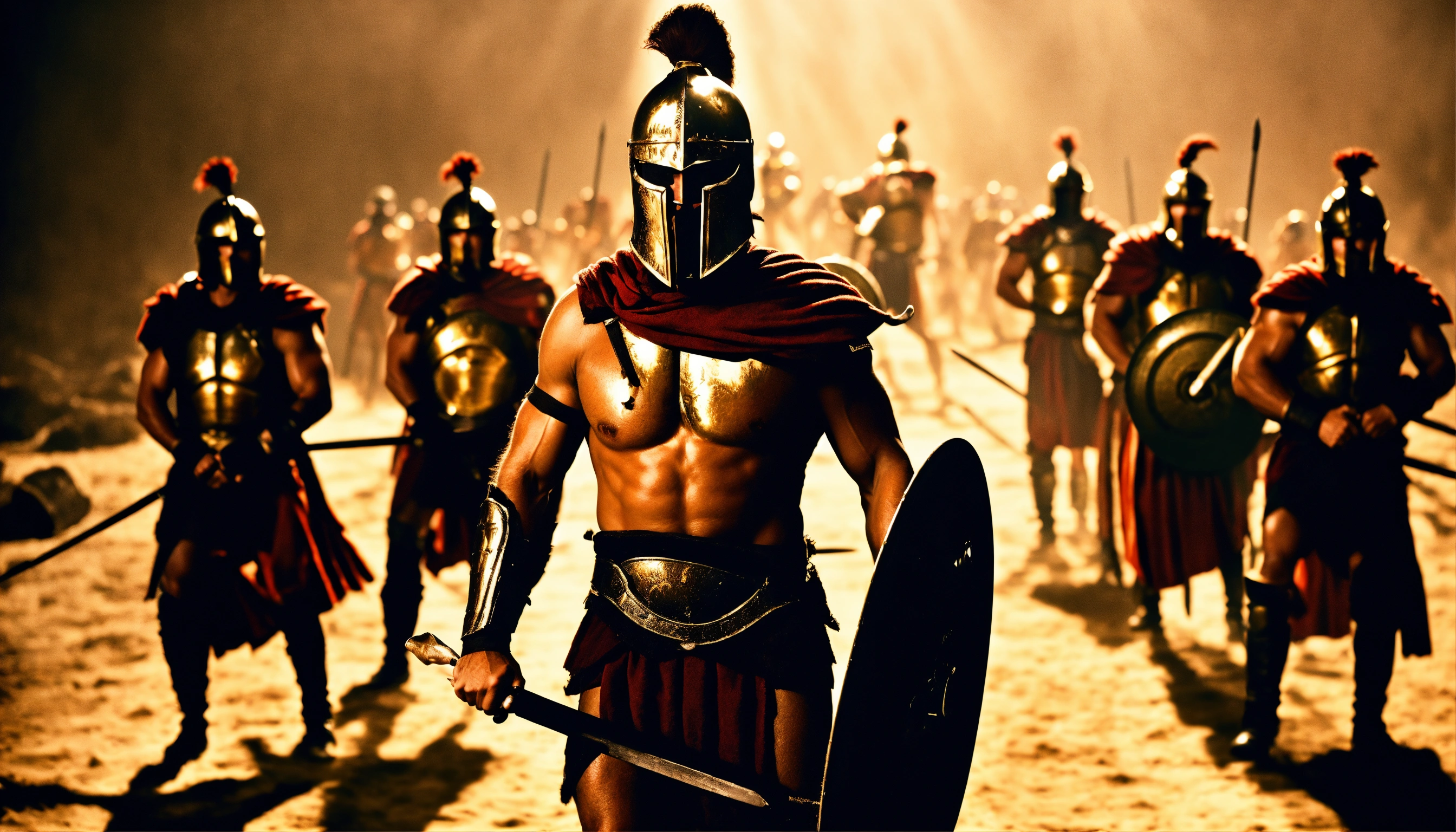 Produce me an image of spartans readies to fight, movie image, filtered through spotlight. ensure high resolution, 8k image, realistic.