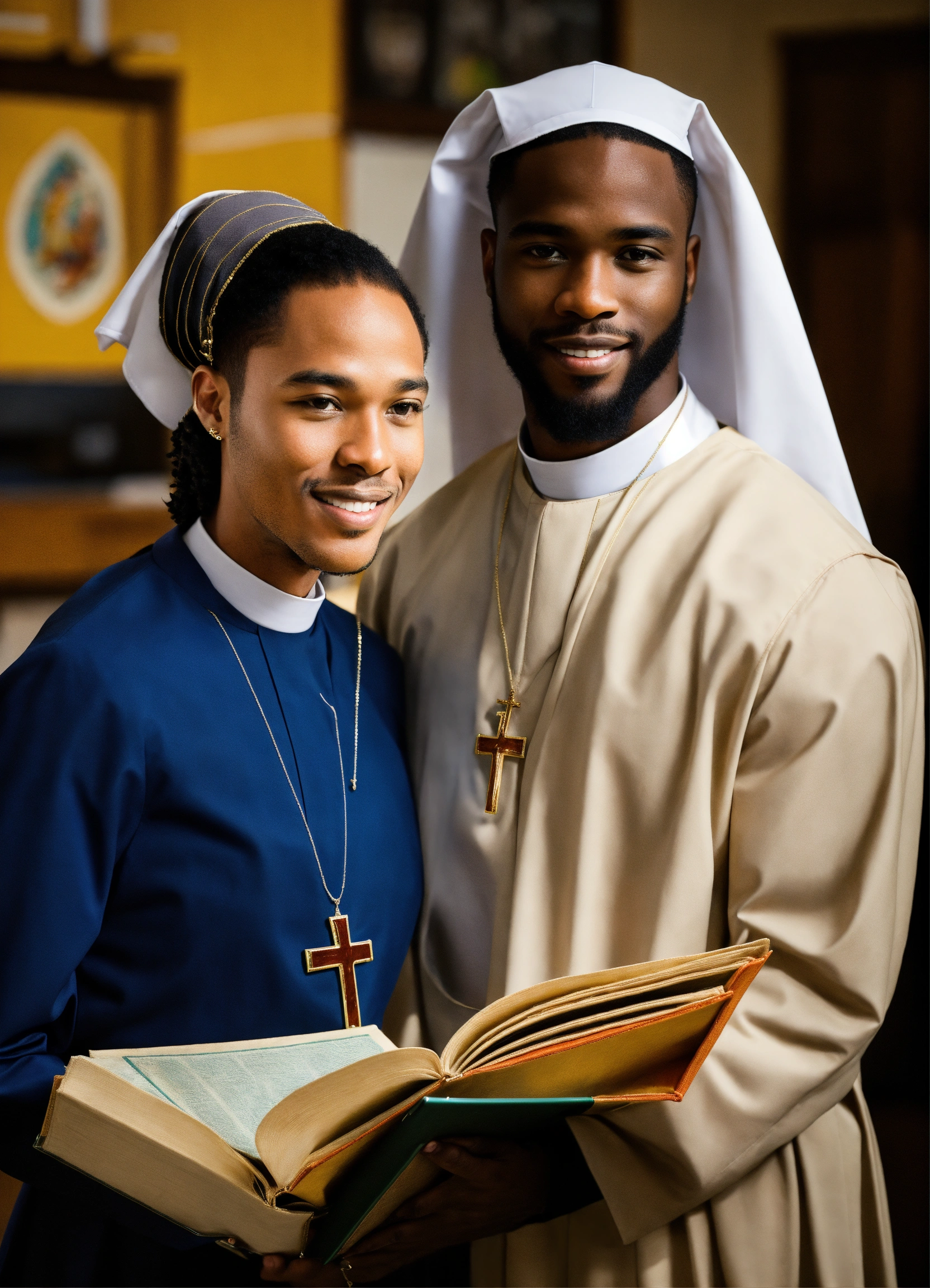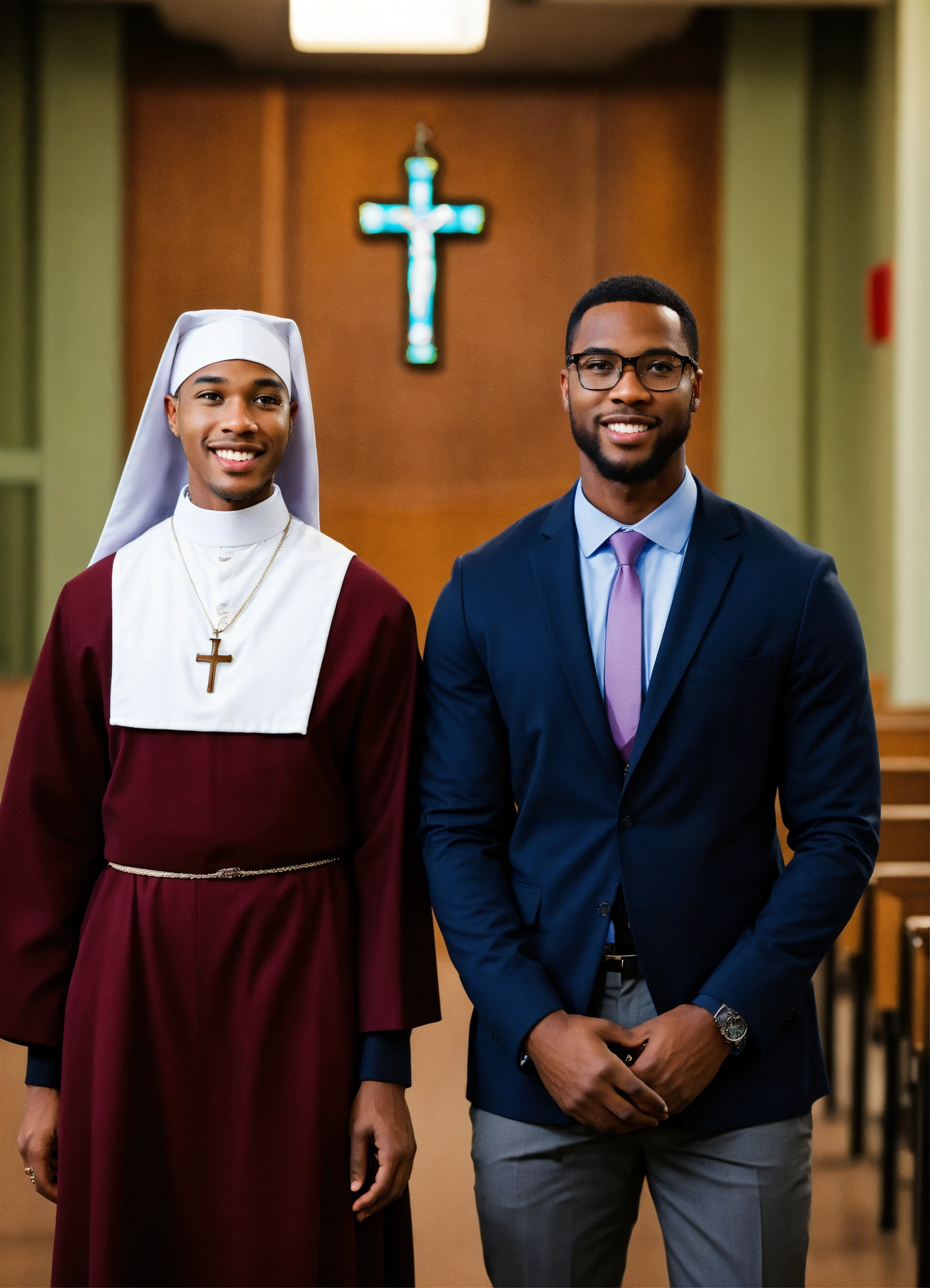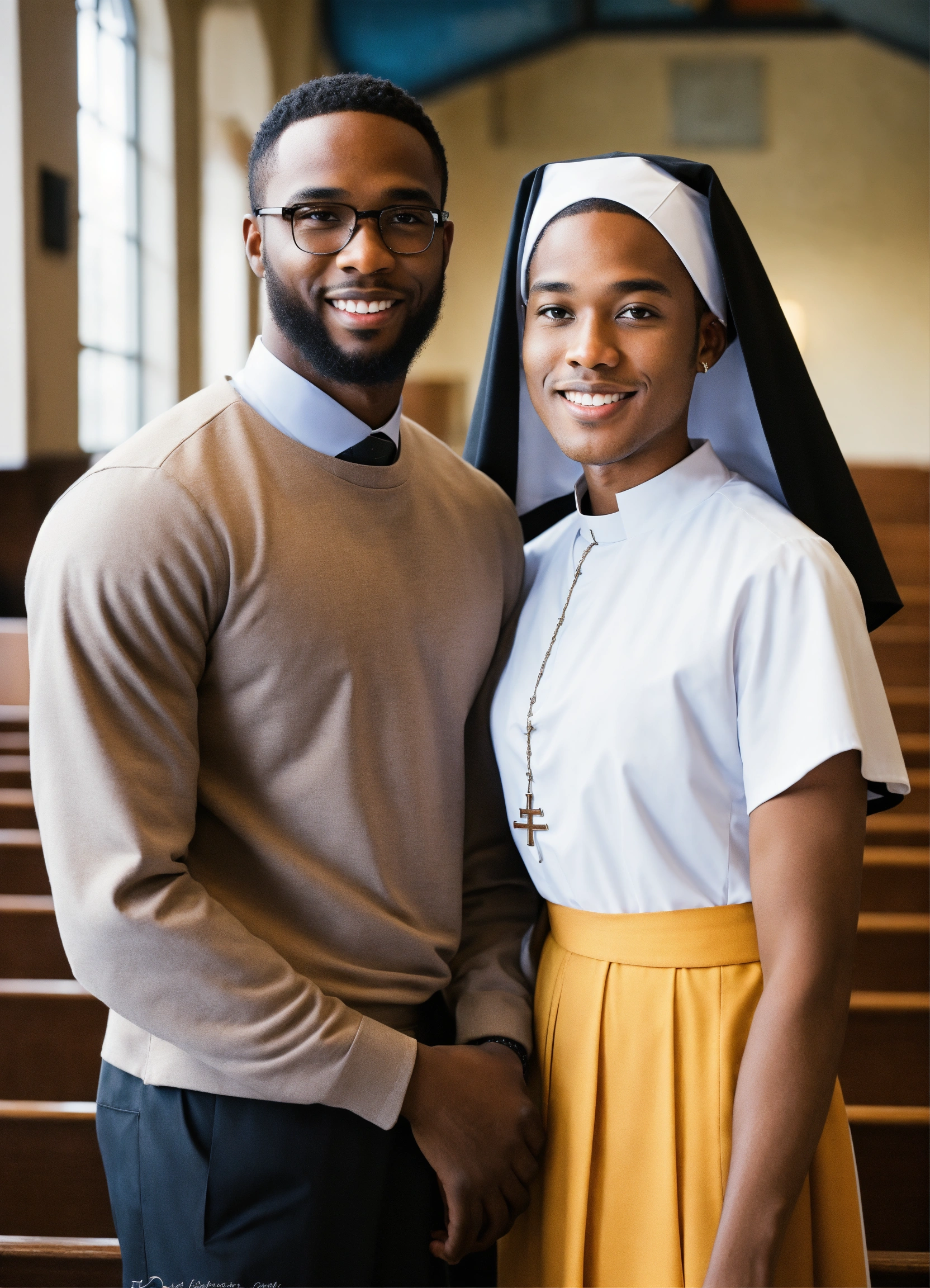 Handsome black male teacher standing too close to a pretty biracial female catholic nun
