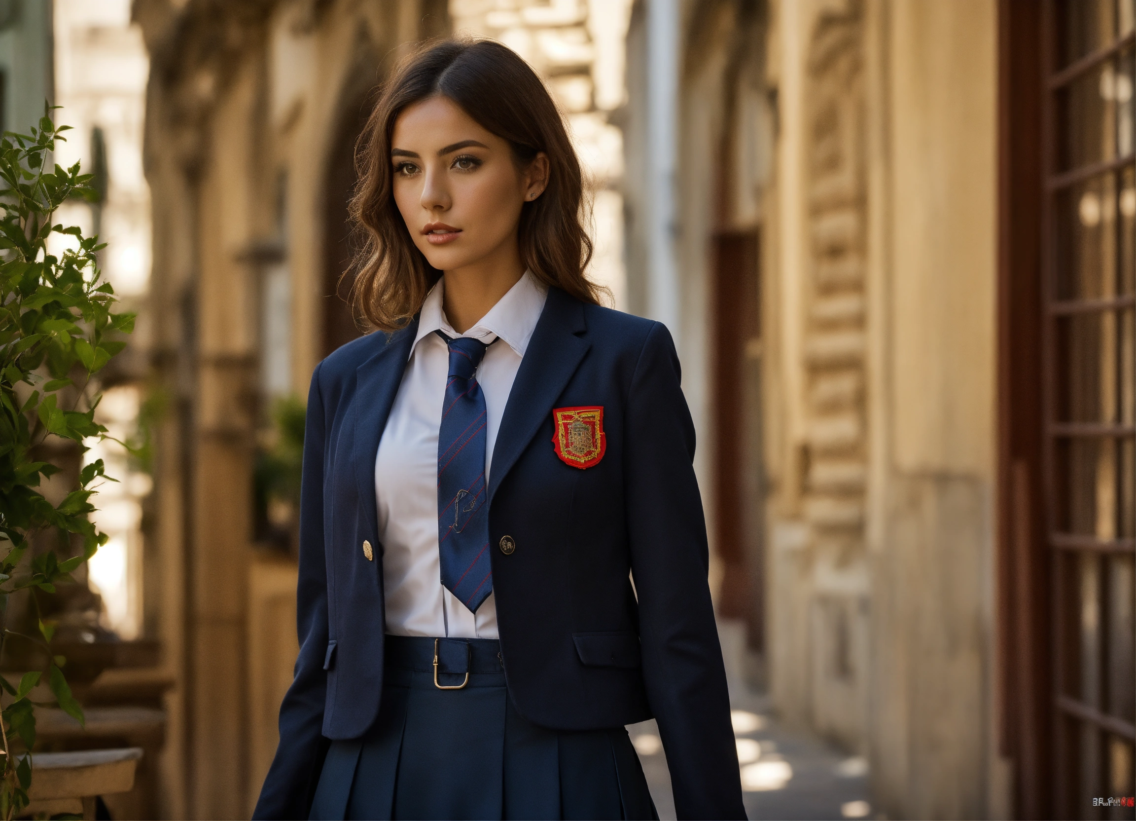 Hot adult woman, southern european, passionate with a boy, spain, taking care, schoolgirls in uniform, private school uniform, jacket, tight shirt, skirt, tights, feminine, school scenes, aura of beauty, relaxation, released tie, wide bust, pure spanish woman, sharp focus, 8k high definition, clothes too small and thin, undersized shirt and prominent body, shot on lo-fi], cinematic, 8k, masterpiece, xf iq 4, 1 5 0 mp, 5 0 mm, iso 2 0 0, 1 / 1 6 0 s, realistic, leading lines composition, symmetrical balance, depth layering, sense of depth, ai enhanced, tailored shirt, tight-fitting, increased bust