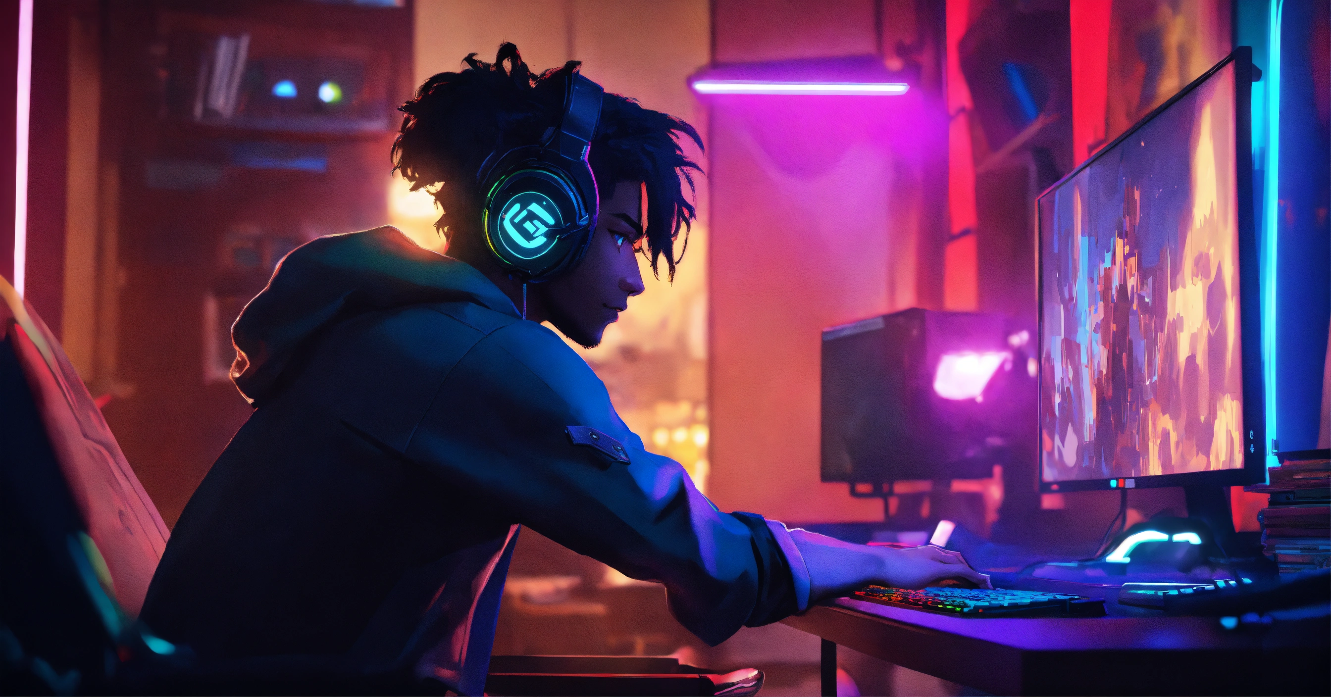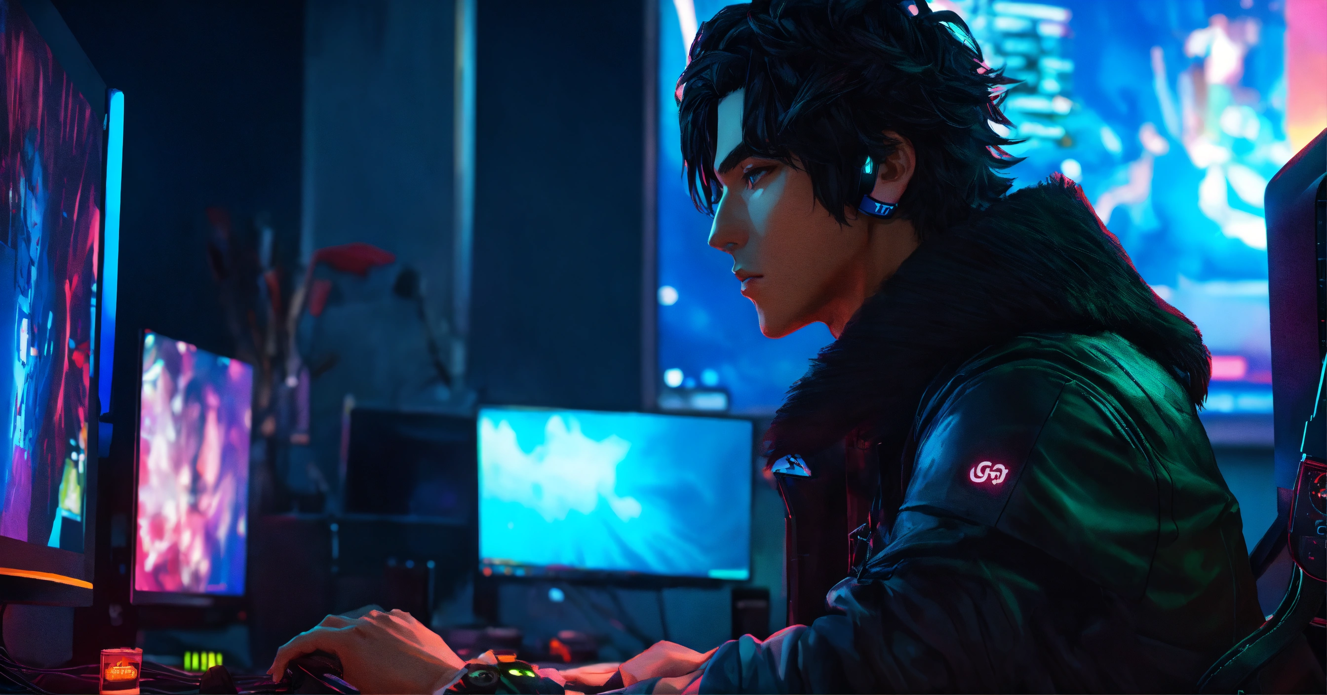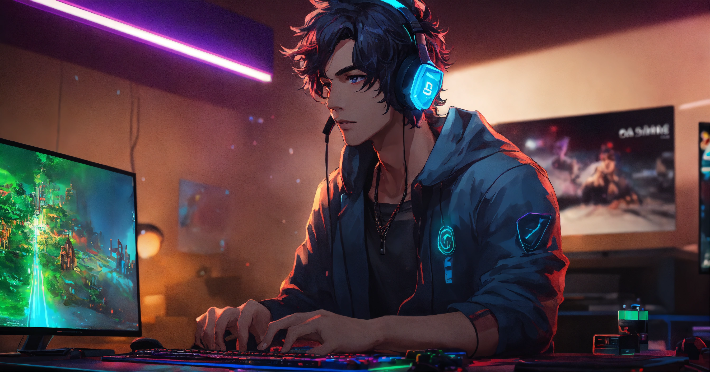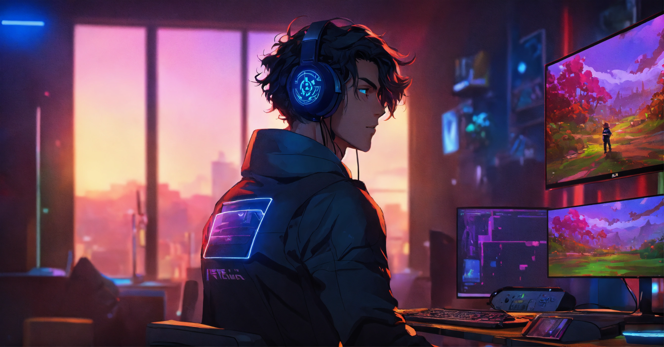 Un jeune homme noir avec des cheveux long nattés, gamer assit devant son bureau gaming rgb en 8k anime