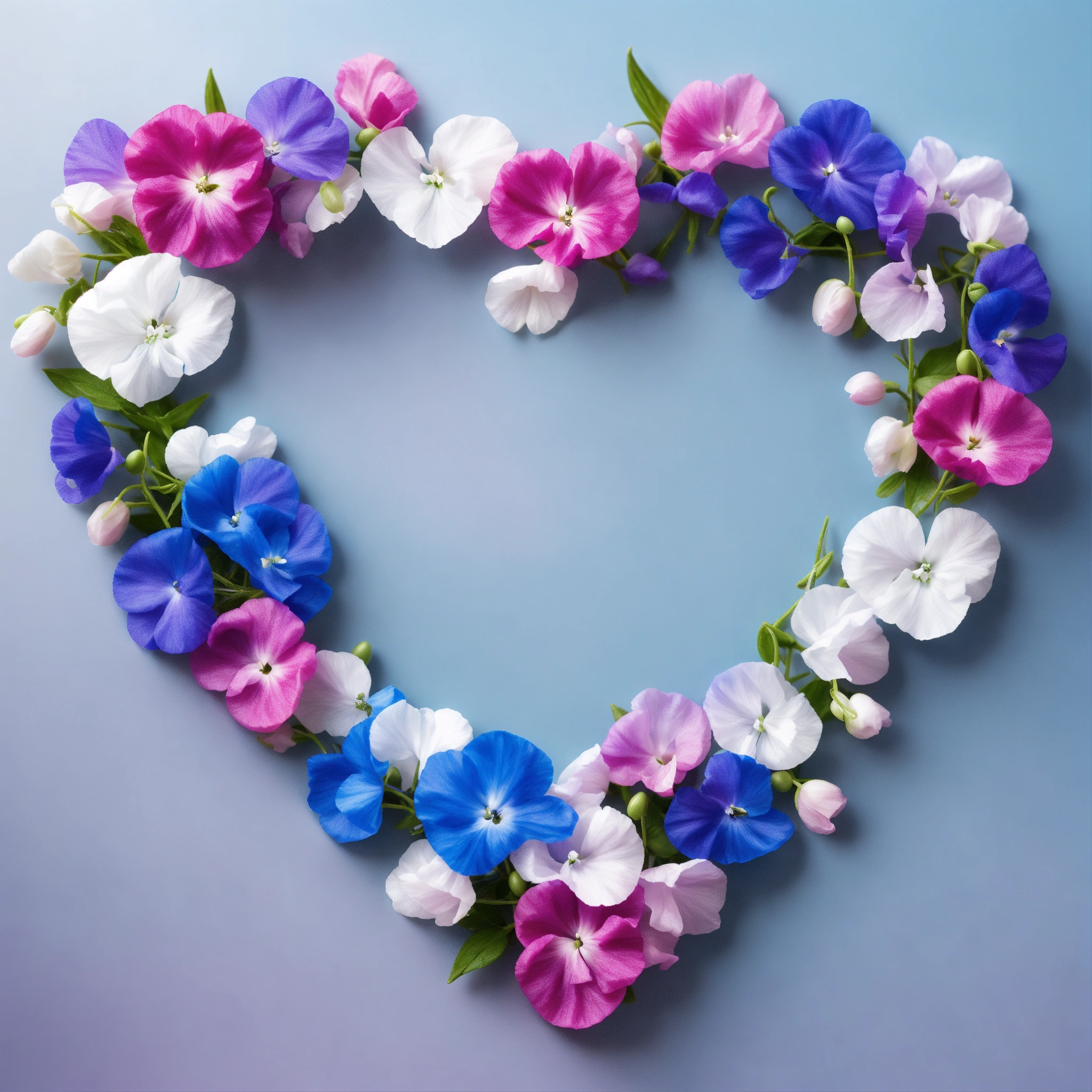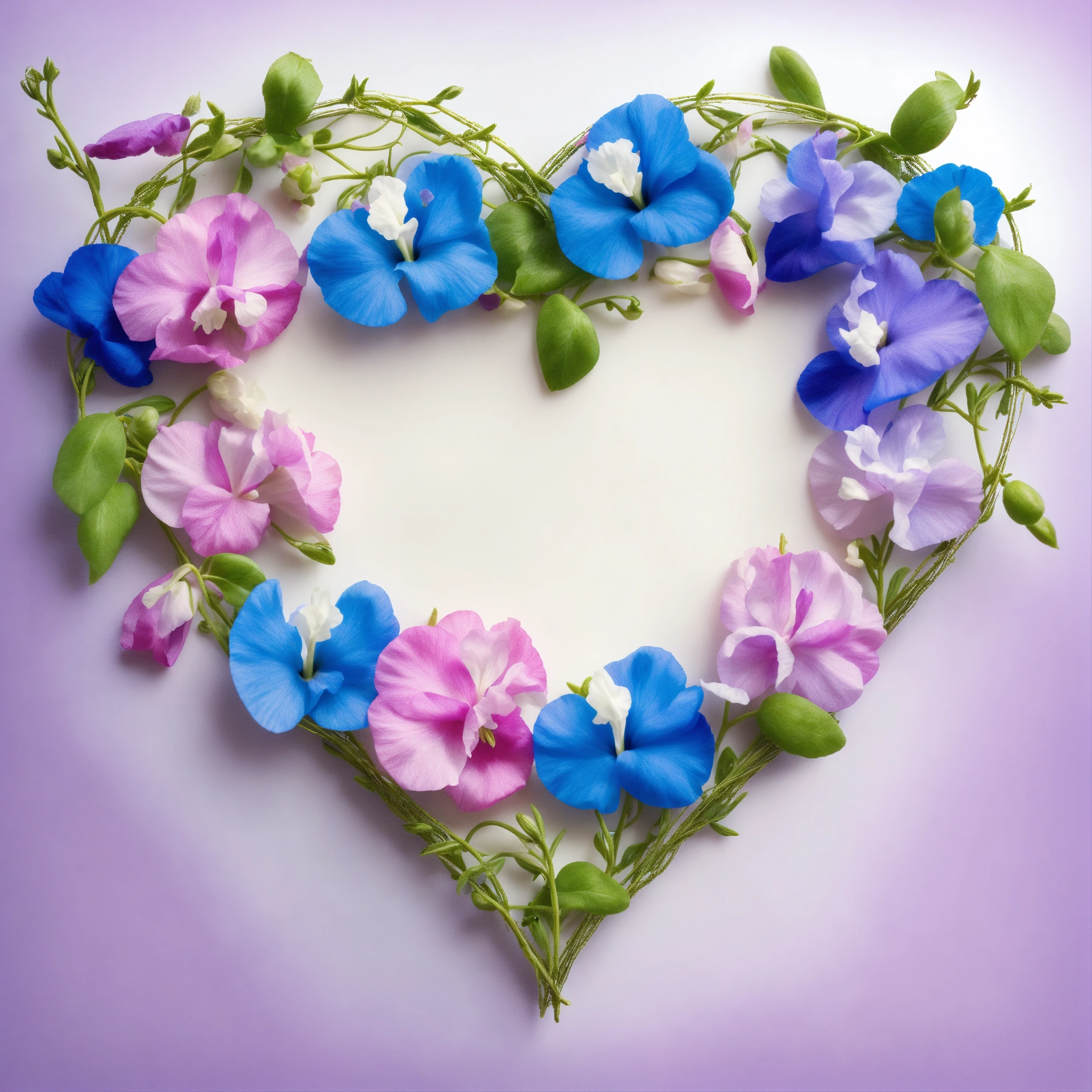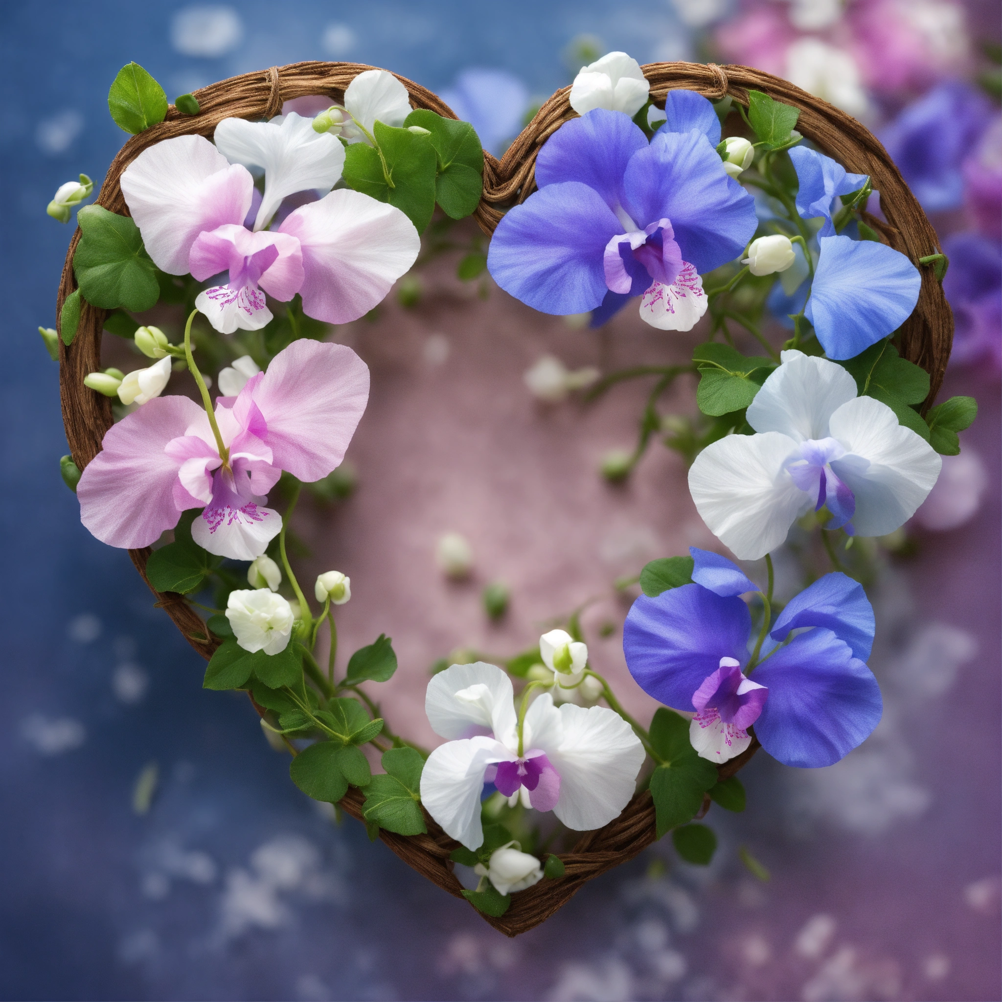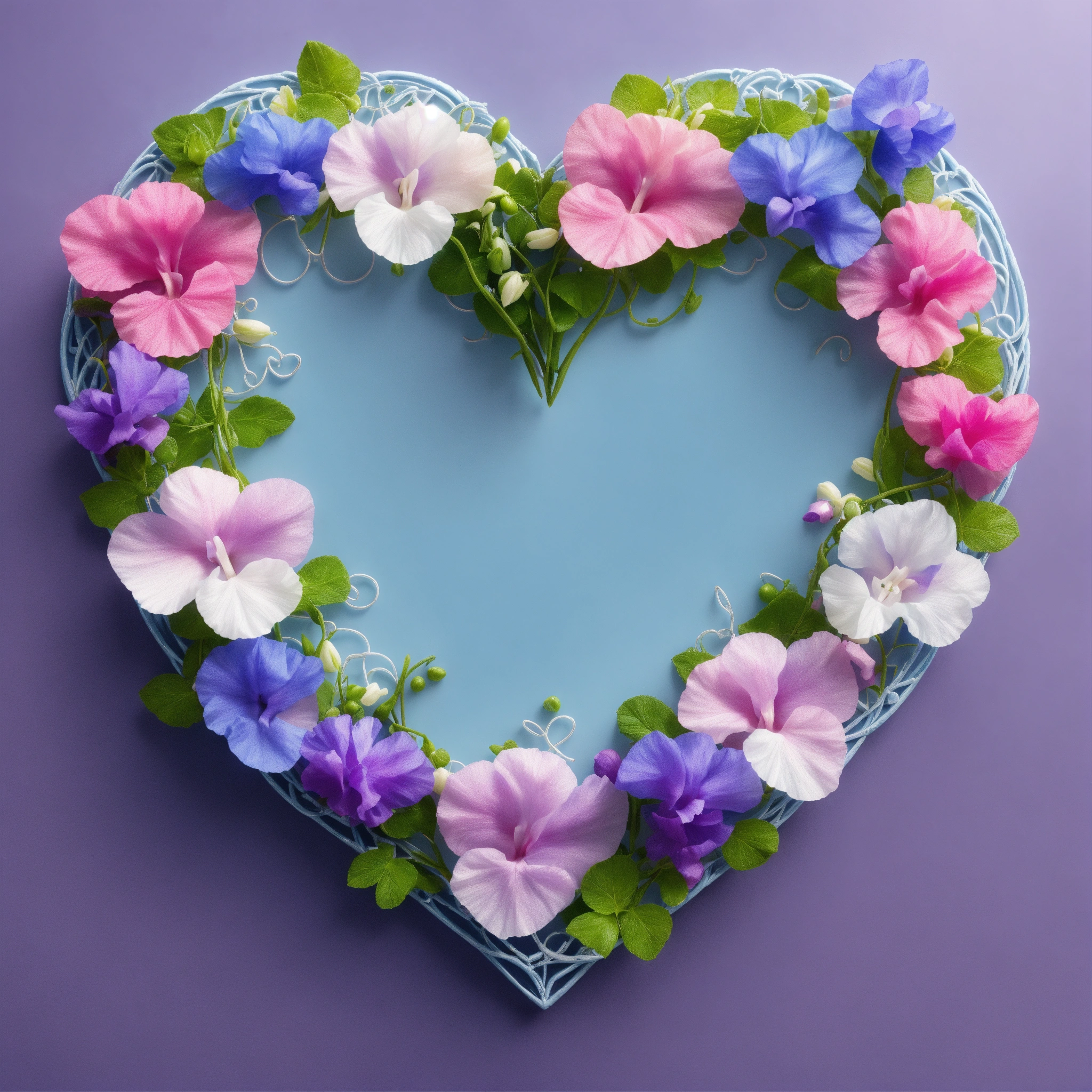 Imagine a vine of intertwined small pretty blue, purple, pink, and white sweetpeas growing on a heart-shaped frame. lacy background. photo realistic 16k