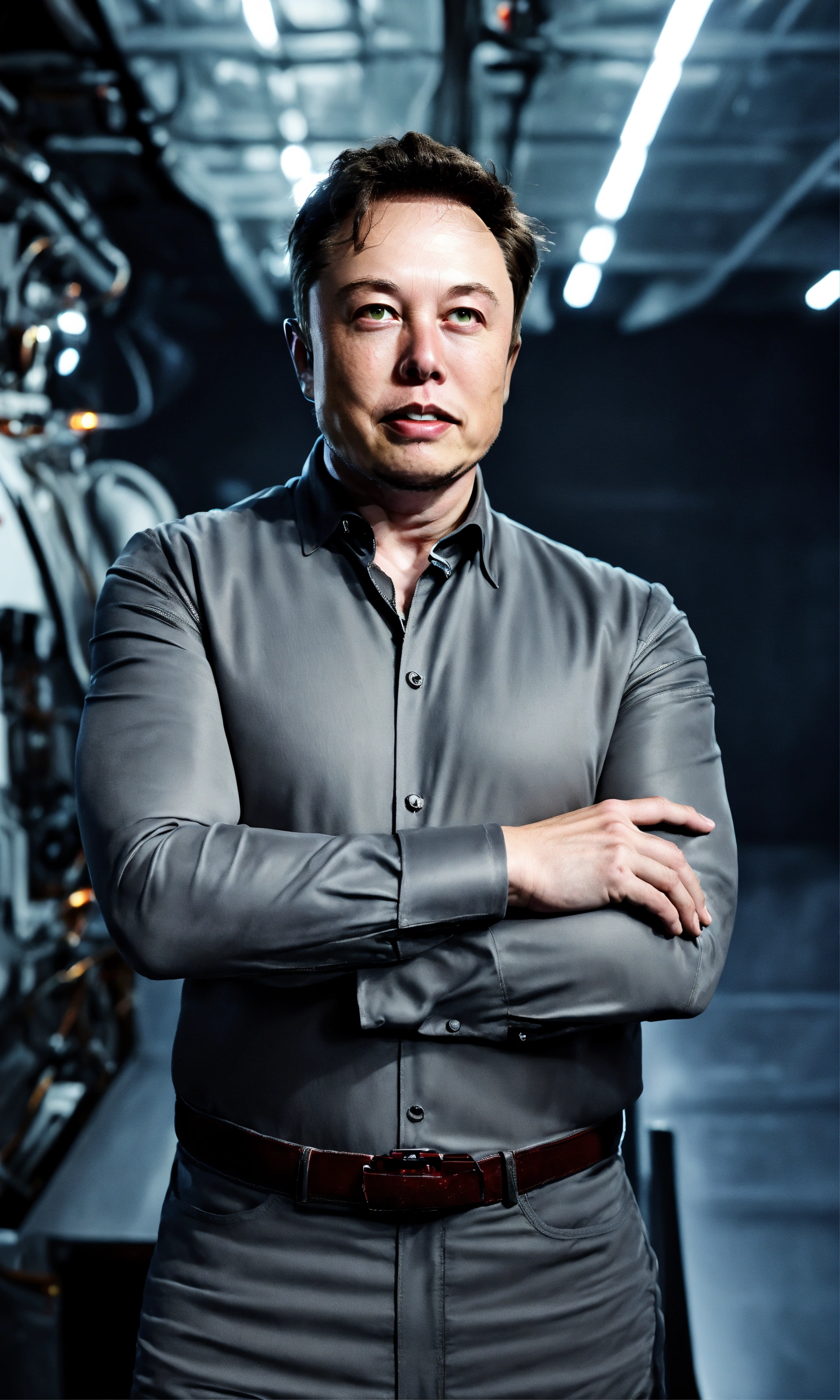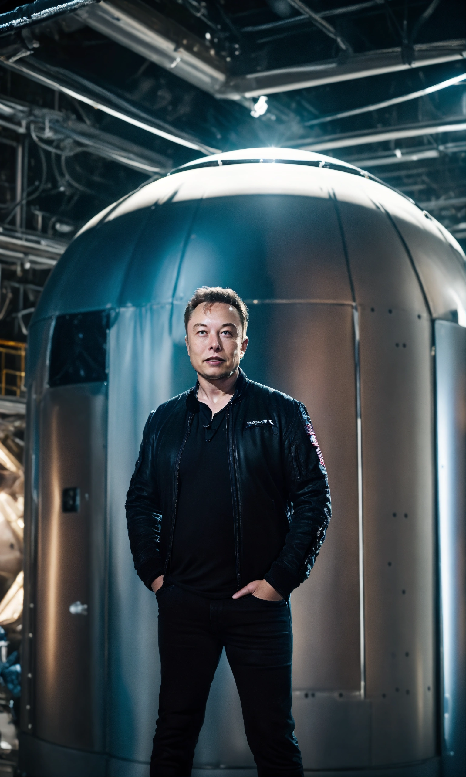 Image of elon musk, on space x premises, facing at camera, super realistic, high resolution, dark room