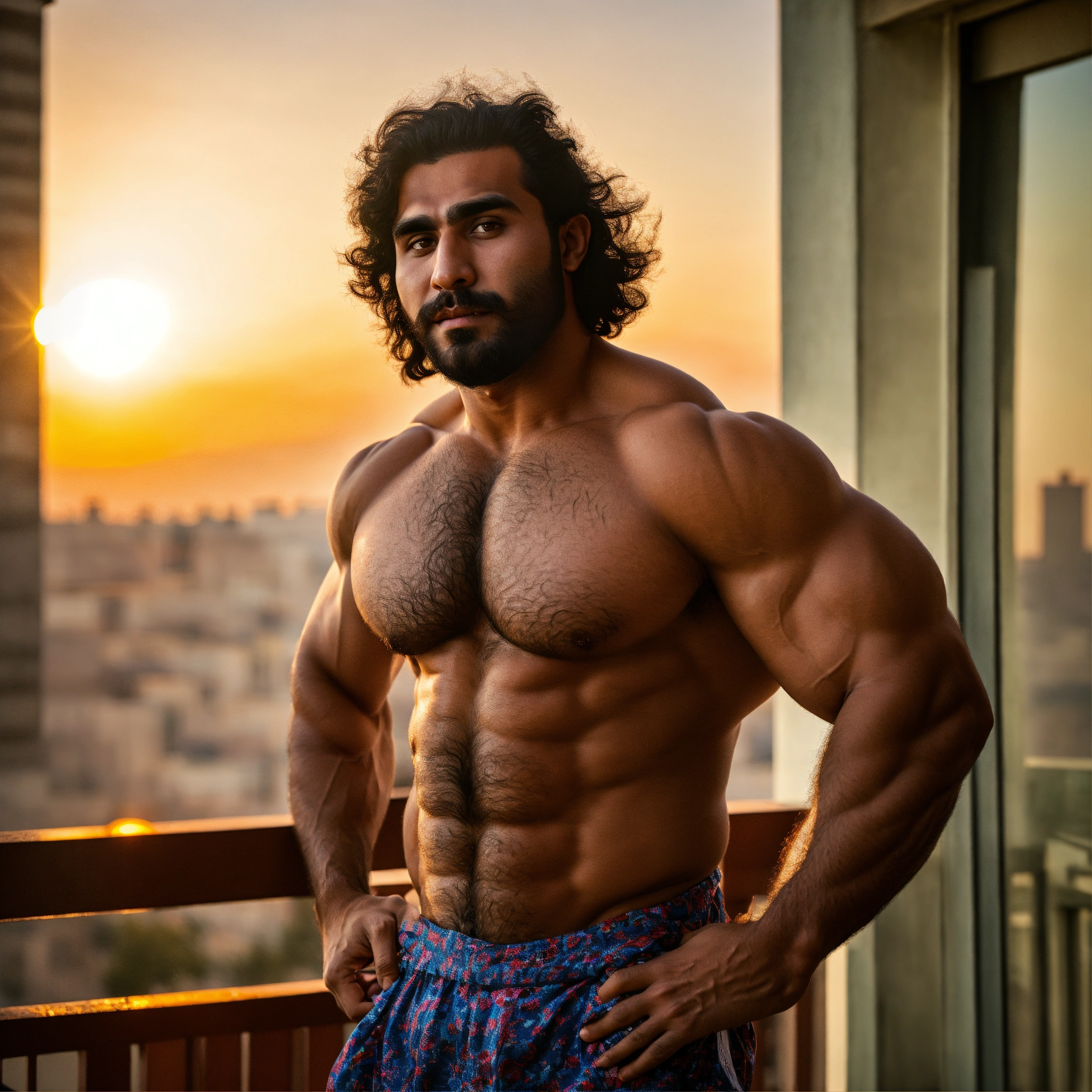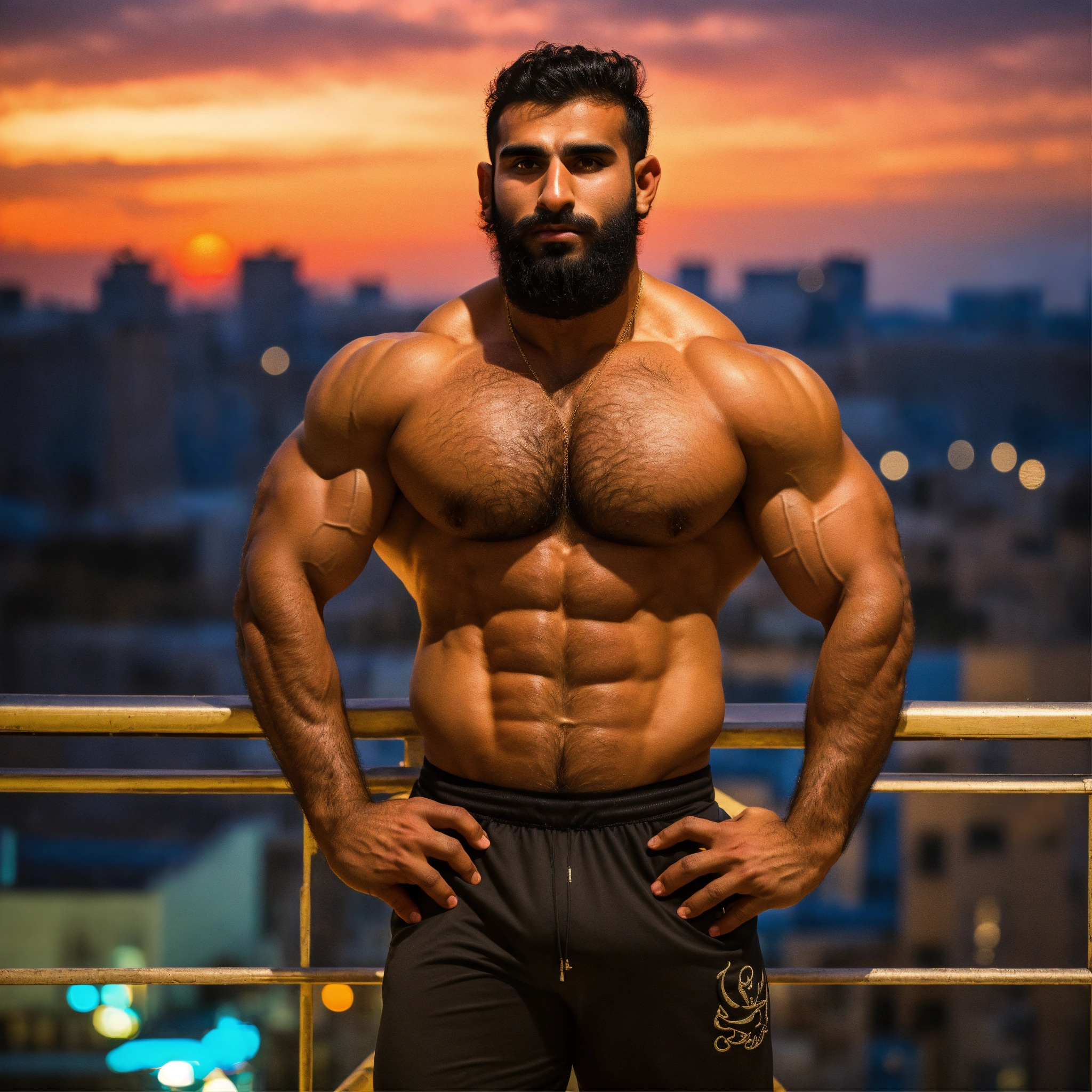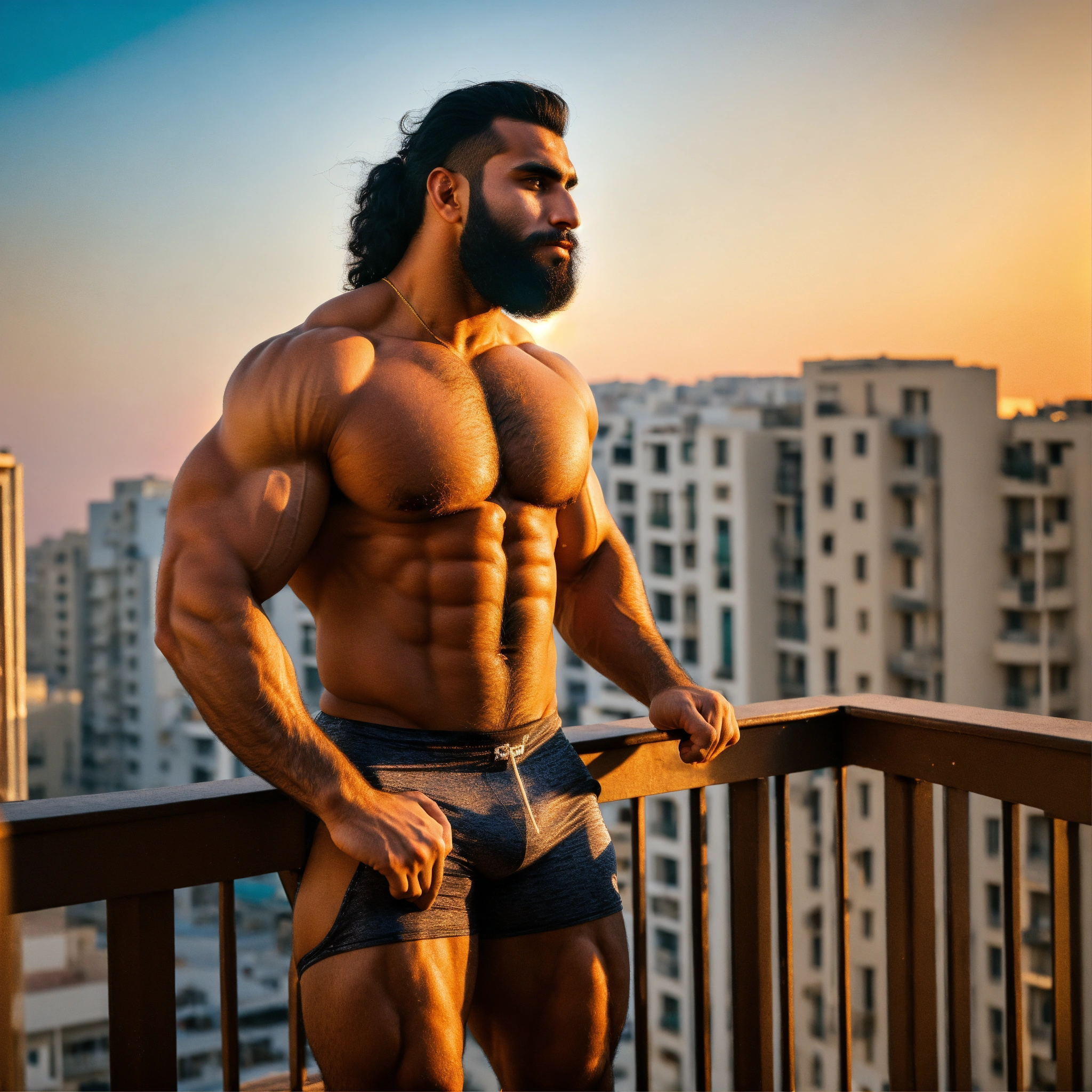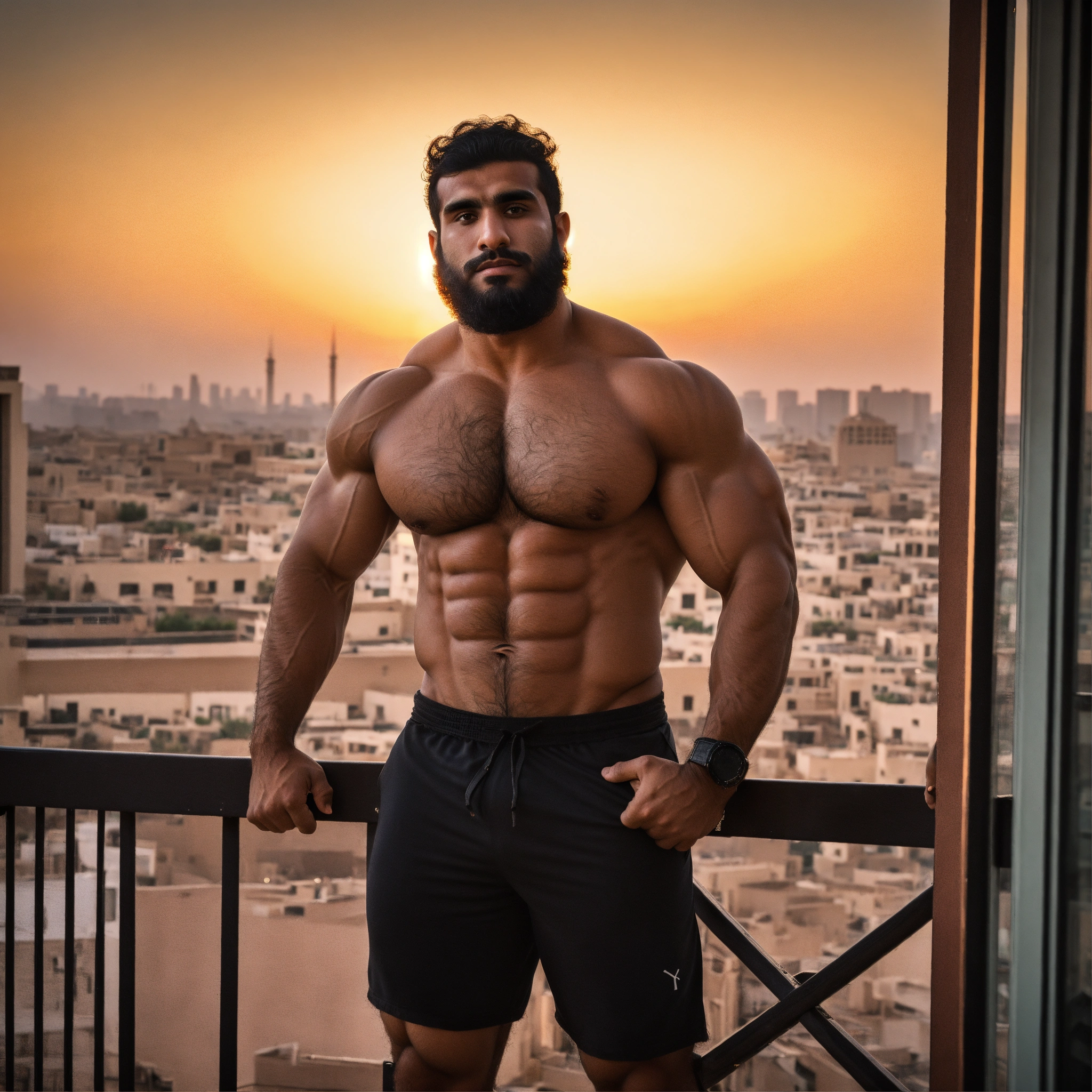 30-year-old hairy saudi man with big muscles, big bodybuilder, body like a wrestler, on a balcony at sunset