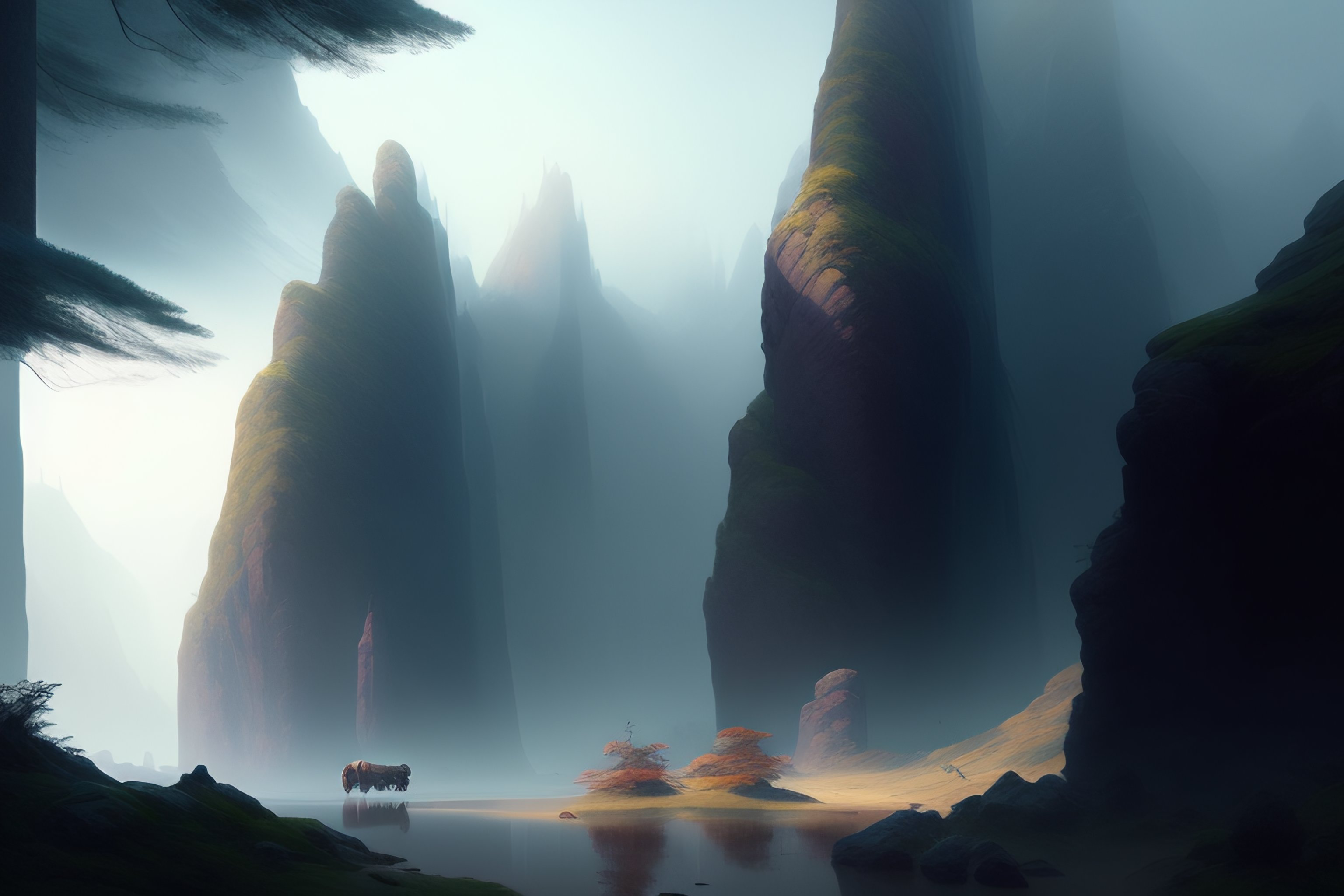 Foggy terrain, scene, natural light, dark, complex, highly detailed, smooth, artstation, digital illustration by ruan jia and mandy jurgens and artgerm and wayne barlowe and greg rutkowski and zdislav beksinski