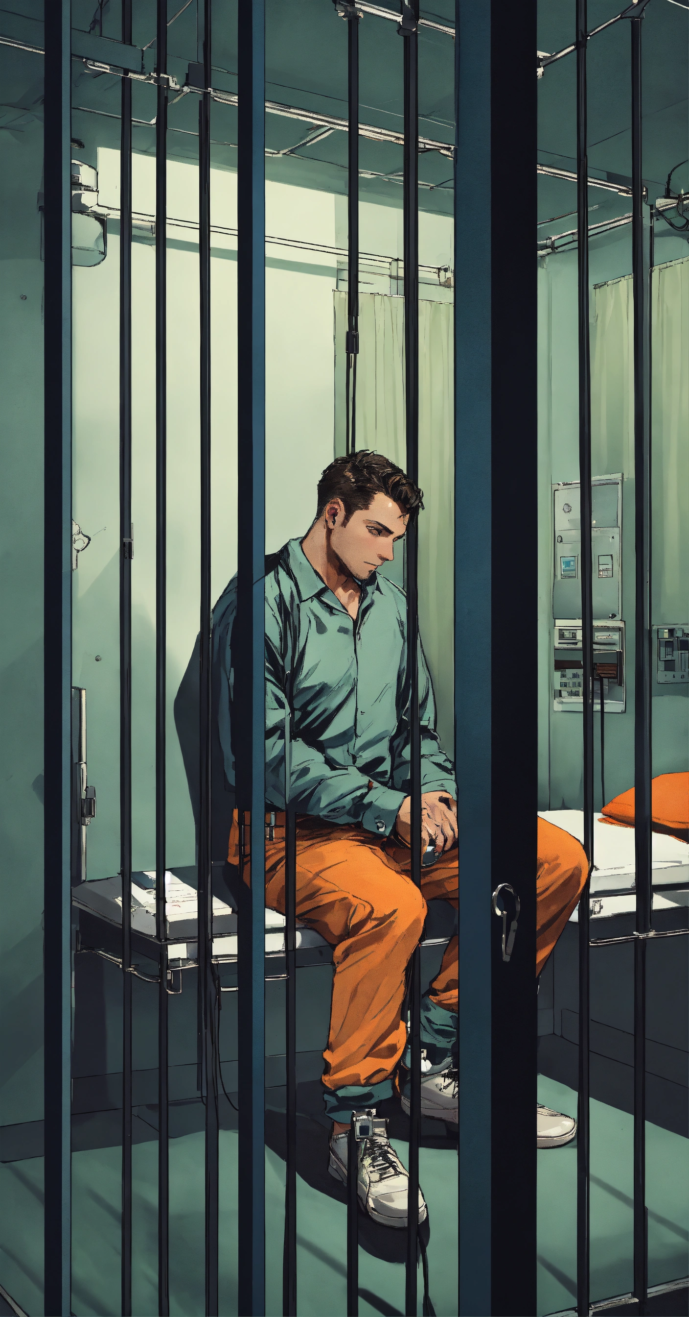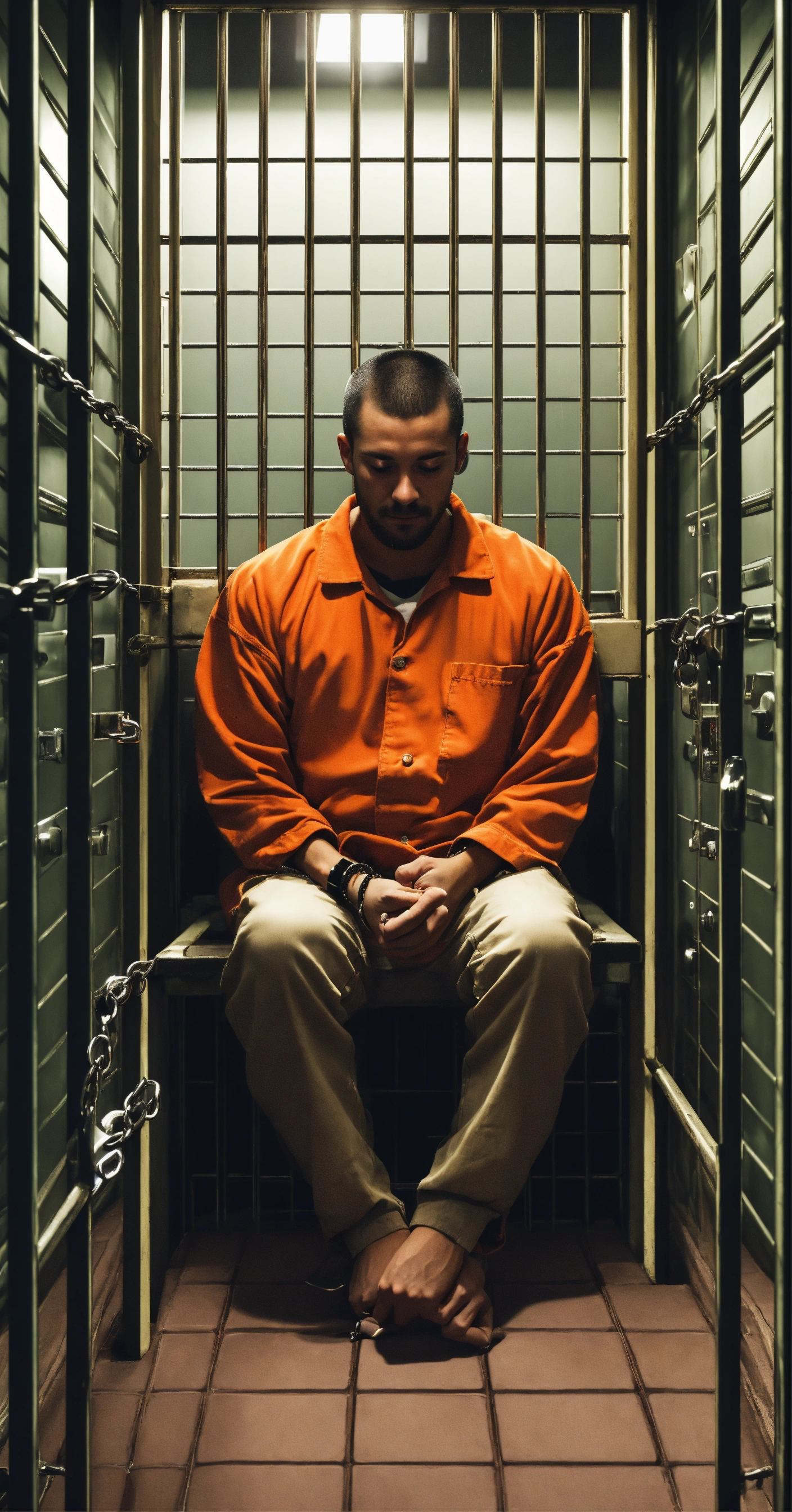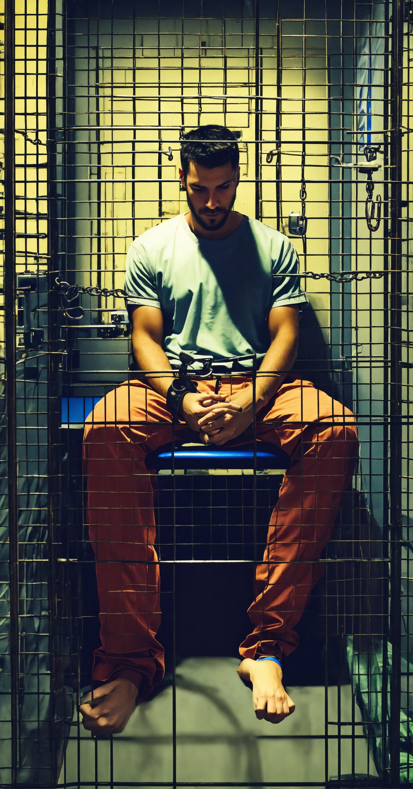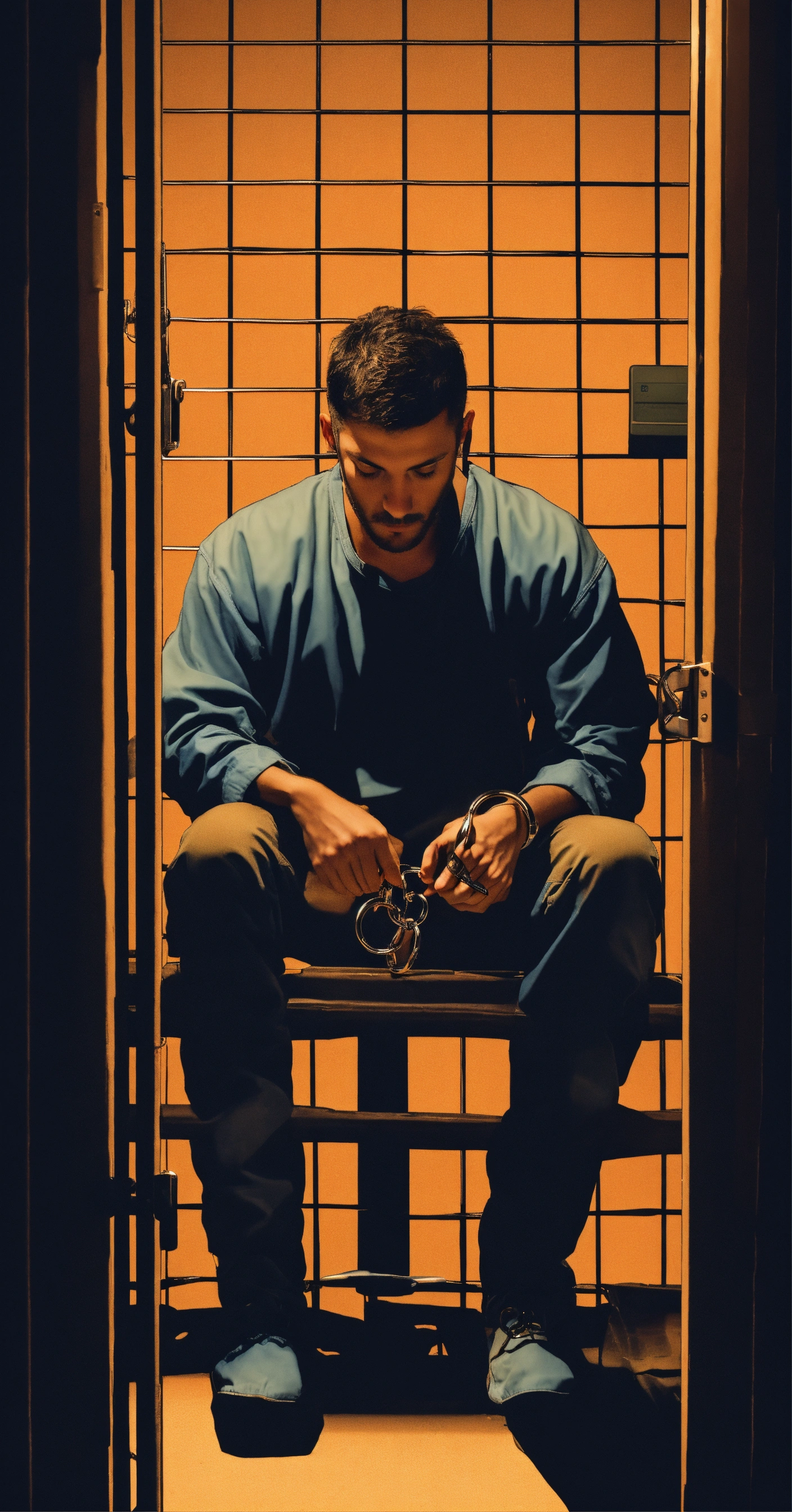 An individual placed in a prison cell with handcuffs. their faces were full of regret and lack of freedom. around them, open computers and emails are visible, reflecting the act of violating privacy by checking the partner's email without permission. this prison sentence is a consequence of this violation of privacy.