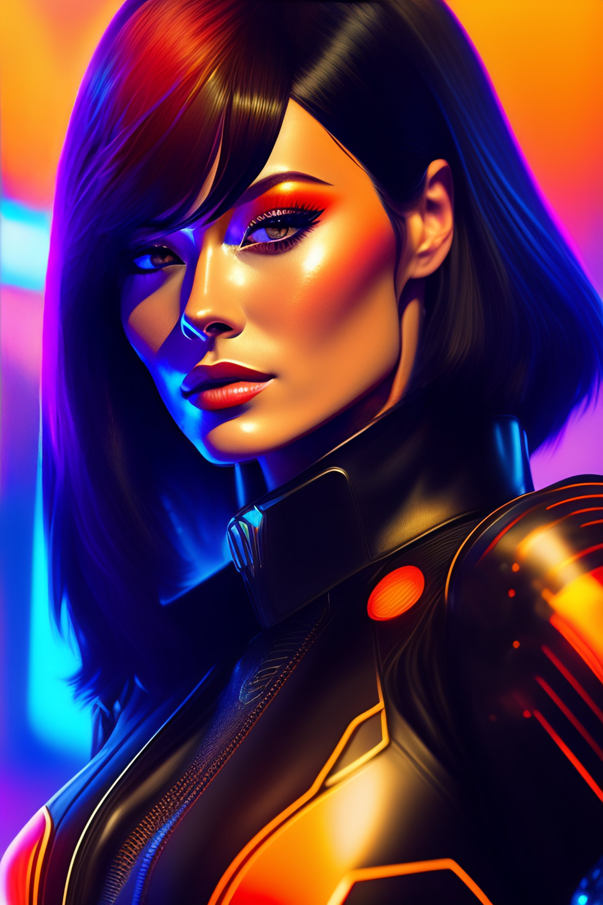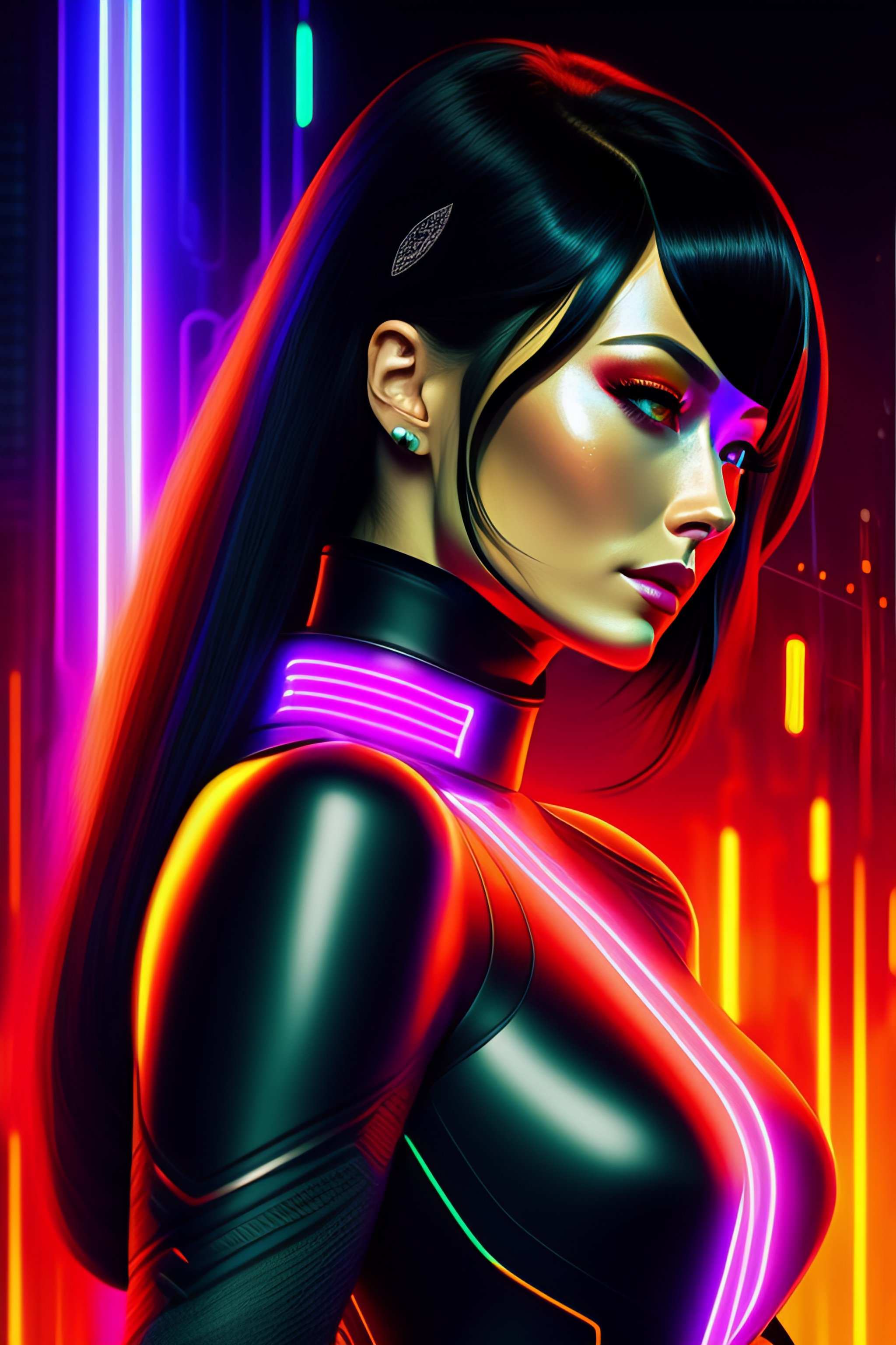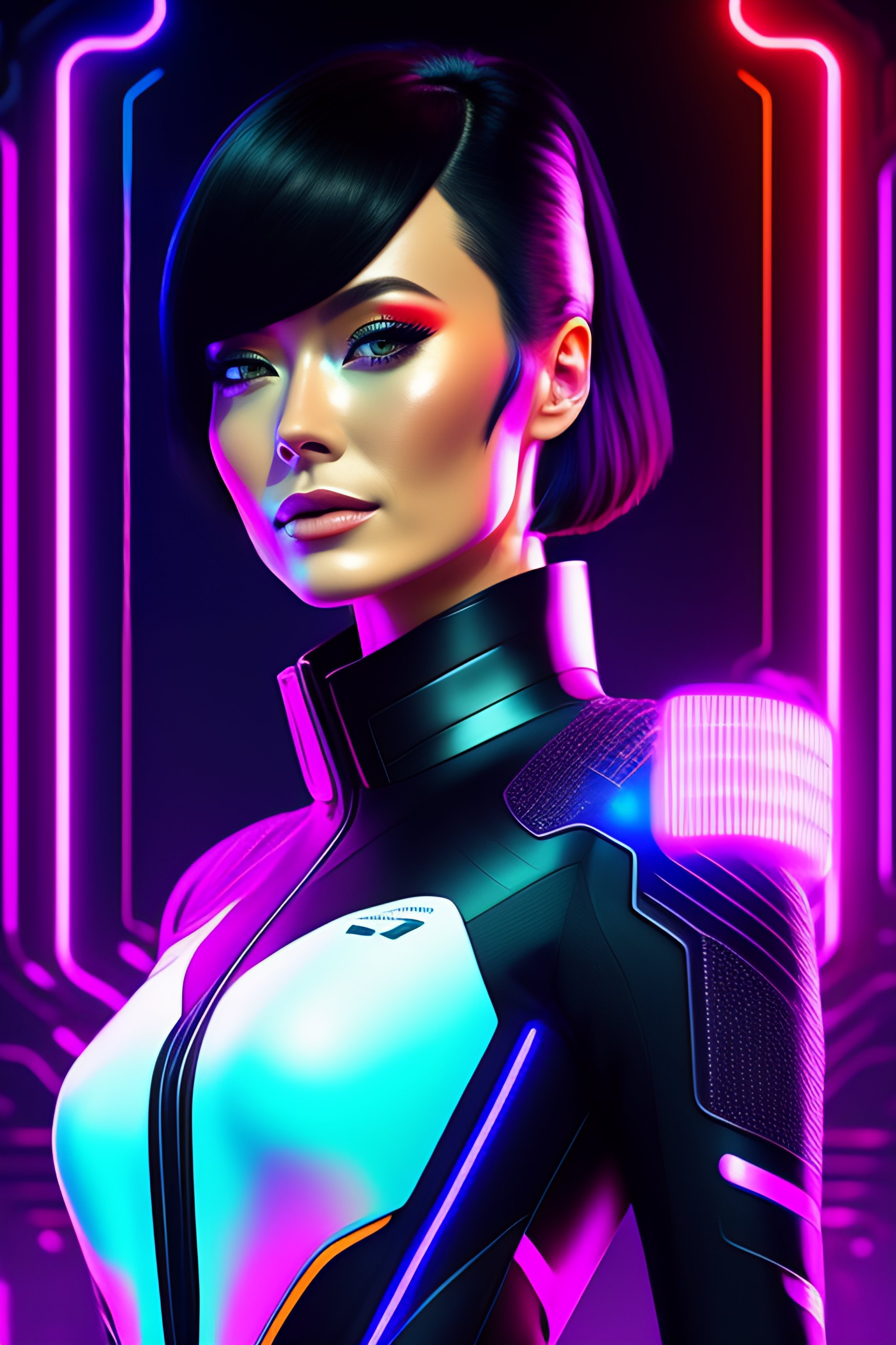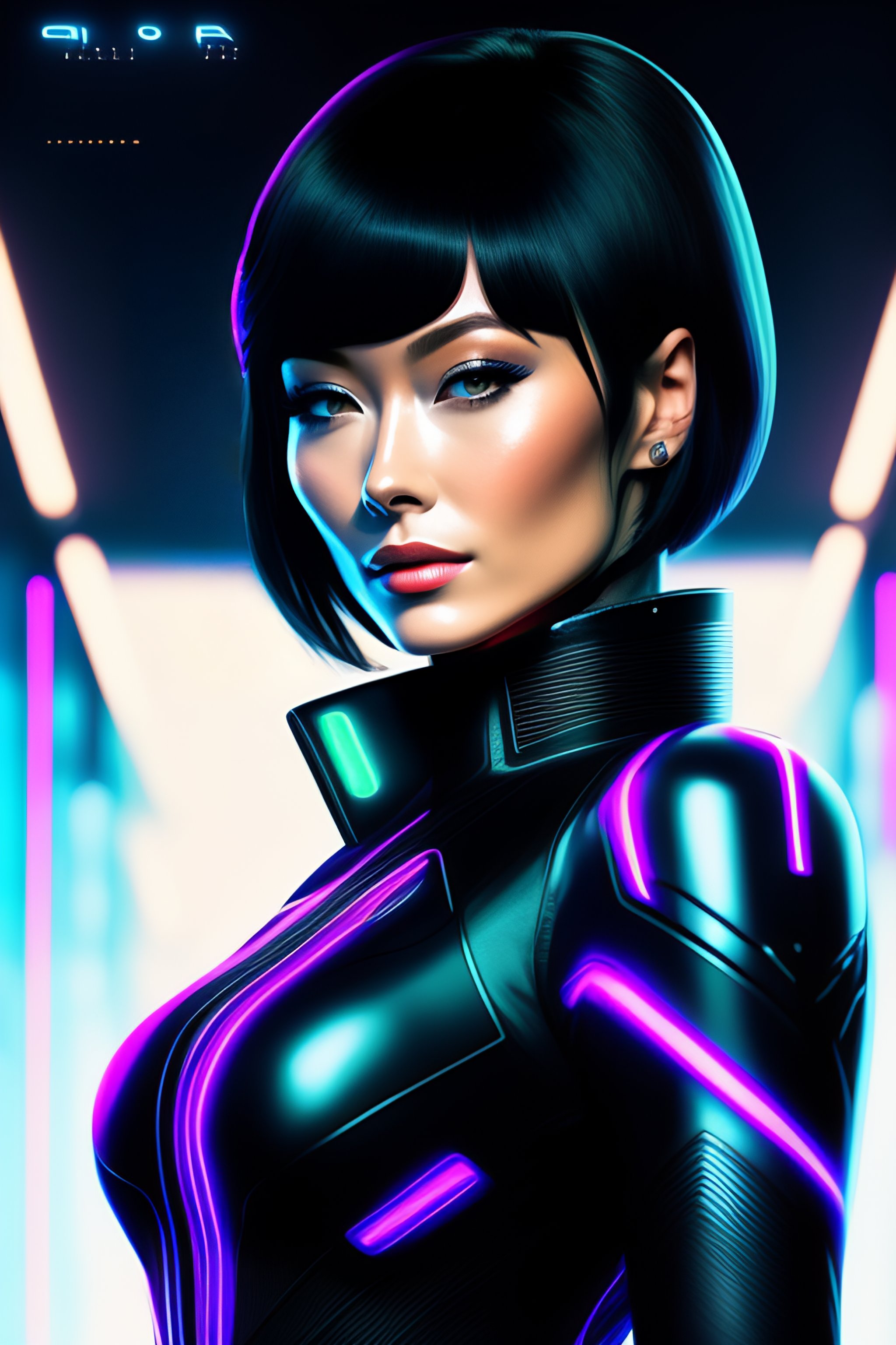 Analog style of a beautiful olivia wilde, neon futuristic pistol, ((short bob fringe hair)) black hair, tron legacy style, full body, futuristic suit, detailed illustration, line art, by ((tsutomu nihei))