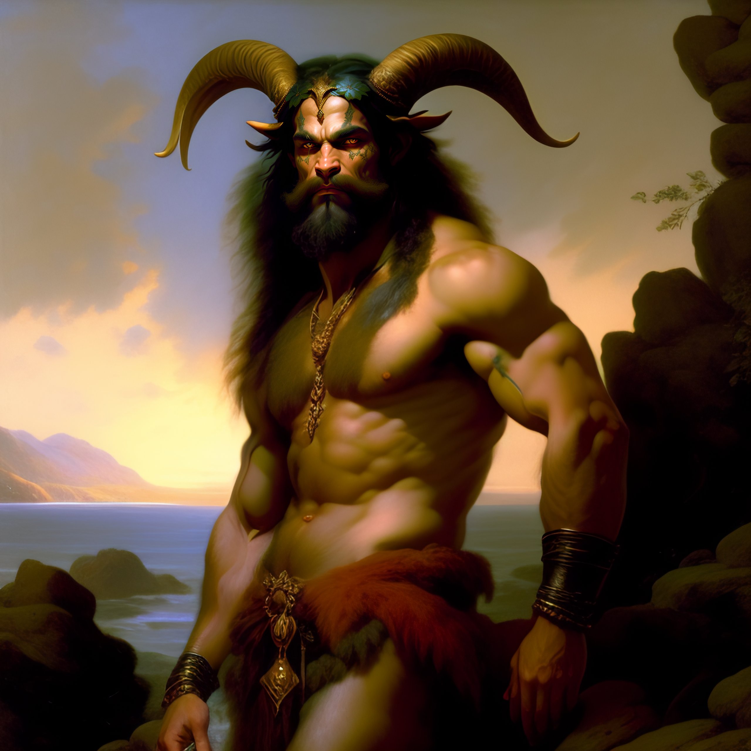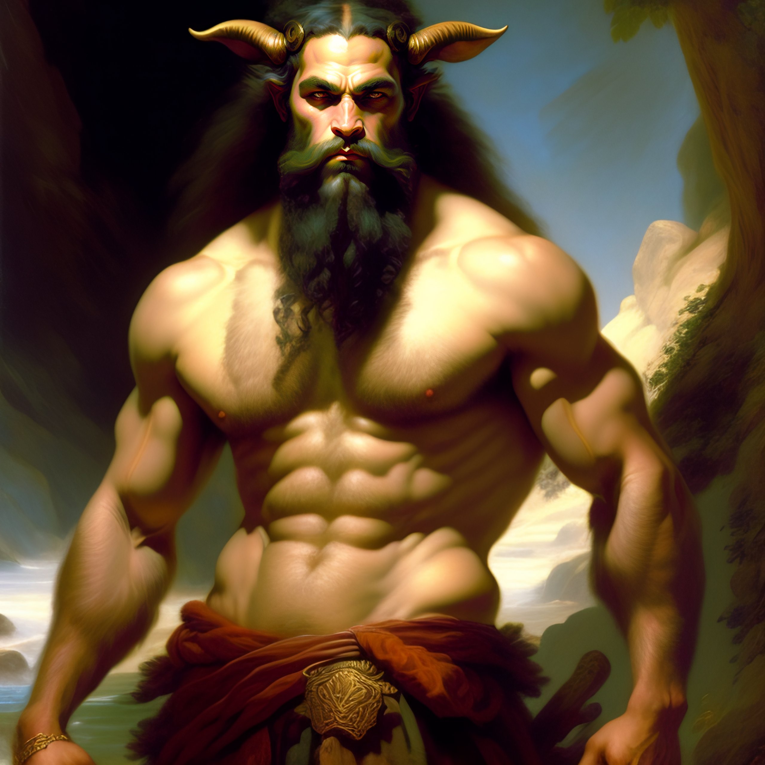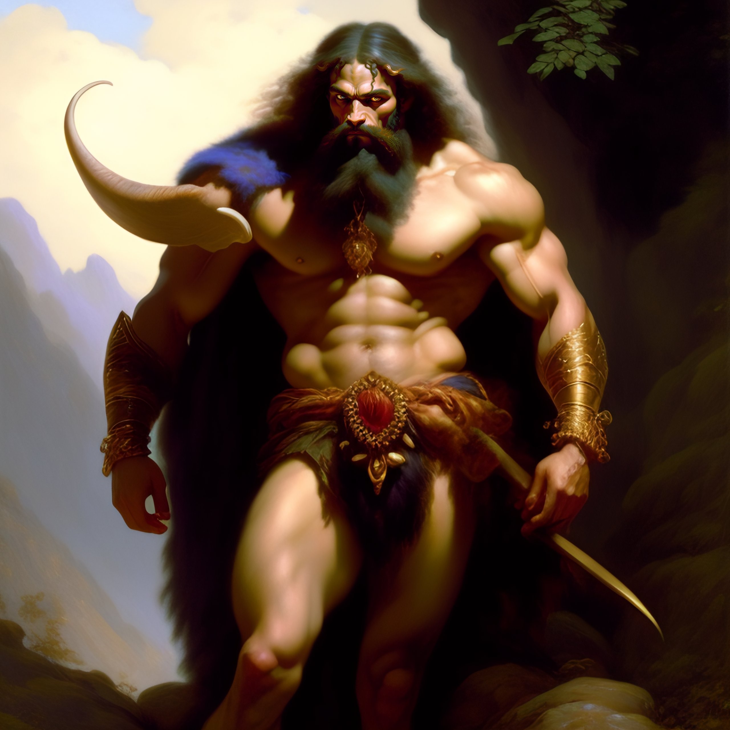 Fantasy d&d satyr, goat-man hybrid, by andreas achenbach, by frank frazetta, intricate details, extremely detailed, dreamy, artistic interpretation, concept art