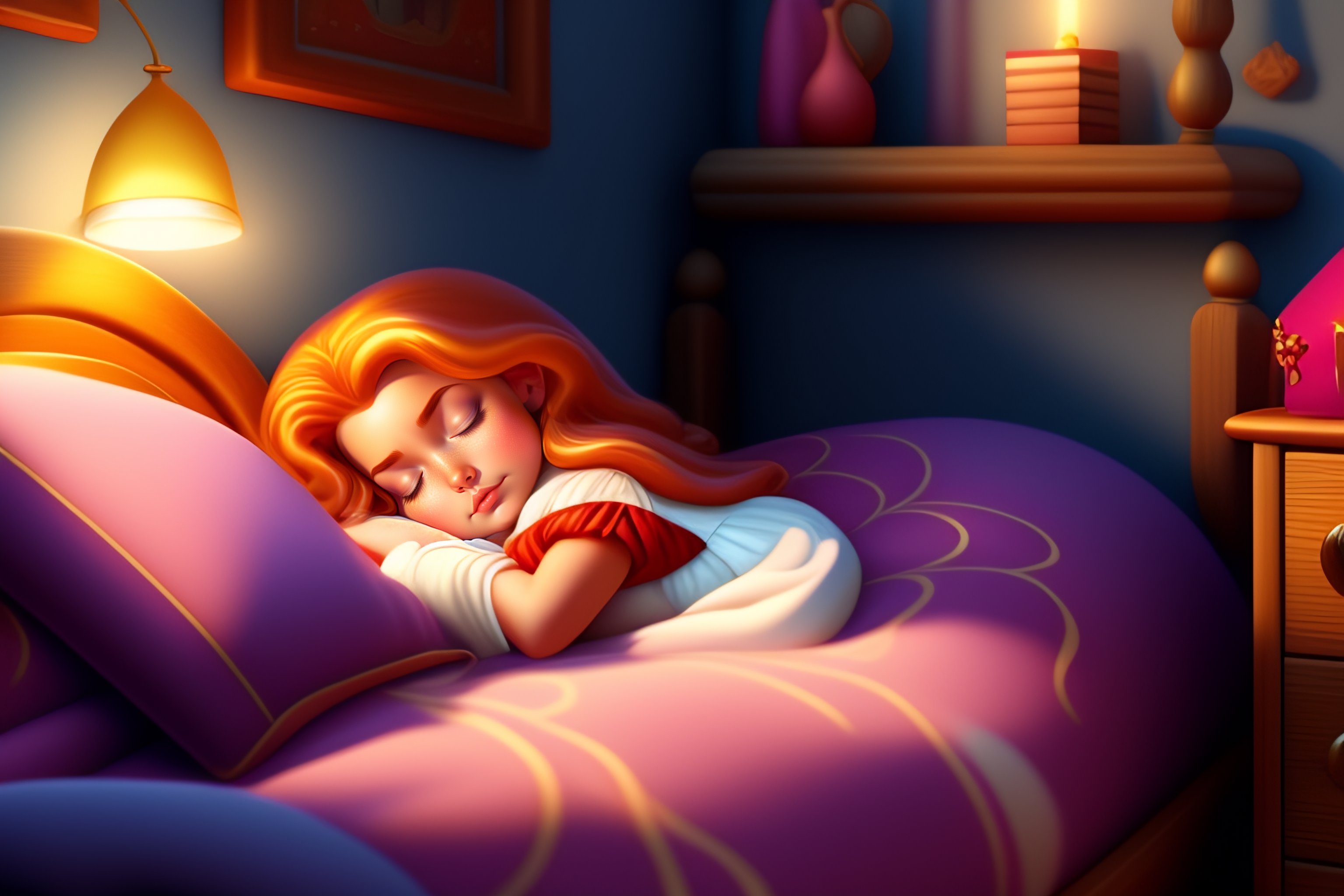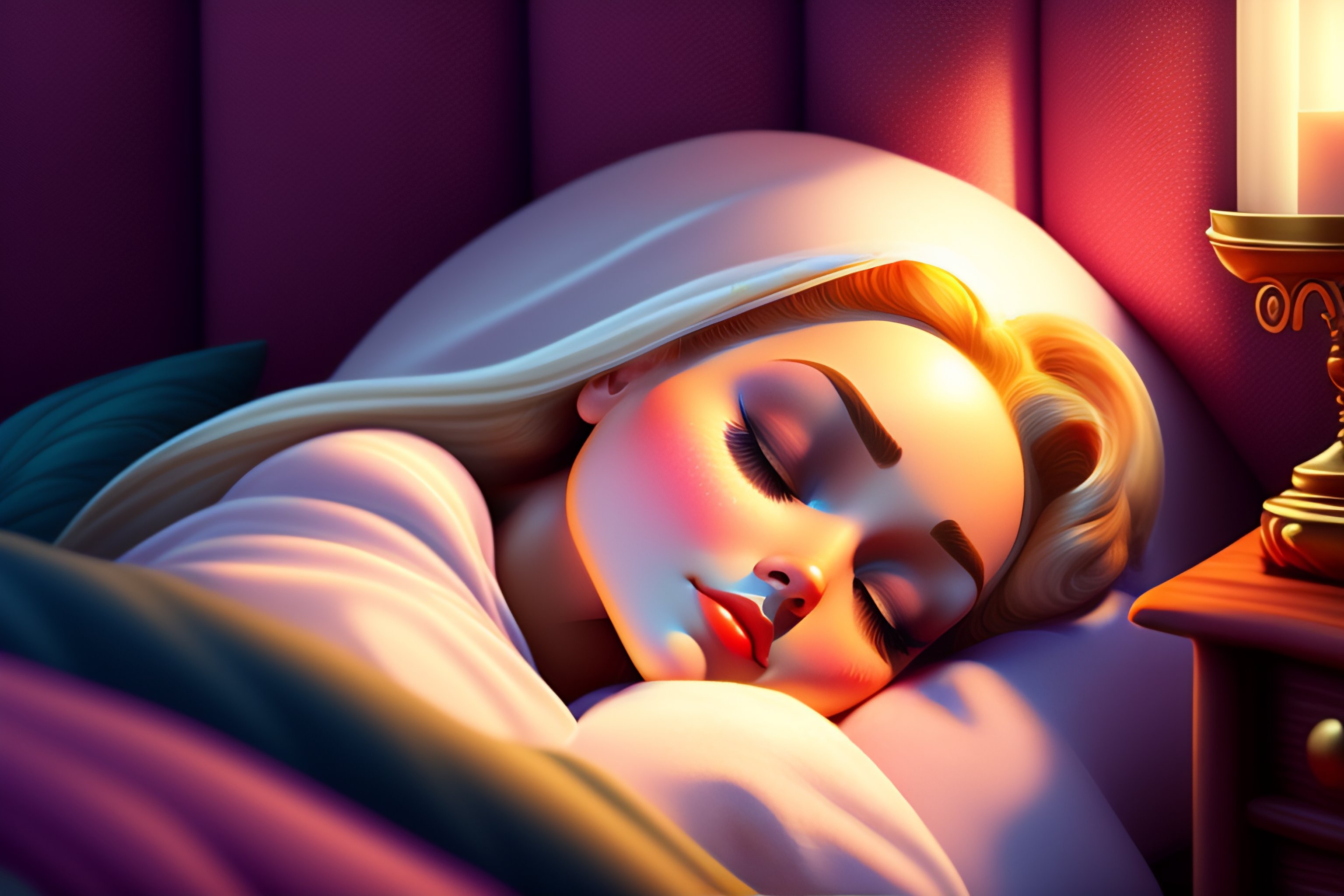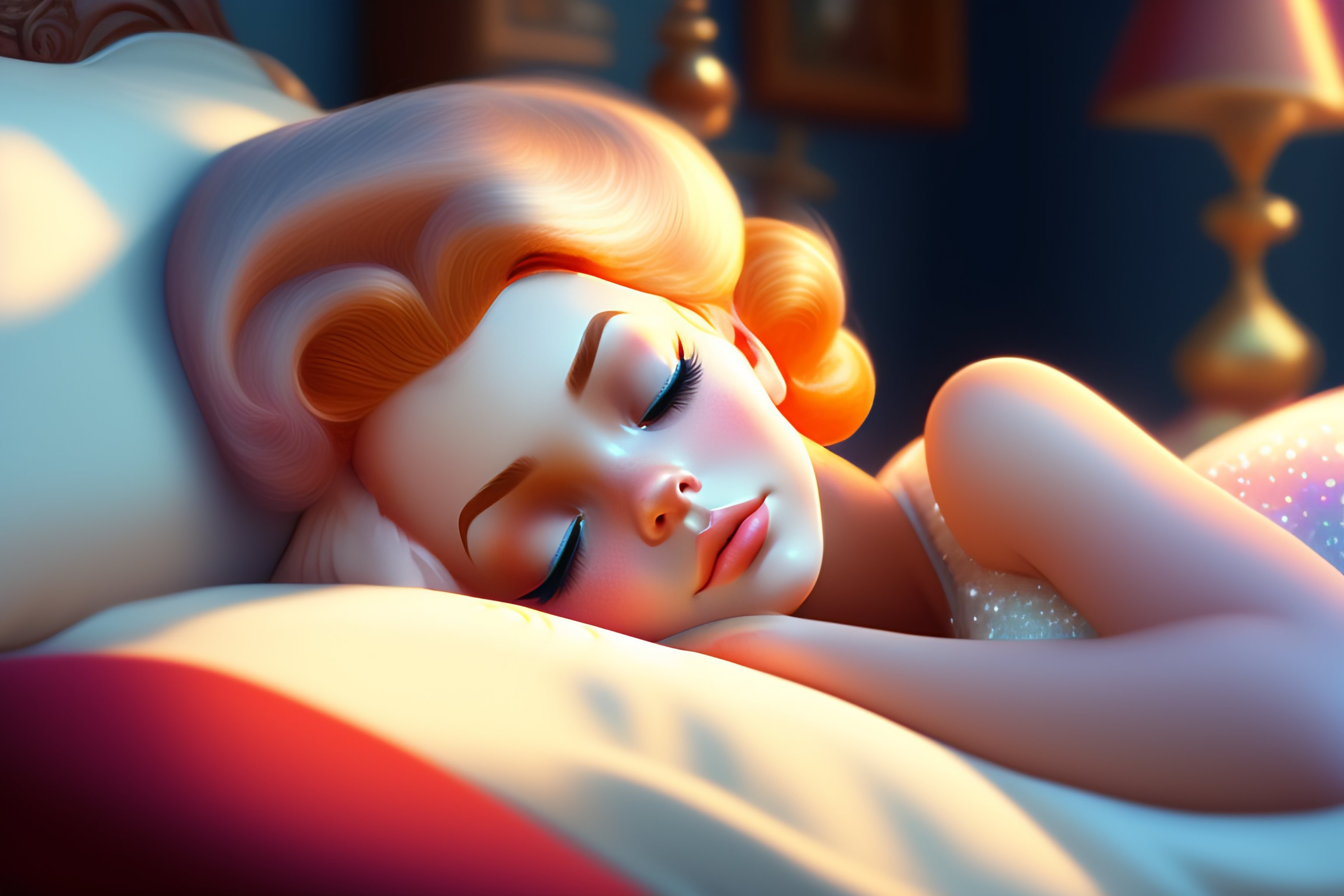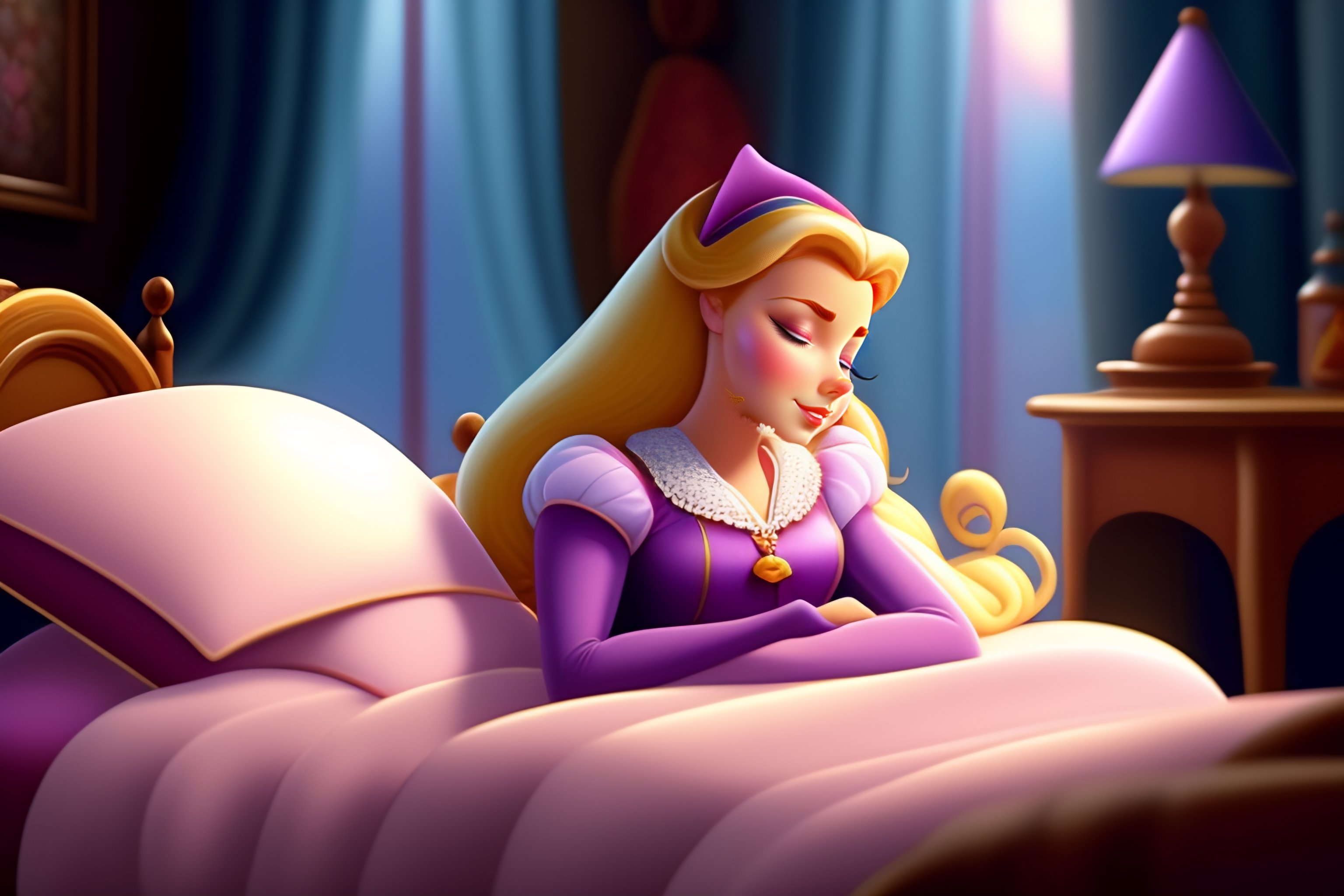 The character of the disney cartoon sleeping beauty sleeps on a bed in a cozy bedroom and drools in the style of pixar art design