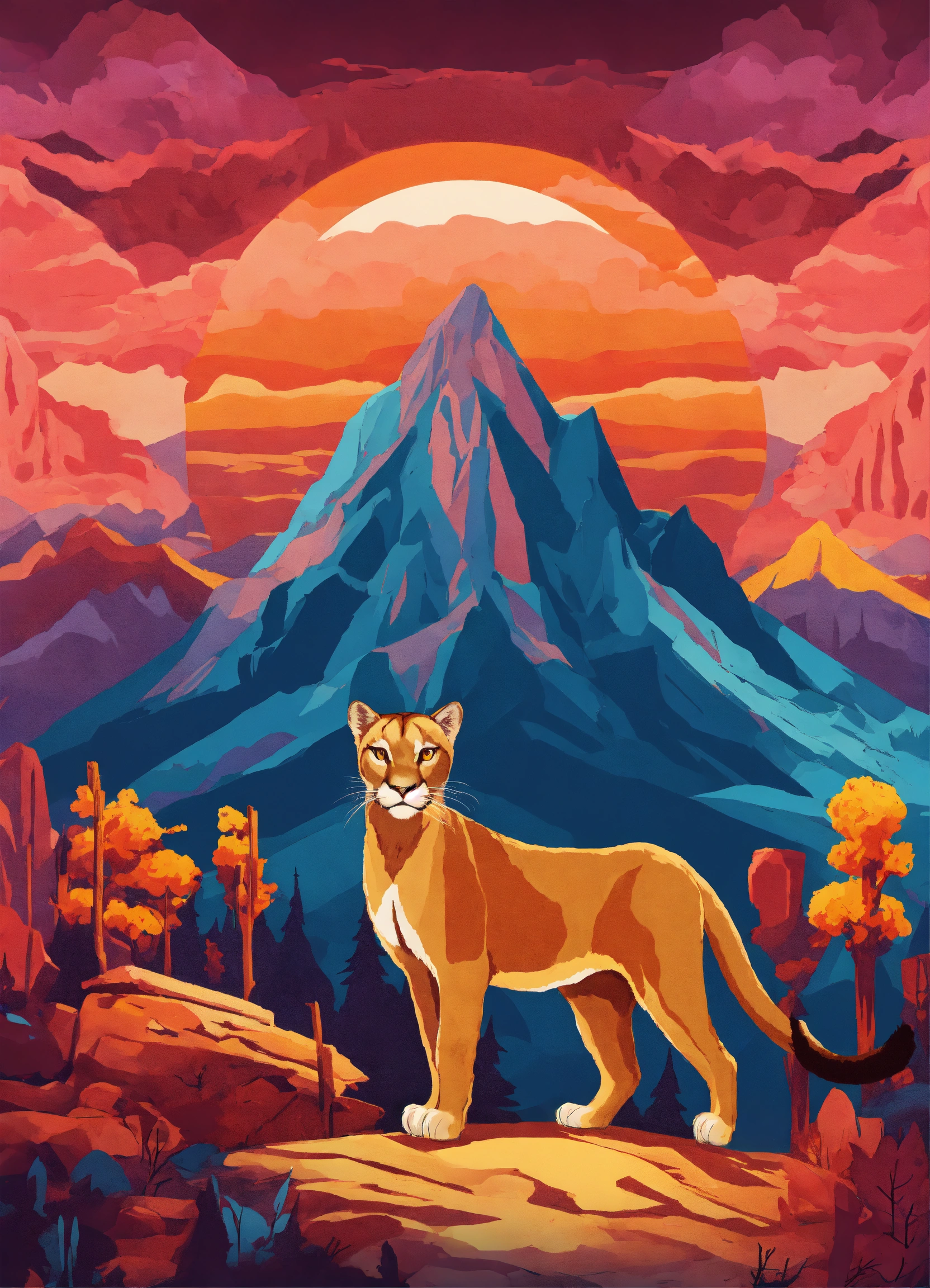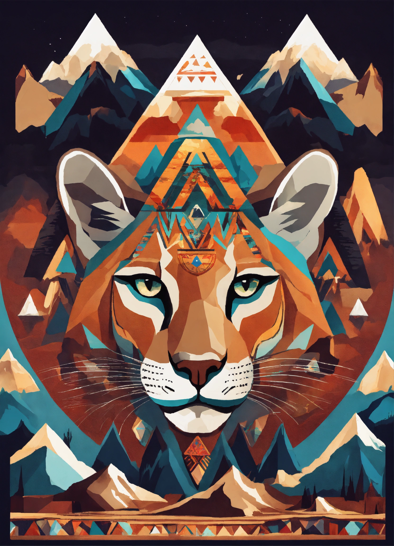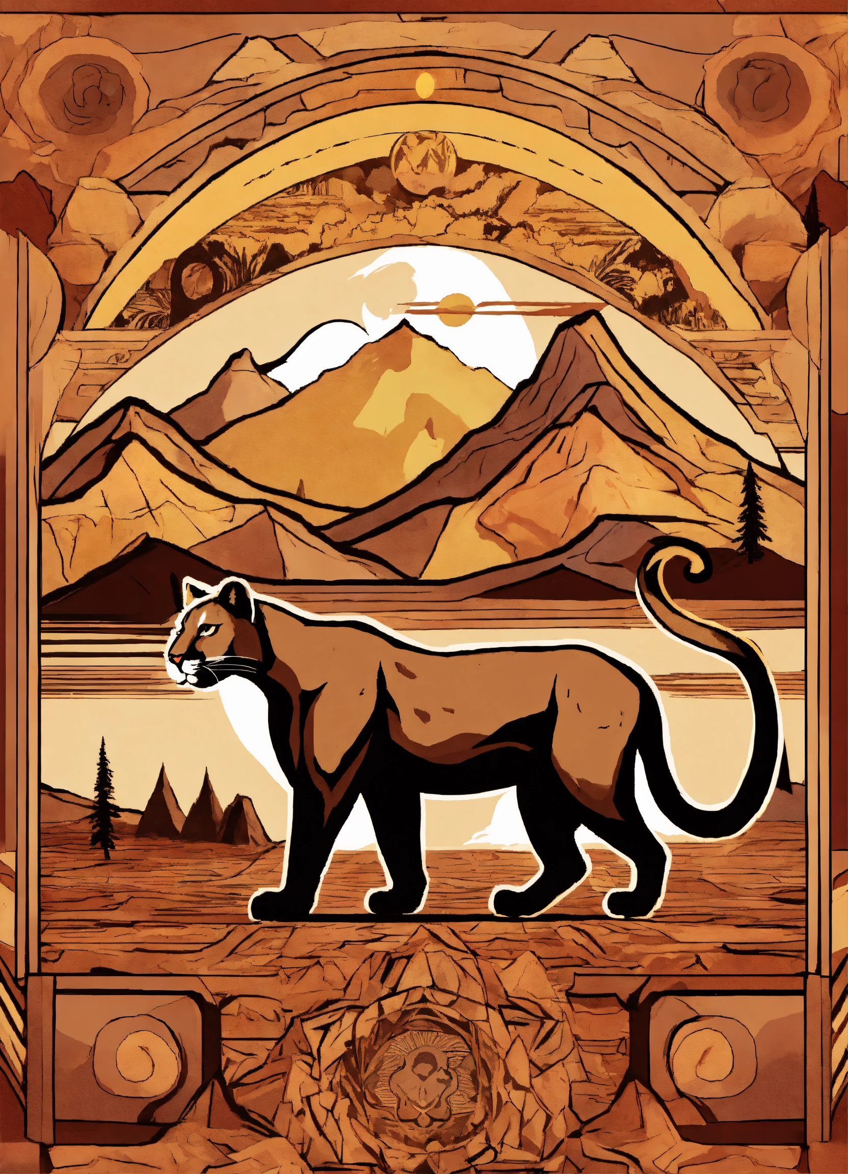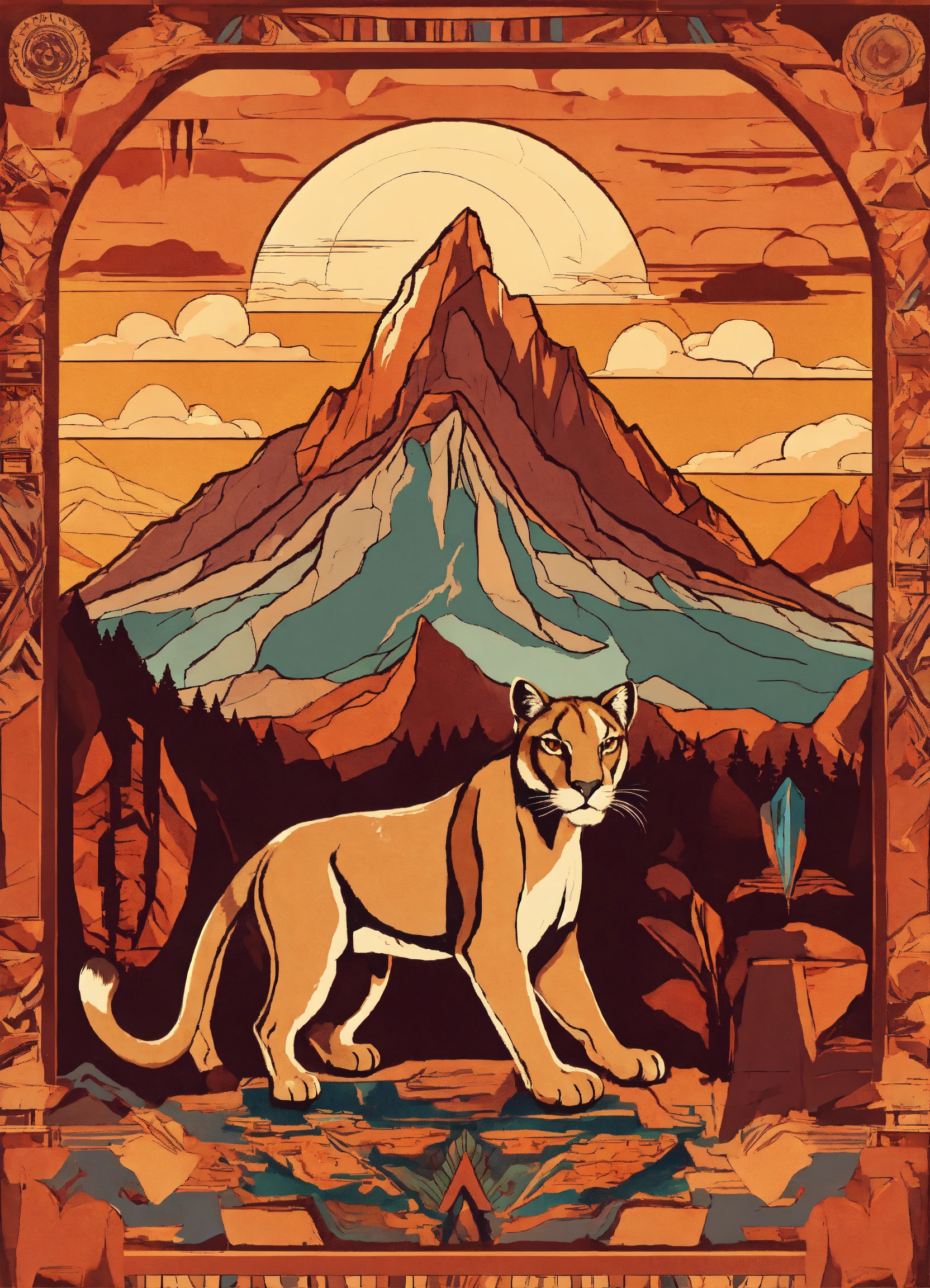 A mountain as a background mountain lion in surrealistic style native american symbols