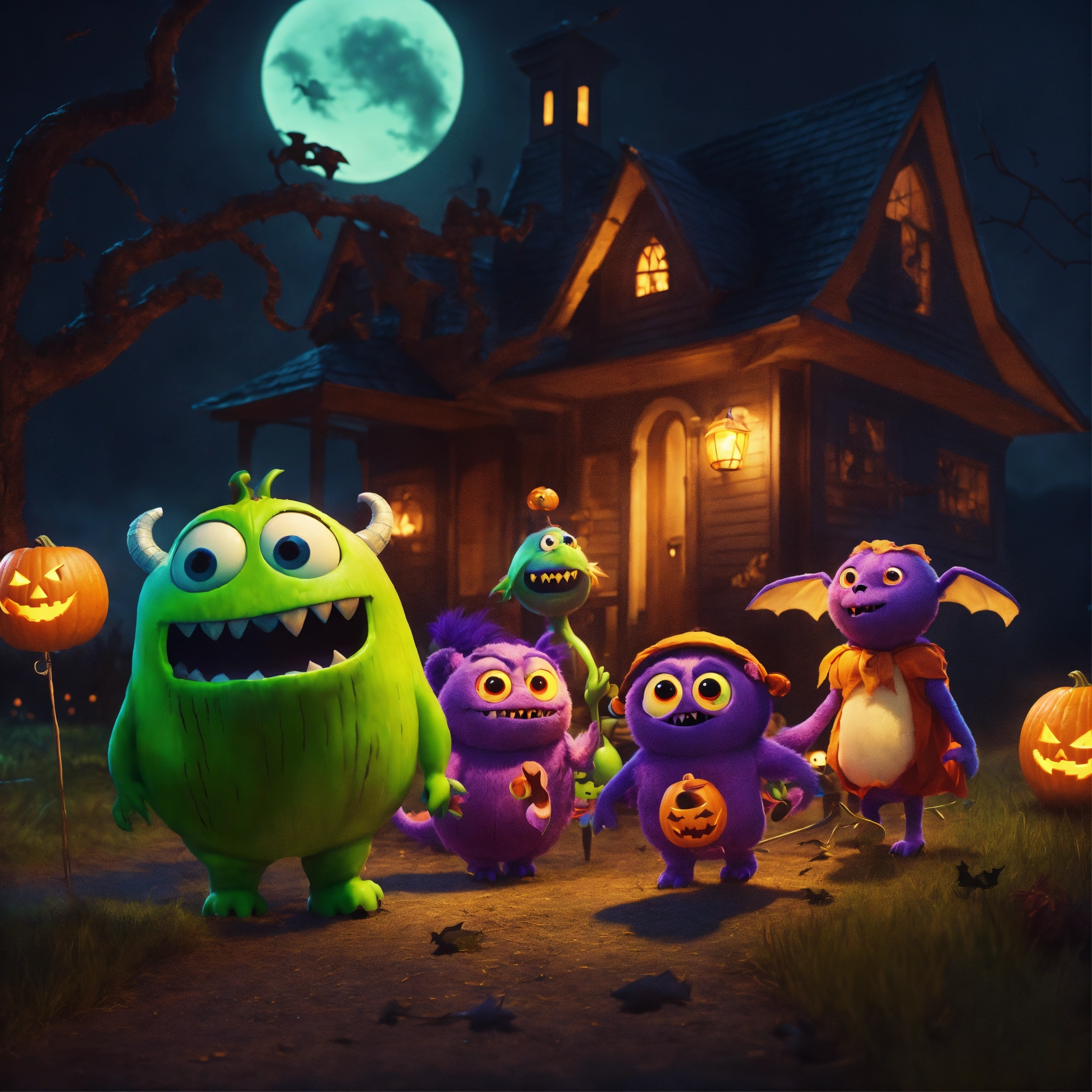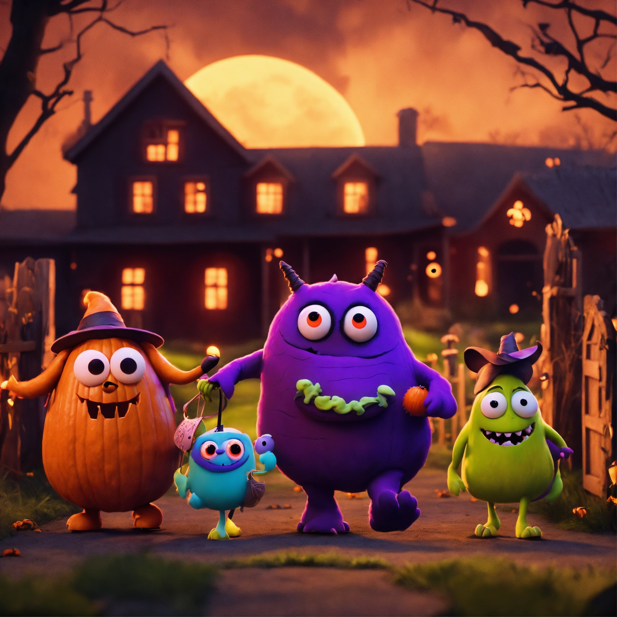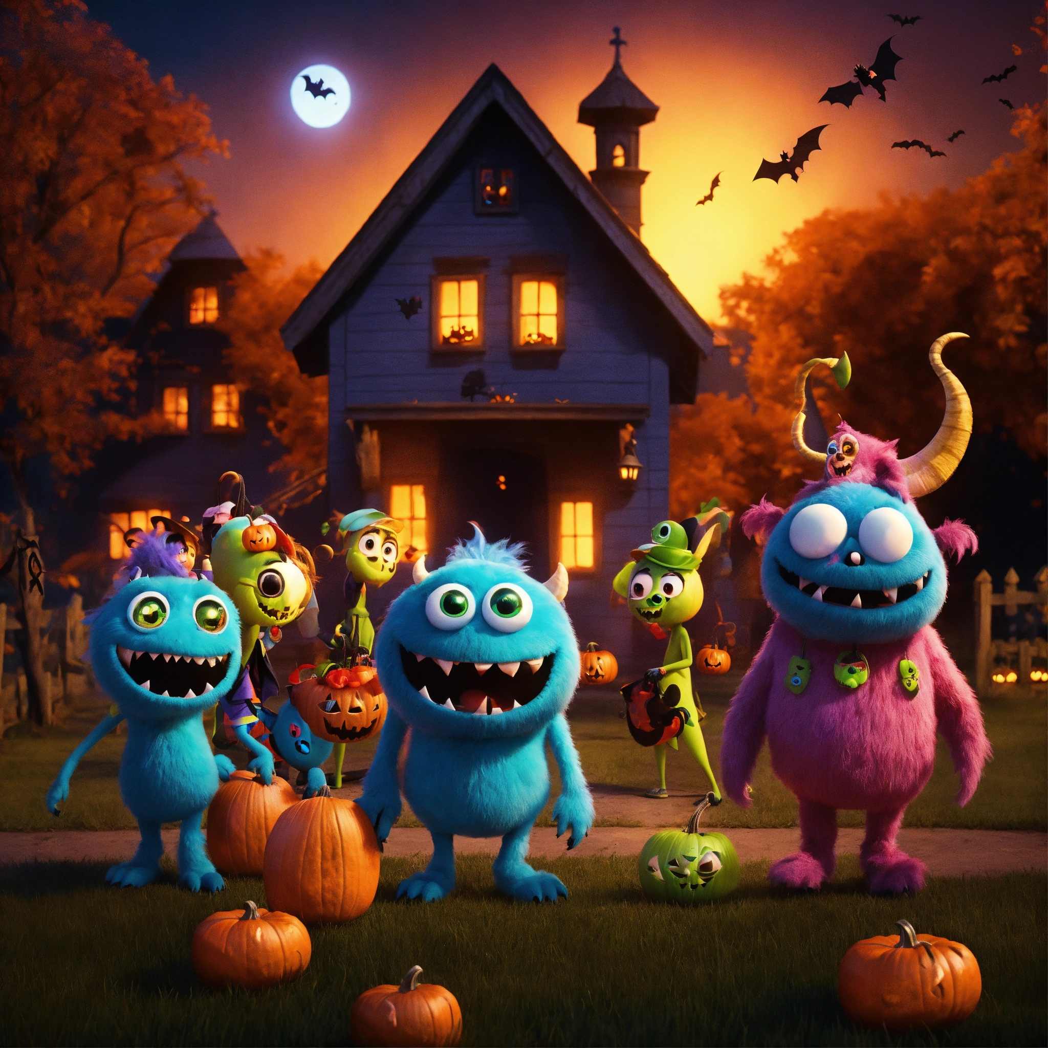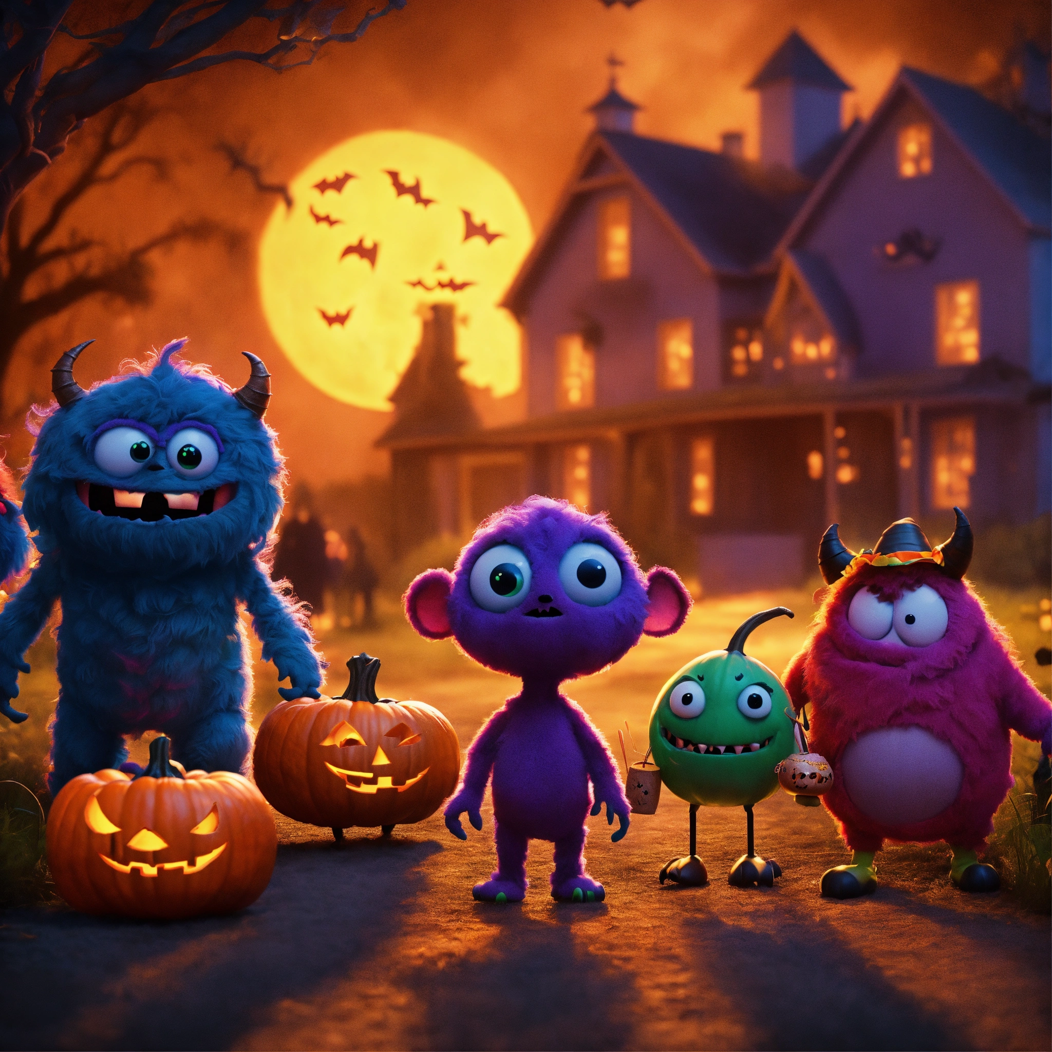 Group of cute friendly pixar-style monsters going trick-or-treating on a haunted farm, dark colors, animated feature film quality but with soft diffusion