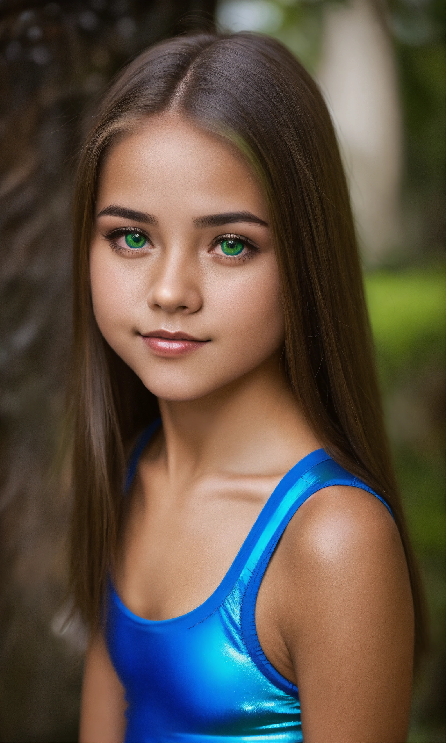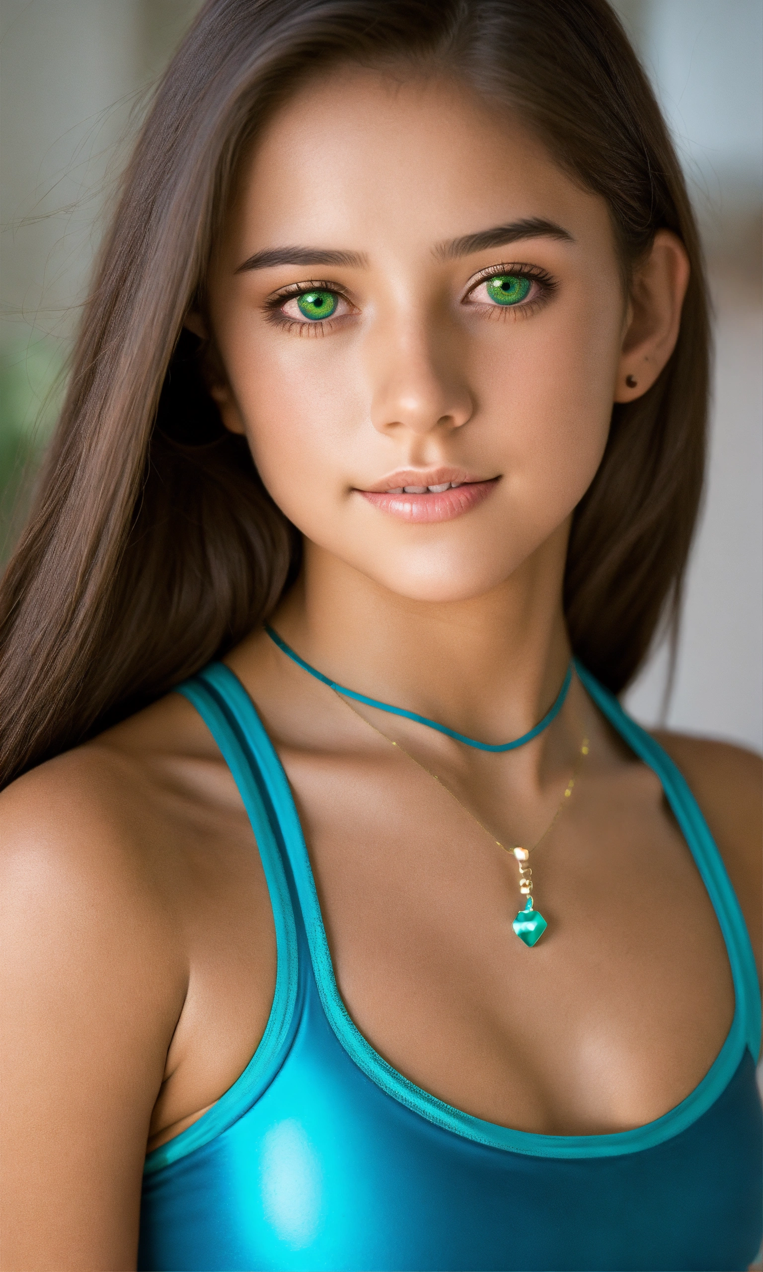 Very pretty tween brunette girl with green eyes, straight hair, very shiny hair, centre parting, cute, petite, shiny lycra blue tiny gym shorts, blue shiny lycra crop bra top, tanned olive skin
