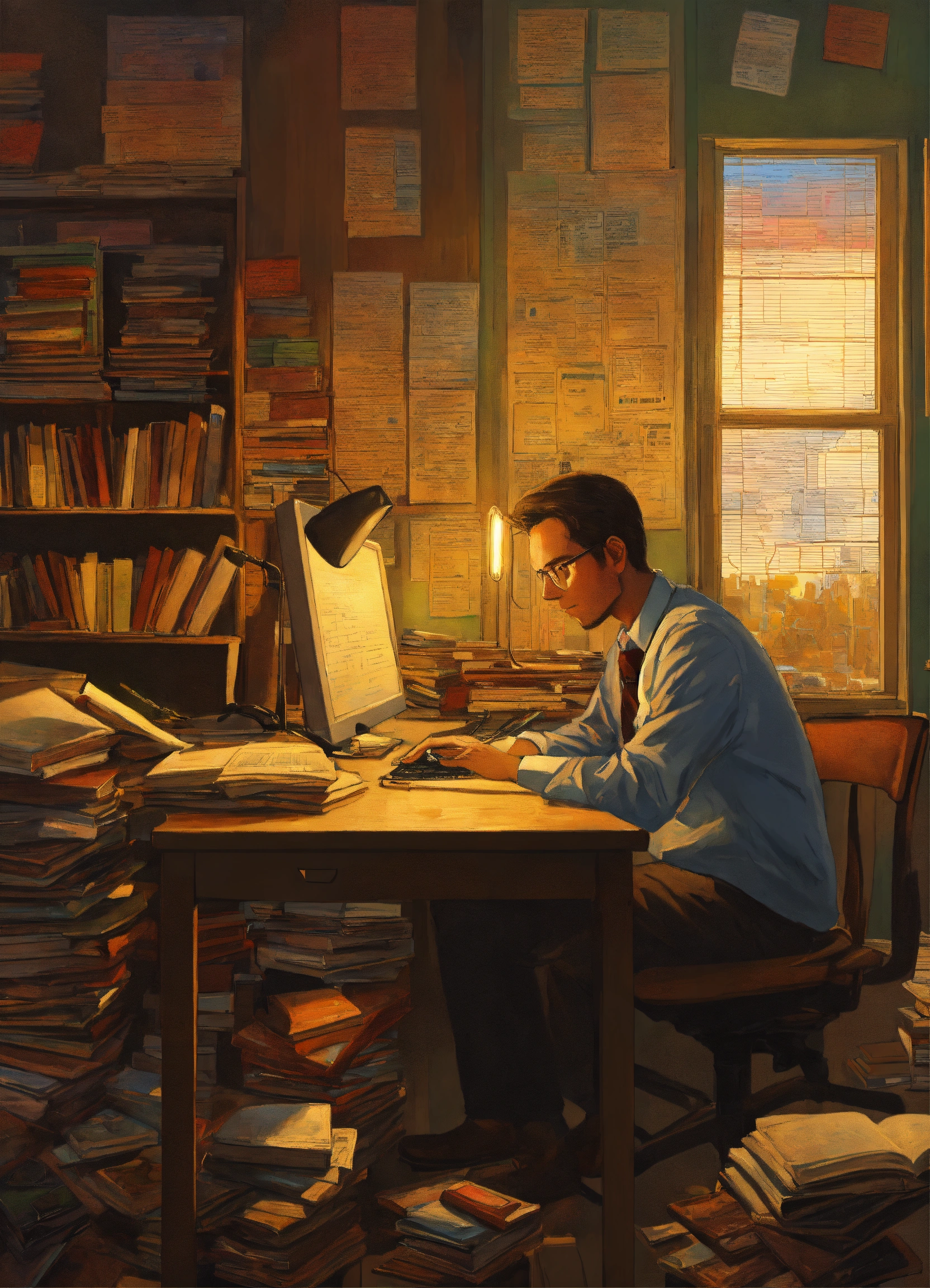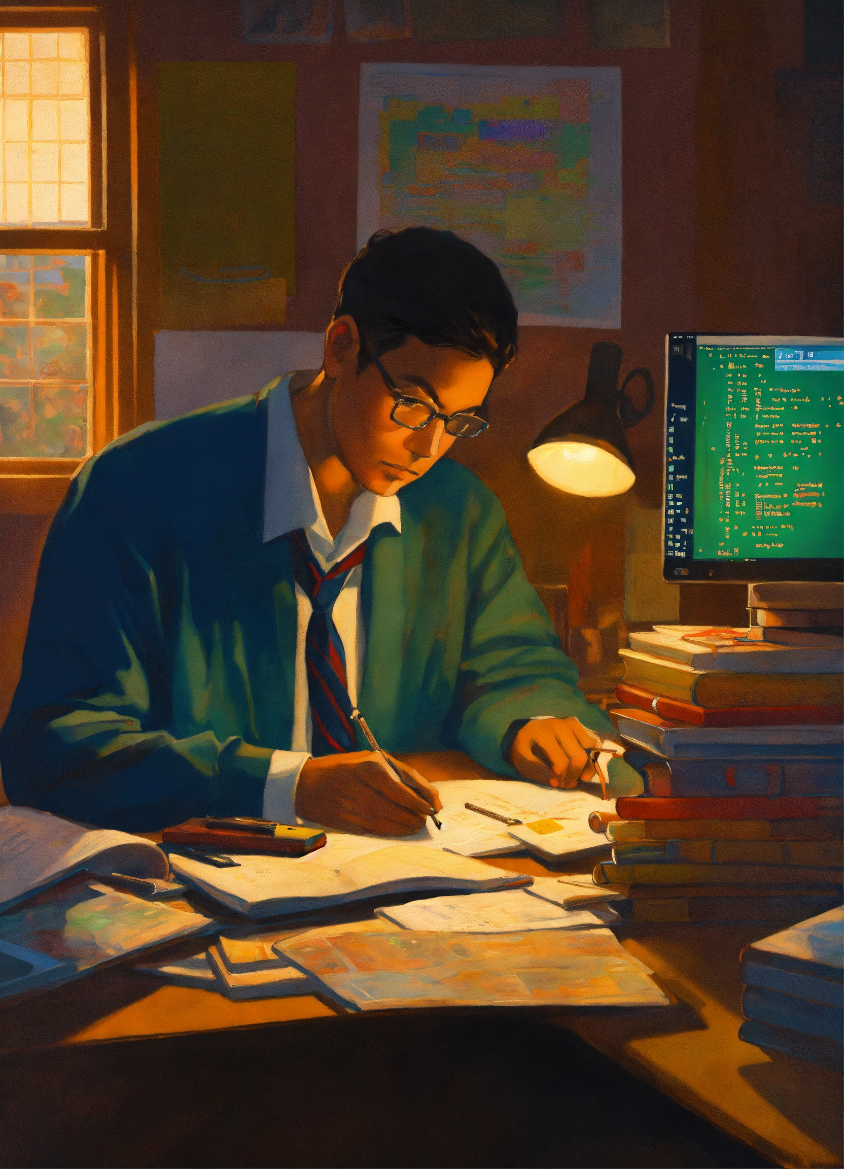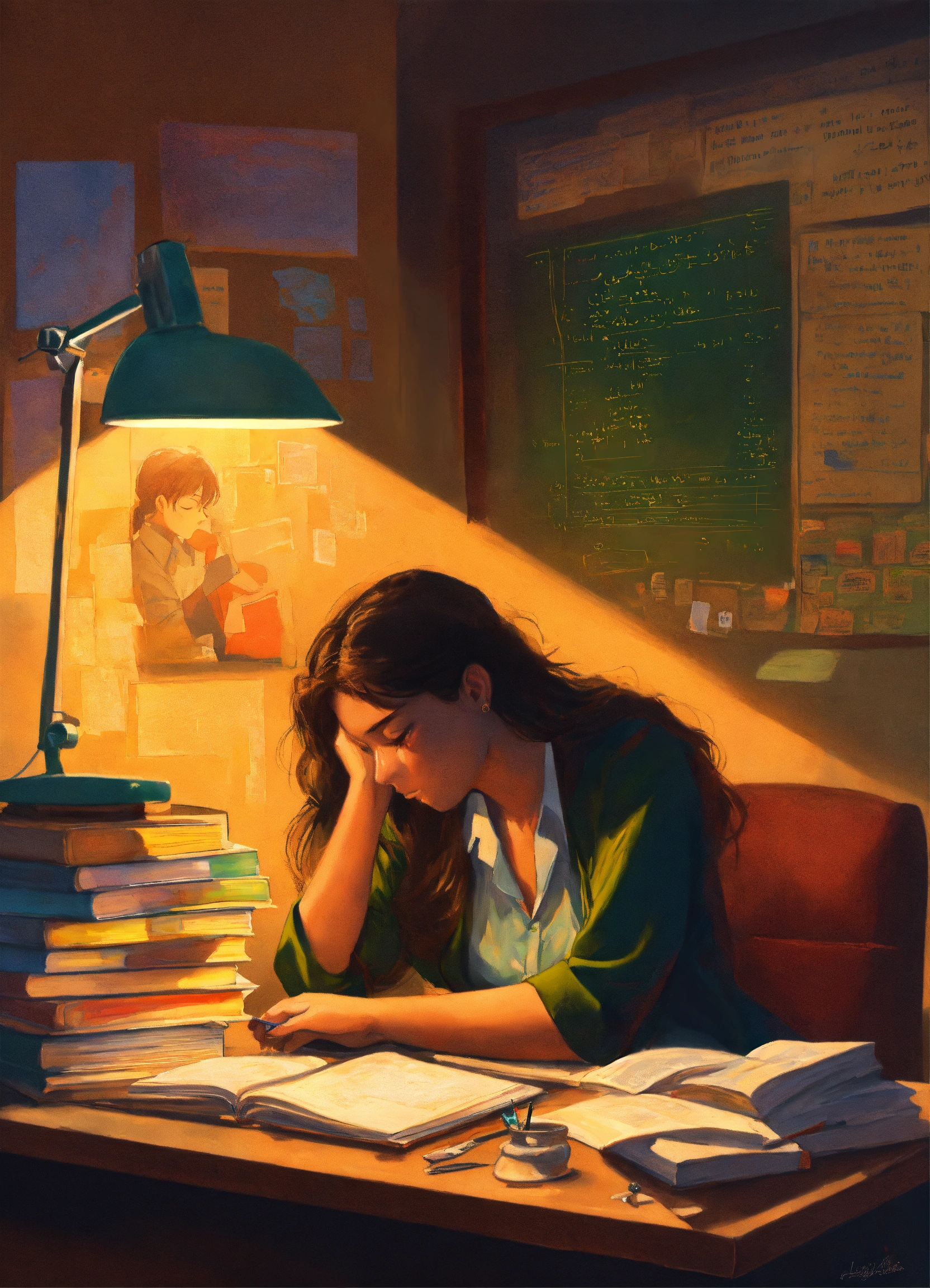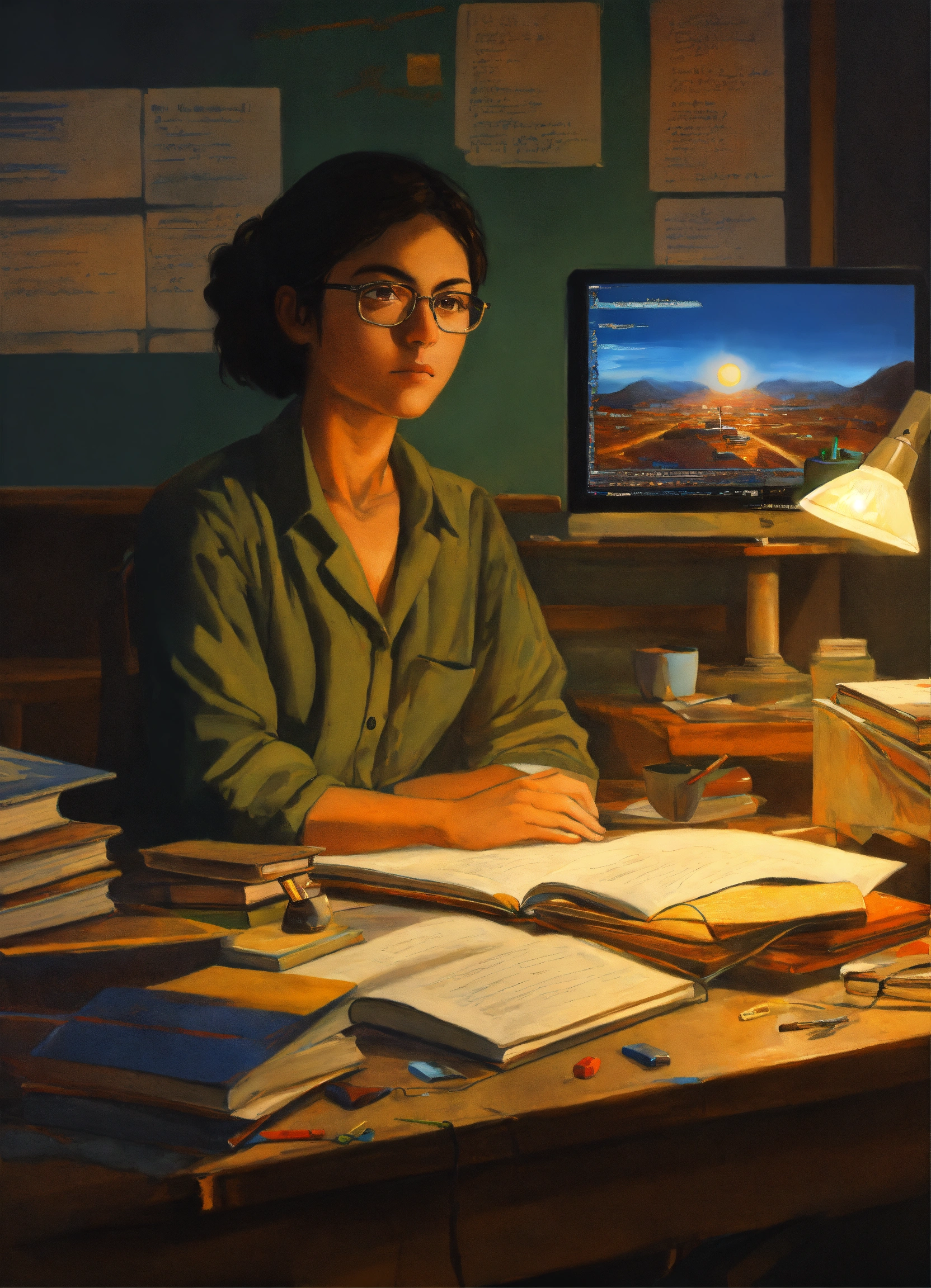 In the painting, a dedicated teacher sits at a cluttered desk, softly illuminated by the warm glow of a computer screen. the muslam teacher is hunched over, deep in concentration, with a stack of textbooks beside them. the computer displays lines of code and the logo of lexica, symbolizing the software project. the teacher's tired but determined expression reflects the sacrifices made to ensure the project's success. the background is dim, emphasizing the teacher's solitary late-night effort. this painting captures the essence of a teacher's sacrifice for the sake of creating a proper with students in classroom