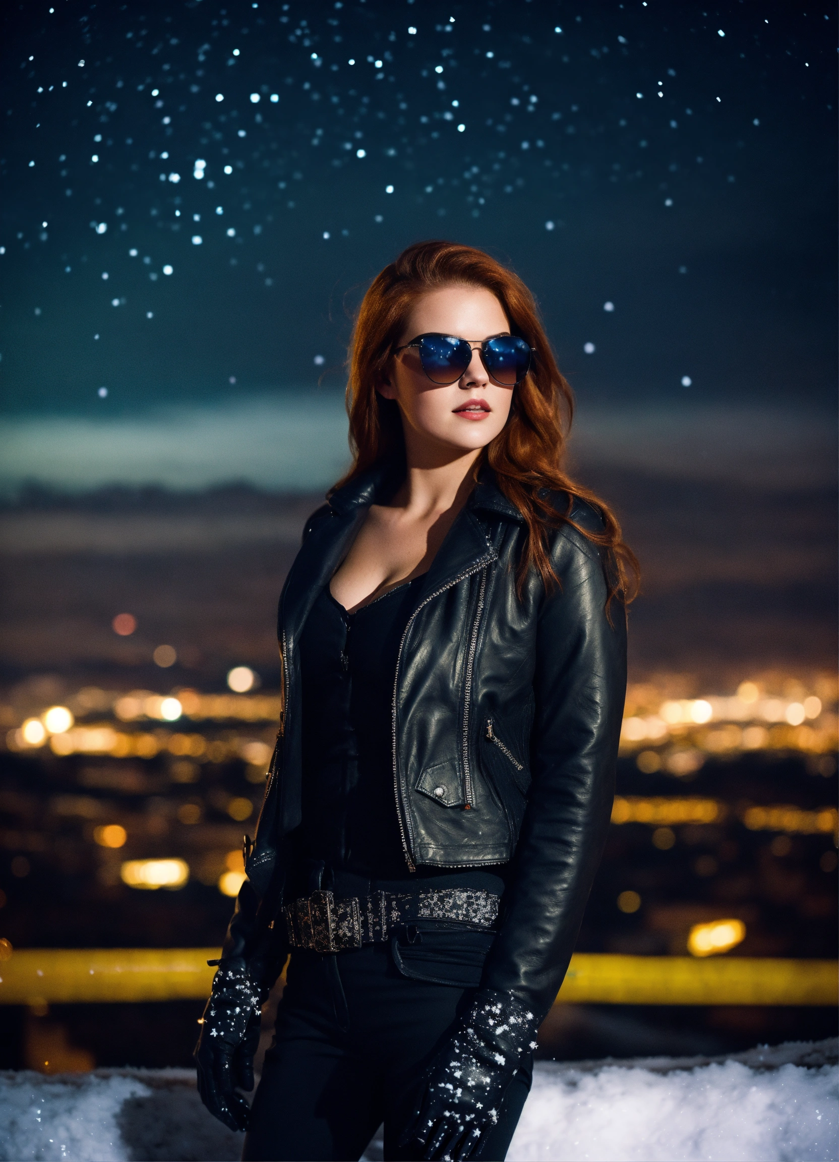 A real photo of a 25 year old woman with looking like a real version of ginny weasly, wearing black leather jacket pants corsets and gloves. urban background in the sky we see stars. full body snow at night. sunglasses