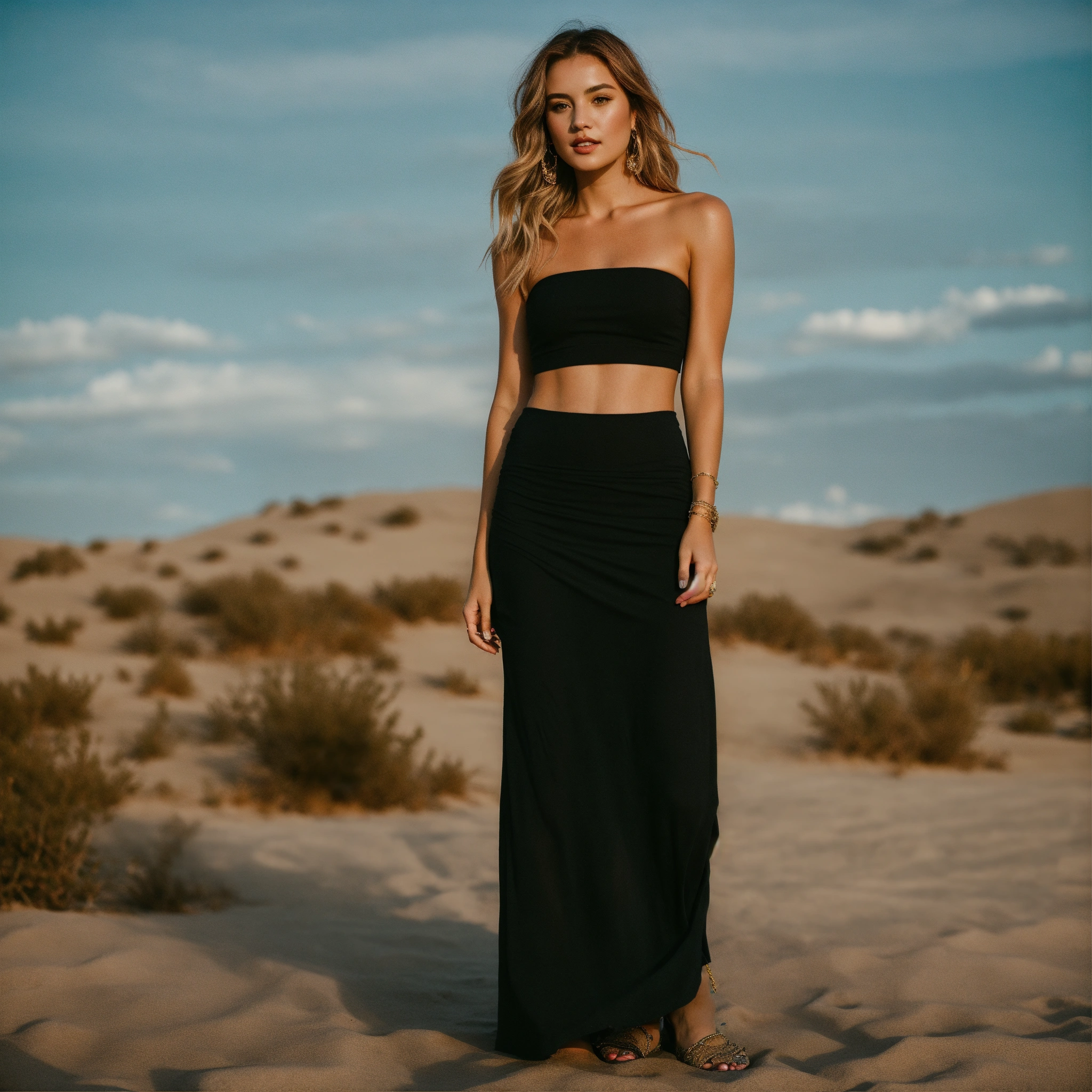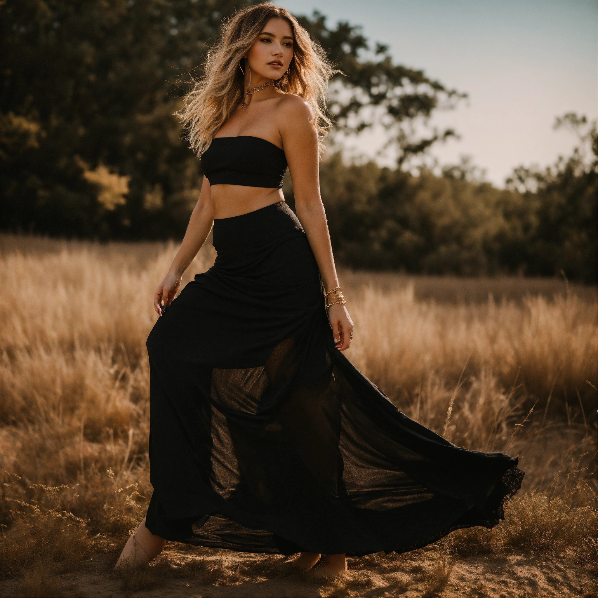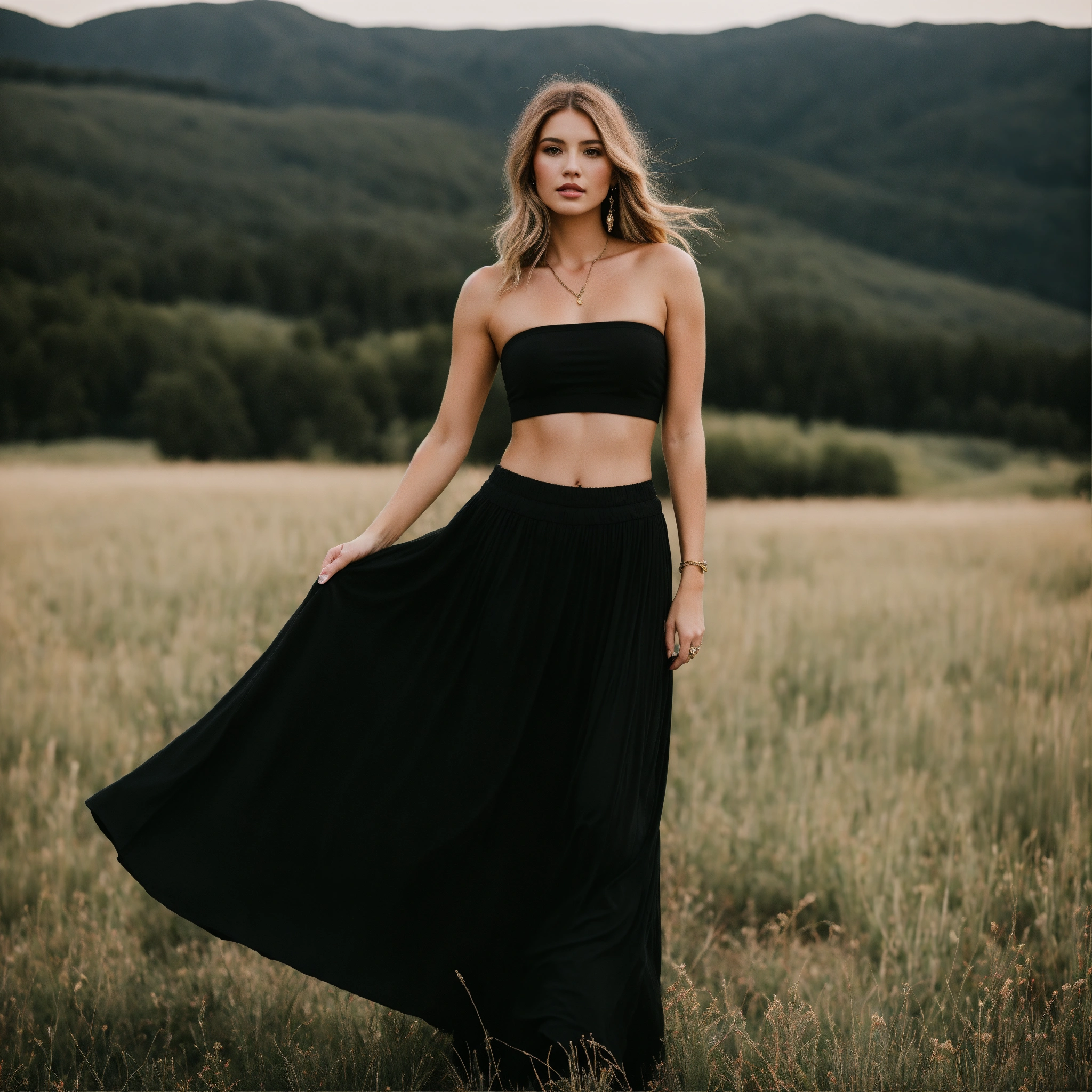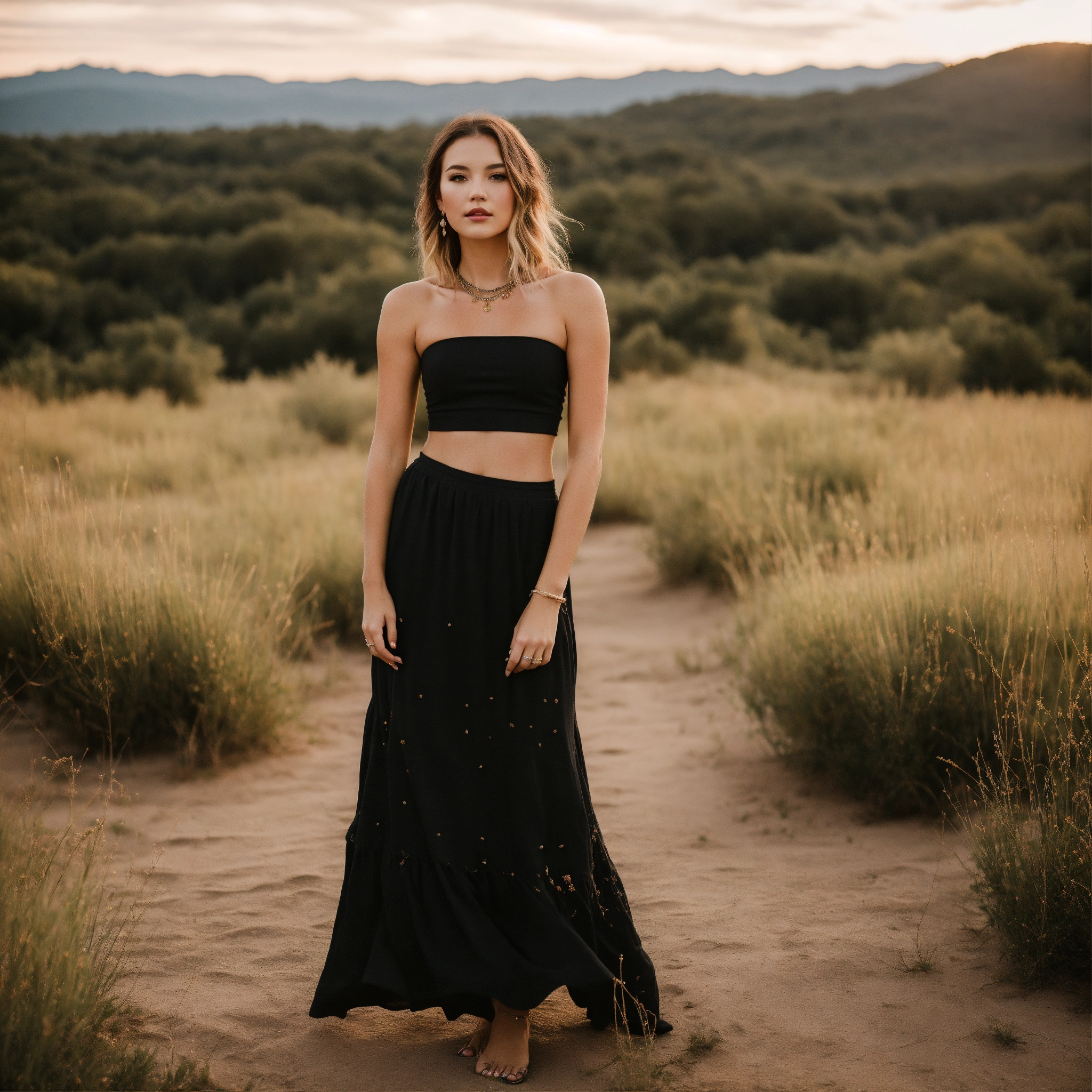 Caucasian woman wearing a fitted plain basic black bandeau and long skirt for a free people boho photoshoot
