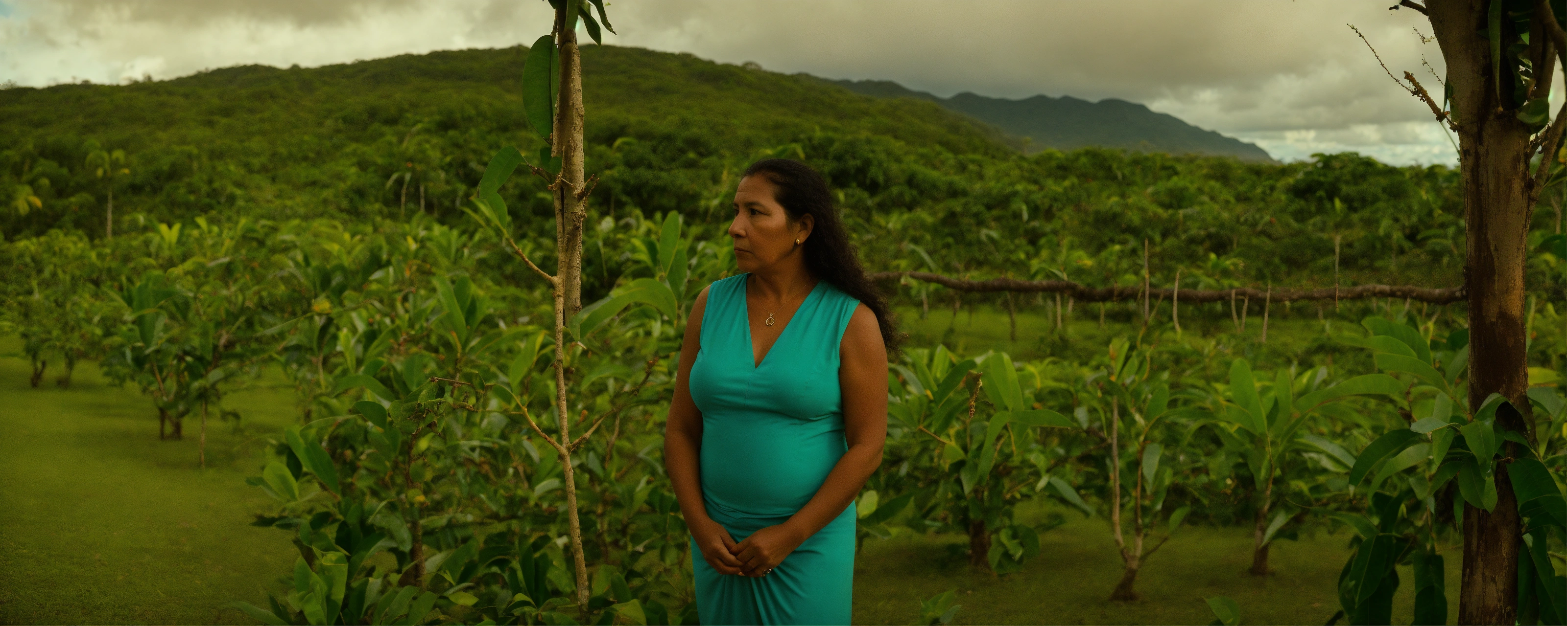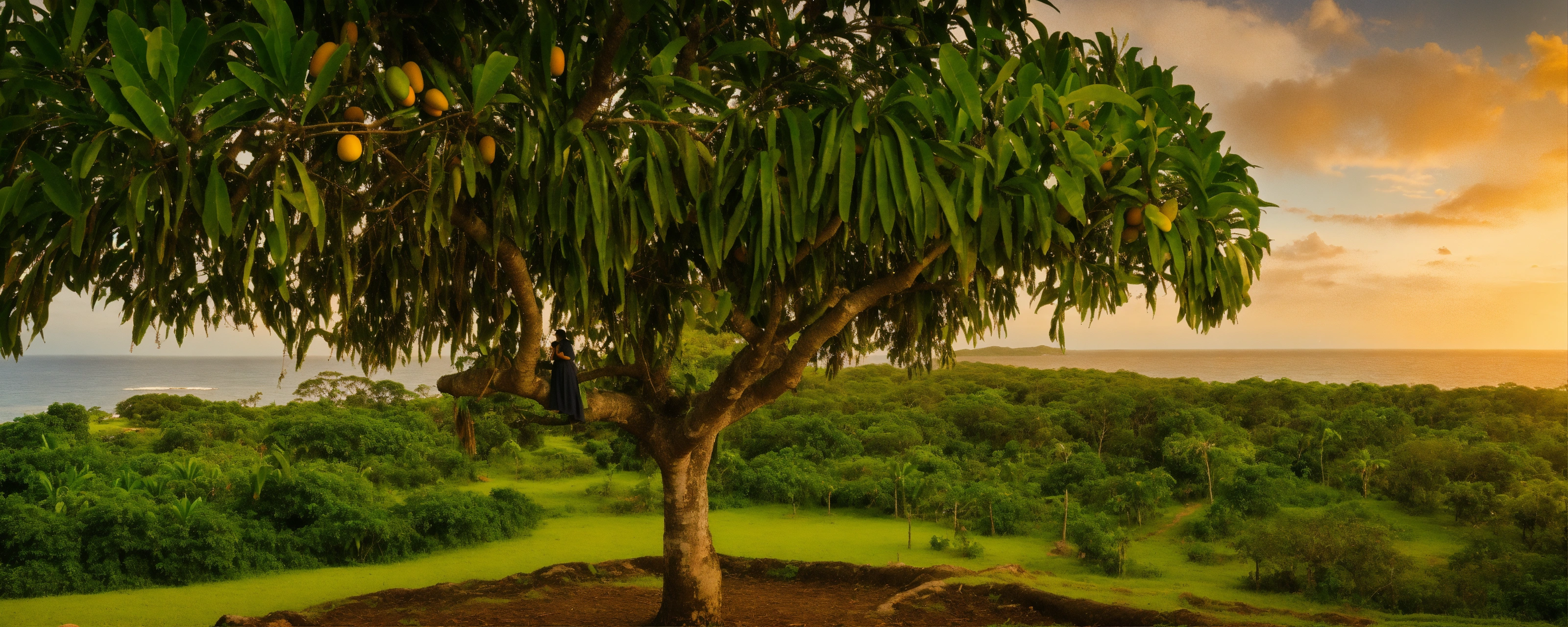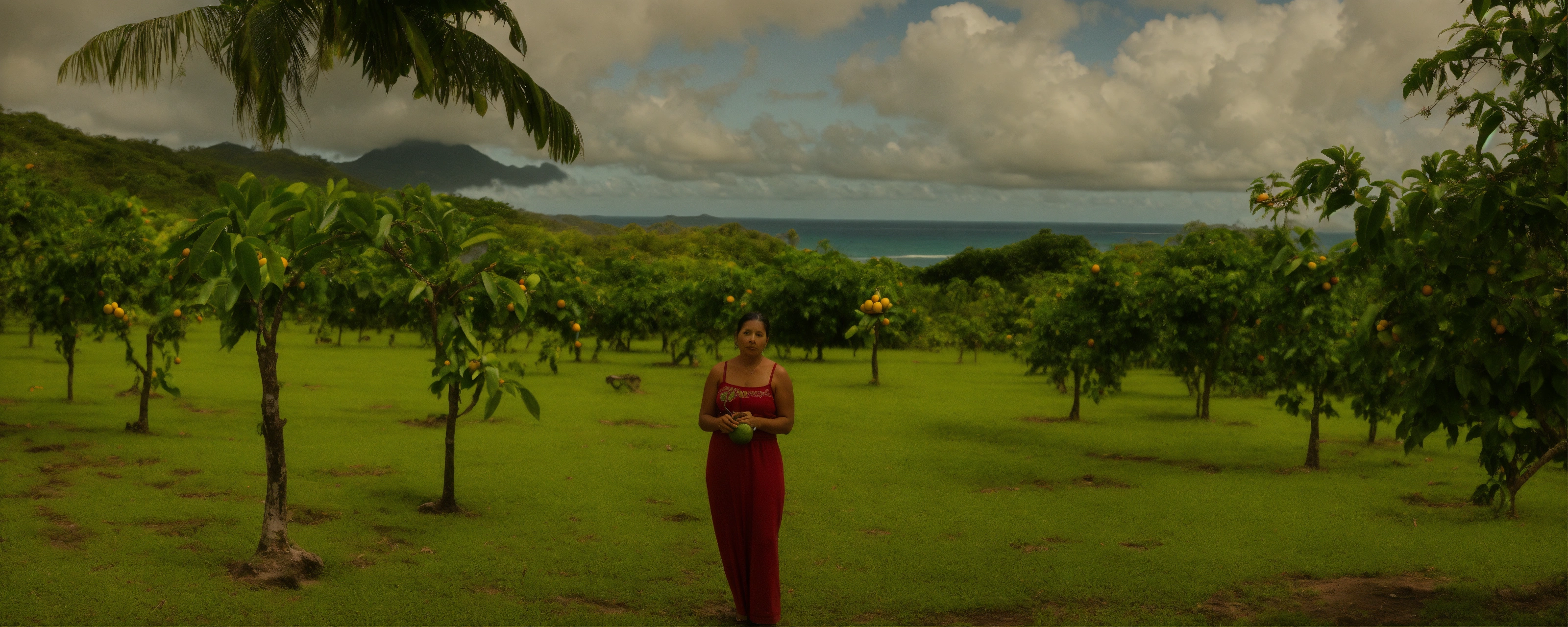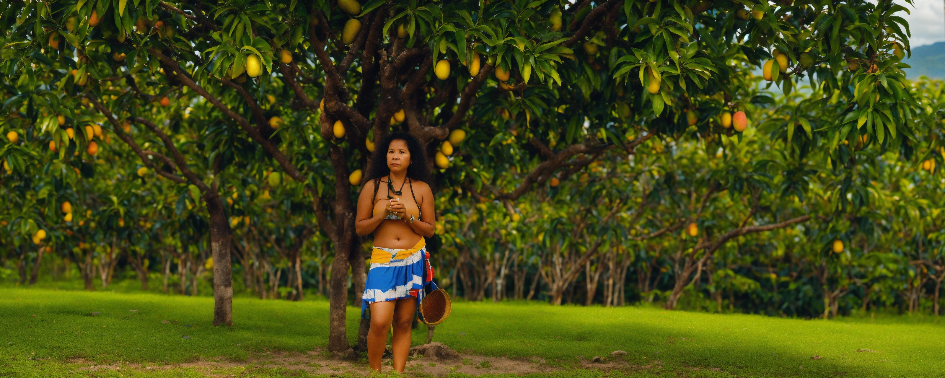 A taina woman standing by a mango tree. there are native animals and plants from puerto rico around her. in the horizon, there is a. itu