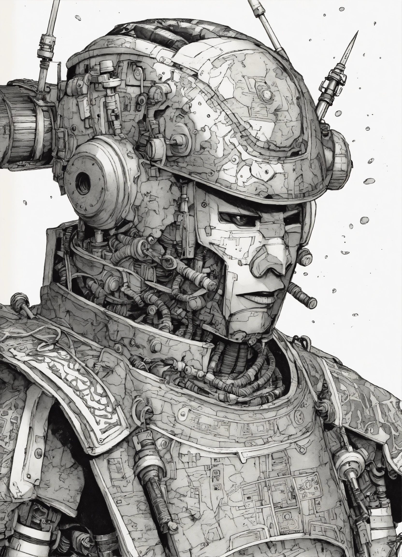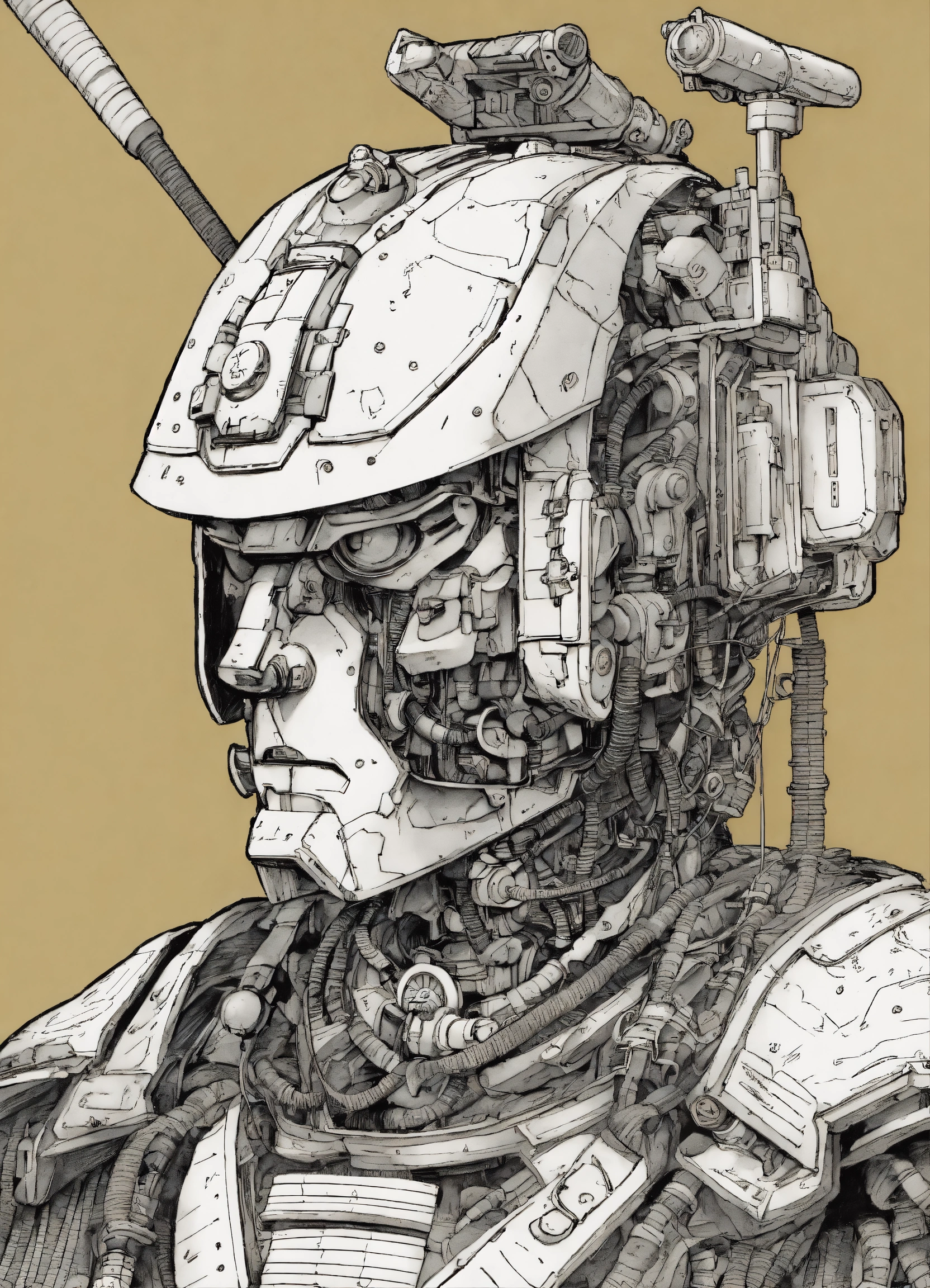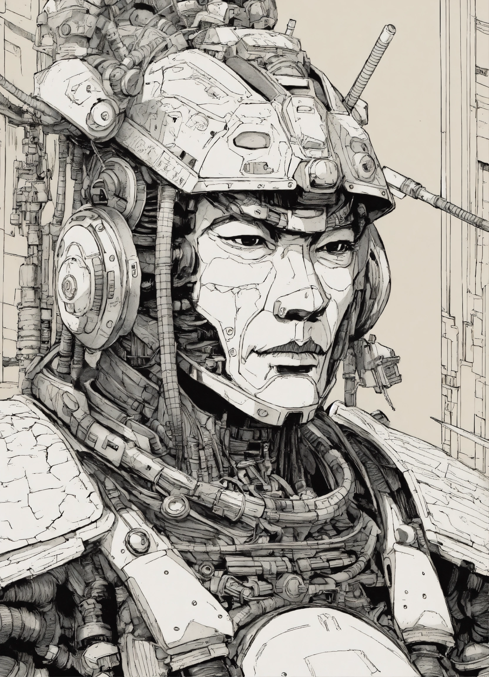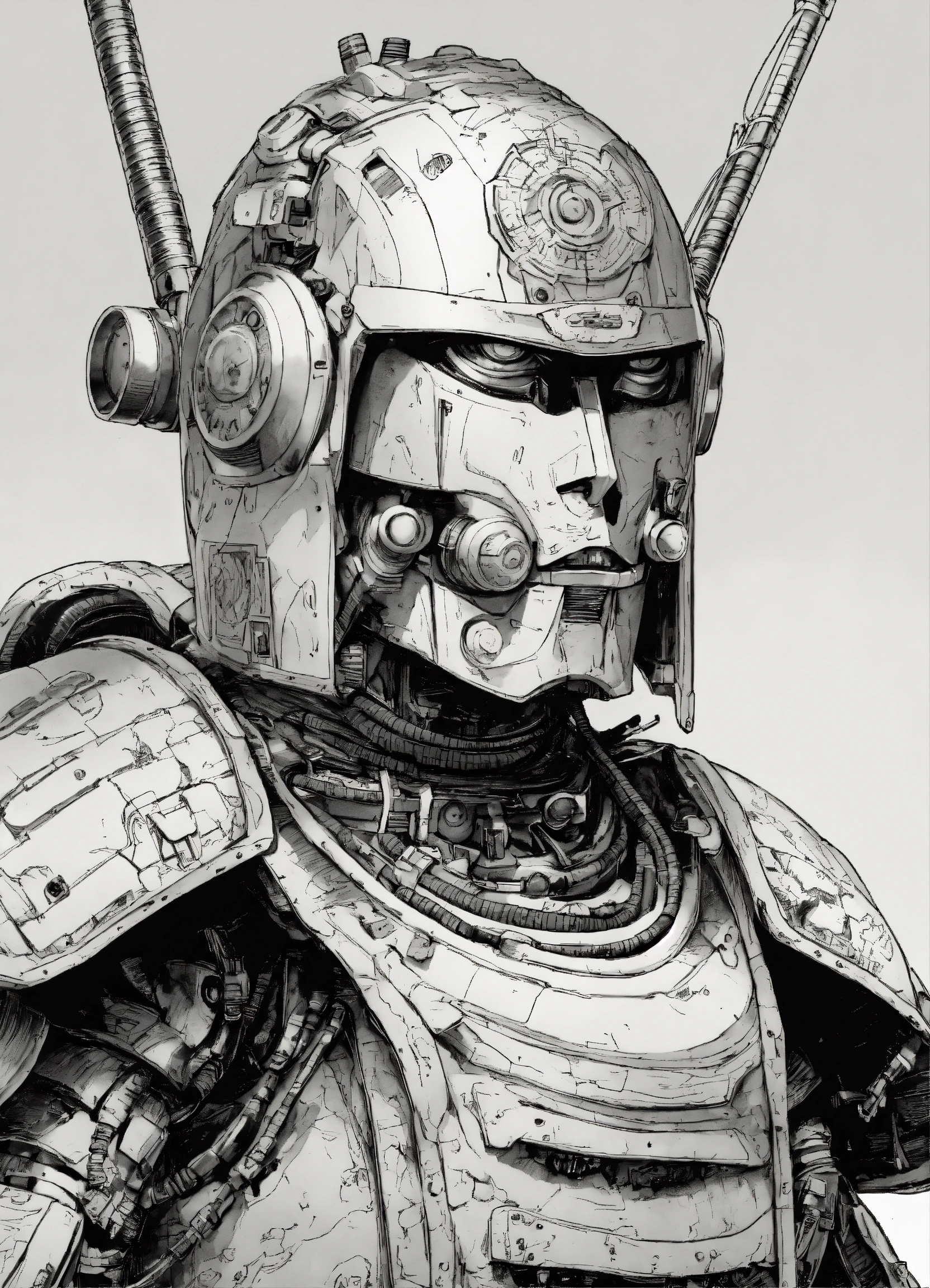 Detailed pen and ink illustration of a samurai robot cyborg, head only, detailed anthropology, by herge, in the style of tin-tin comics, detailed, high quality