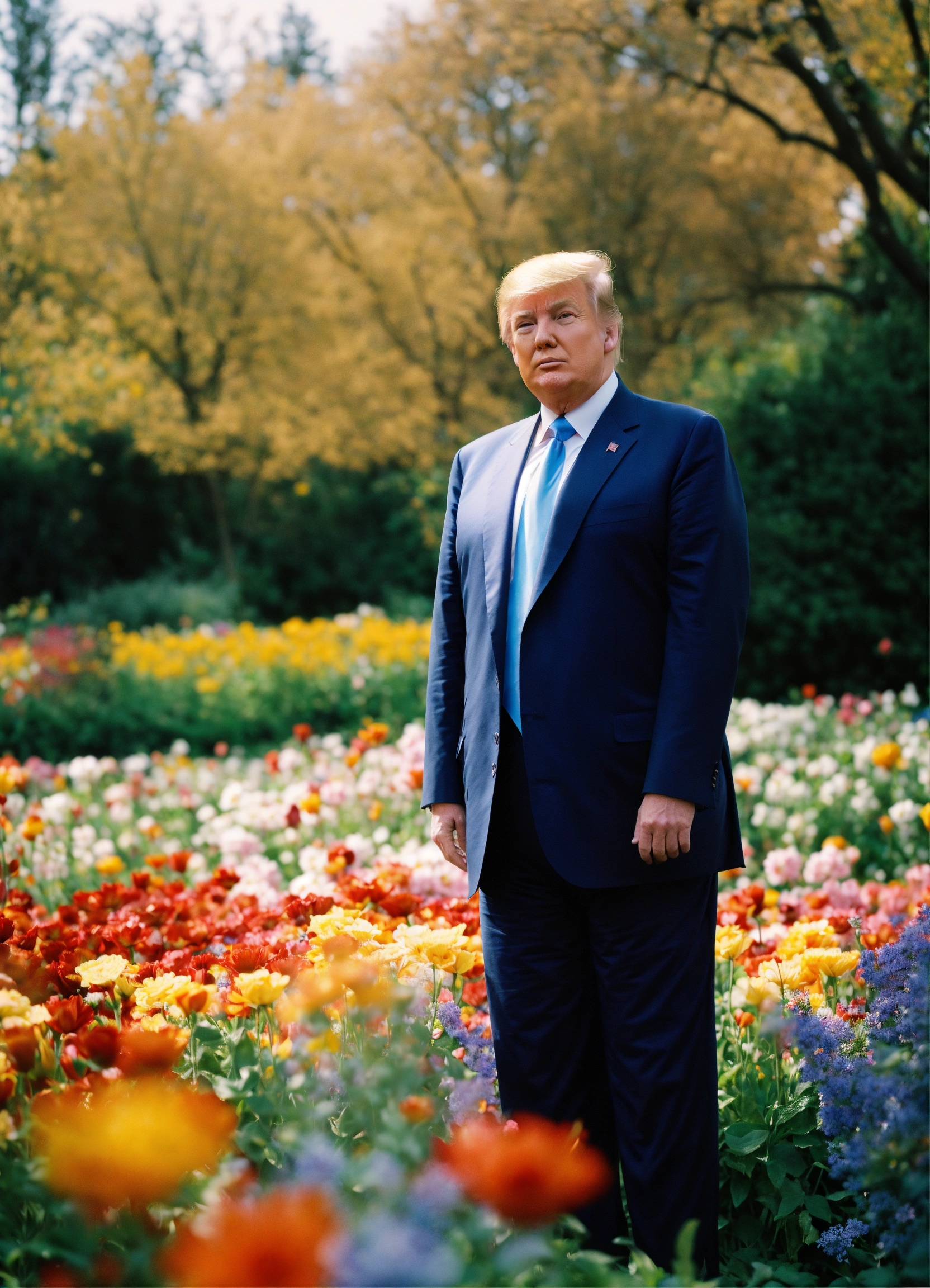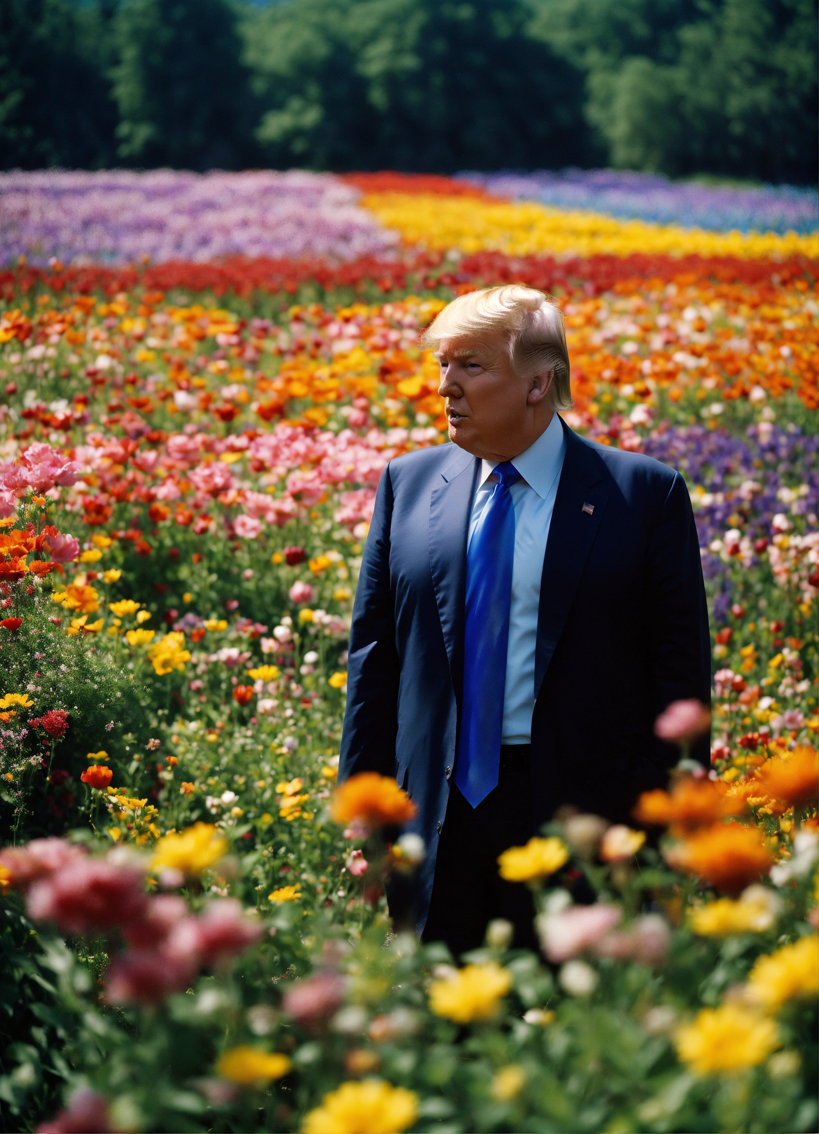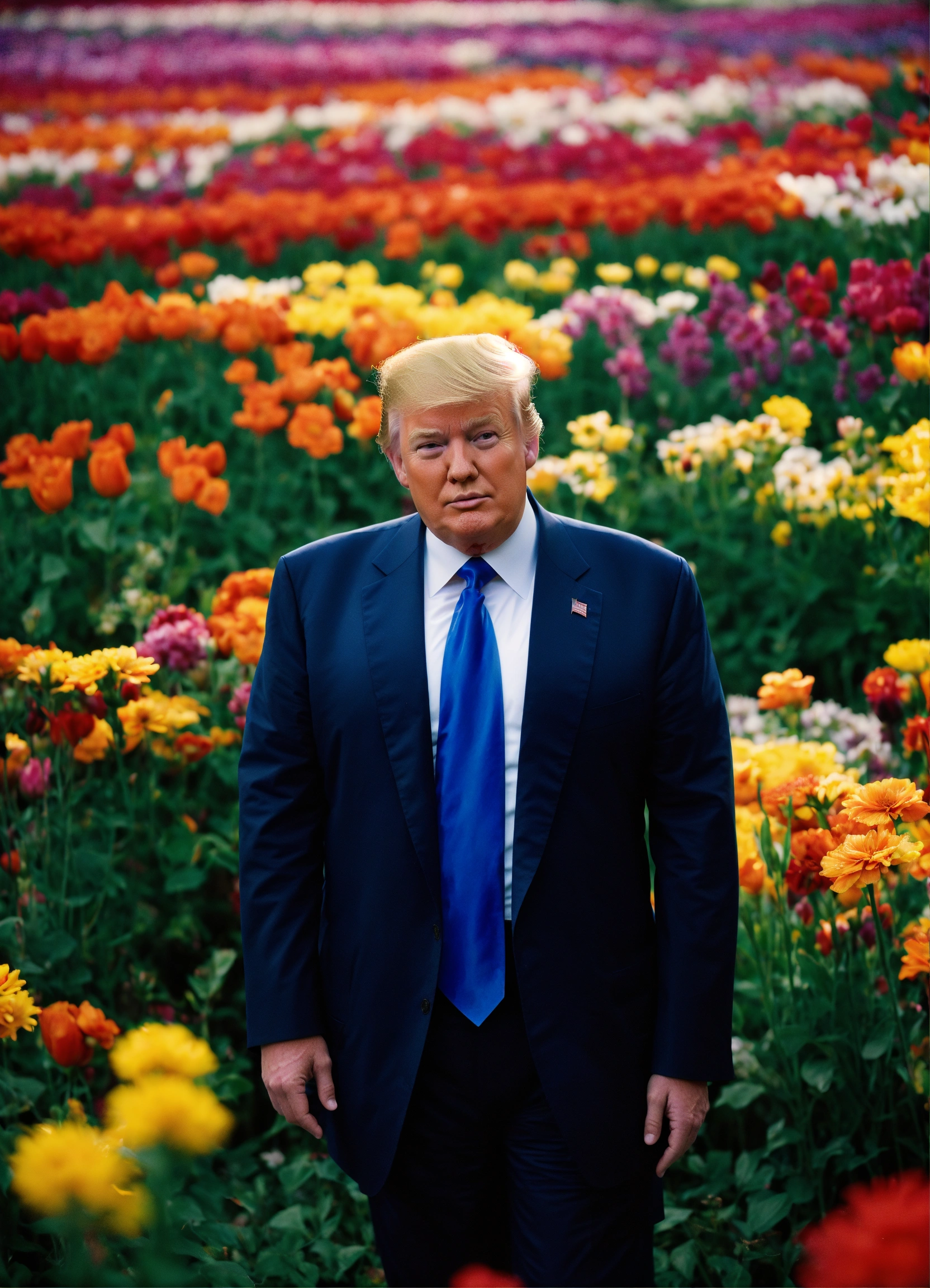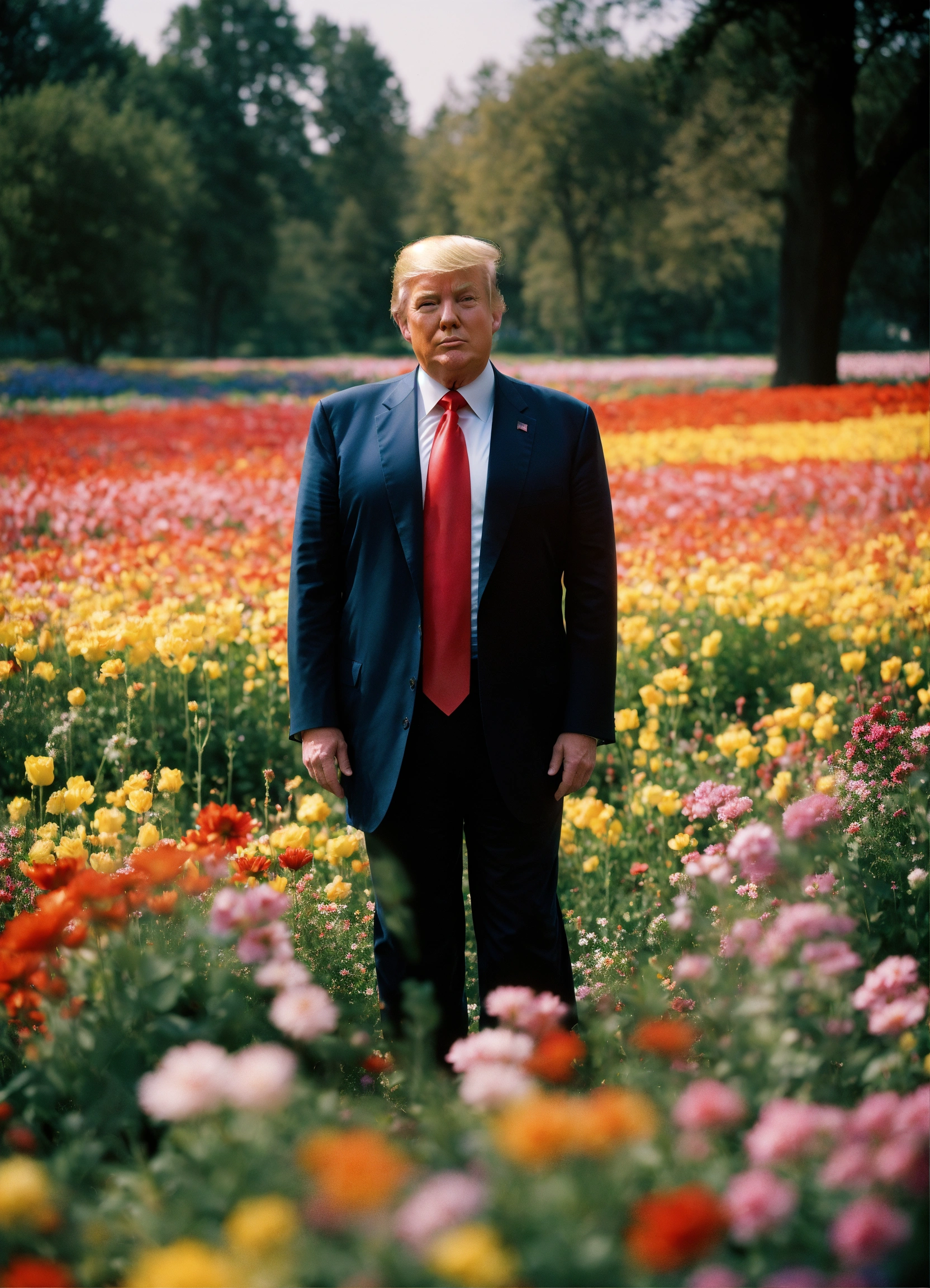 Happy donald trump standing in a beautiful field of flowers, colorful flowers everywhere, perfect lighting, leica summicron 35mm f2.0, kodak portra 400, film grain