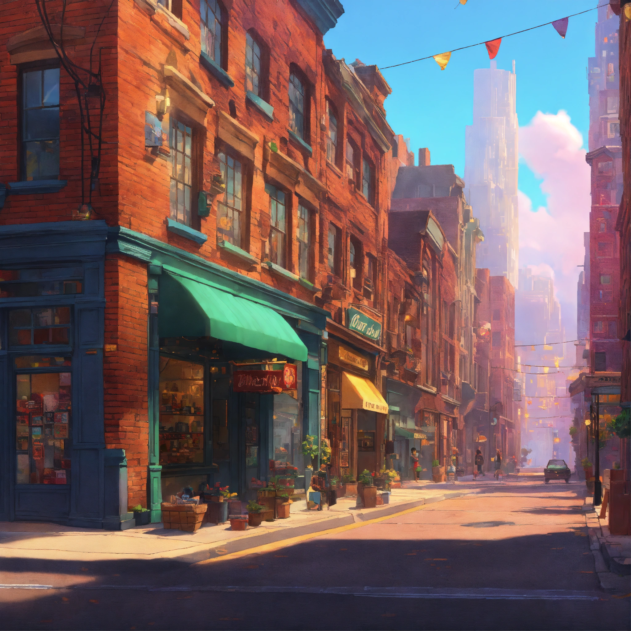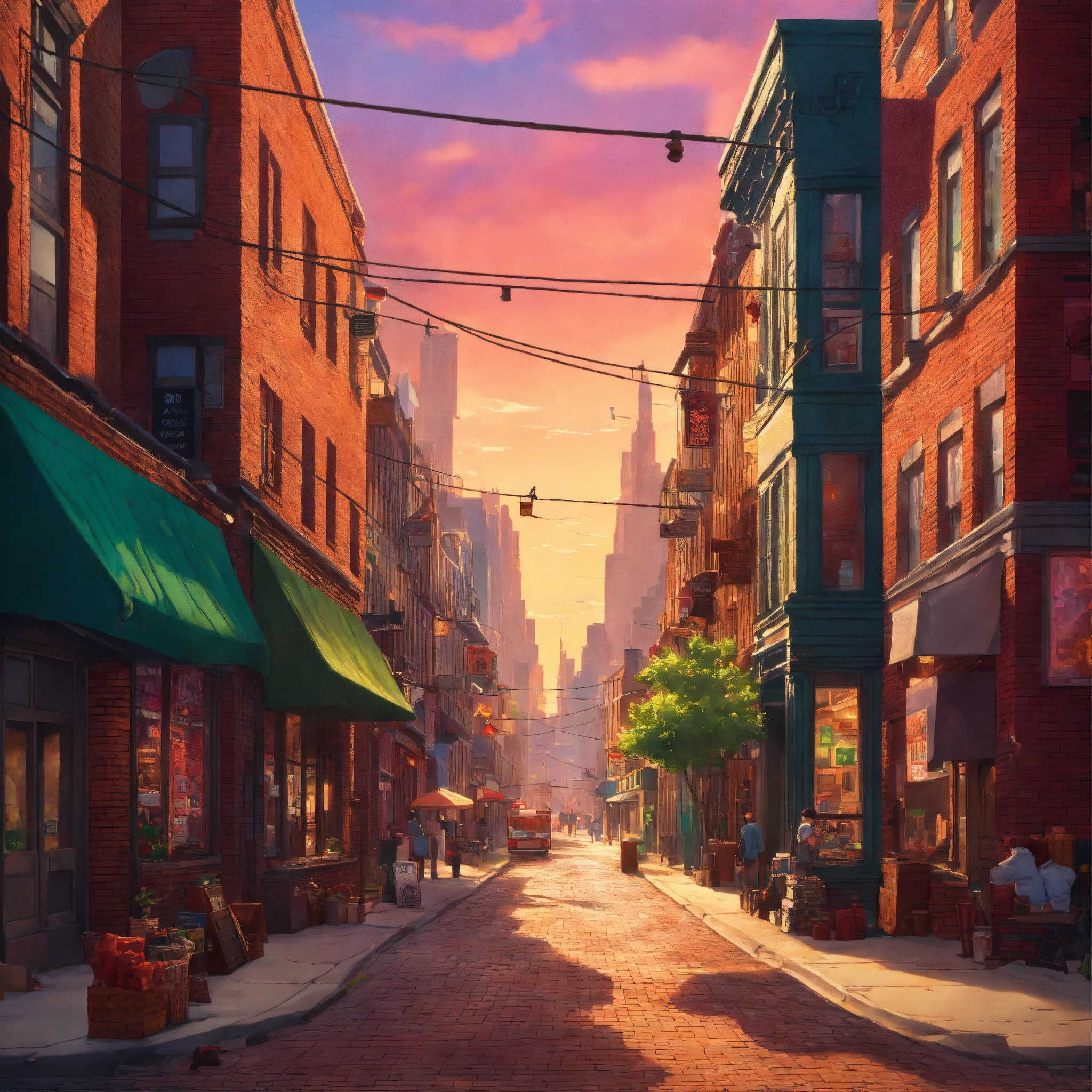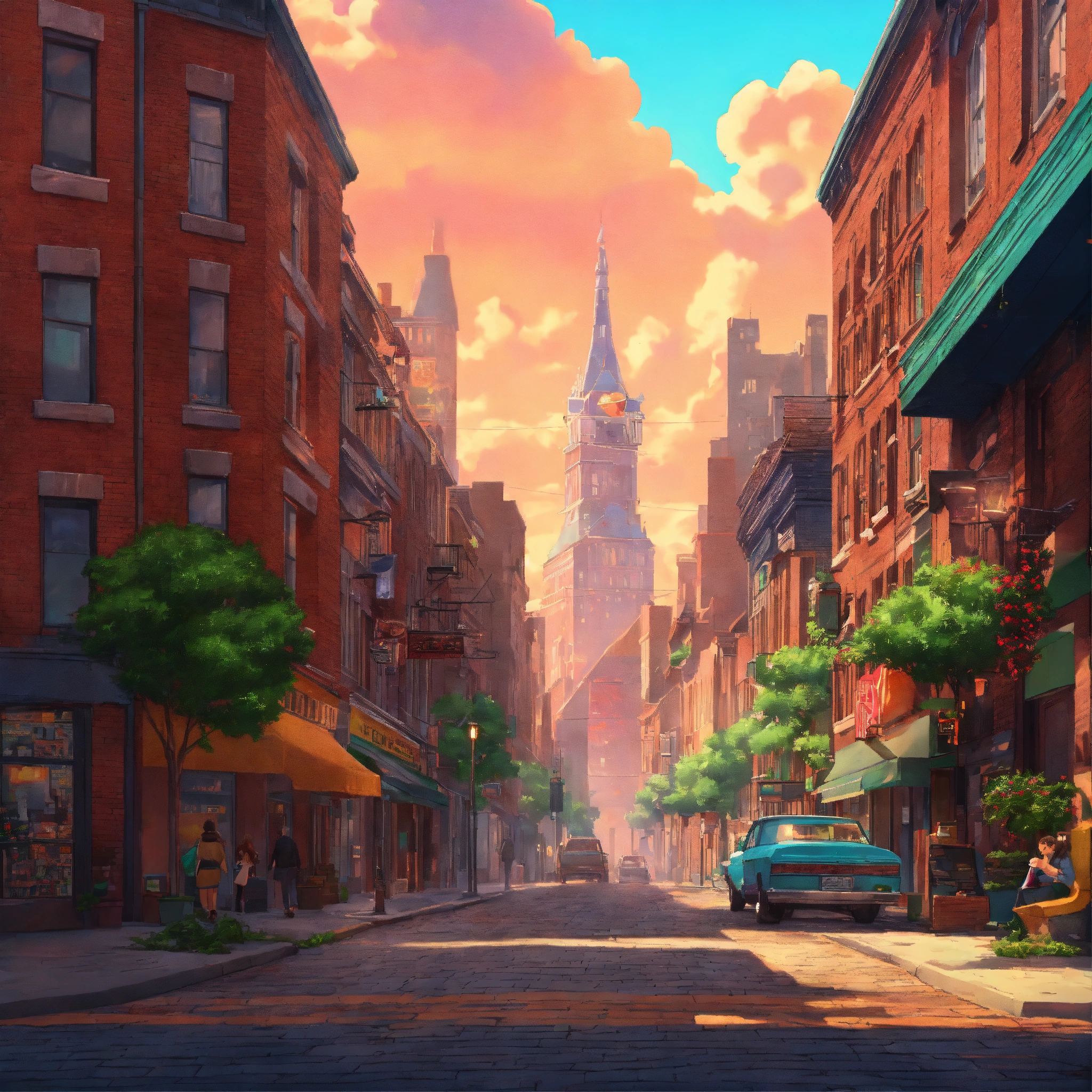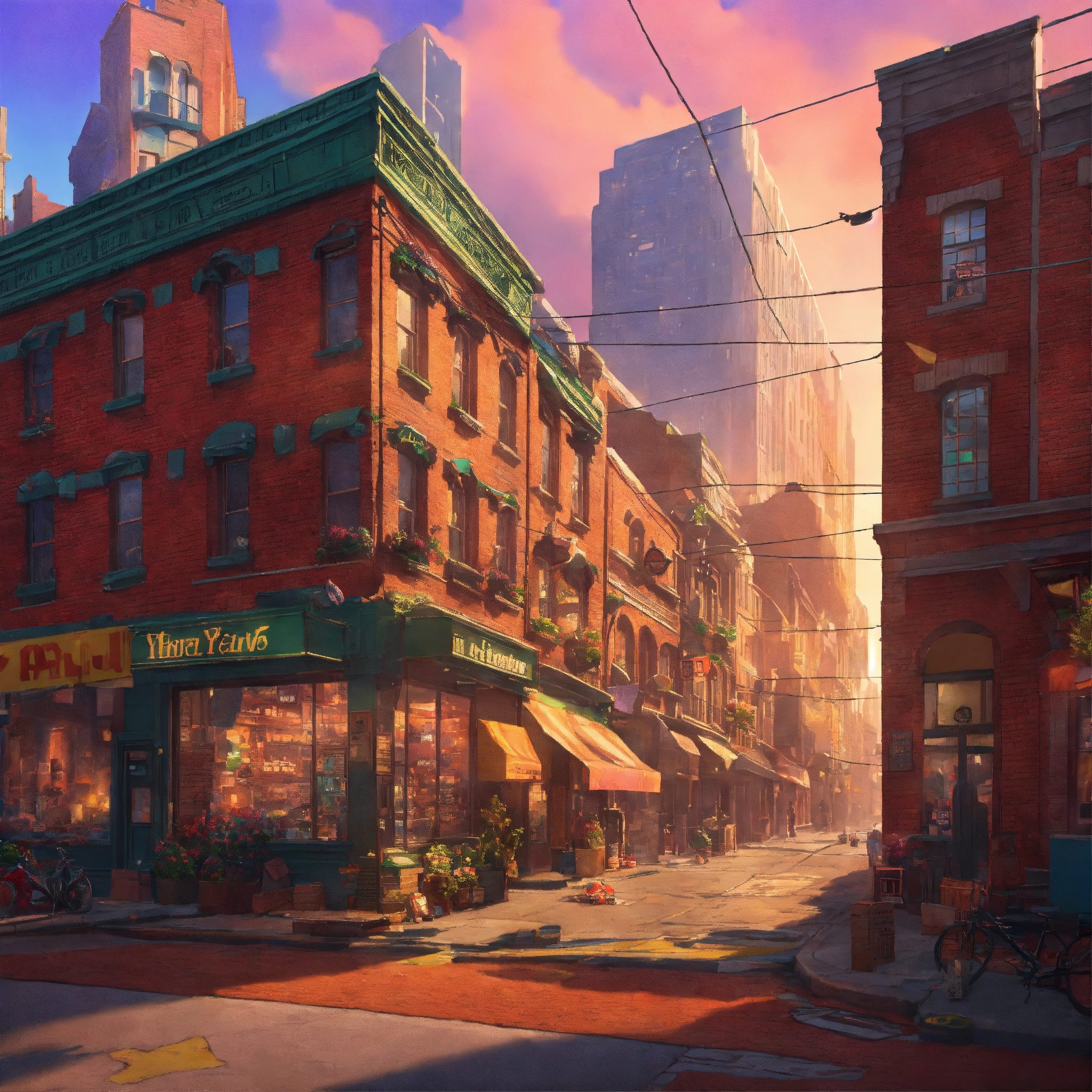 Imagine an urban landscape in colorful perspective, with a 90's atmosphere, where a main street appears littered with brick buildings, in an animated cinematic universe