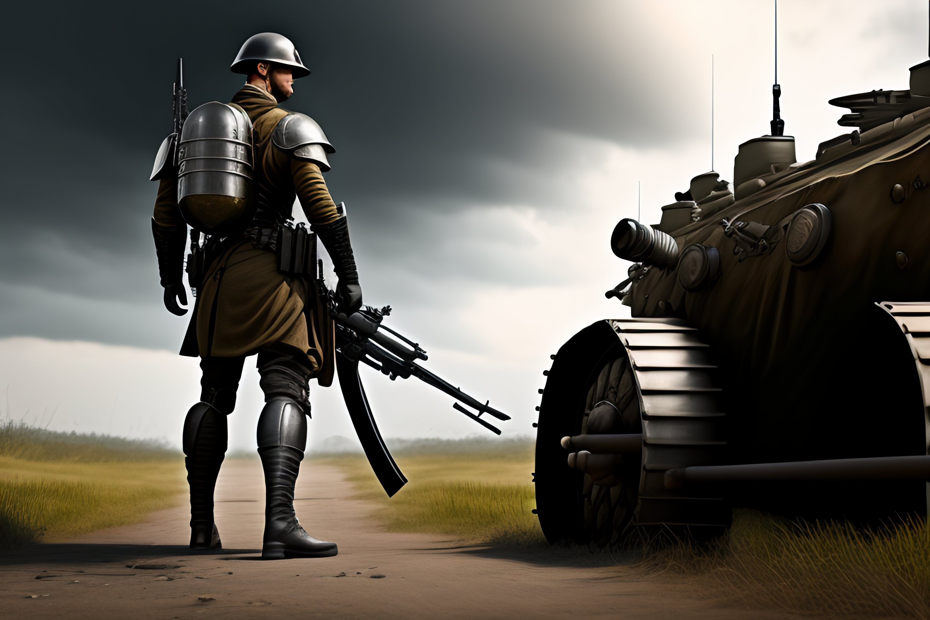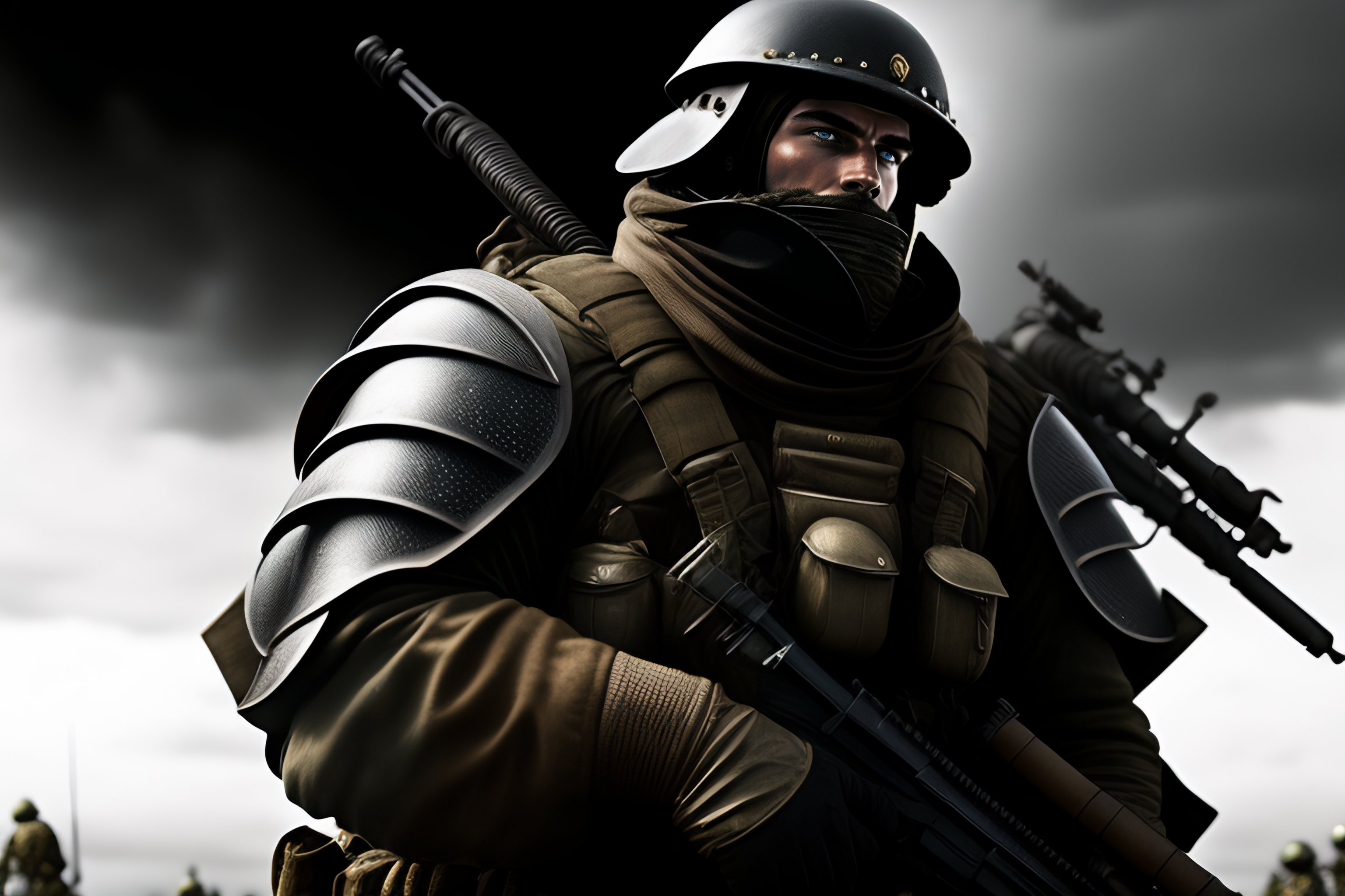 Full-body portrait of a heavily armored wwi soldier holding an anti-tank rifle, 8k, black and white, realistic proportions, dieselpunk, armor, bulky, metal plates, rusty, gritty, high detail, extremely detailed, dynamic pose, helmet, mechanized, grimdark