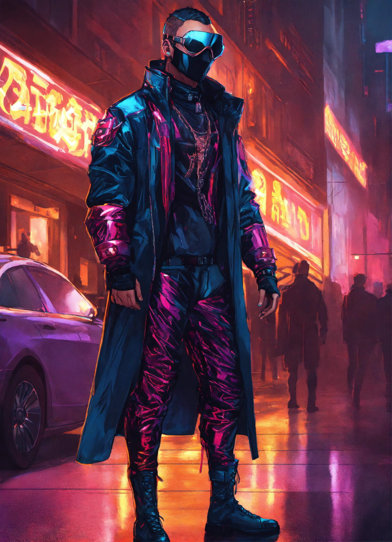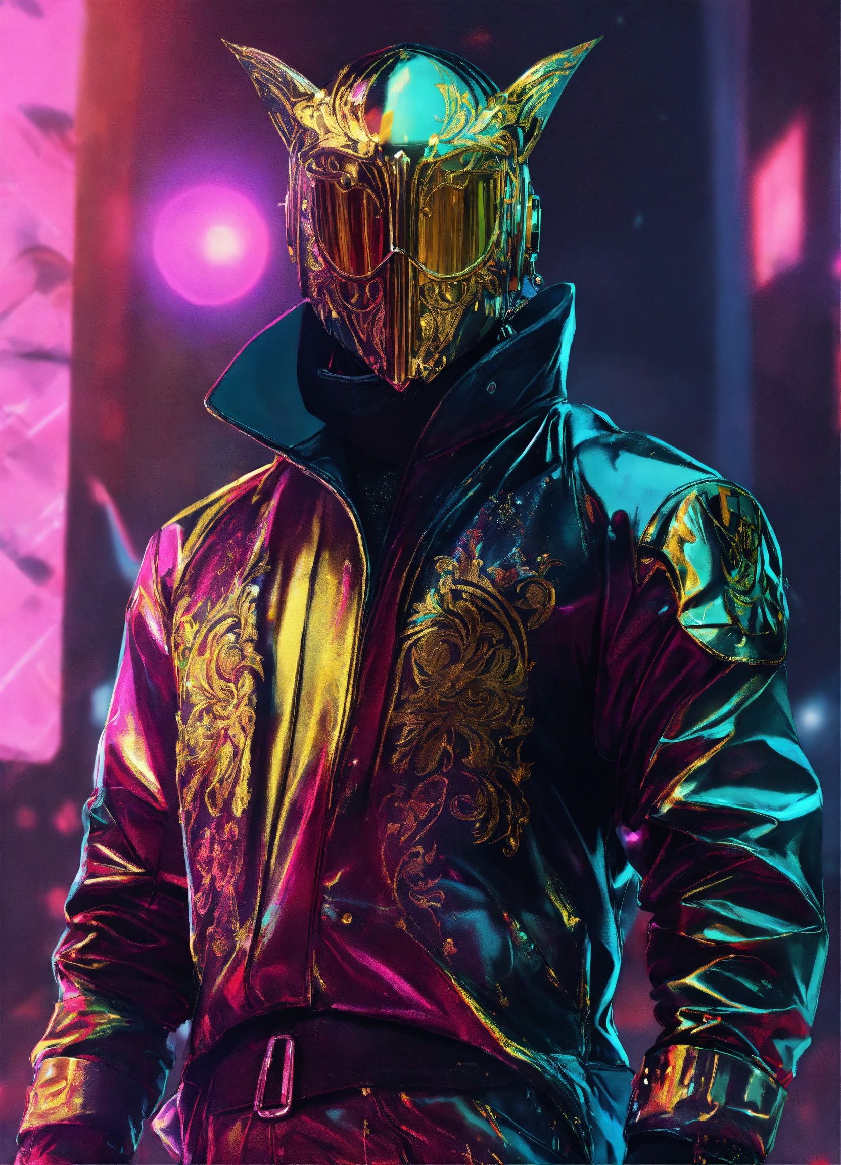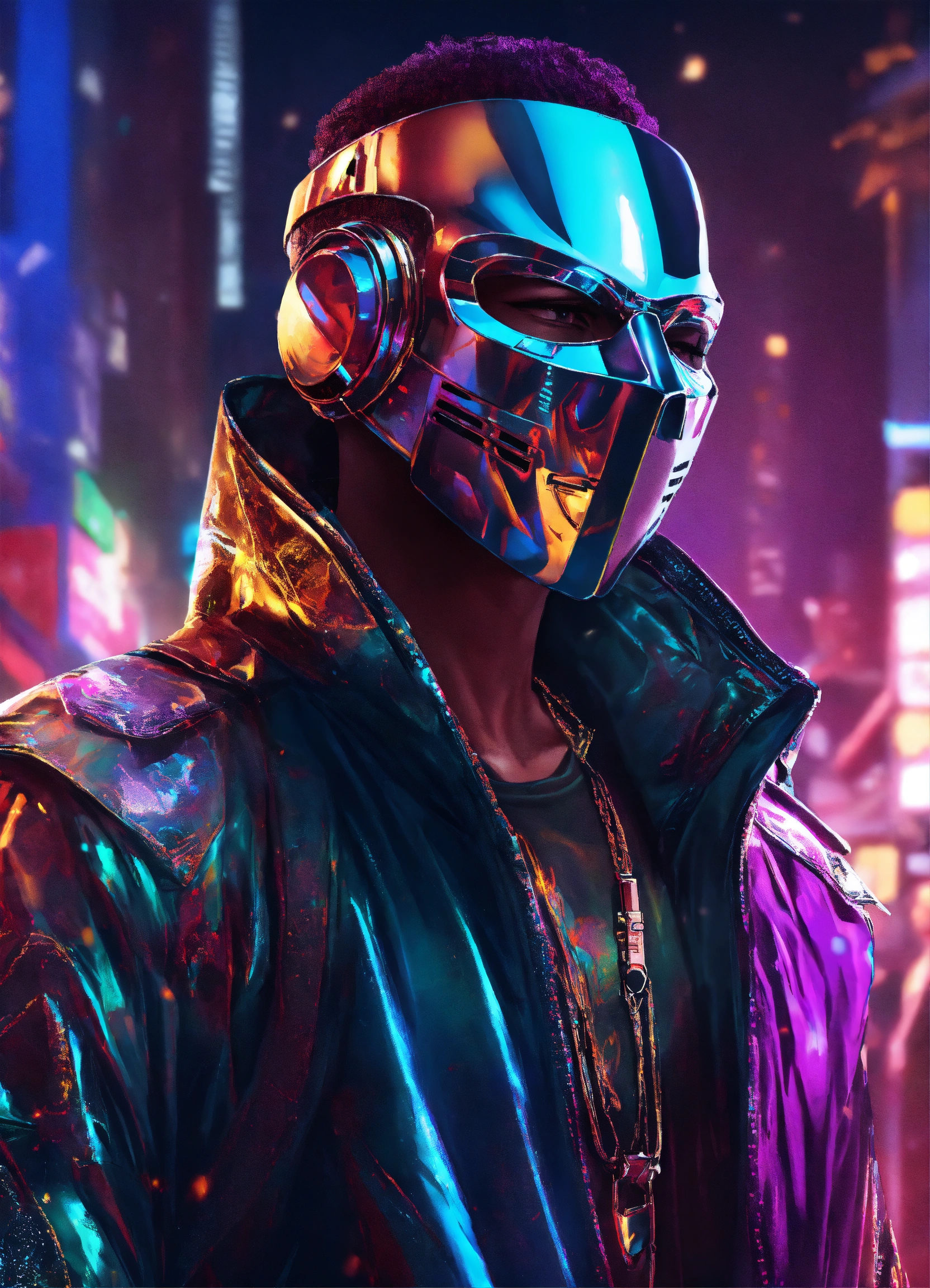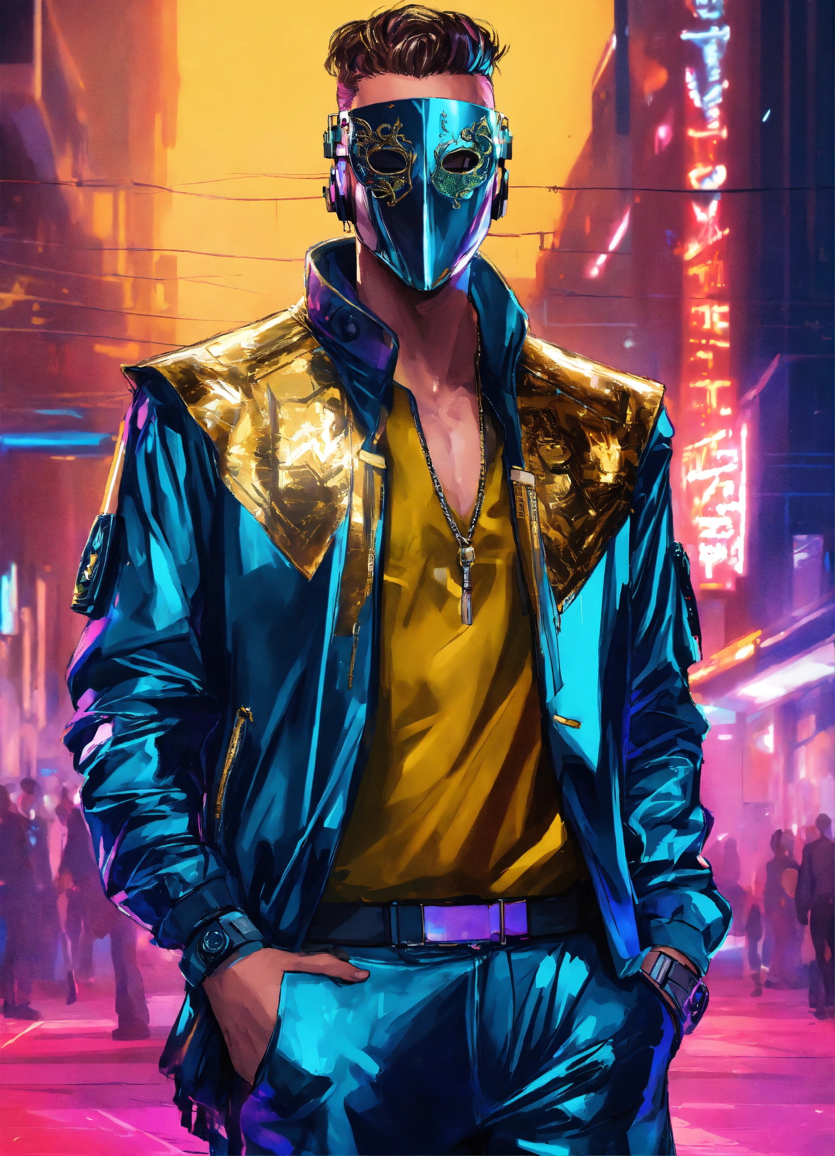 Male cyberpunk bodyguard wearing streetwear fashion and a venetian mask, and shiny metallic clothing at a masquerade ball streetwear fashion digital illustration.