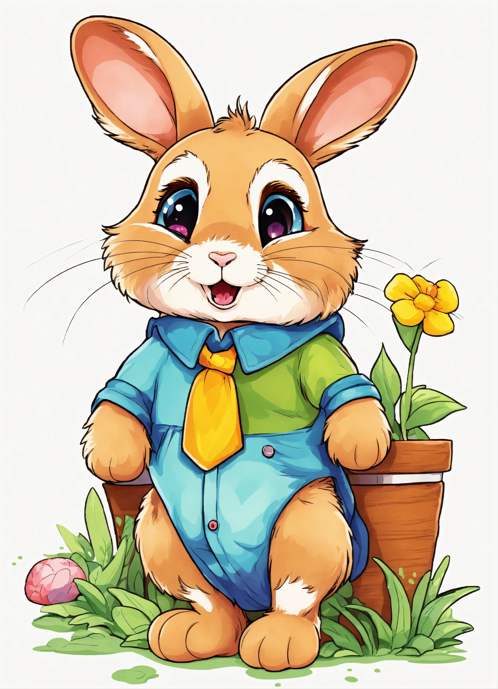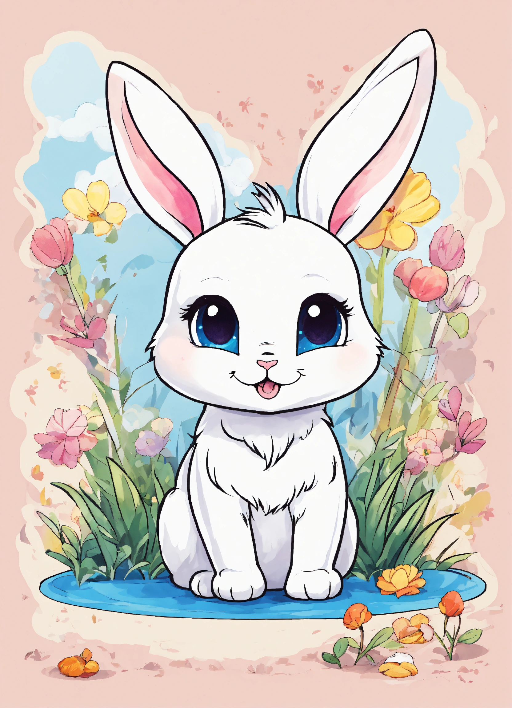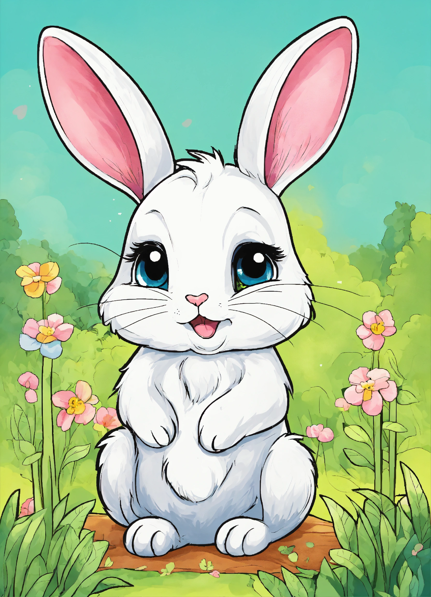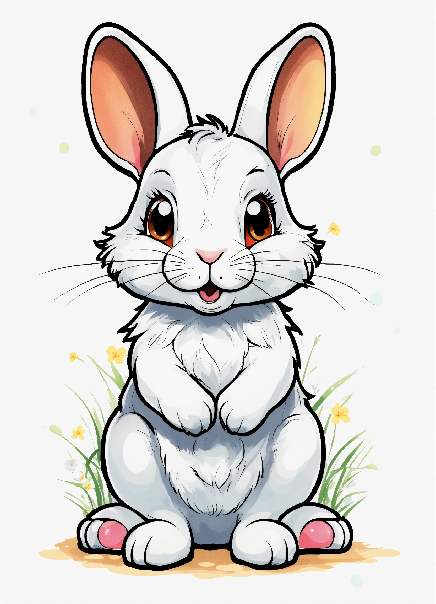 Generate a cute little rabbit, super eye-catching illustration, resolution, cartoon-sticker style with clear lines on a pure white background suitable for a children's coloring book.