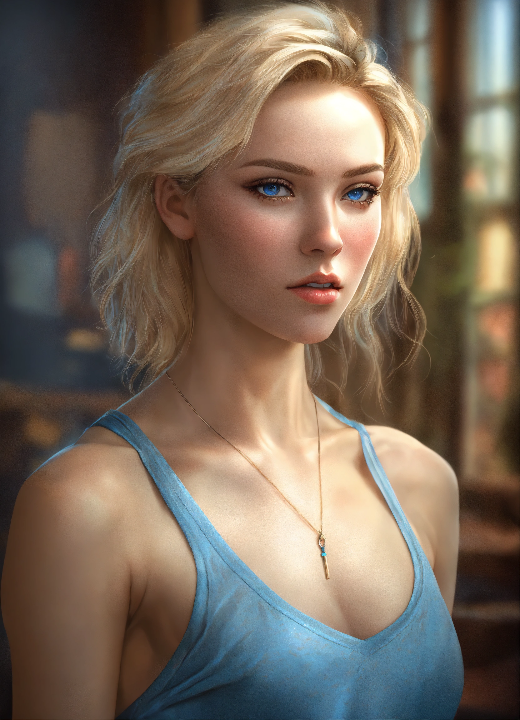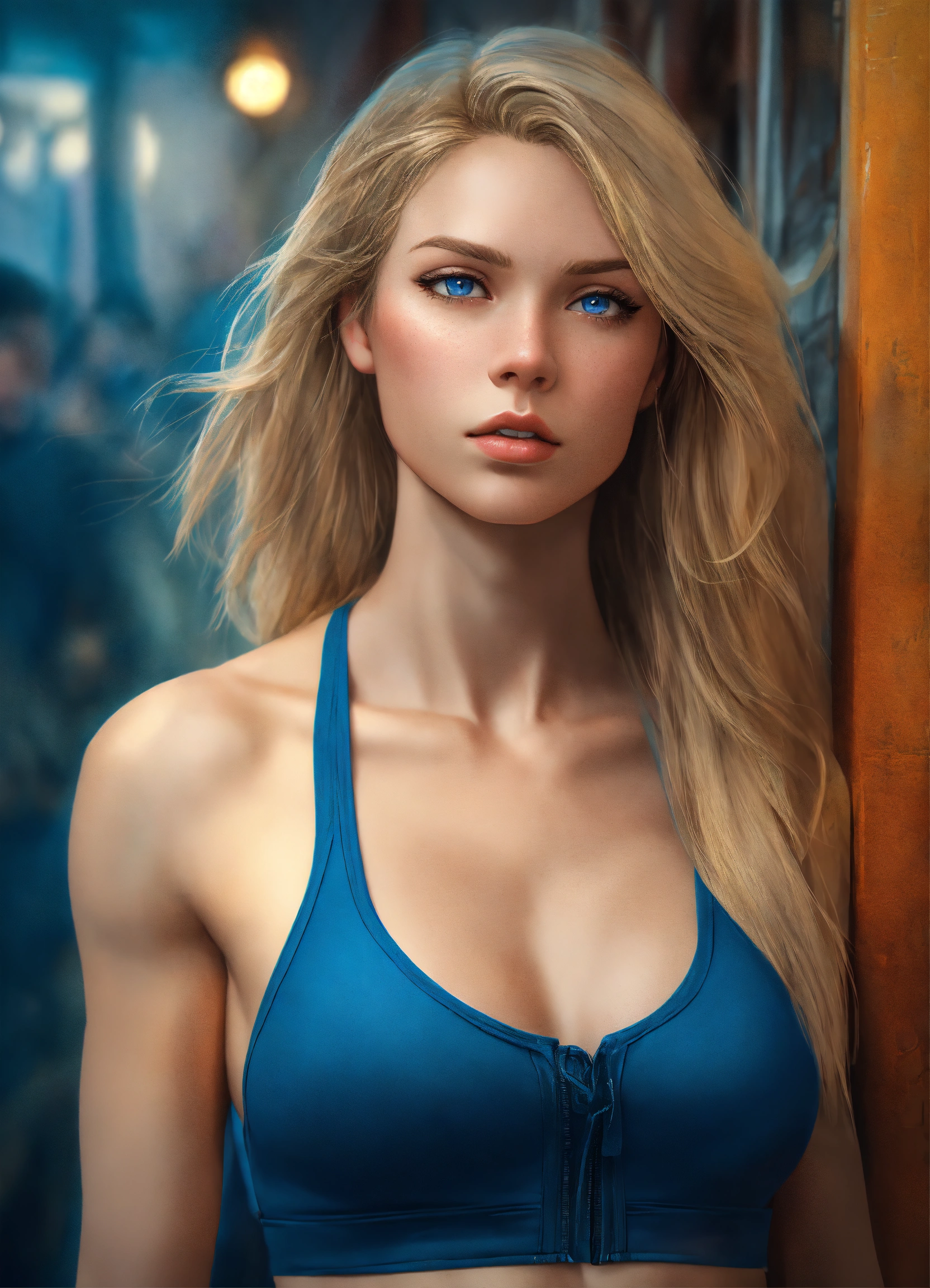 Full body potrait of thin beautiful faced tall woman with high cheekbones, pale skin, blonde hair, blue eyes, heavy chest, thin muscular midriff in pain, illustration, hyper realistic, highly detailed, digital photography, side glamor pose, 4k, hdr, smooth, sharp focus, high resolution, aspiring photographer, 8k, 3d