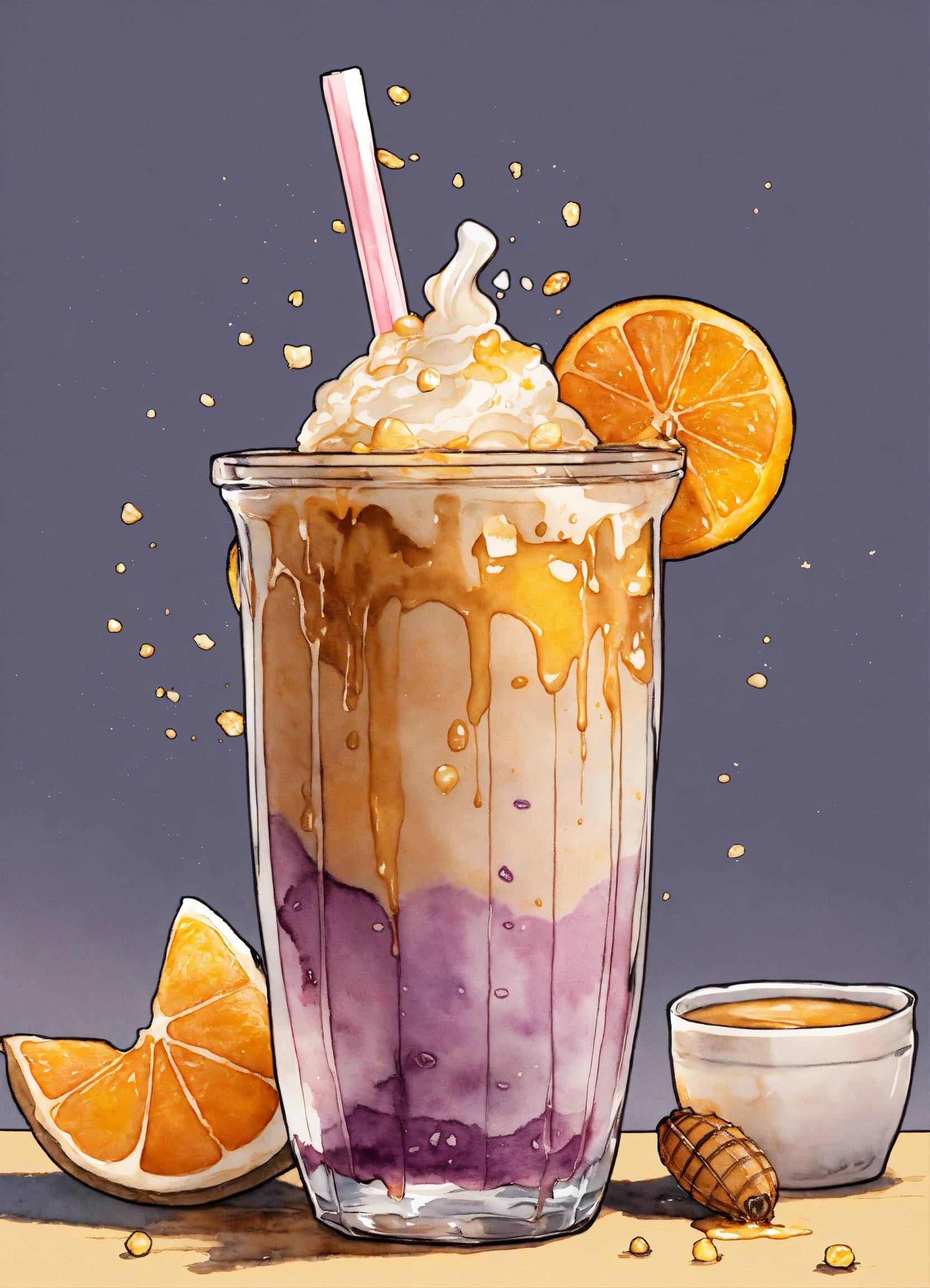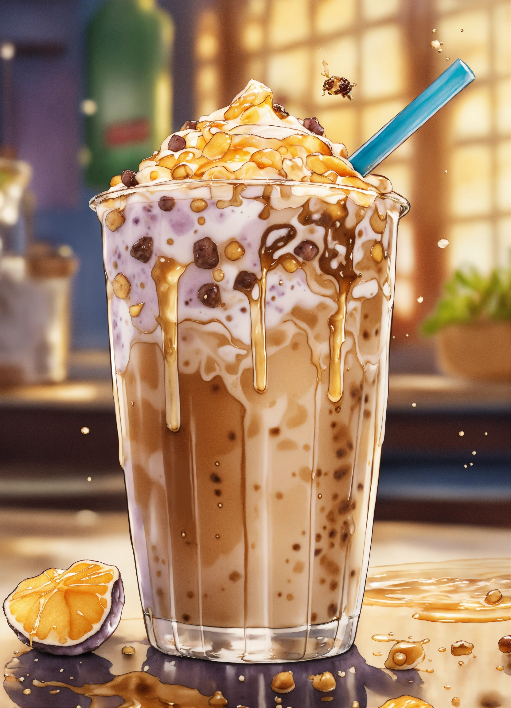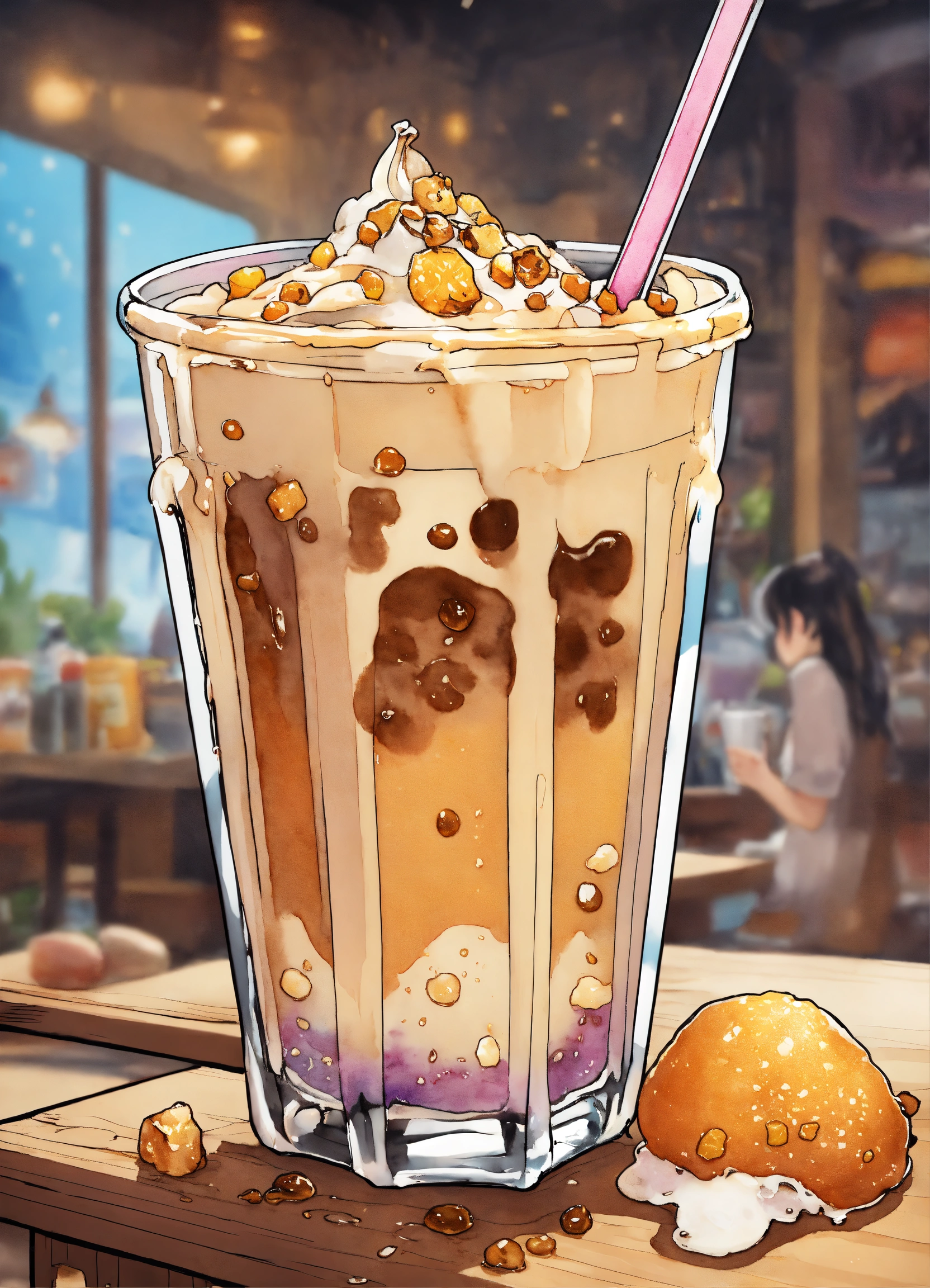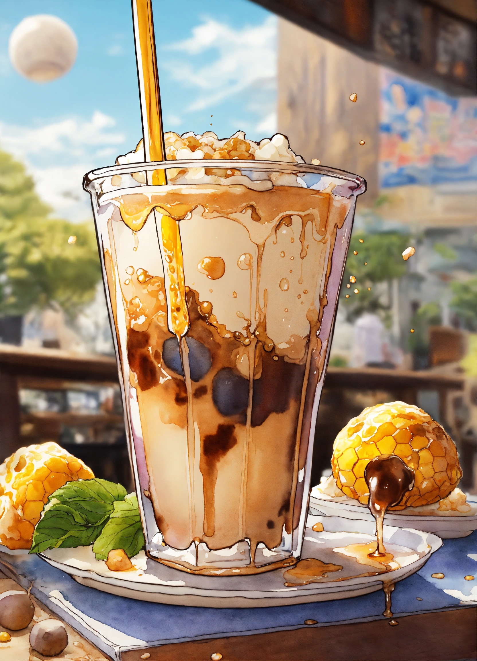 Manga cartoon dc comic style. a mouth-watering taro with honey drizzle milk tea with boba, where each layer from the boba to drizzle to the tayaki dipped topping seems to be pouring lazily into a mix of a liquid goodness of flavor. the scene captures the very moment of chaotic assembly, with milk, tea and honey draining into the glass and ingredients swirling together . medium realistic watercolor salt wicking style manga dc comic drawing inspiration from moments of blending showcasing the dynamic nature of the taro with honey milk tea. lighting variegated vignette yet focused, casting slight shadows to give depth to each ingredient. colors bold with muted saturation making the drink look irresistibly delicious. resolution 3d hd focusing on the central explosion of flavors