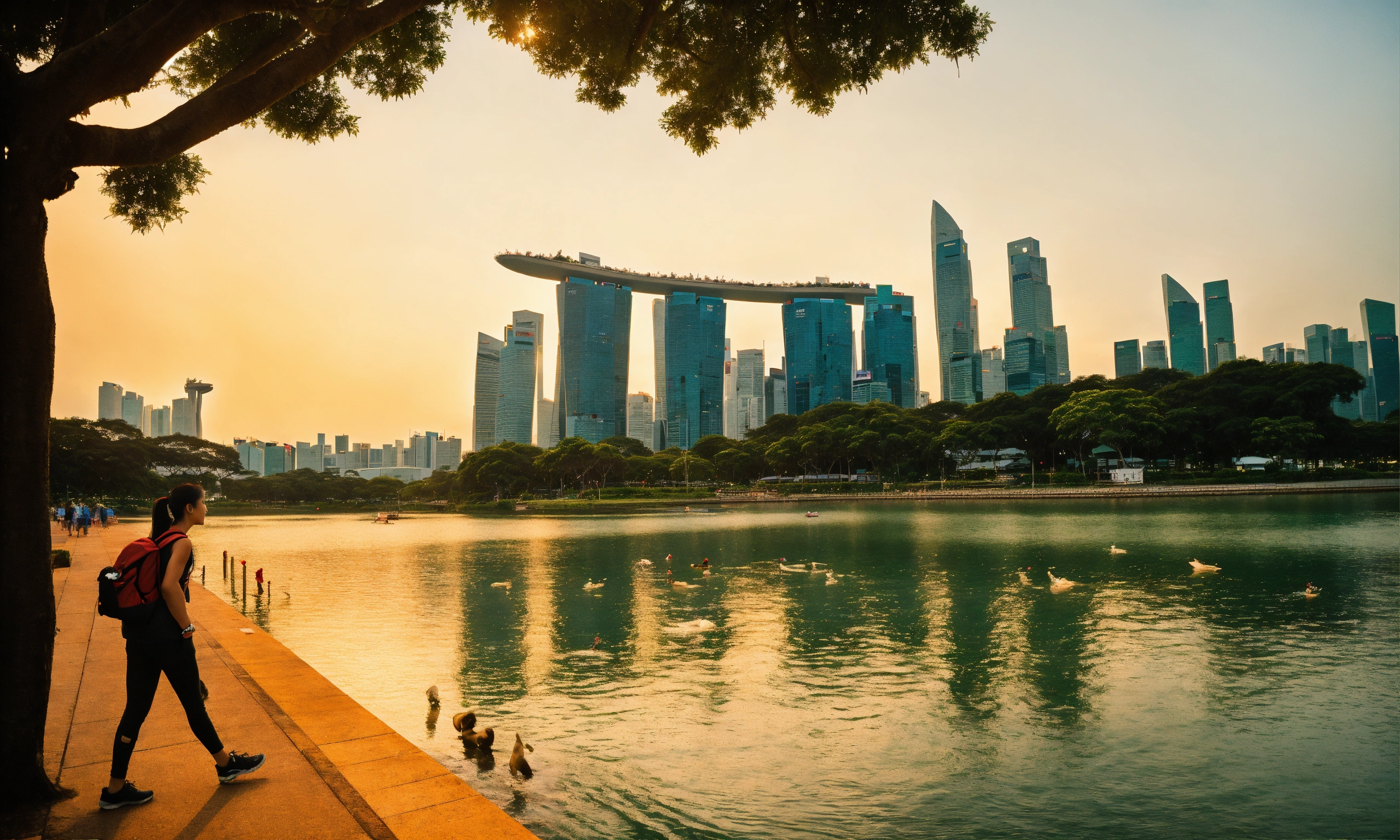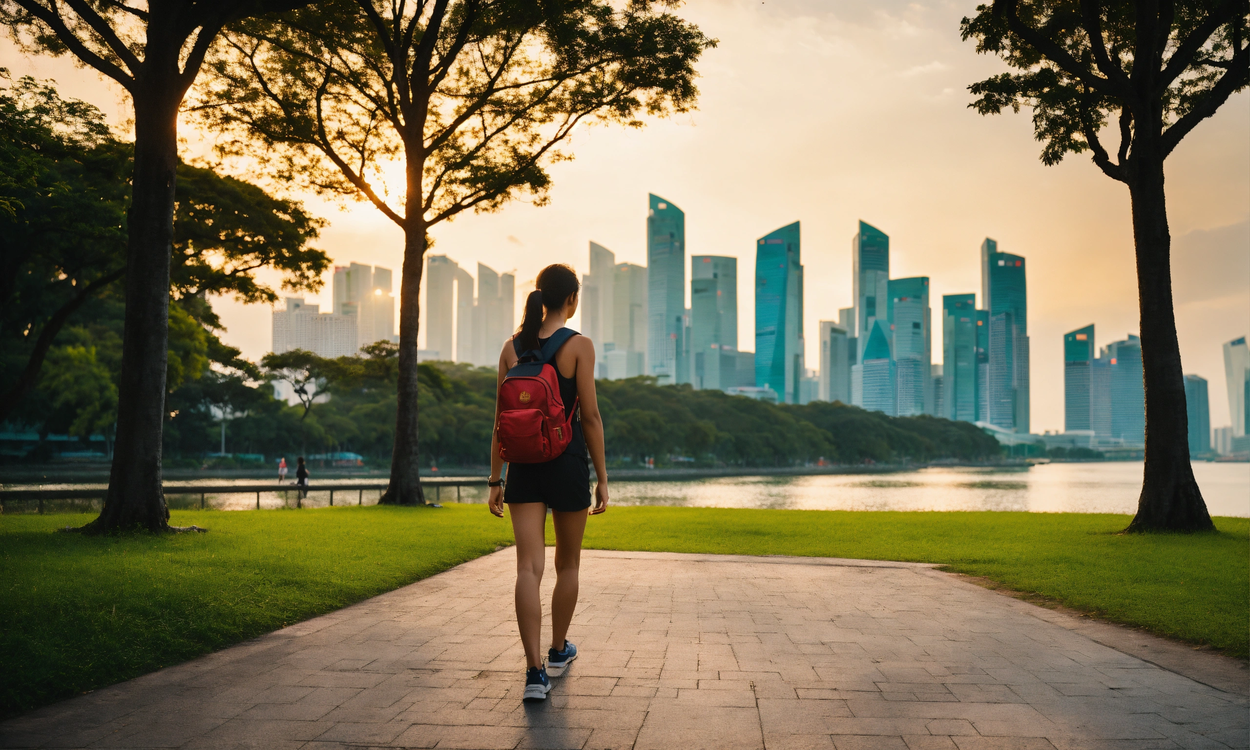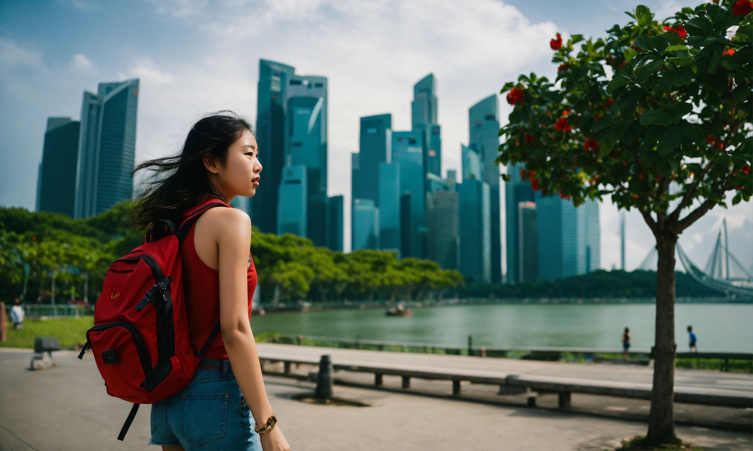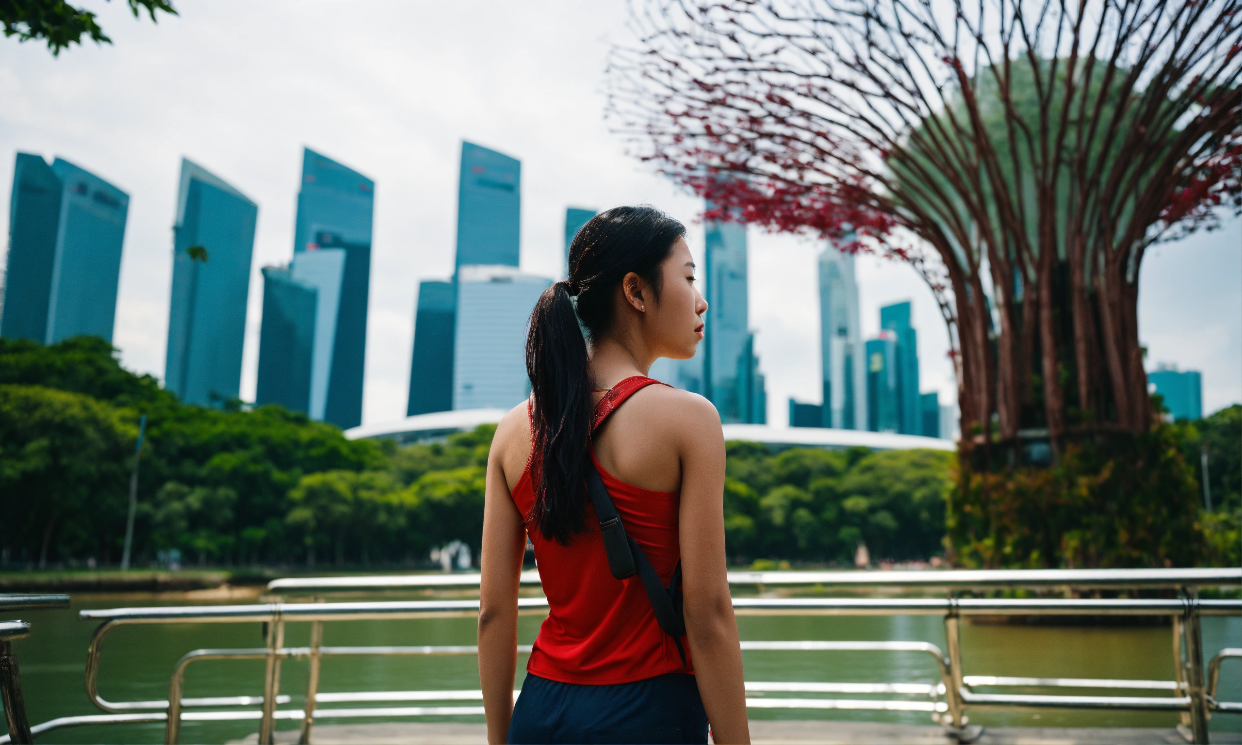 Medium shot of an athletic 18-year-old asian girl walking in singapore's east coast park, head tilts back, a sleeveless plain red singlet, determined and slightly annoyed expression, looking into the water, black backpack, towering trees, backdrop is the iconic singapore cityscape rises with modern skyscrapers and marina barrage, and vibrant attire symbolize the energy of this unique urban park, a leica summicron 35mm f2.0 lens to enhance the colors, shooting with kodak portra 400 film to add cinematic richness.
