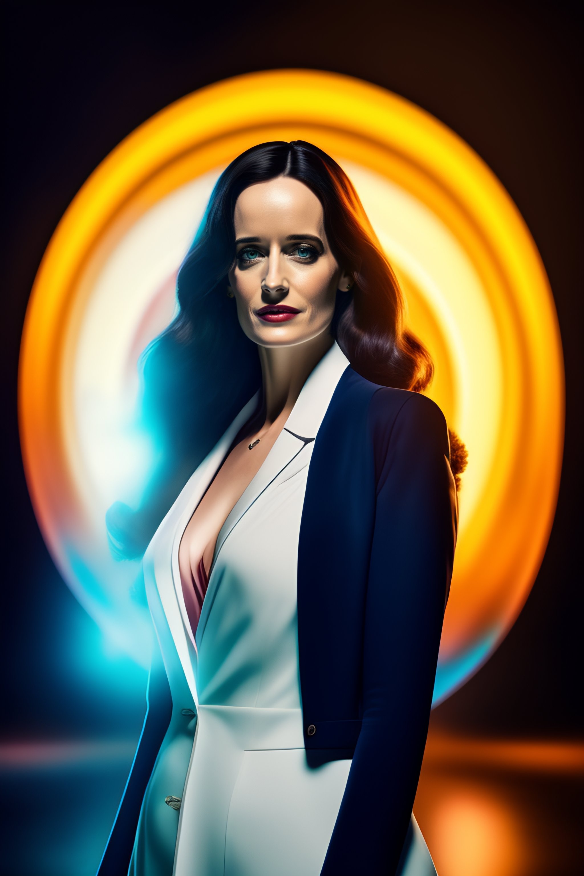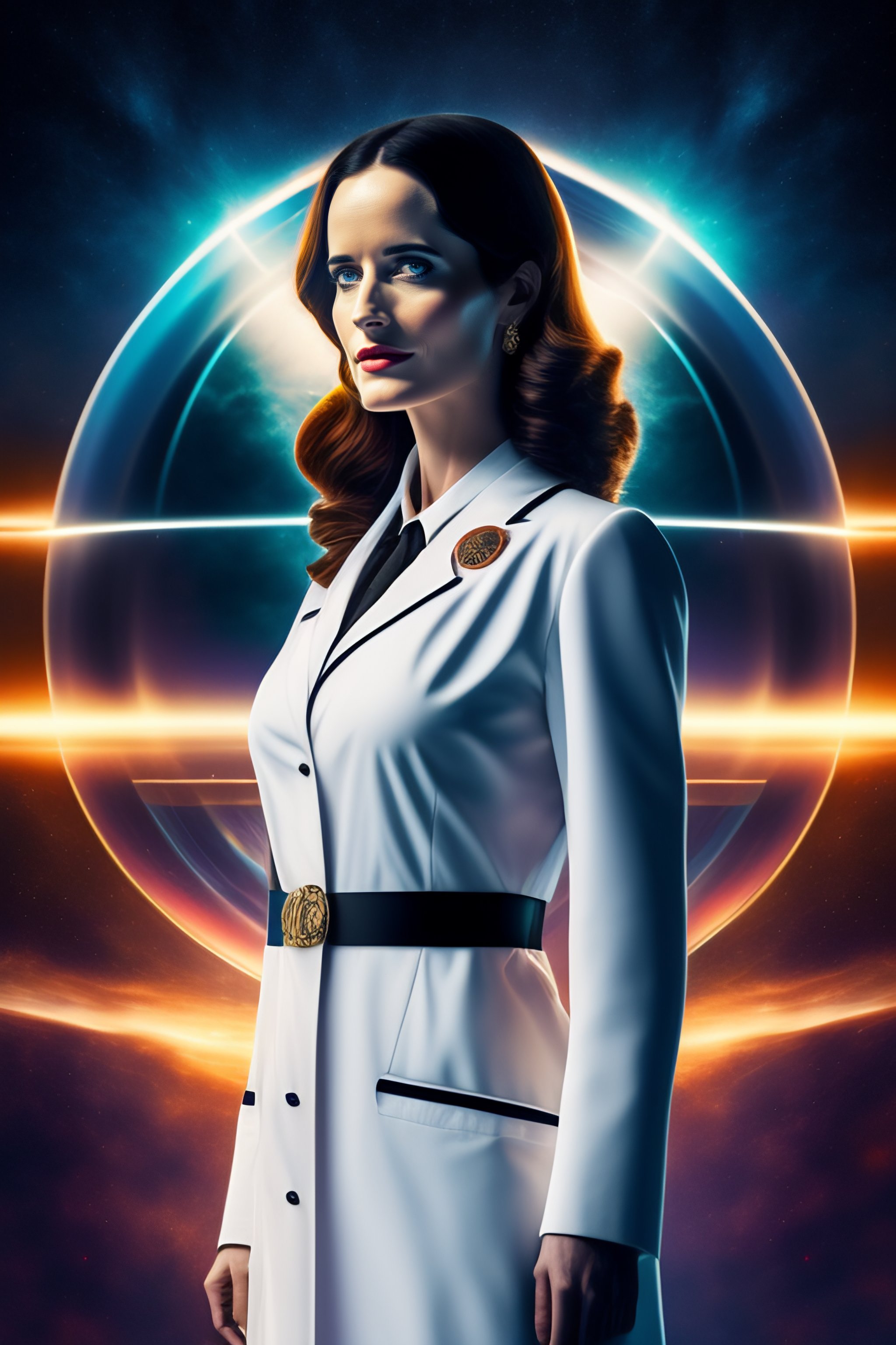 A full body photograph of eva green as'doctor who ', time vortex in the background, detailed face, symmetrical face, extreme realism and detail, 8 k, completely framed, direct lighting, 3 5 mm photo, photorealistic, sharp focus