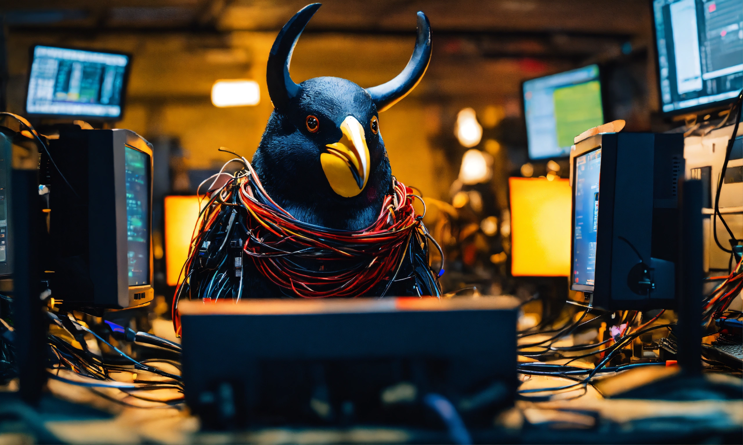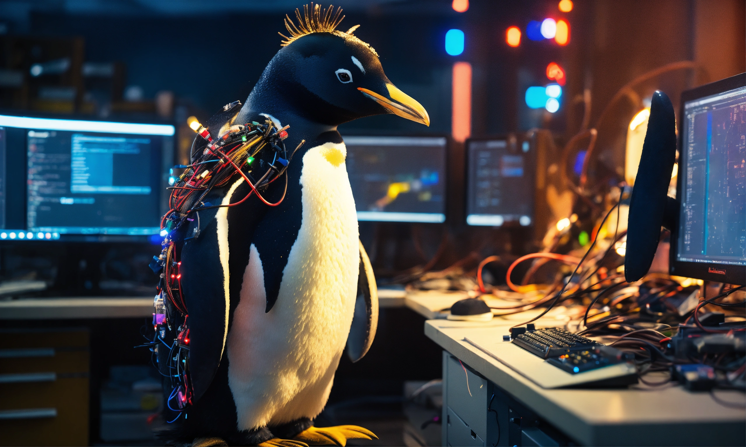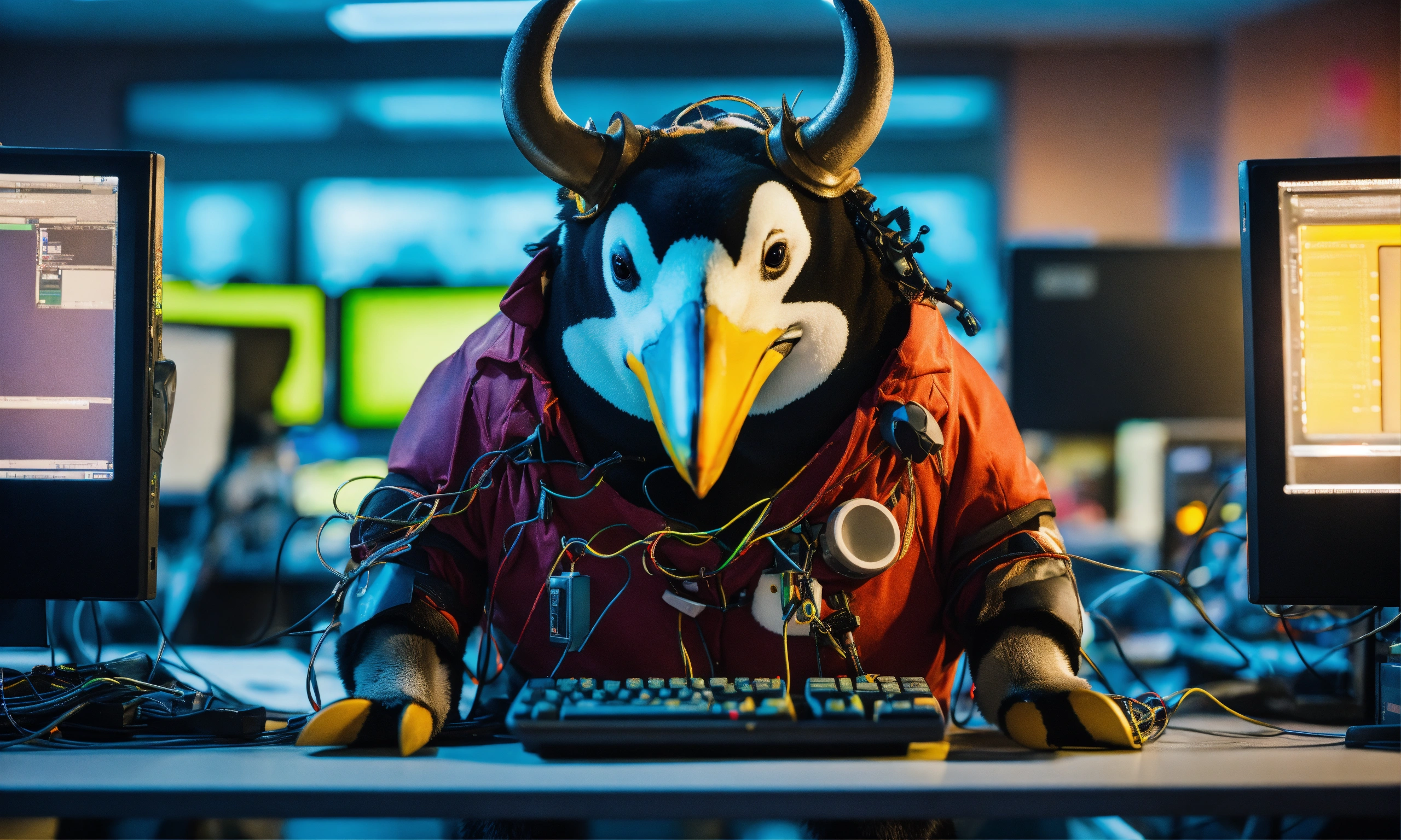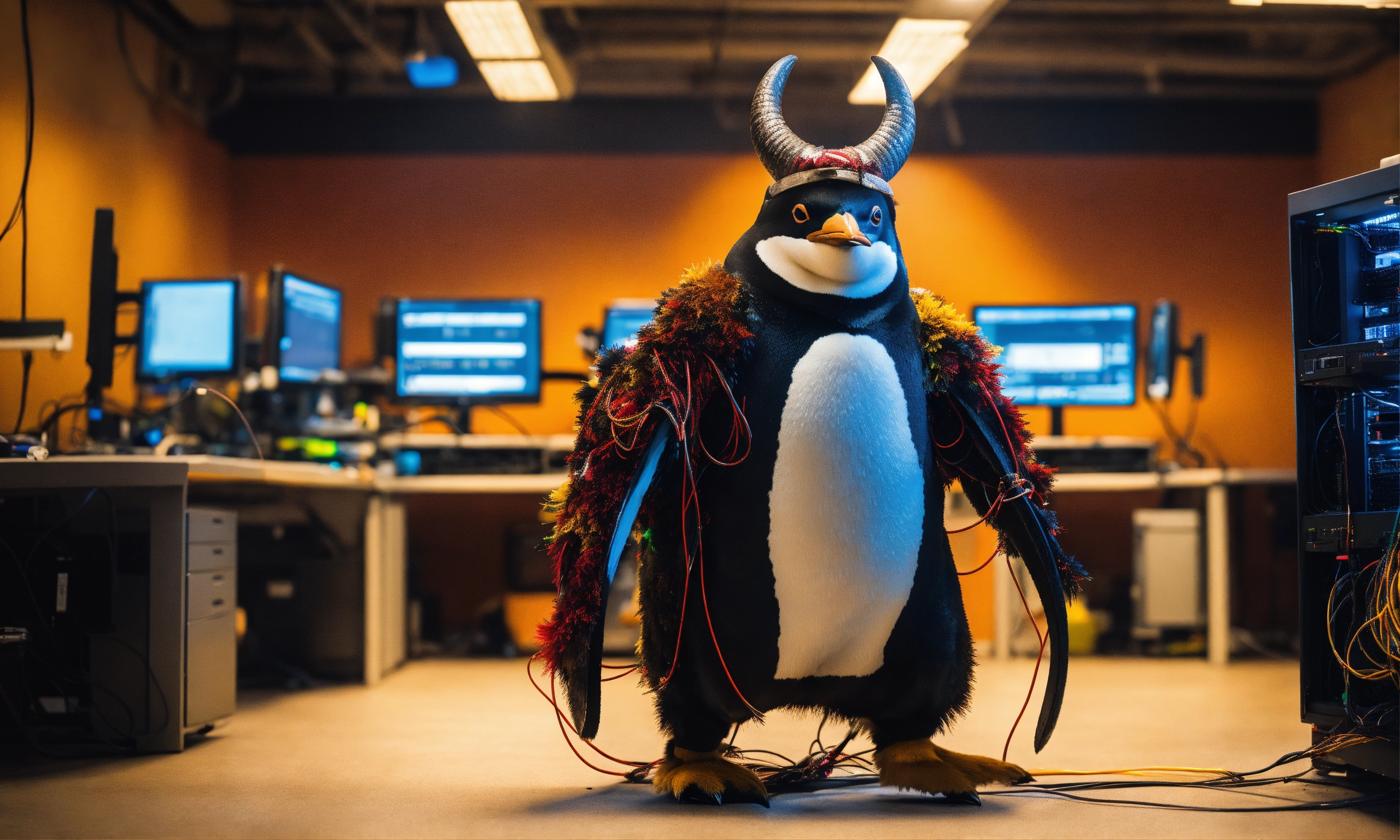 A penguin dressed up as a minotaur. standing in a computer lab with messy wires and lots of monitors, beautiful lighting, bright colors, rule of thirds