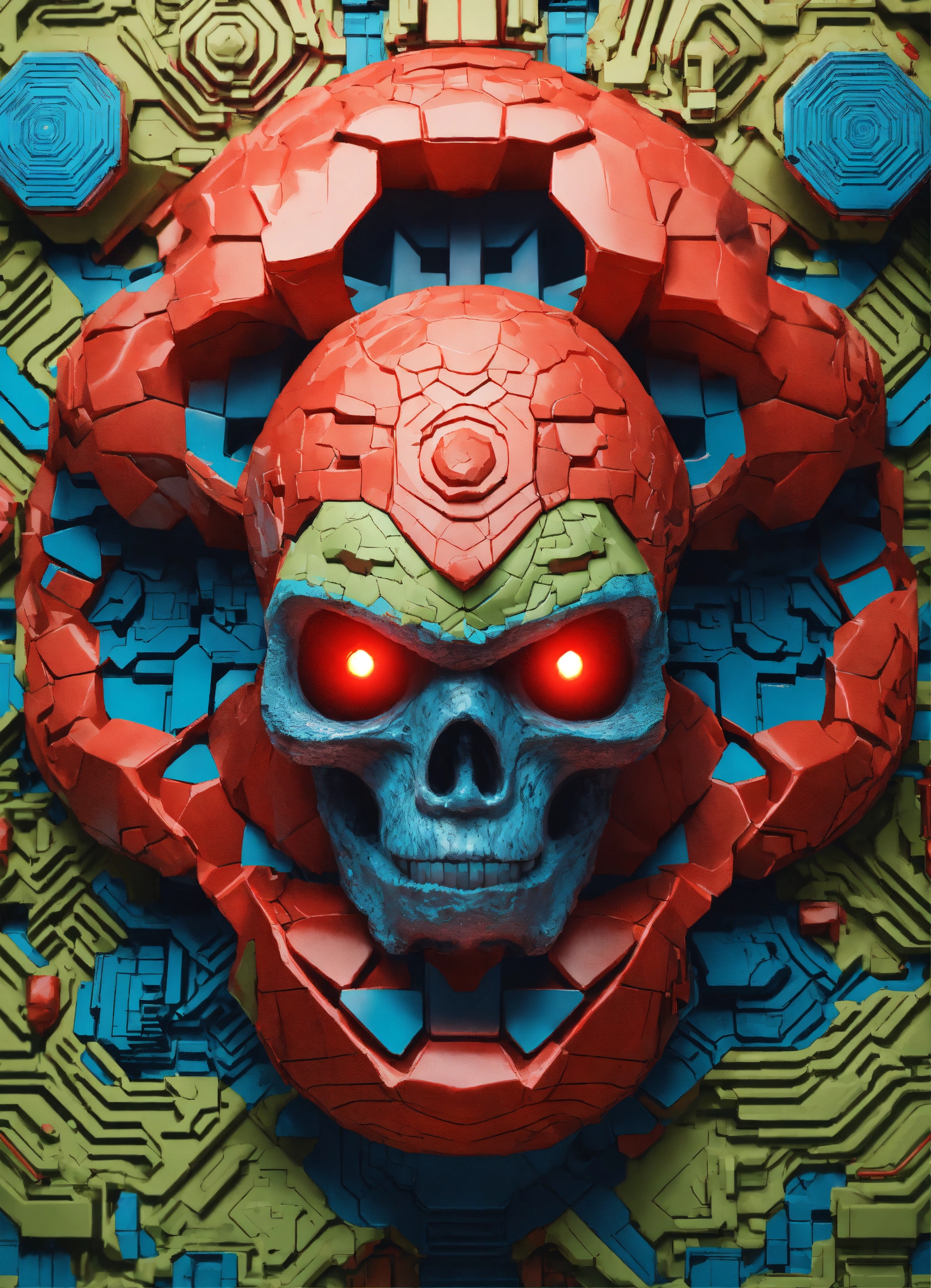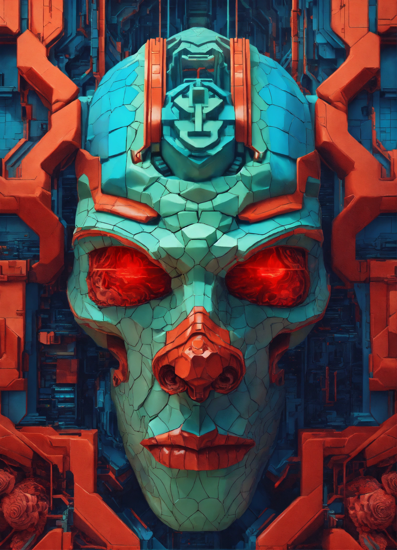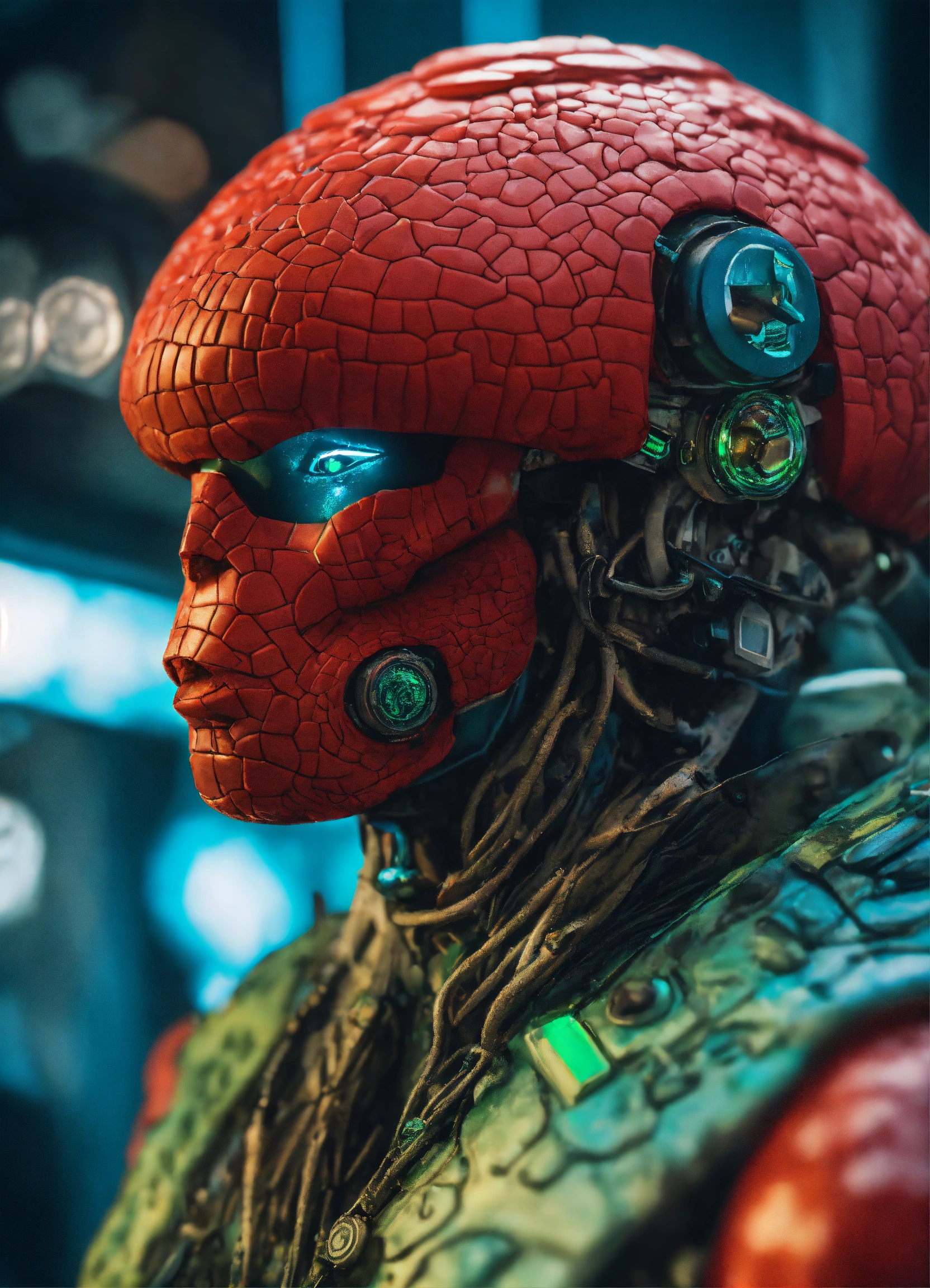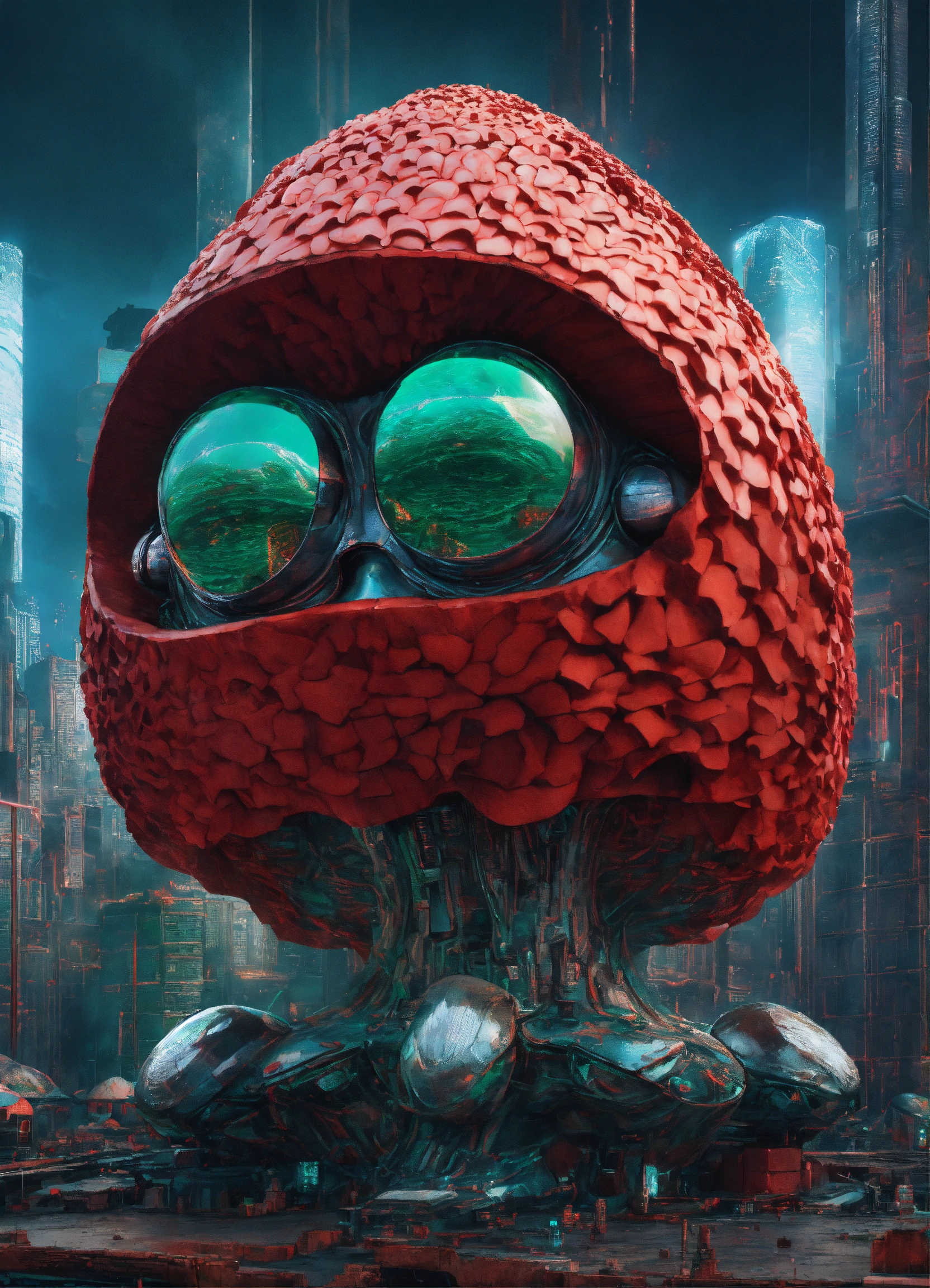 Angry face on oyster mushroom in a cyberpunk dystopic megacity with futuristic robots looking in high detail. geometrically aesthetic, photorealistic, ambient occlusion, fibonacci sequence, red-green-blue pattern tessellation, extreme detail, tilt shift.