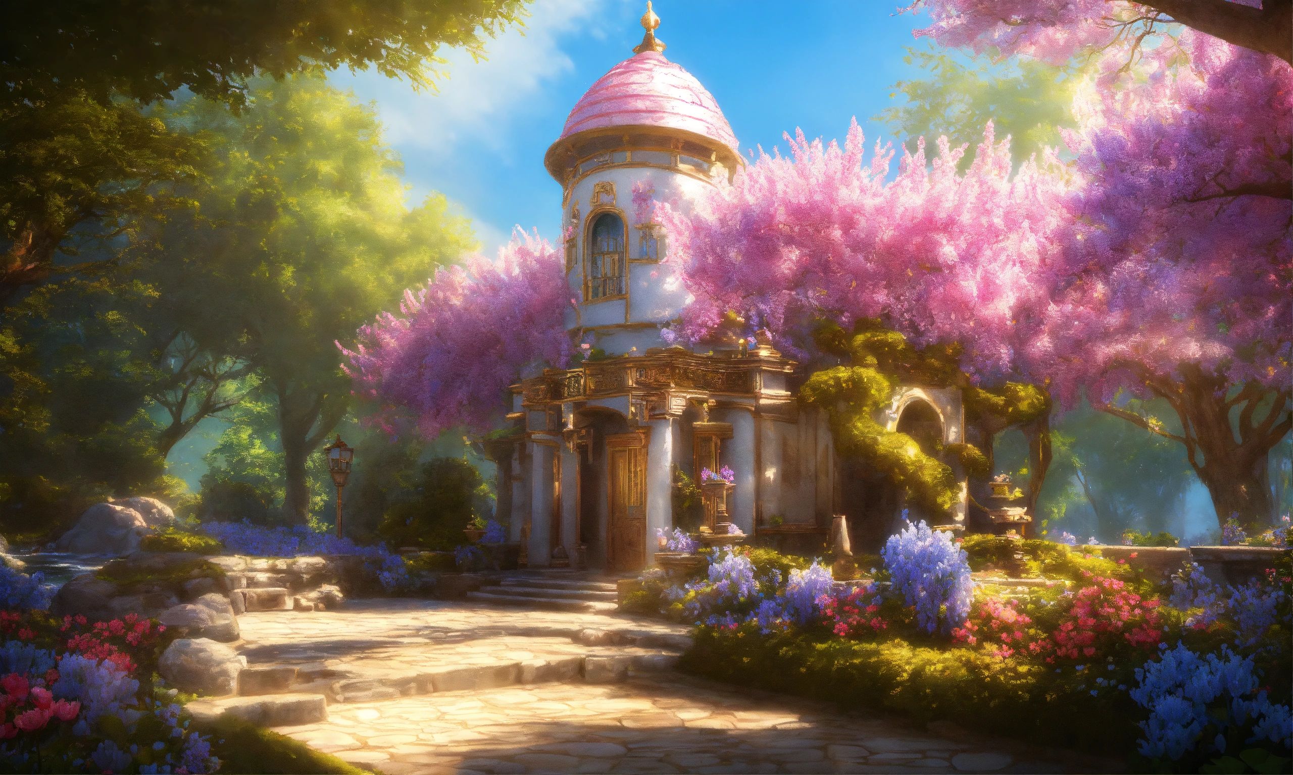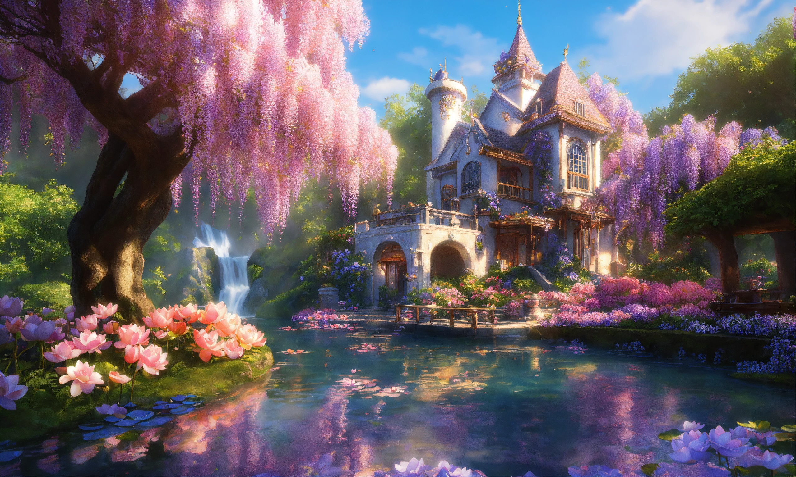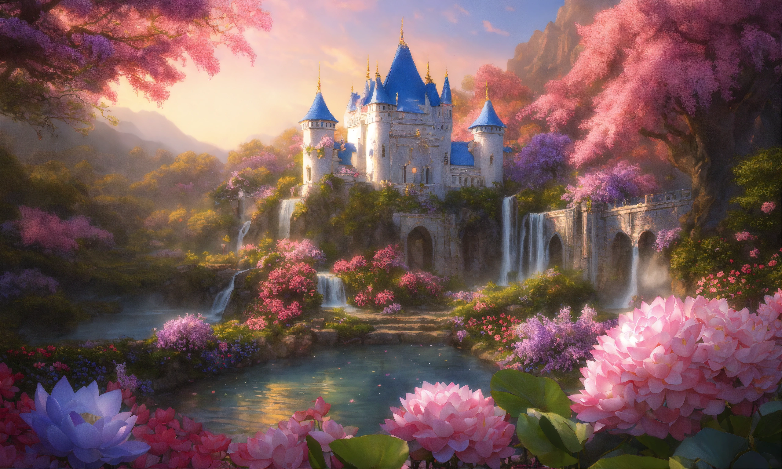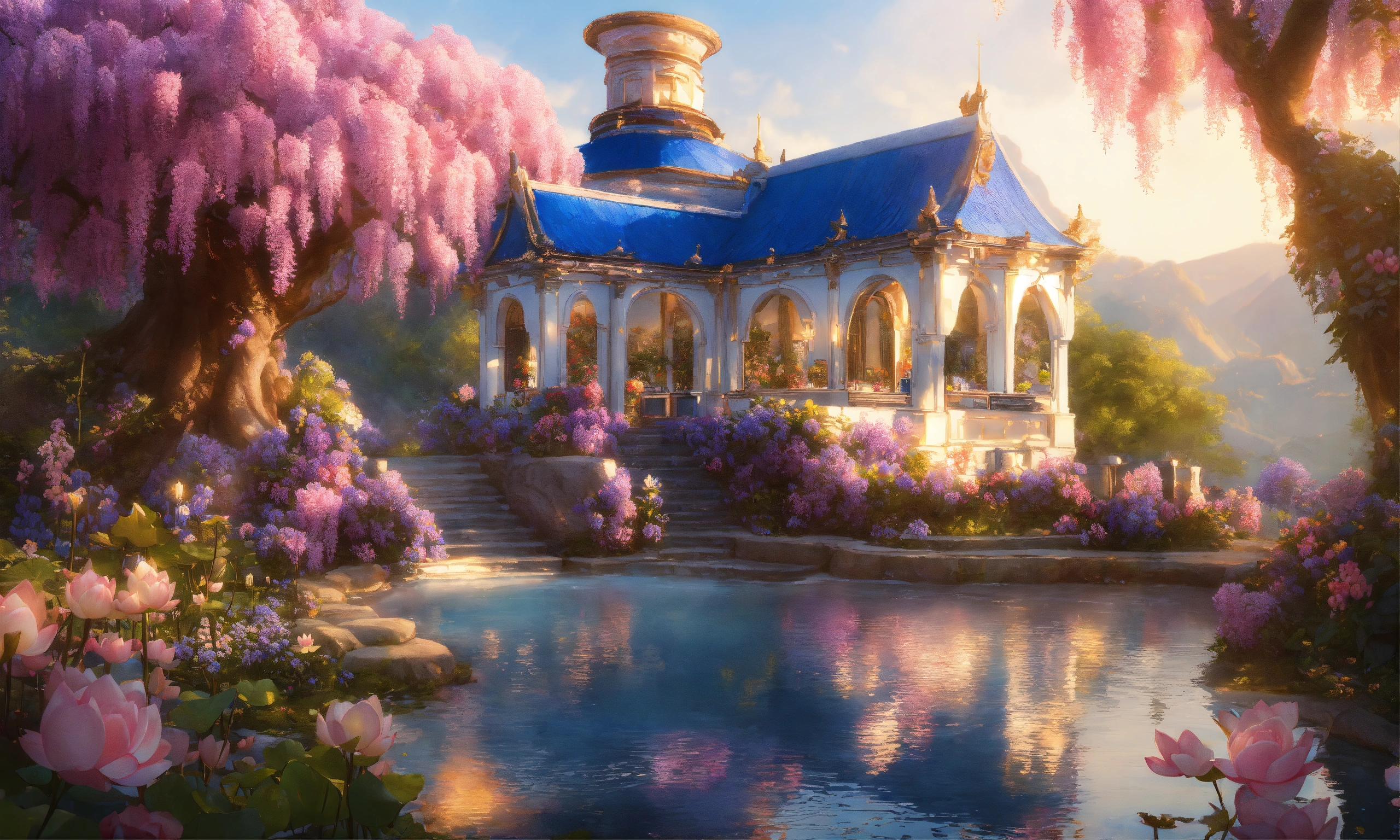 White castle fantasy flowers, eastern ogives gold flowered rose and gold, blue, parma, waterfal, very fine chiseled with basins covered with beautiful pink lotus and paths colored with bright reflections, create a heavenly world with pastel landscapes covered with flowers and trees covered with realistic pink wisteria, photorealists colorful vintage pastel, sunlight by candlelight natural light, oriental, ogive, flowery, wisteria, complex sharp image fine octane details unreal engine ultra realistic 16k cinema