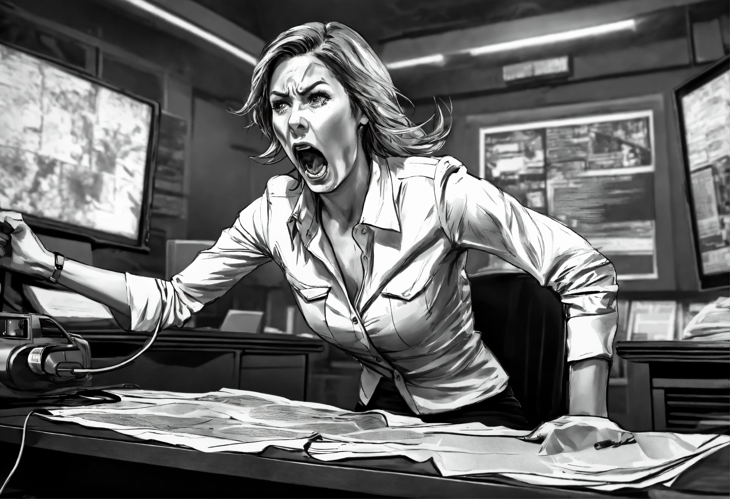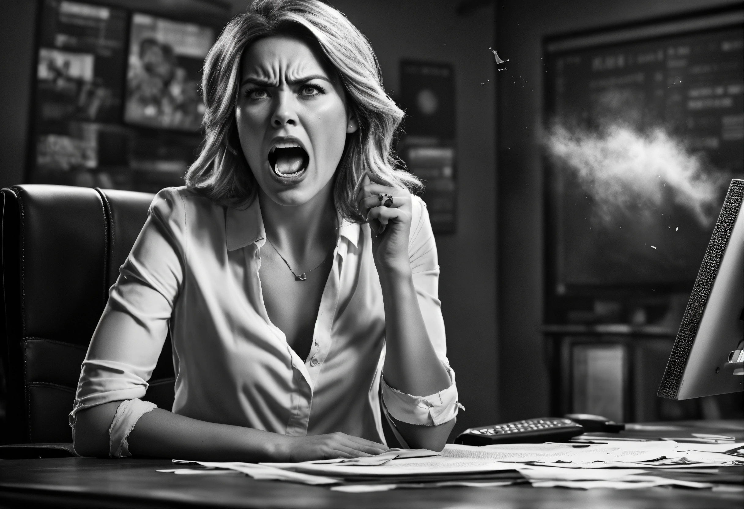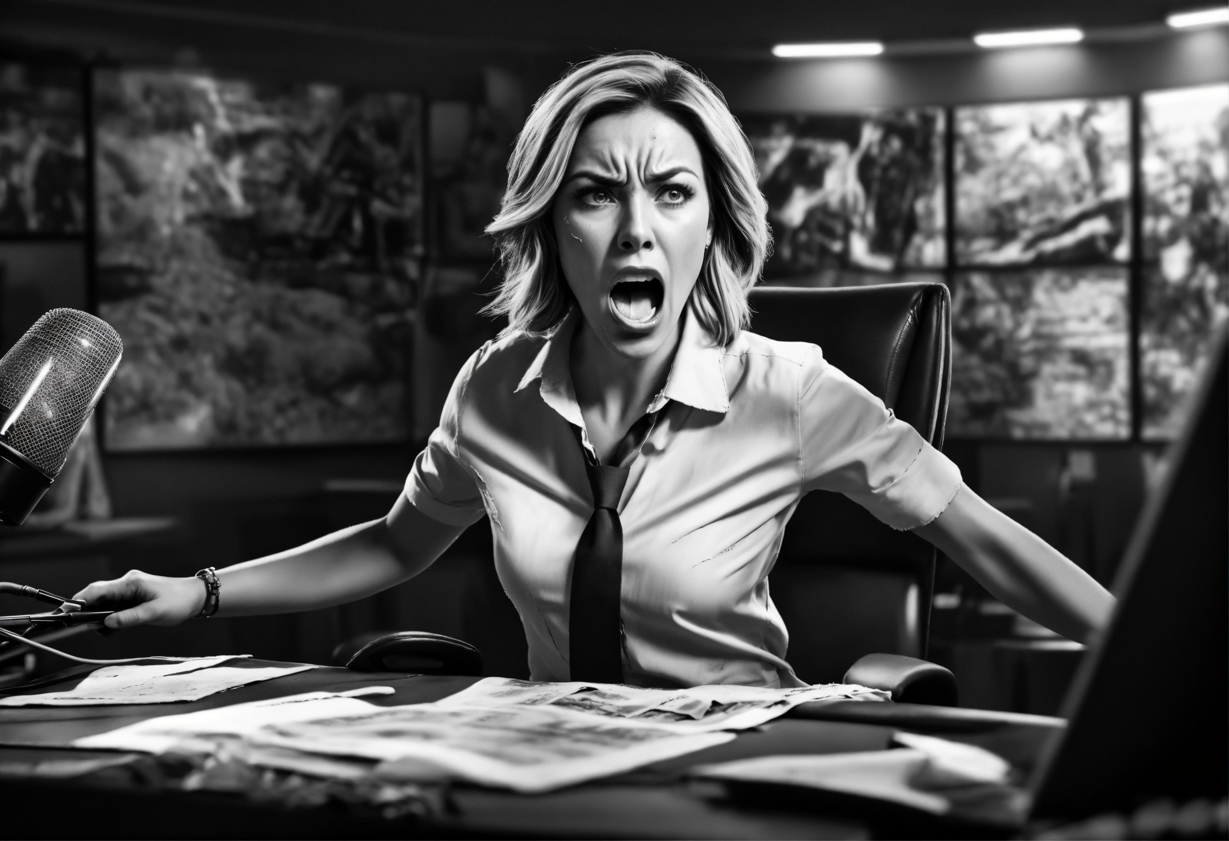 Black and white illustration of enraged female news reporter, facing camera, emotional, screaming, sitting on news anchor desk, shocking, shocked, surprised, angry, mouth dropped, emotional, action shot, tattered torn shirt, porcelain cracked skin (vibrant, photo realistic, realistic, dramatic, dark, sharp focus, 8k).