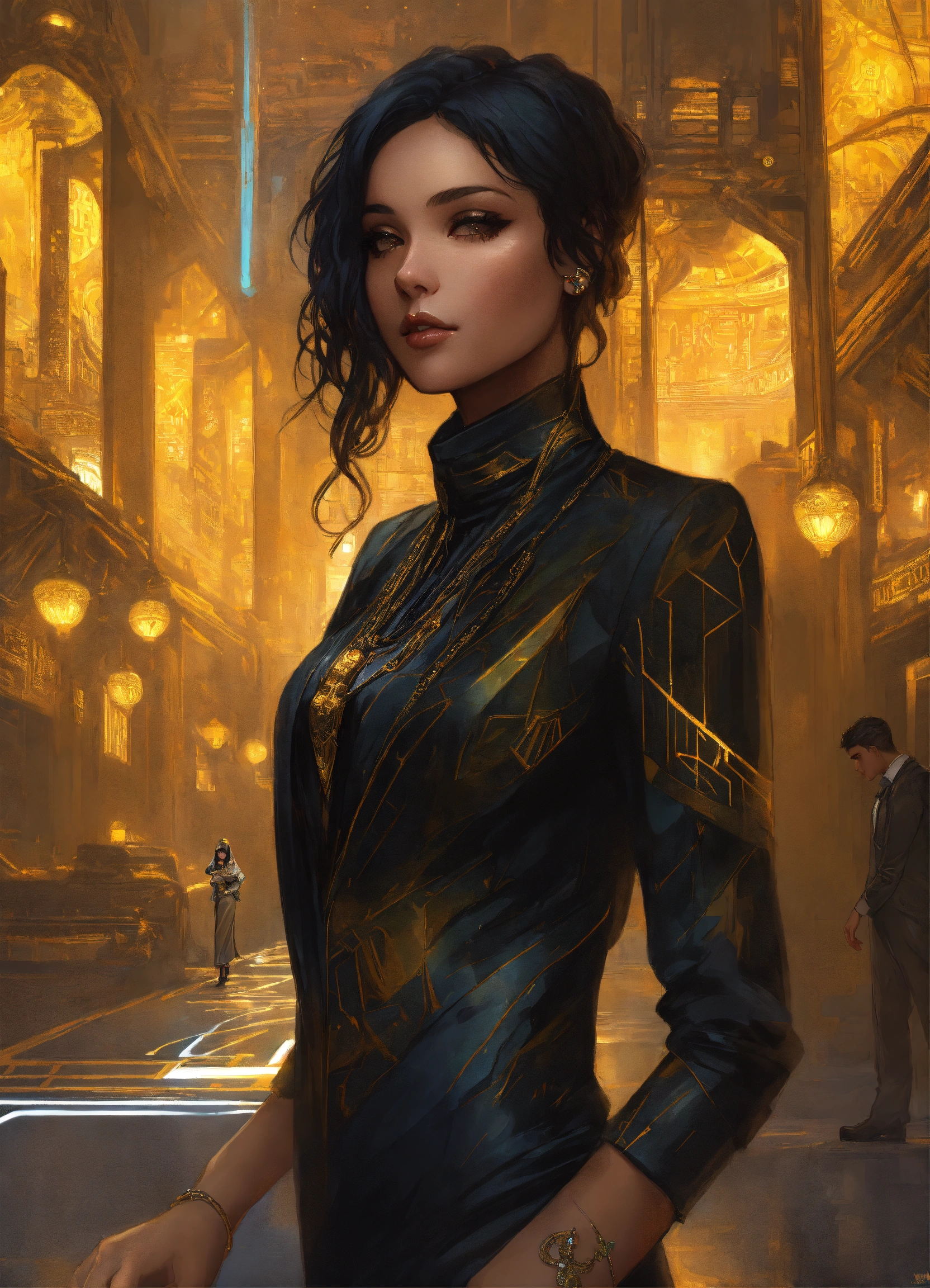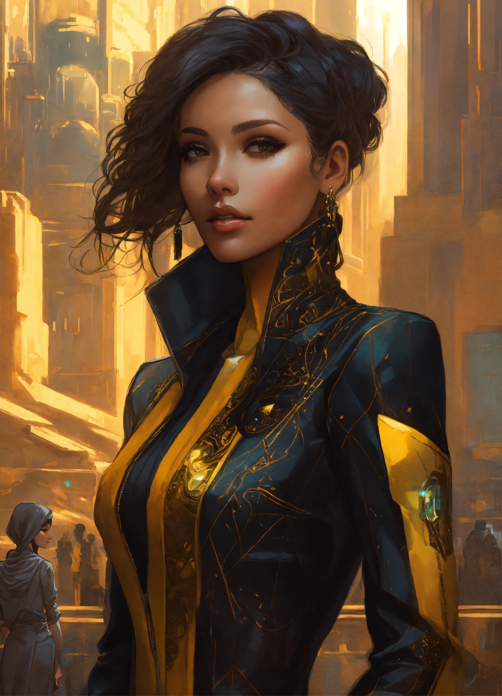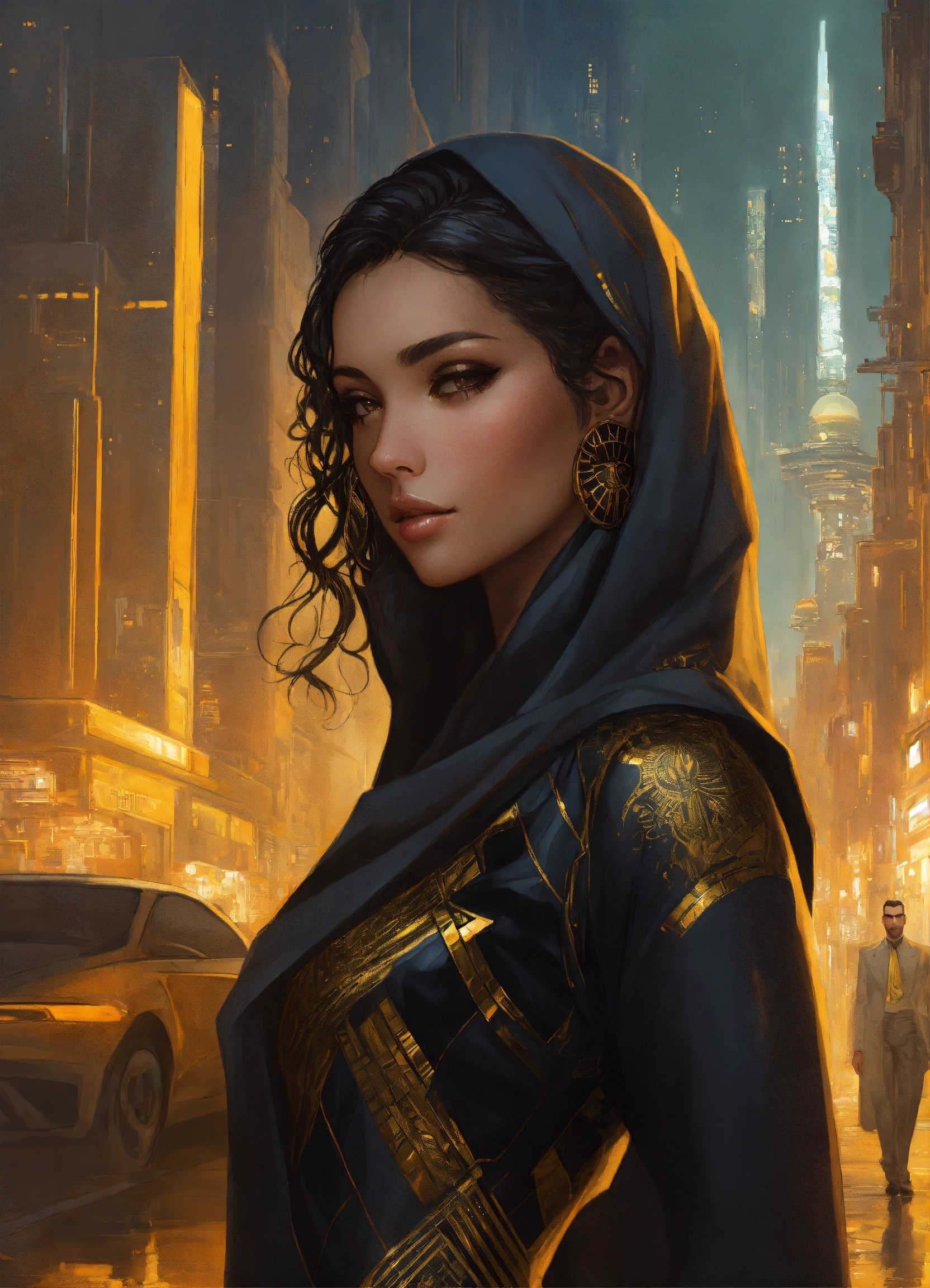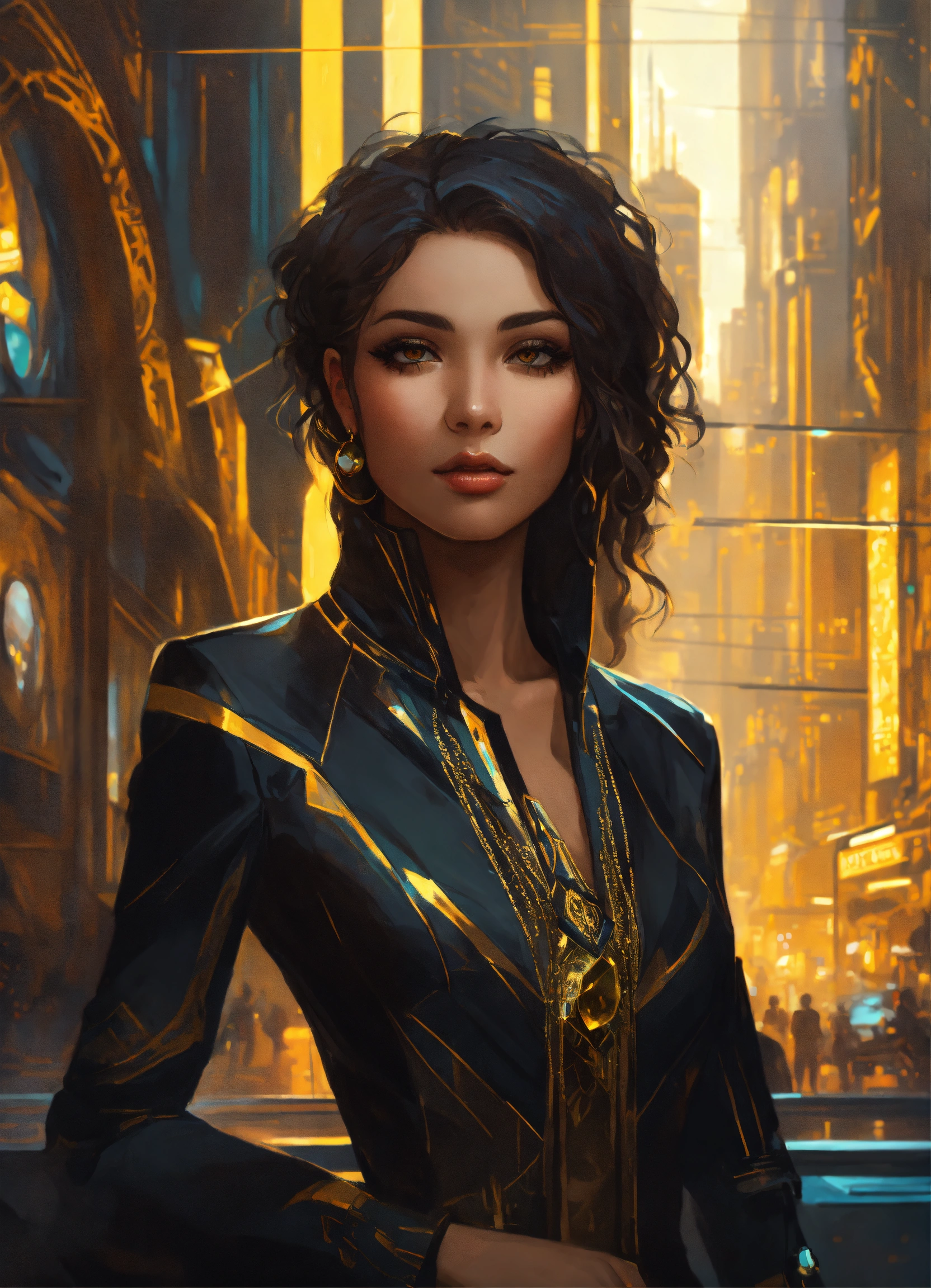 Beautiful middle eastern woman wearing a black and citrine egyptian non metallic business suit, in a futuristic cityscape, hyper detailed, cyberpunk style, alphonse mucha, wlop, charlie bowater, magali villeneuve, face view