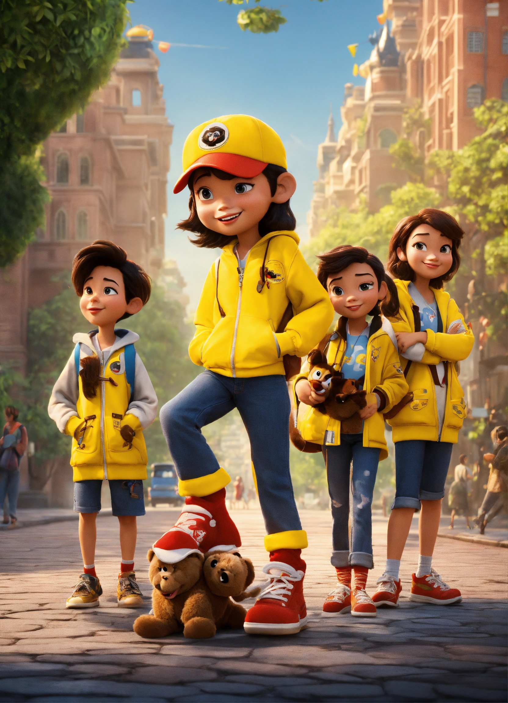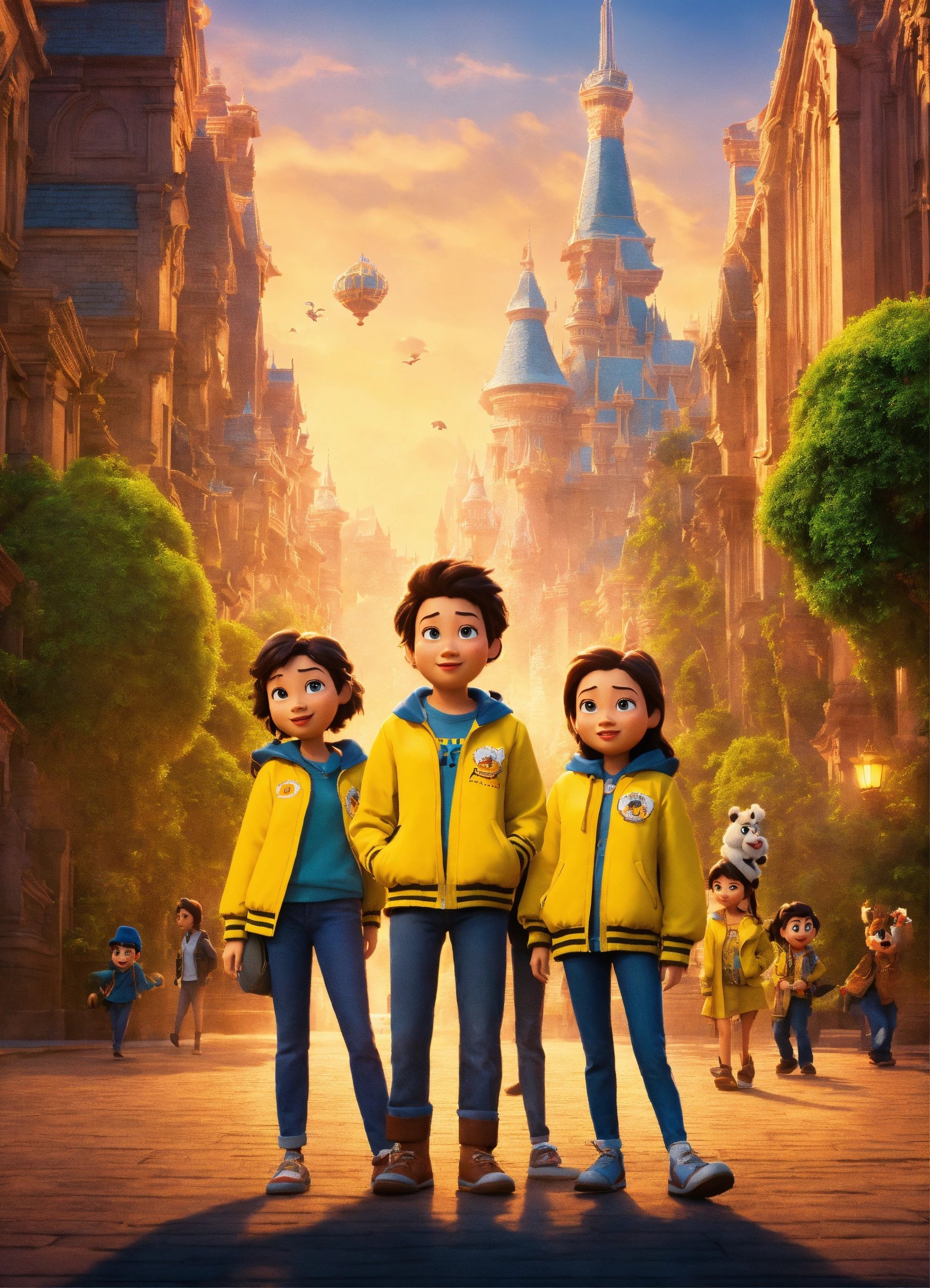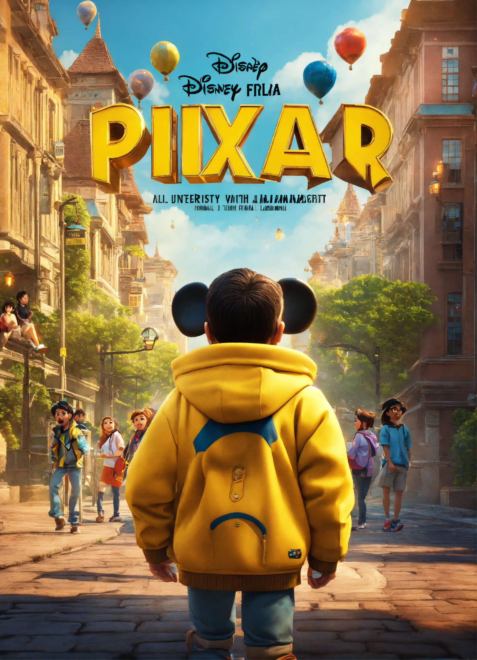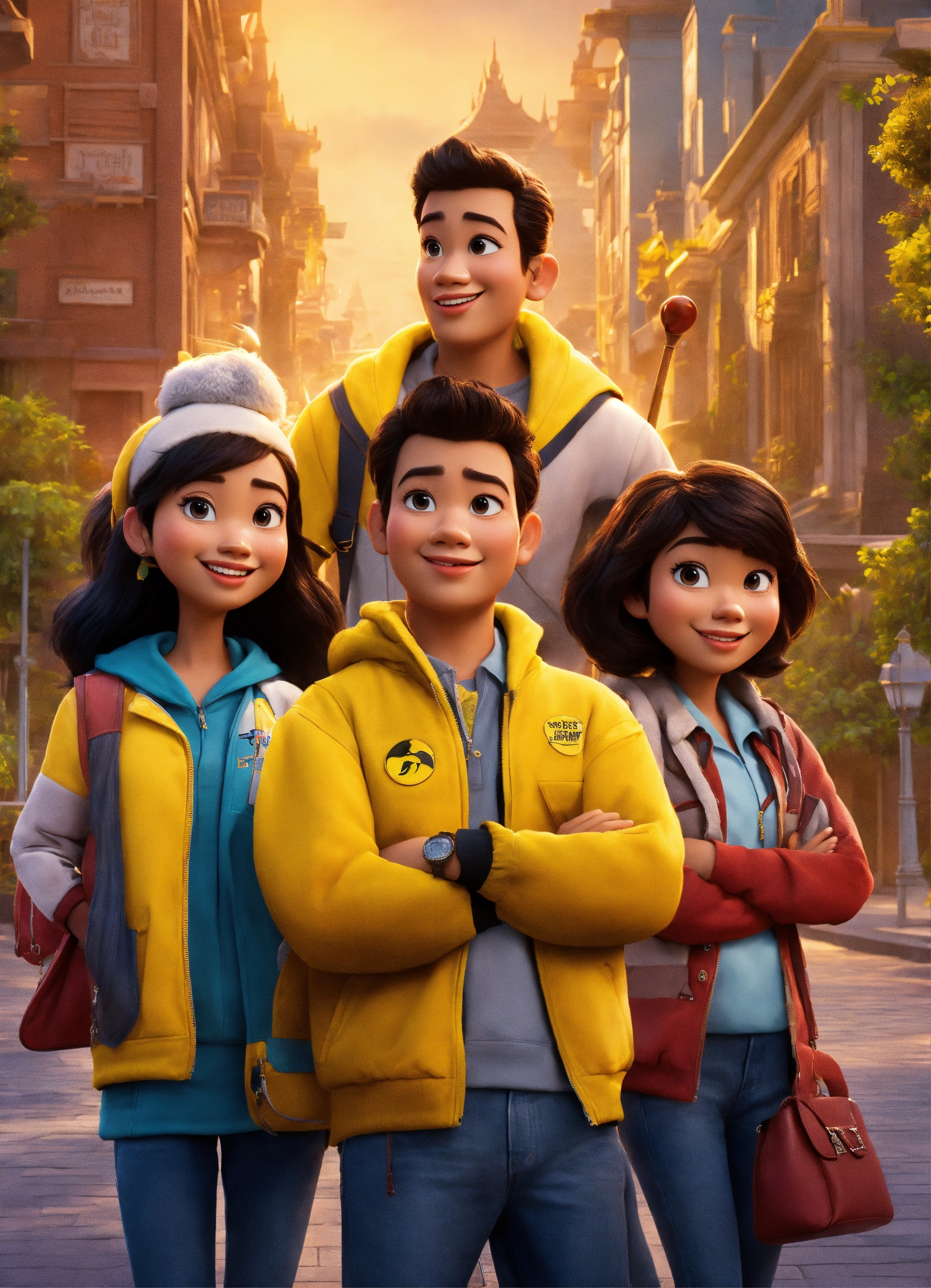 Disney pixar film poster, university, gang of friends with yellow almamater jacket, city, indonesia, 3d, cartoon