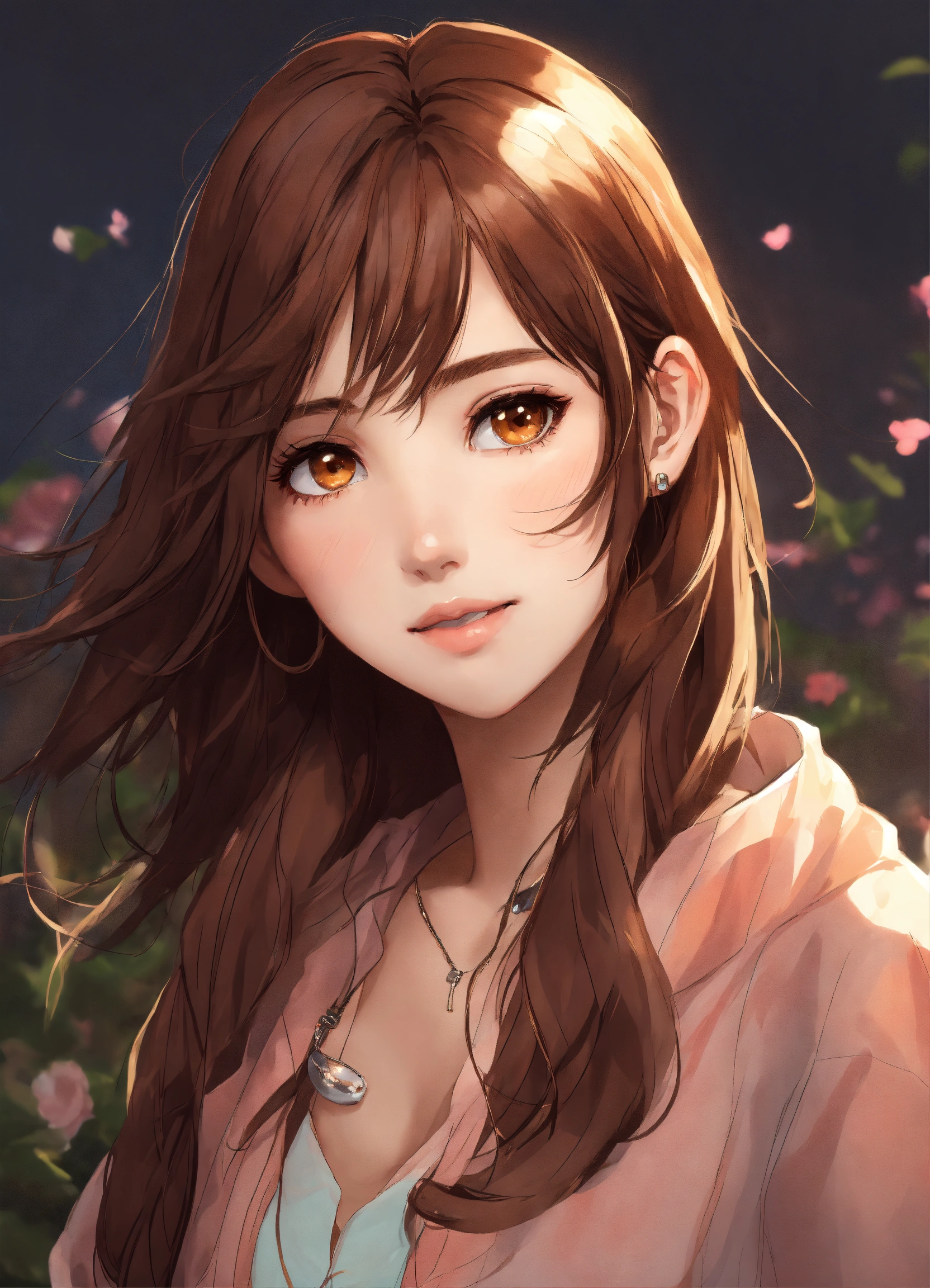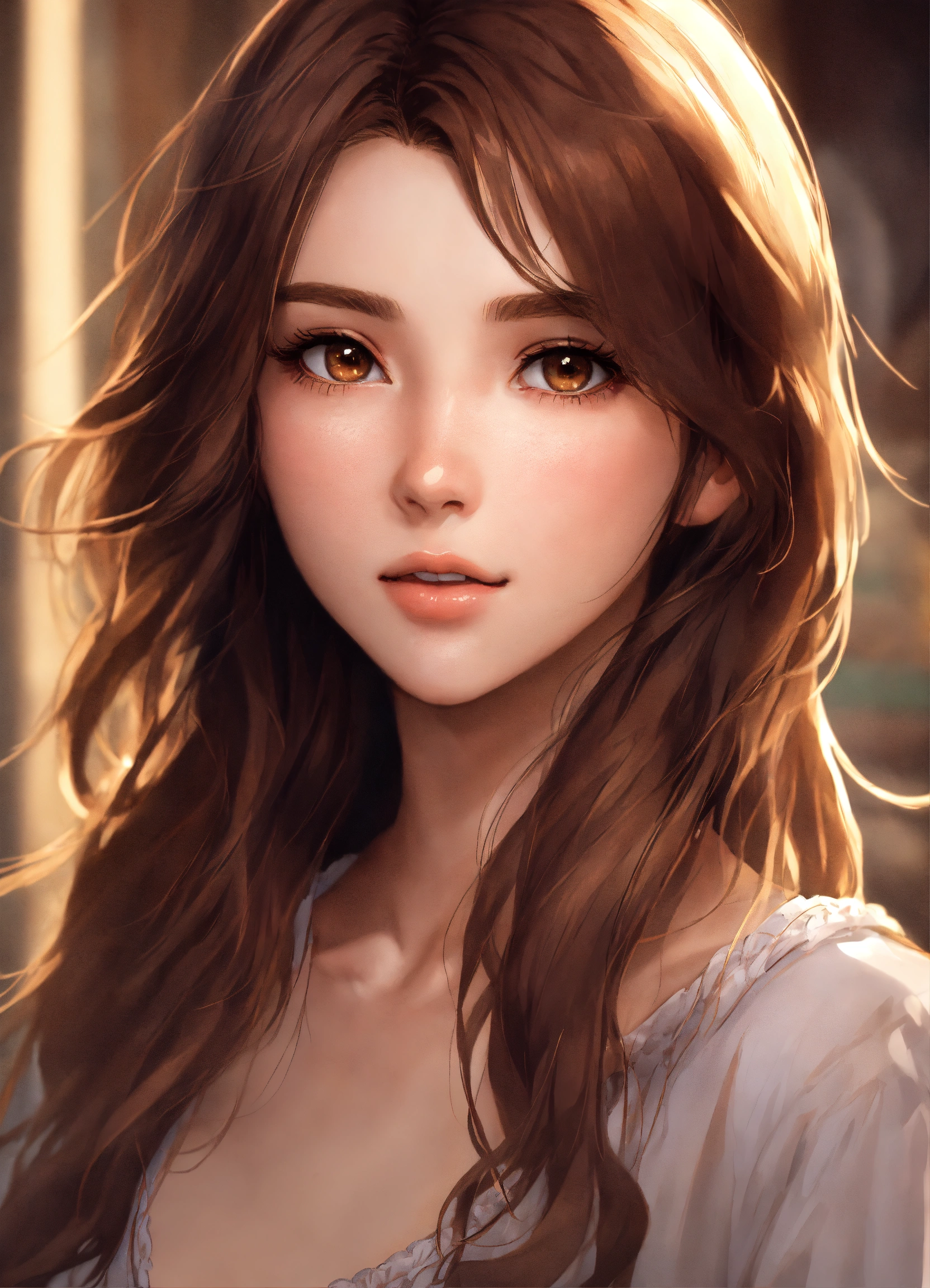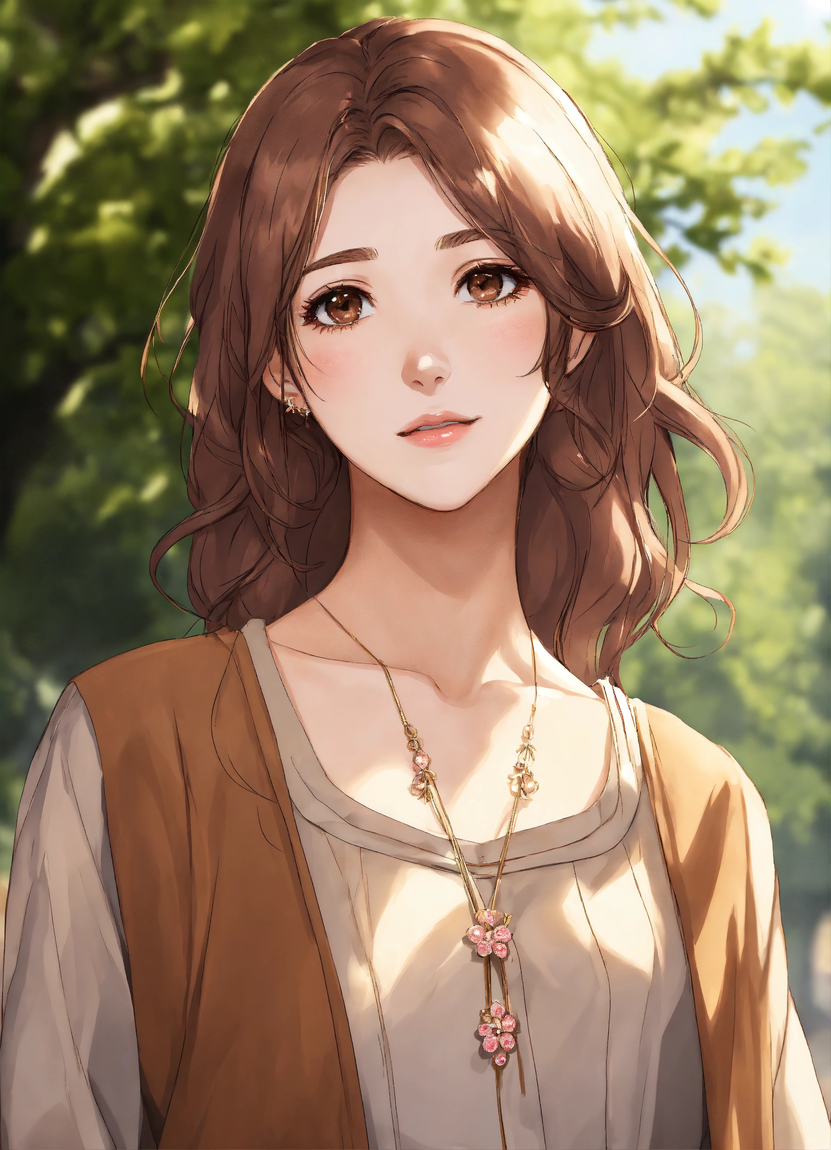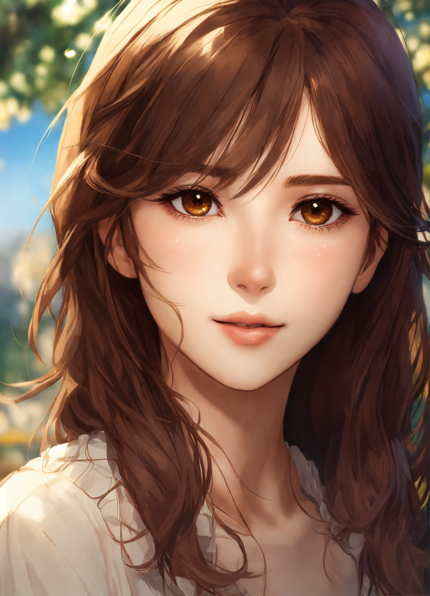 Woman 18 years old, shoulder length brown hair, beautiful face, soft facial features, height 175, feminine figure, brown eyes, anime reskin style