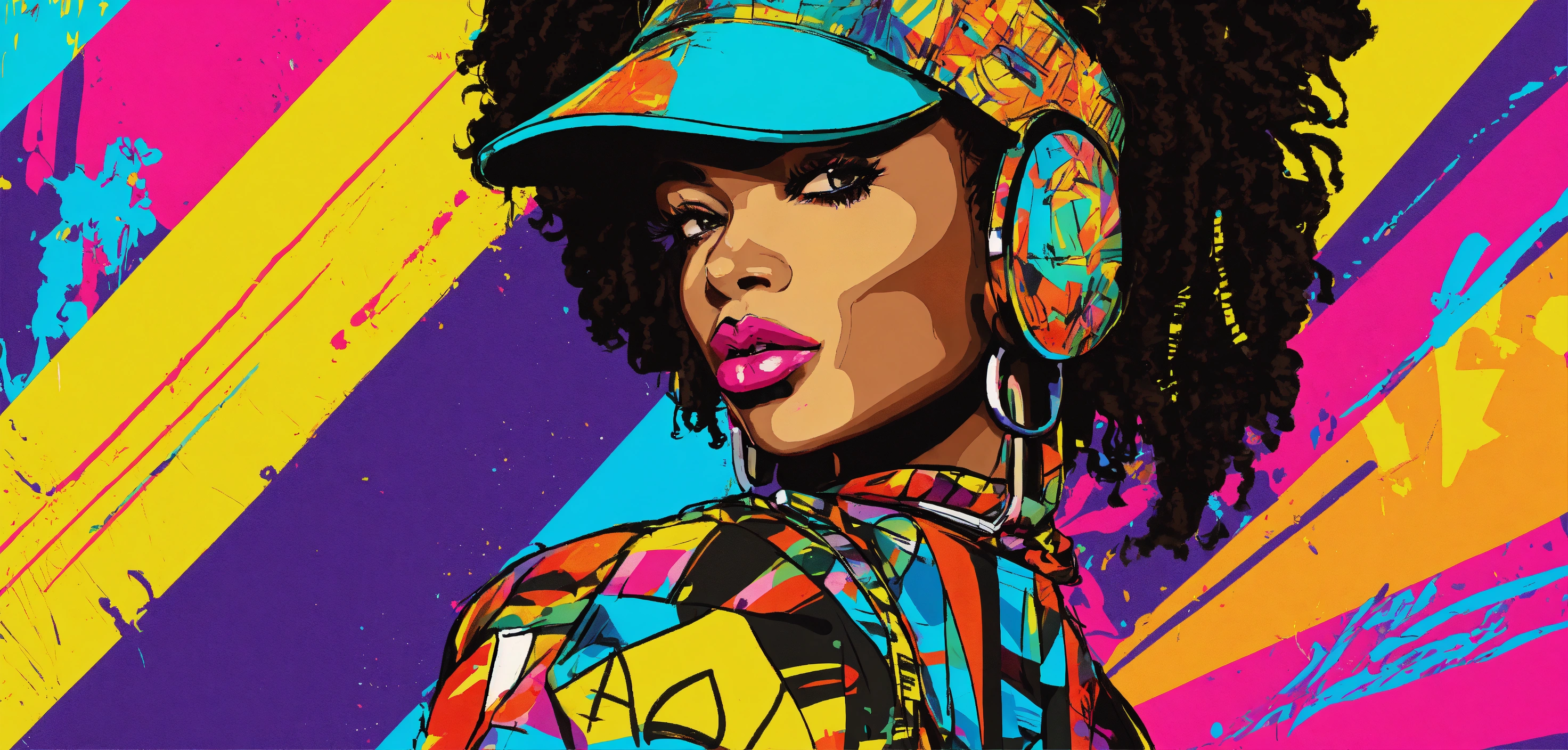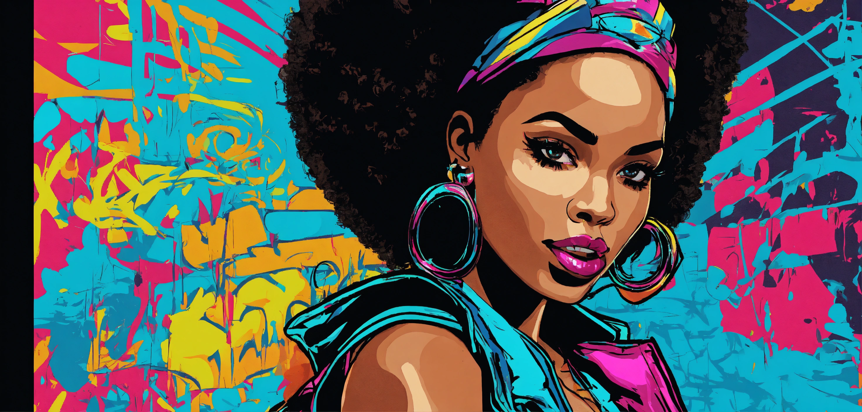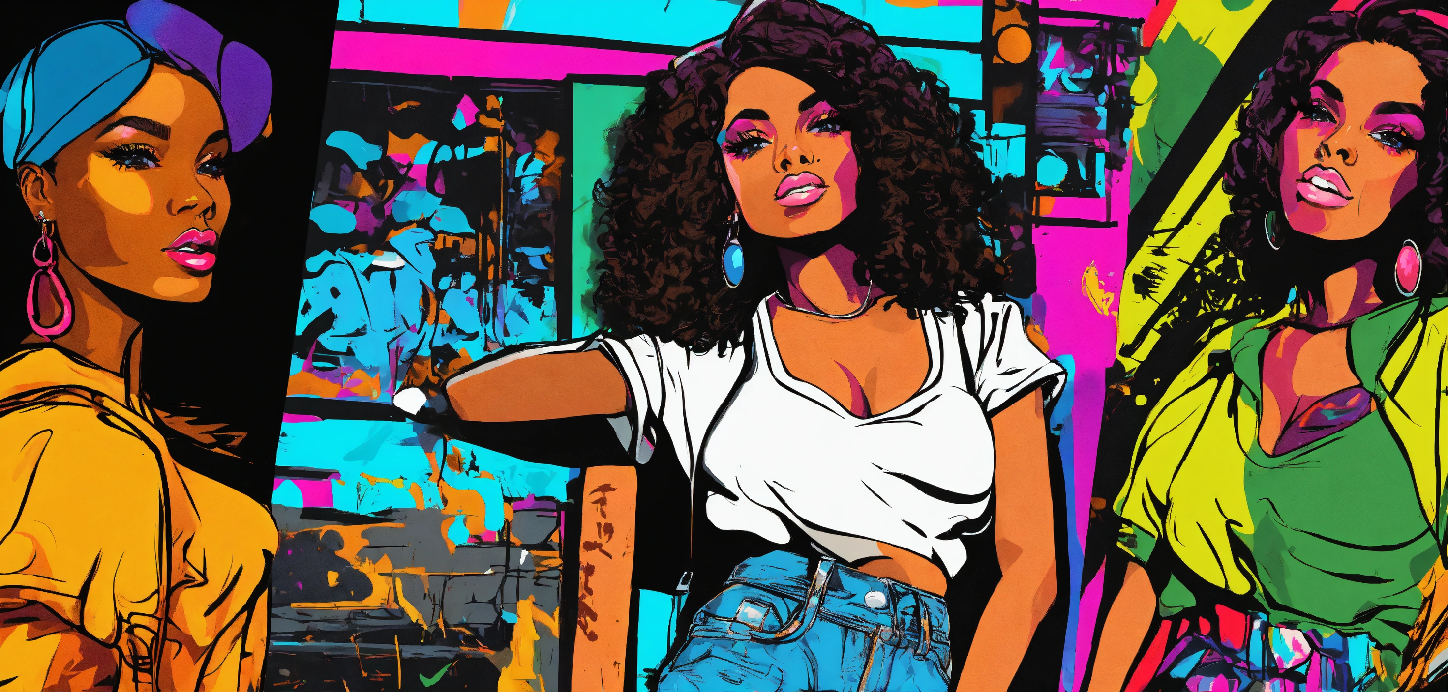 Pop art street style black woman in urban pop art clothing, striking a pose against a graffitifilled pop art street — t-shirt design graphic, vector, contour, black background.