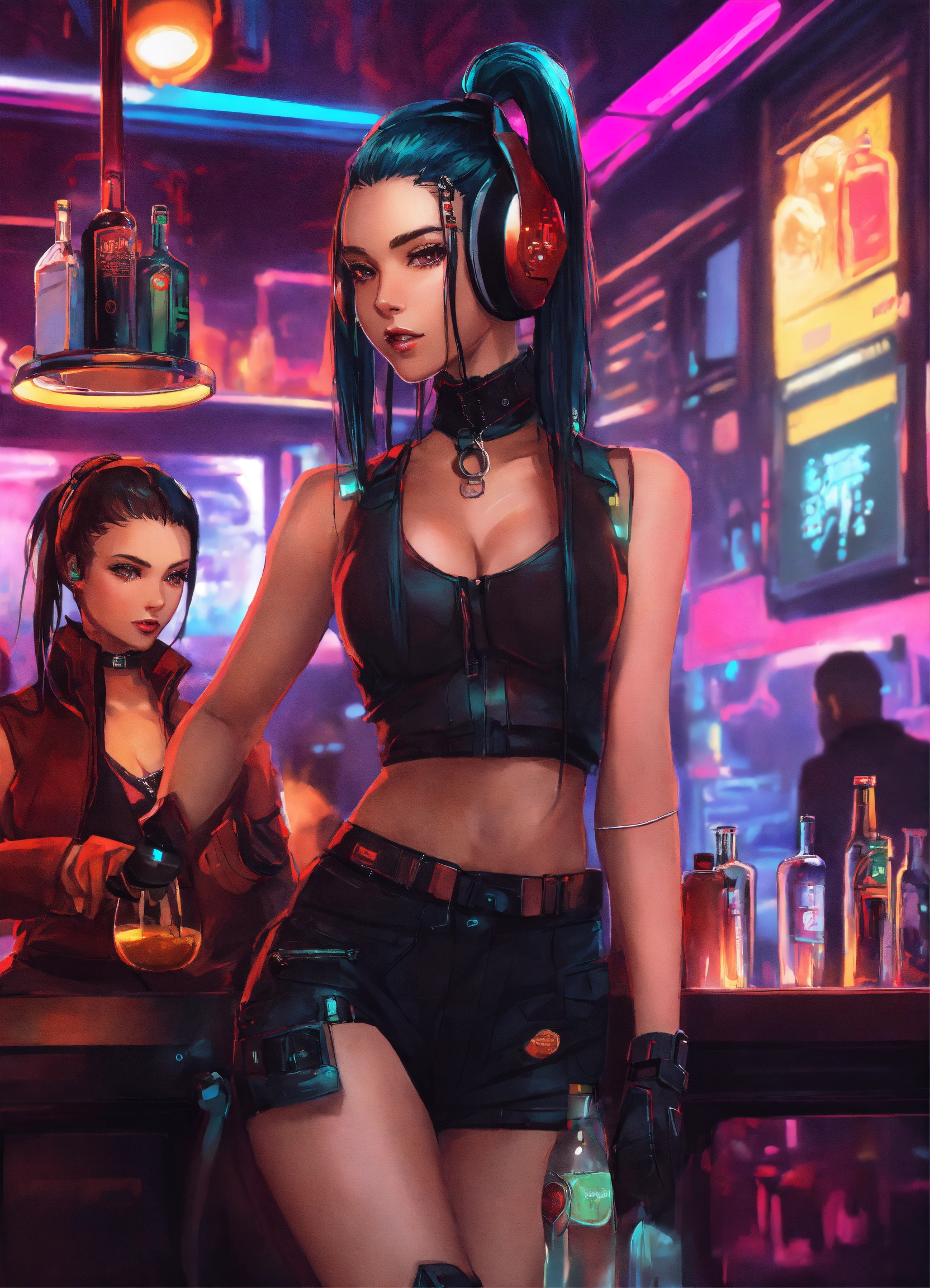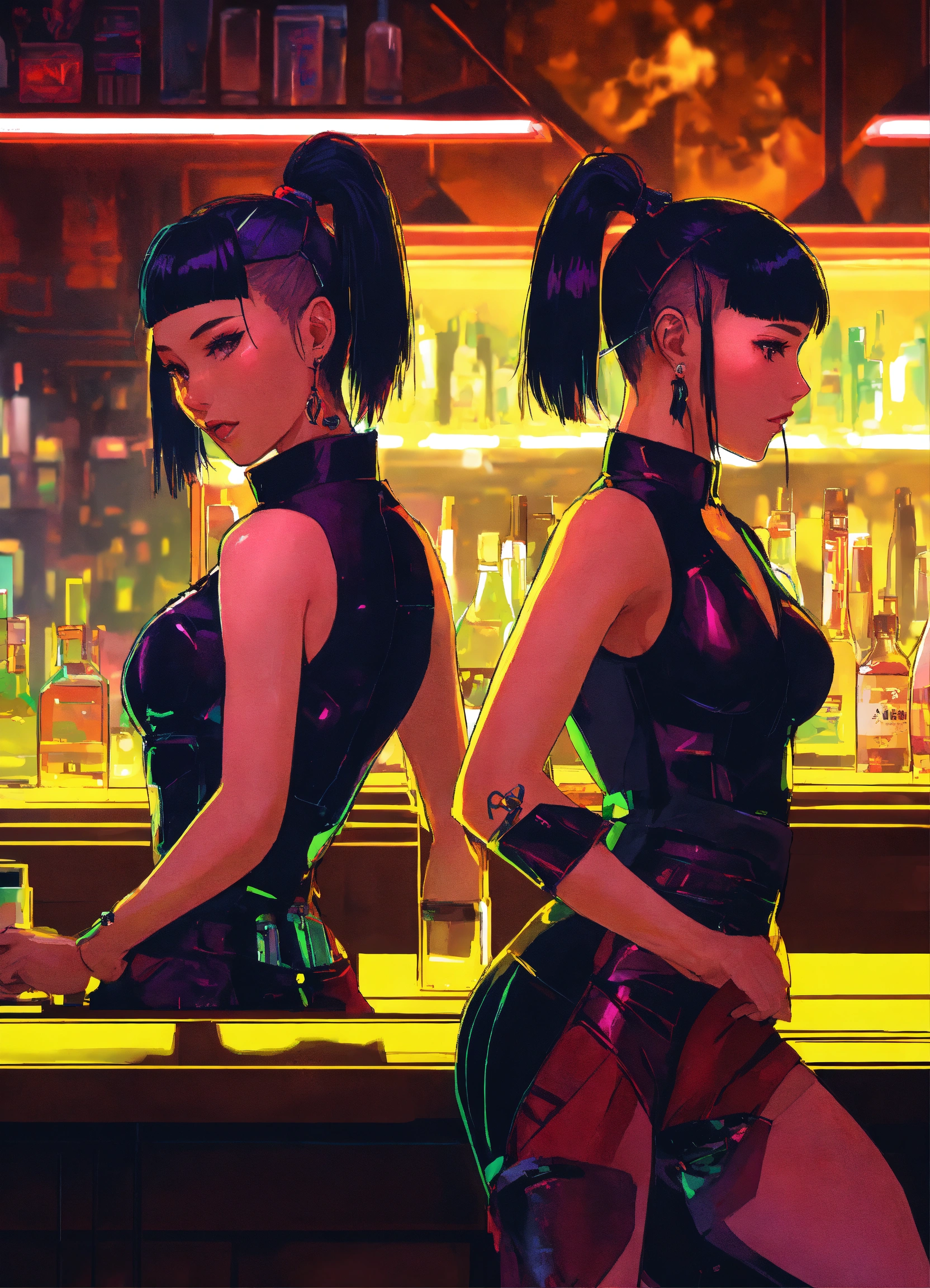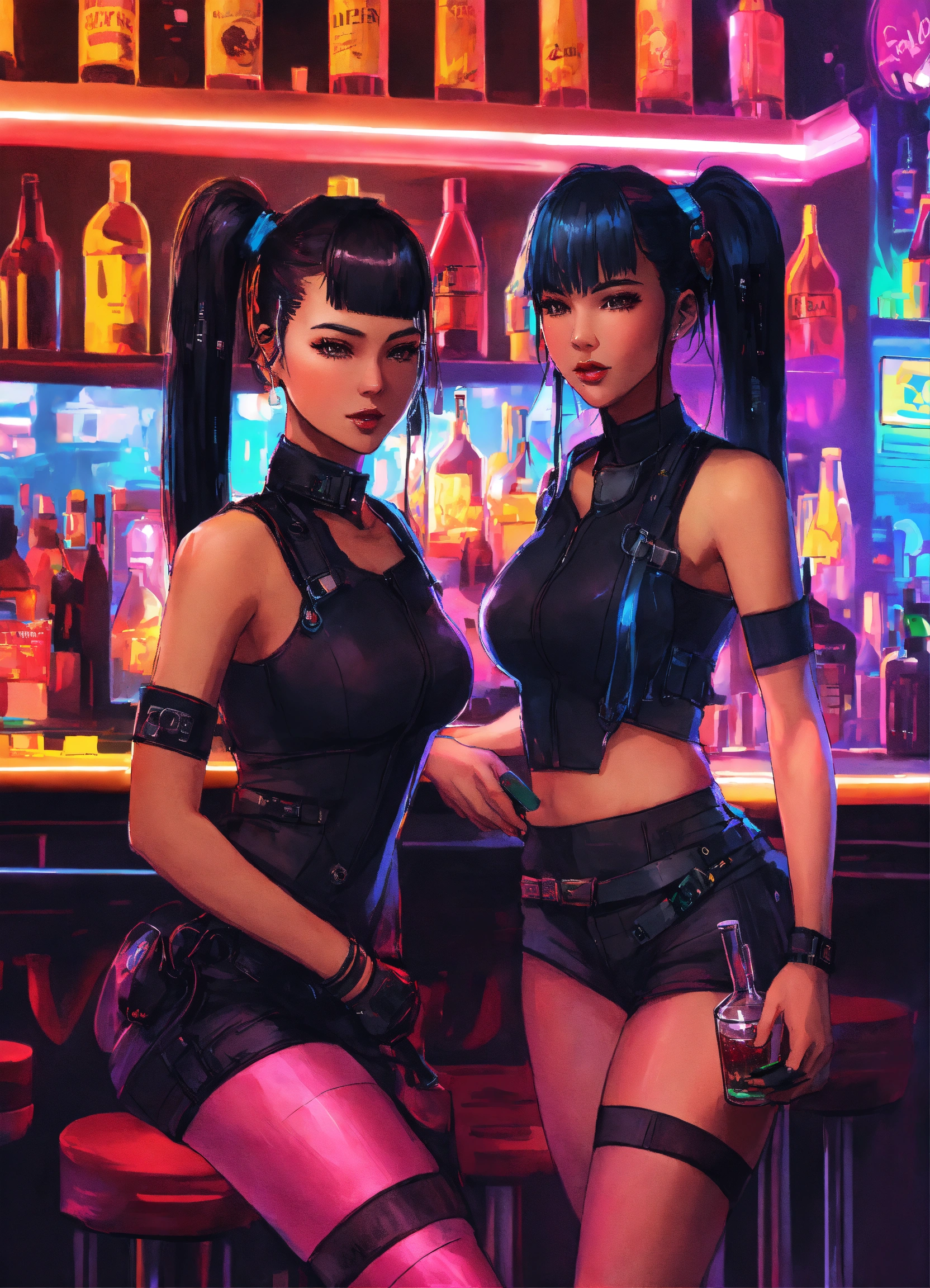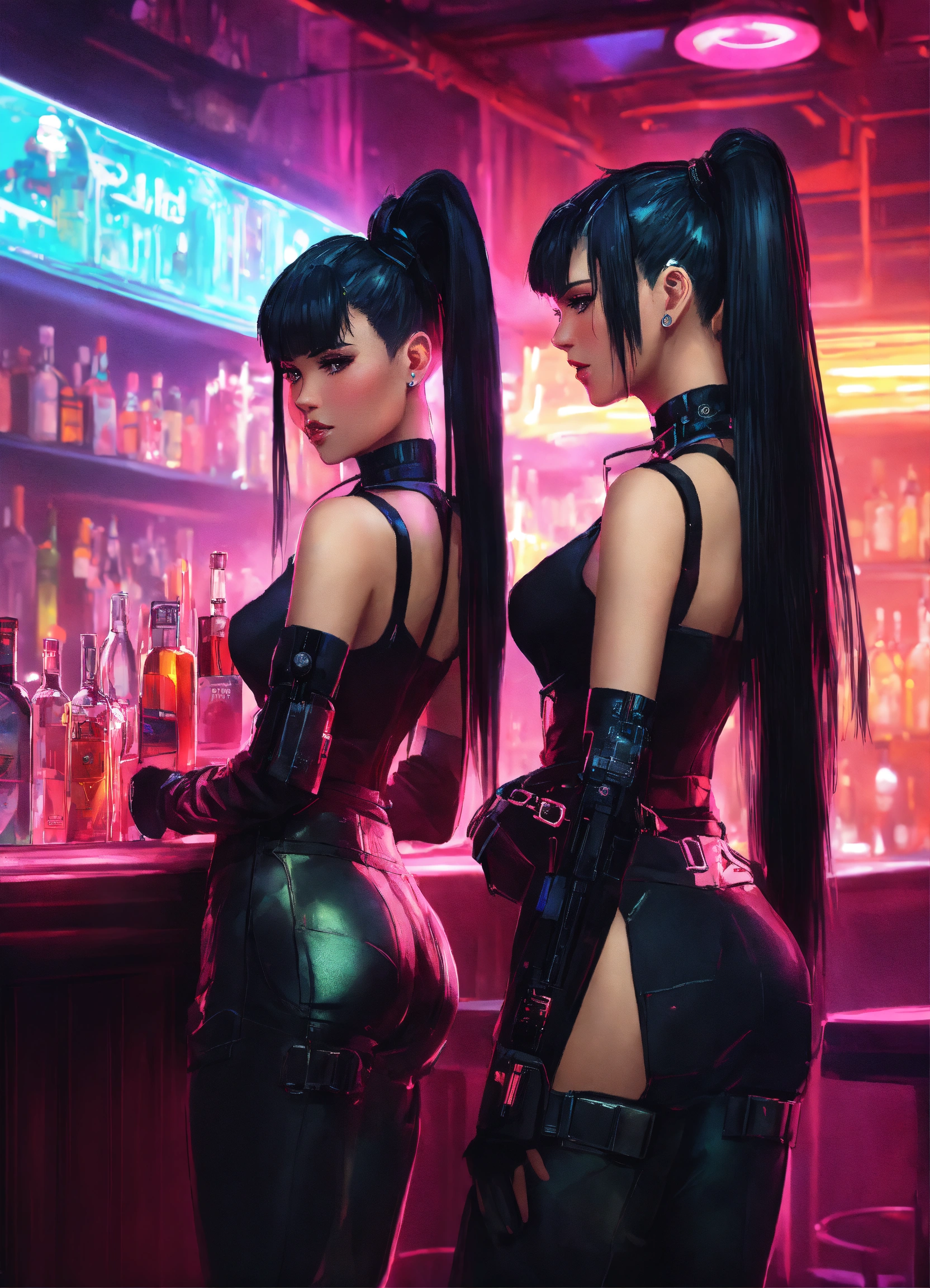 Digital art of cyberpunk twin sister bartenders with short straight black ponytails at a club