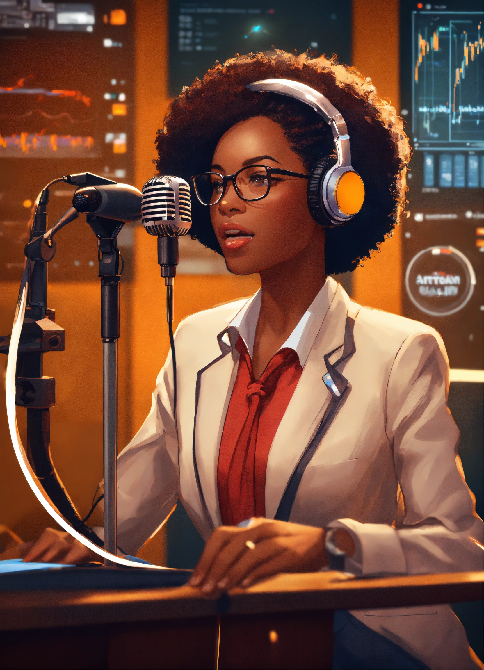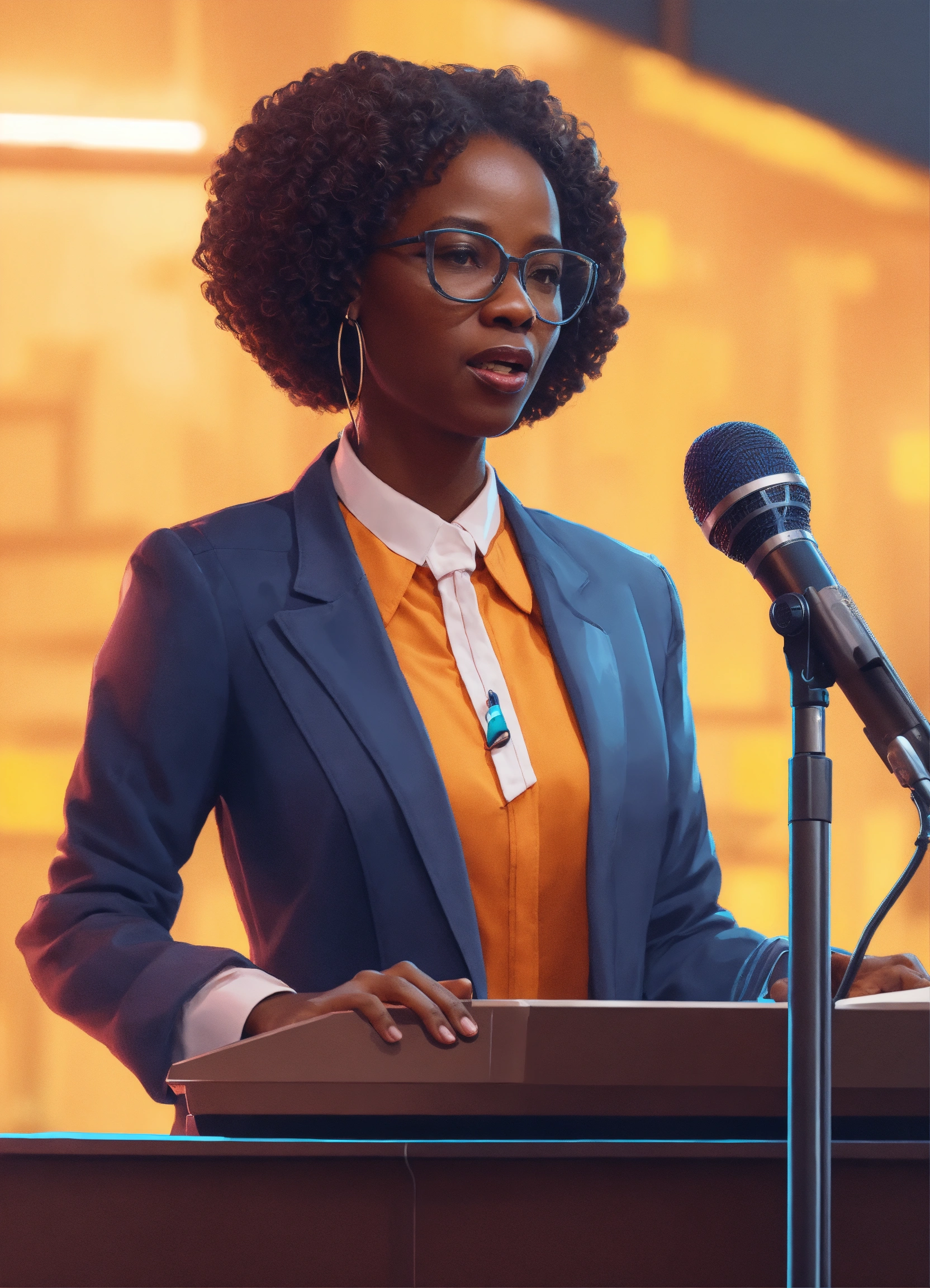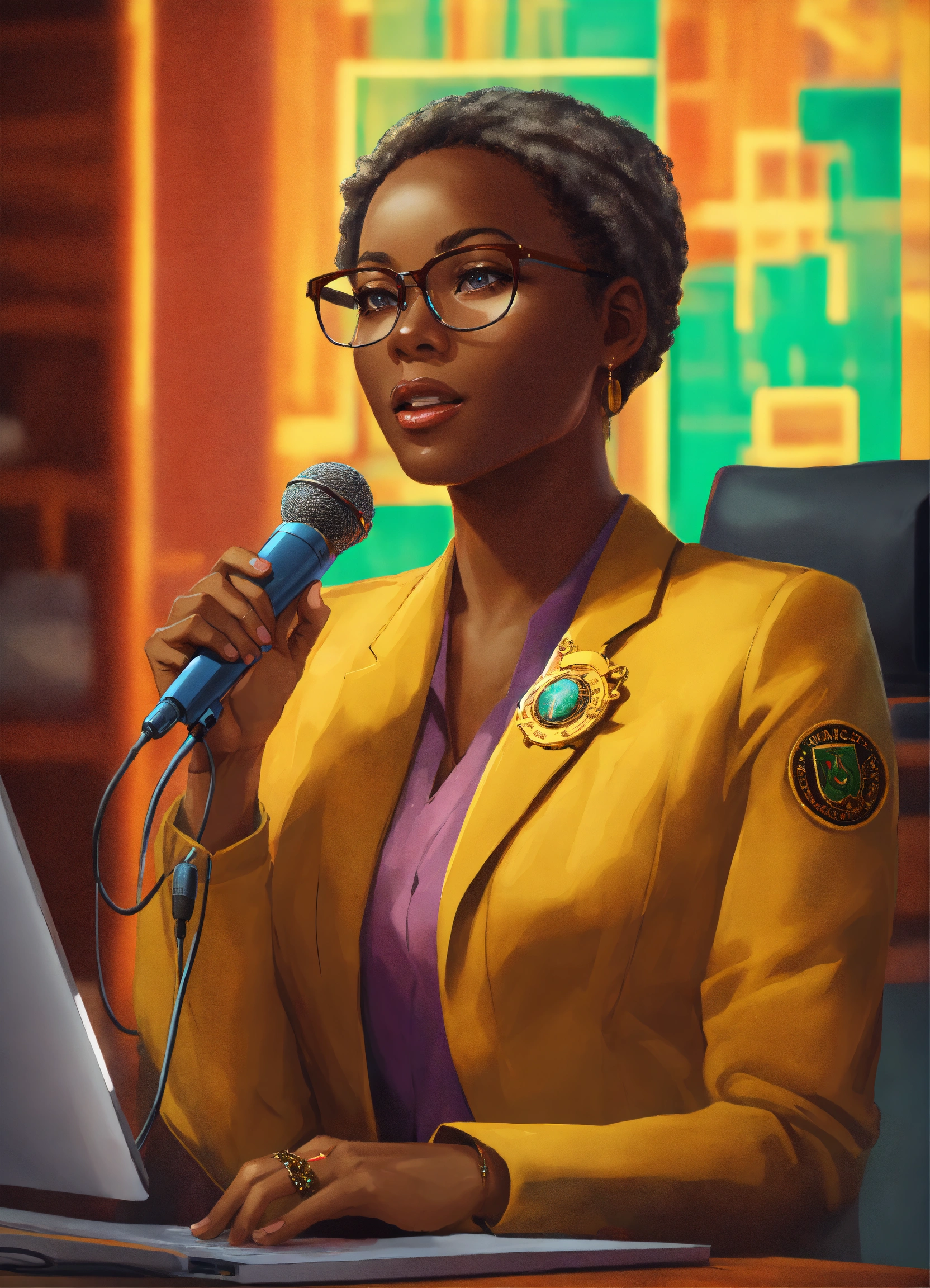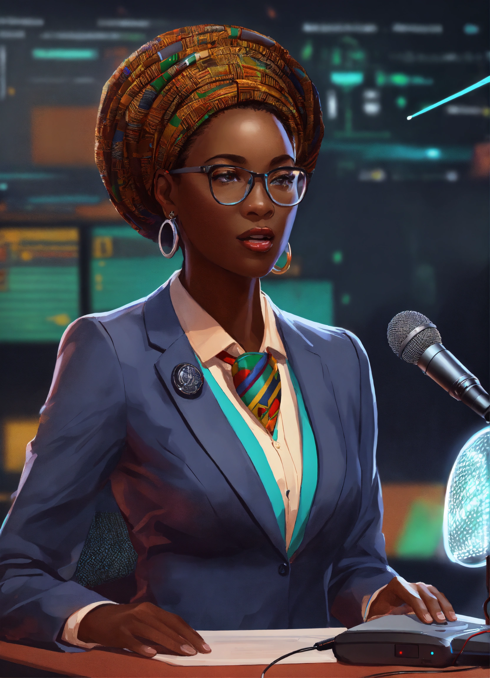 Trending on artstation, digital art, female african university president professor speaking into a microphone icon, transforming into a graphical interface of an operating system executing these tasks.