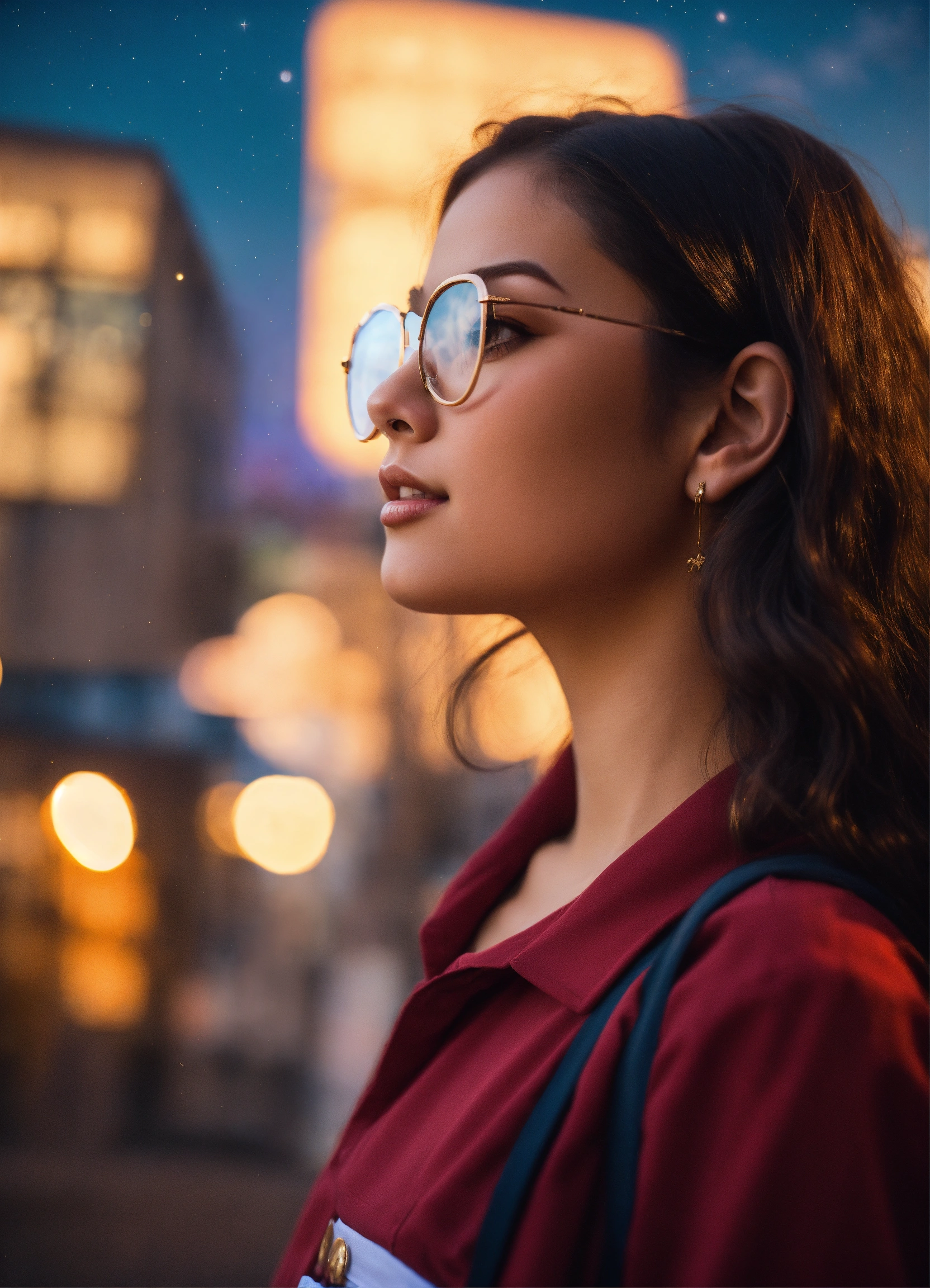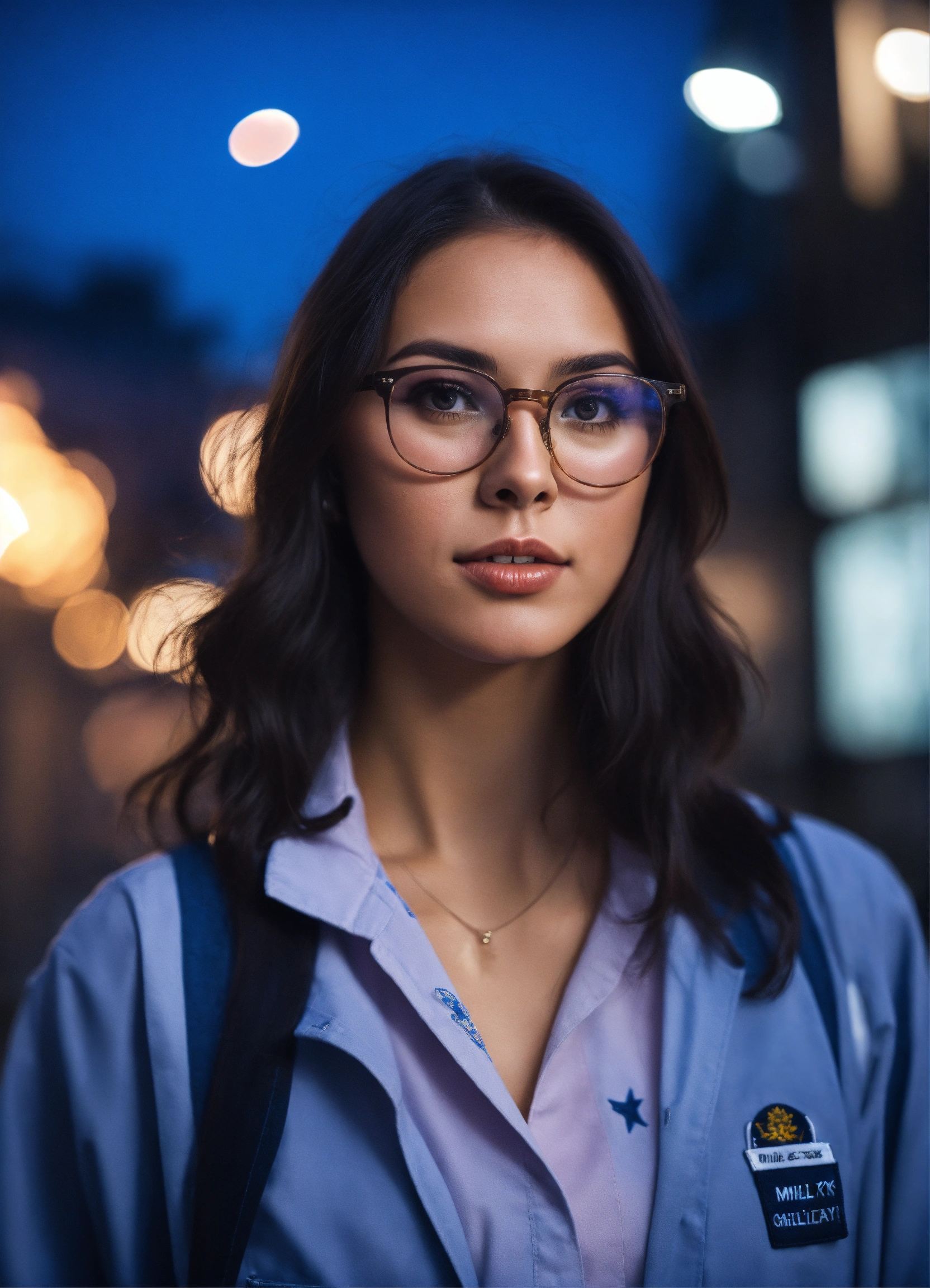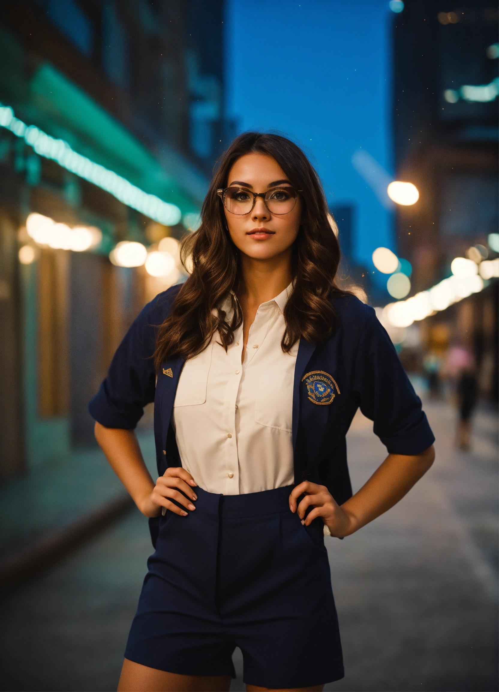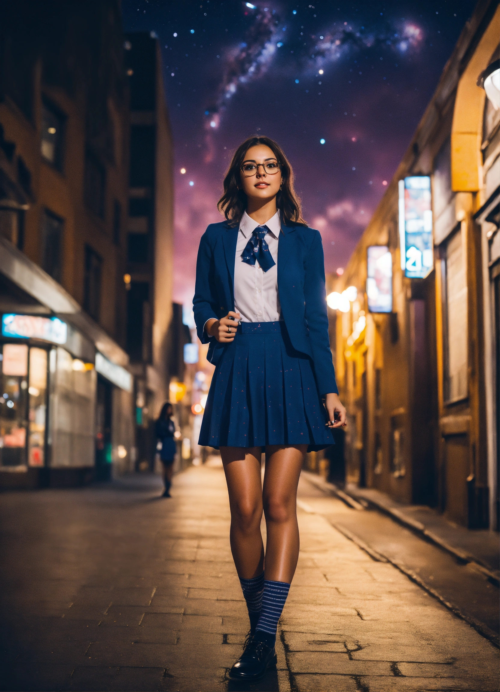 A real photo of a cute 28 year old hot brunette girl wearing a hot schoolgirl uniform hot glasses standing in a city, in the sky we see the milky-way