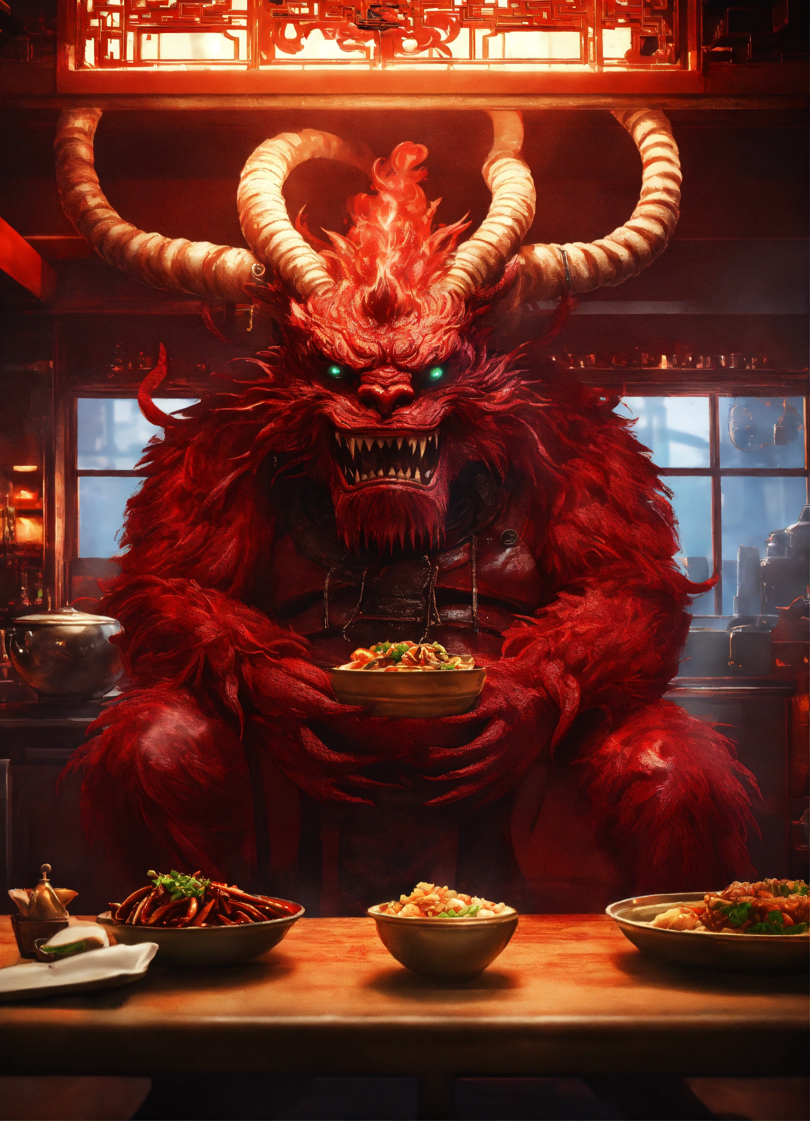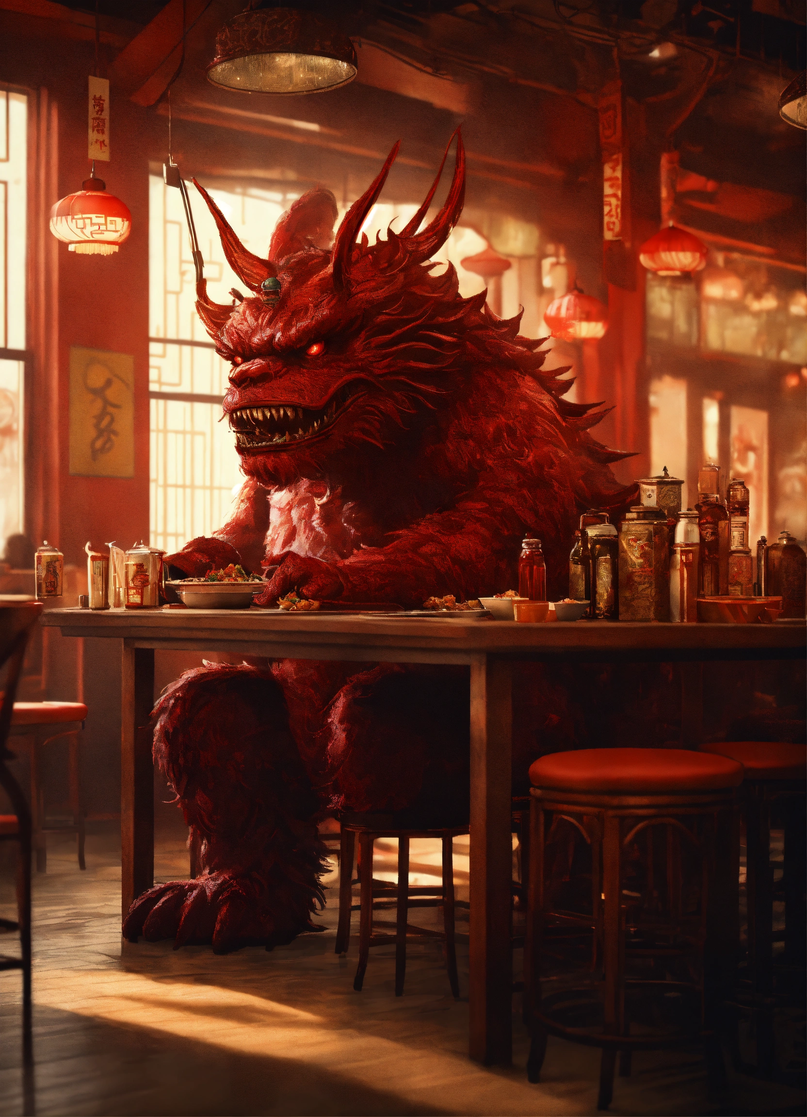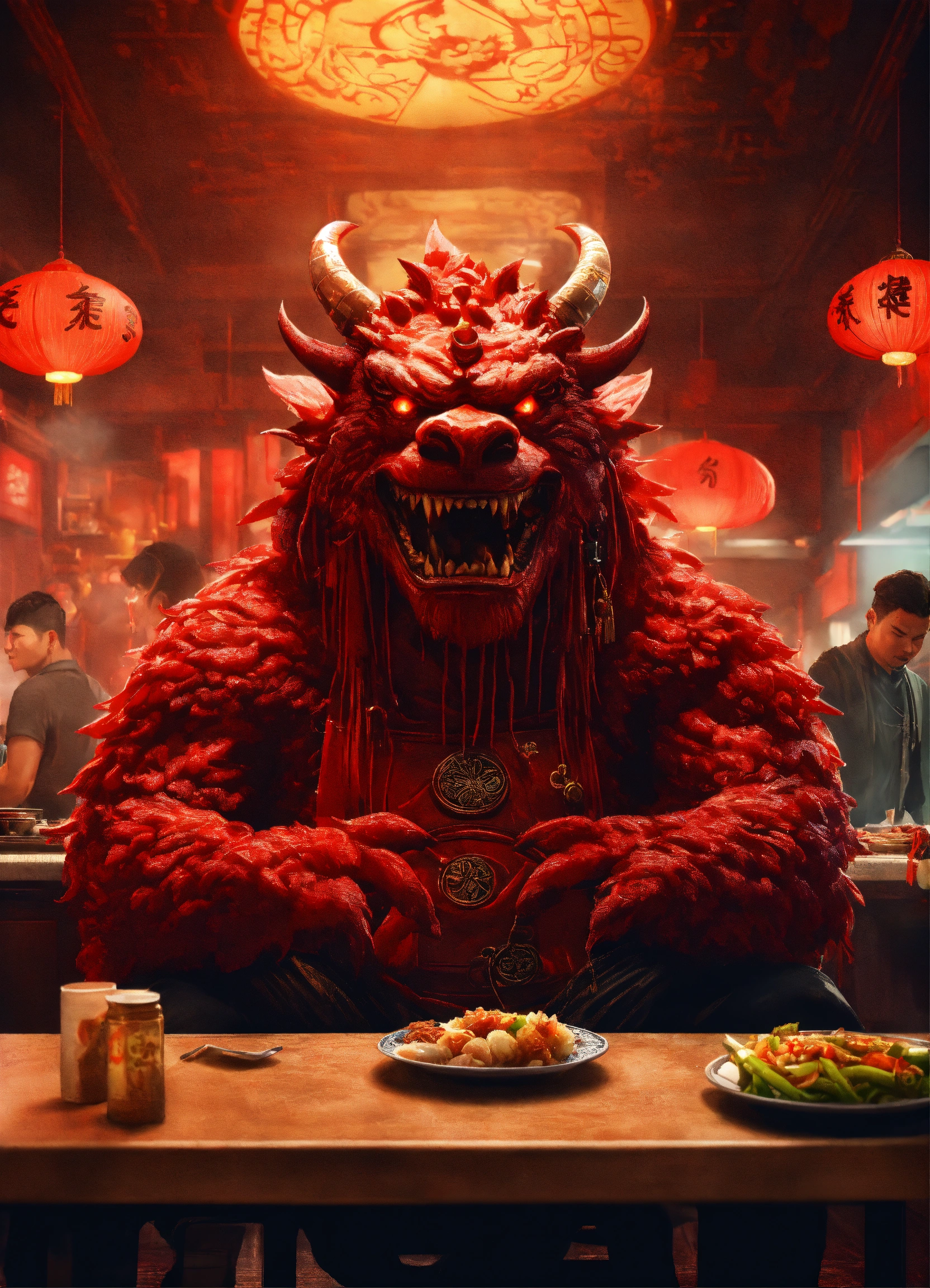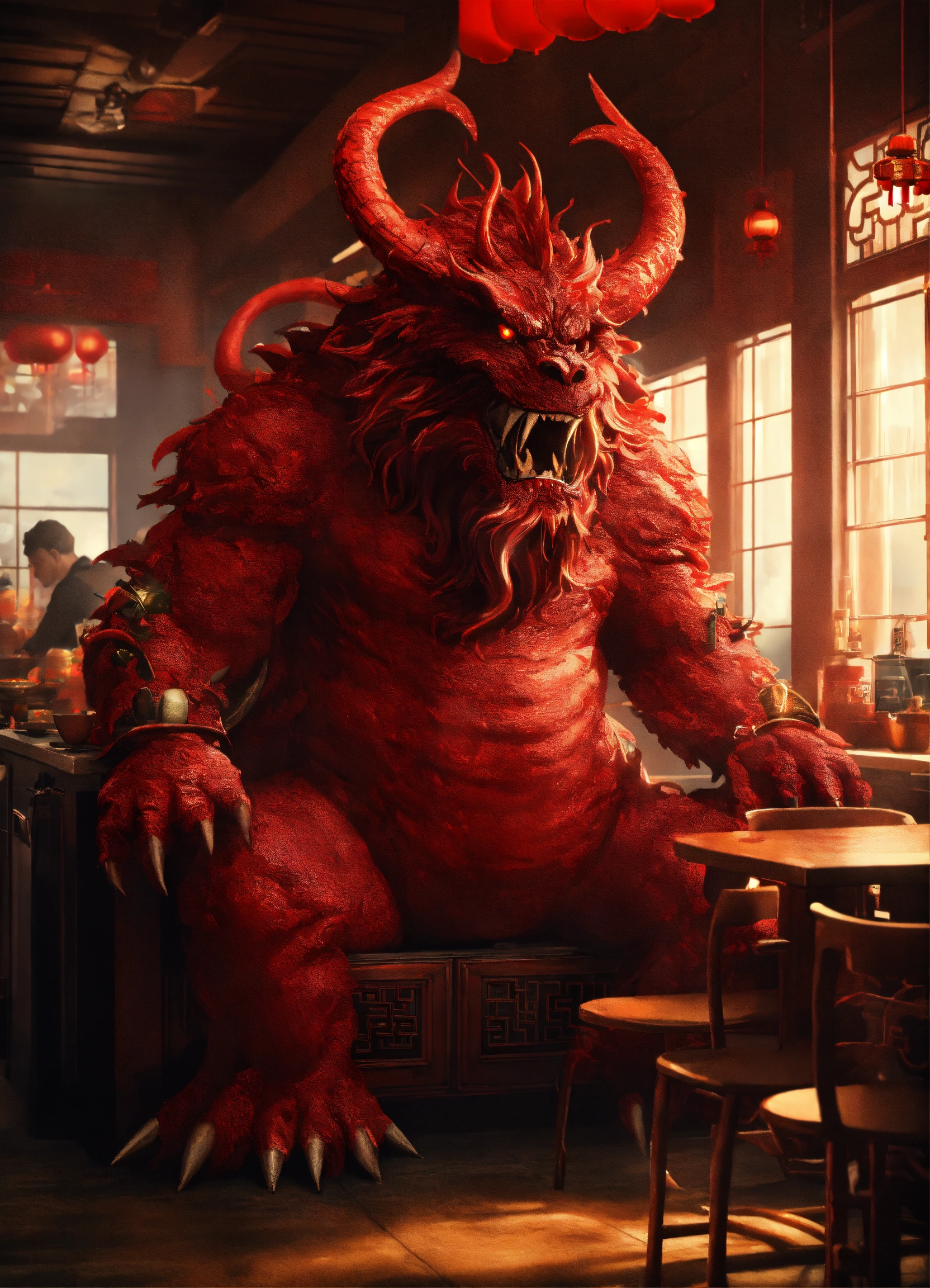 A huge red chinese monster is sitting in front of a kitchen full of people in a chinese restaurant, many smoke, red light, chinese food, in the style of cybermysticsteampunk, mike campau, emphasizes emotion over realism, rusticcore, grzegorz domaradzki, weirdcore, ben wooten --s 750