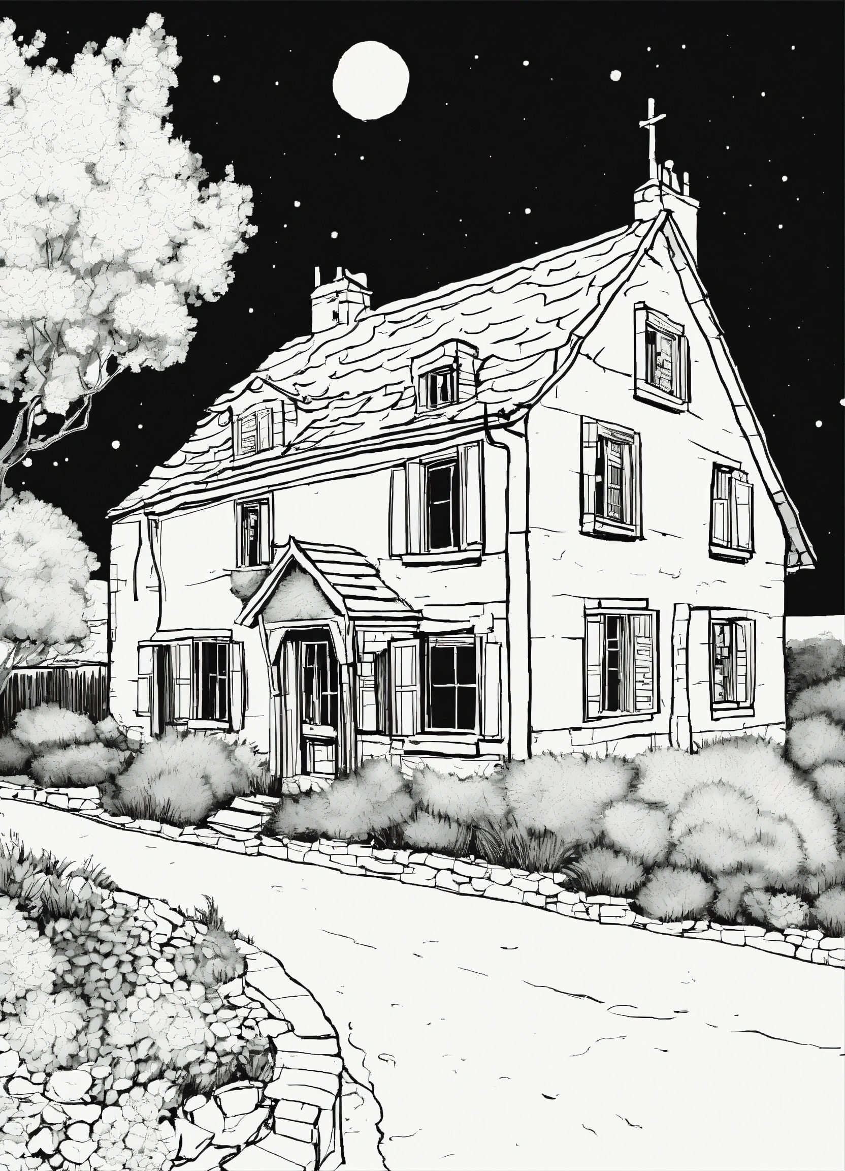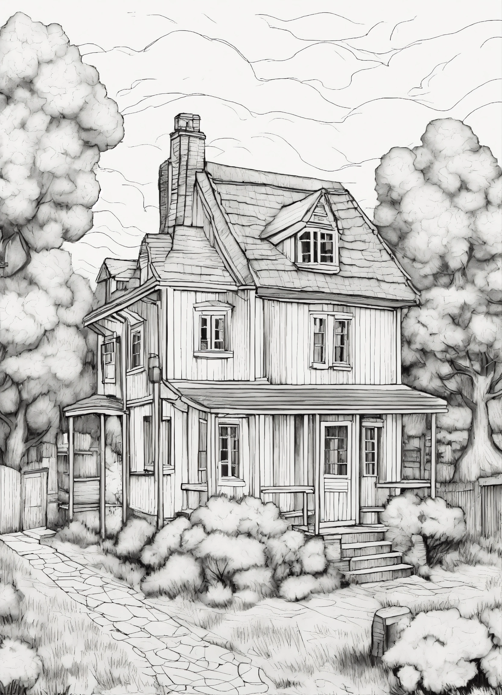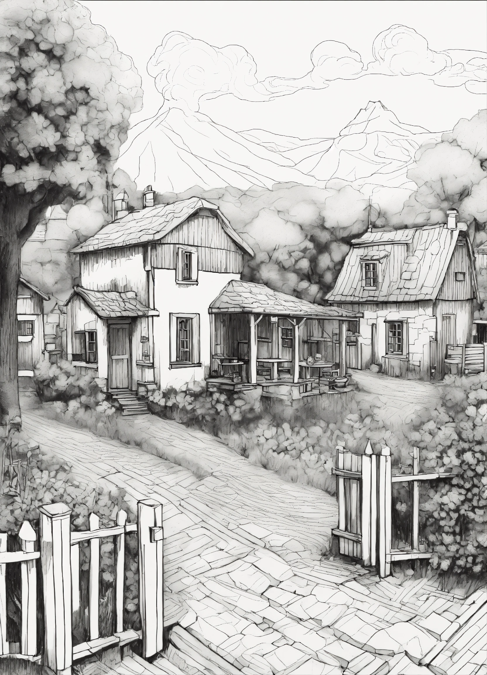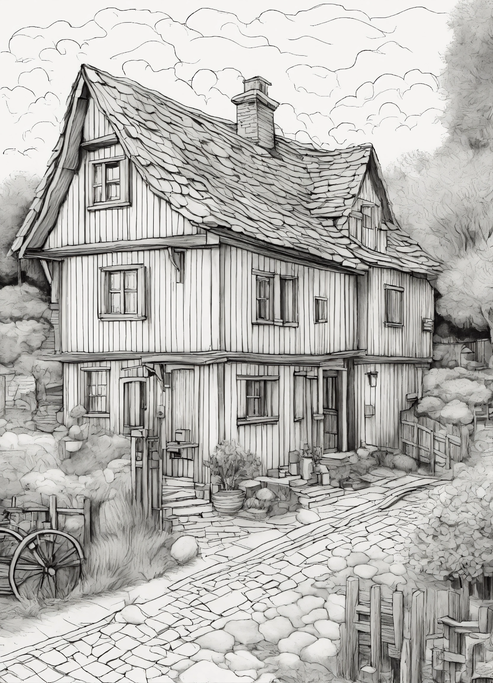 Simple drawing, low detail, cartoonish, isometric projection, vincent van gogh style, black and white, fine pen line art, fantasy village home, no noise, crisp lines, outline art, centered image, isolated on a white background