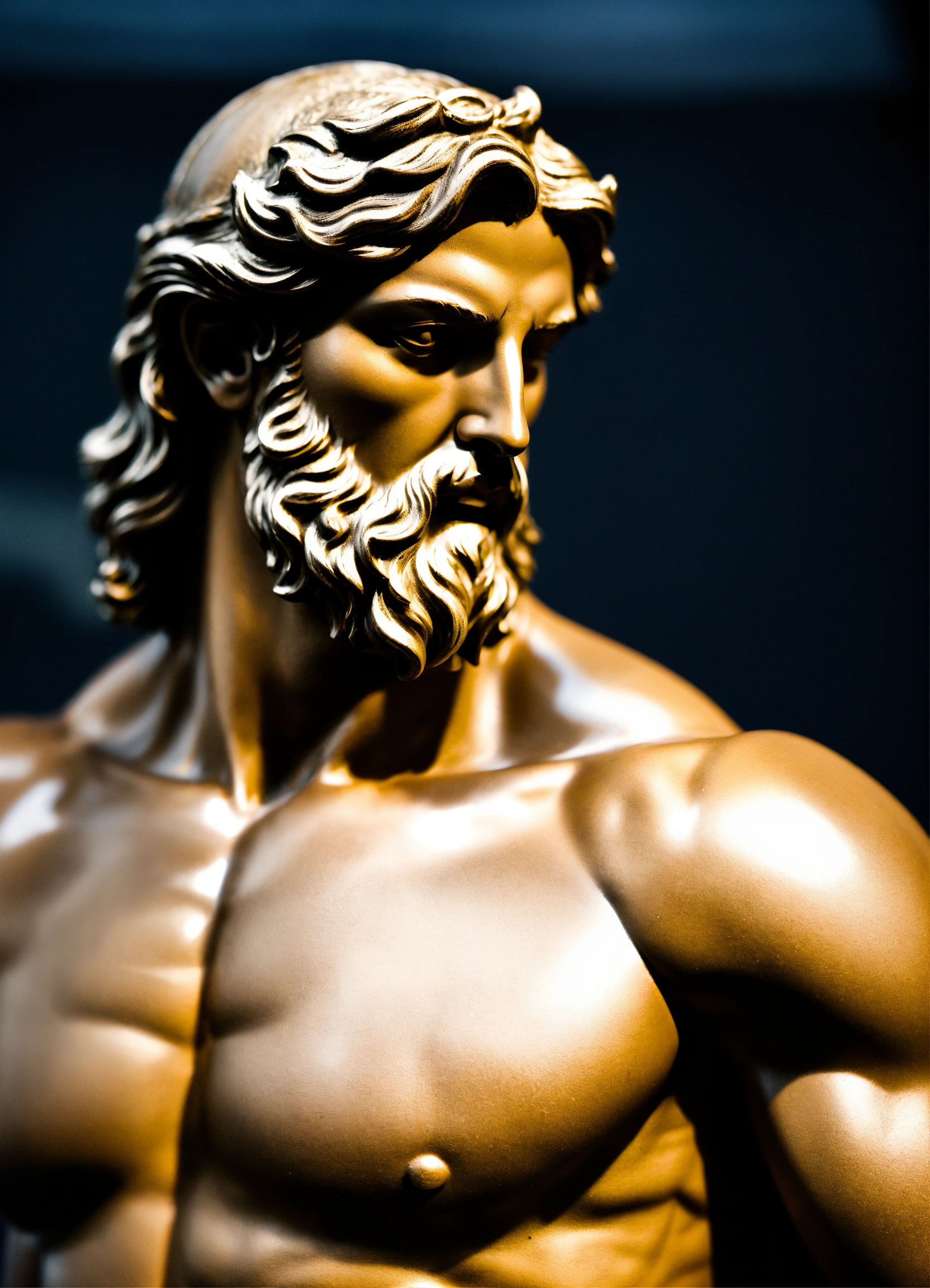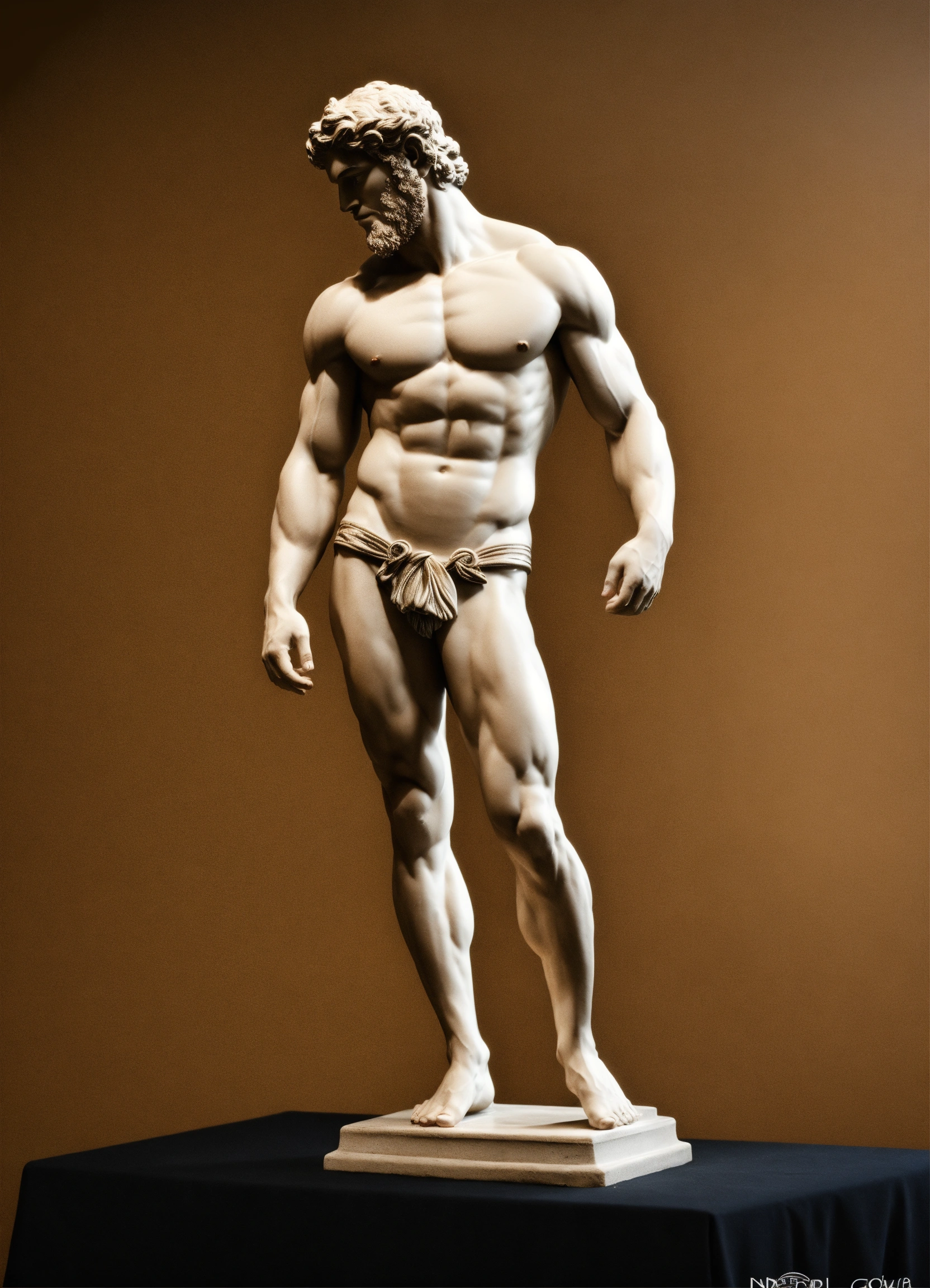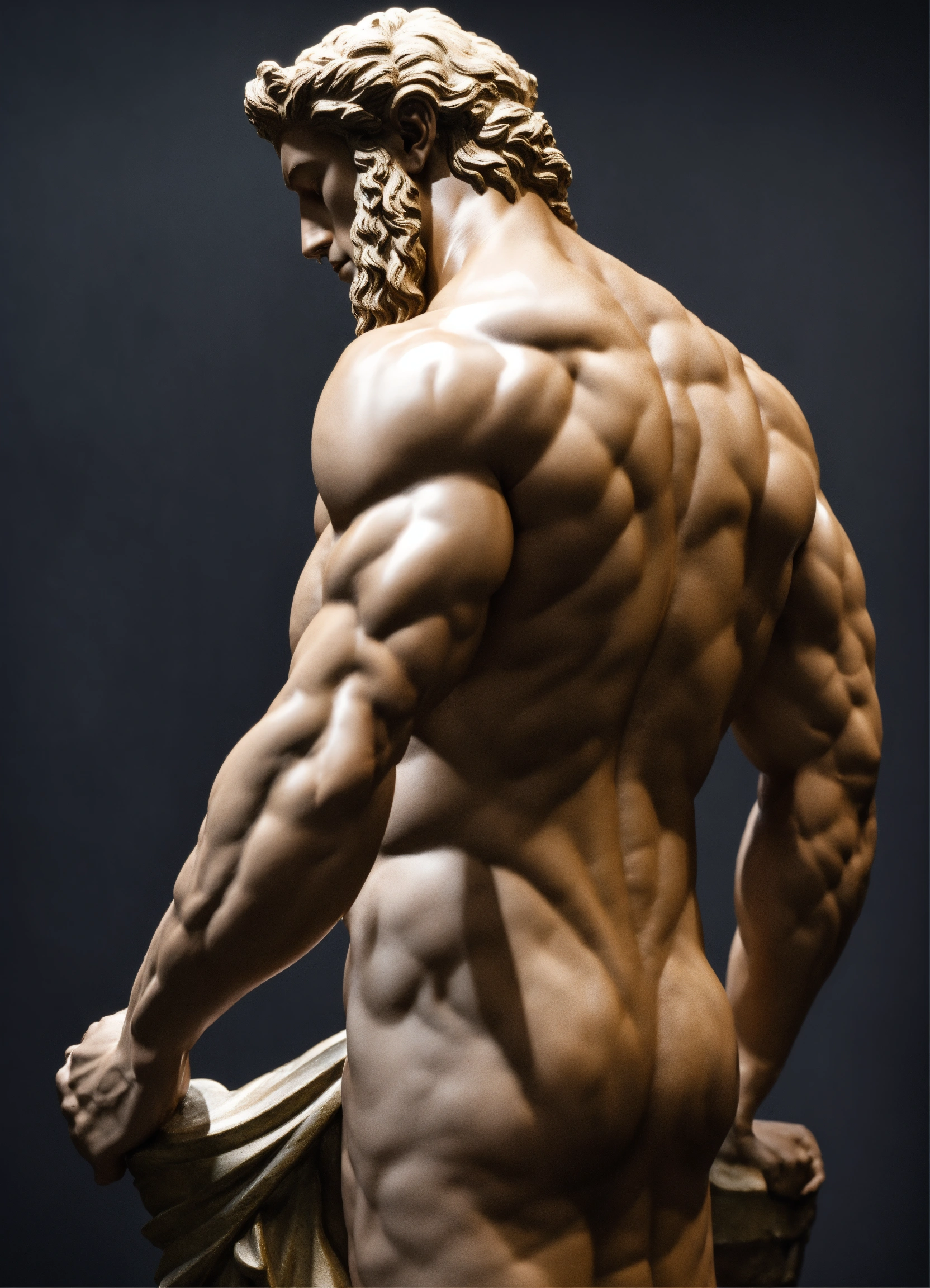 Simple muscular greek god statue with middelparting hair with white boddy with dark backround back position