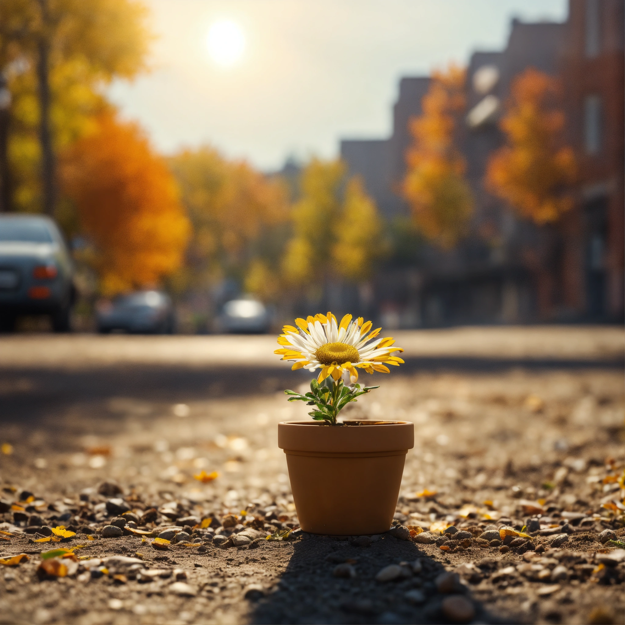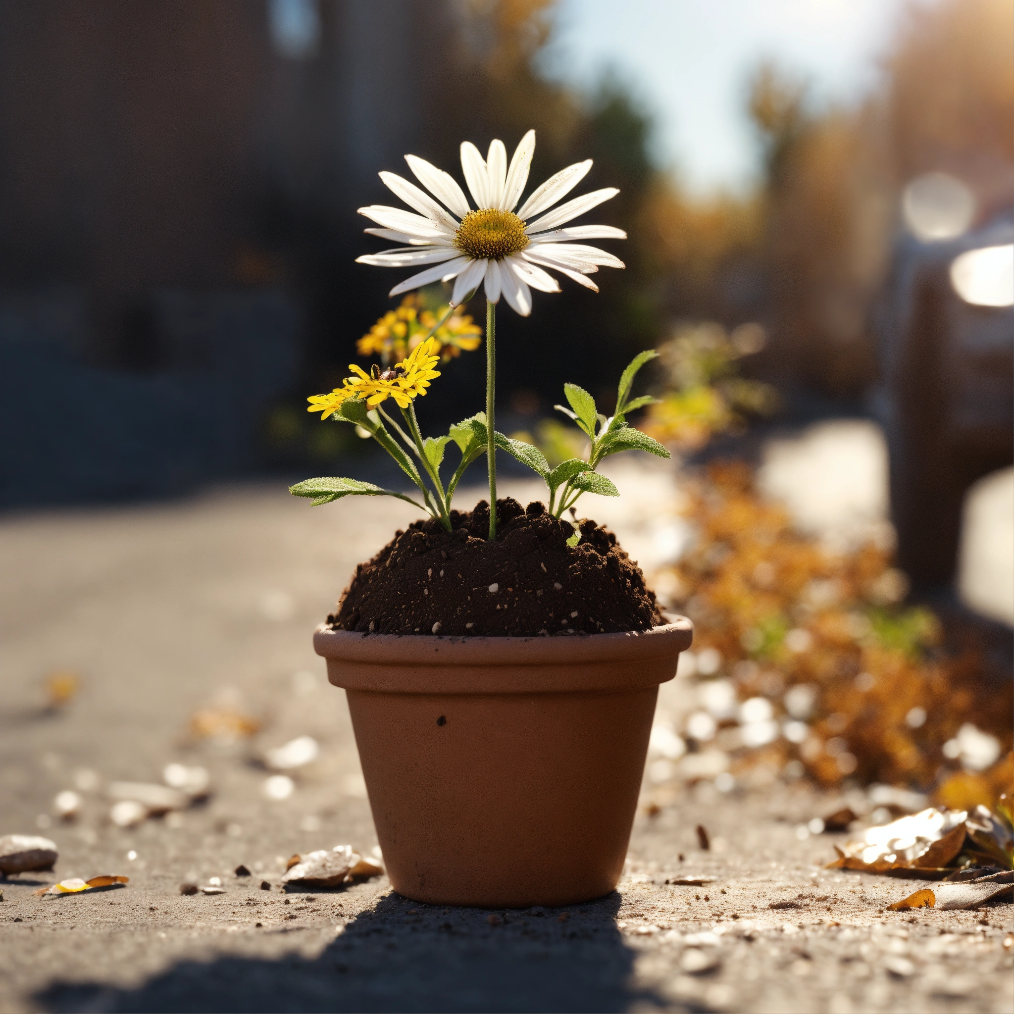 A micro-tiny clay pot full of dirt with a beautiful daisie planted in it, shining in the autumn sun on a road in an abandoned city, 8k resolution, hyper realistic, day, 35mm film, editorial, high fashion, 2023, off white by virgil abloh, 8k, extremely detailed, realistic photo, 4k realistic photo, hyper detailed