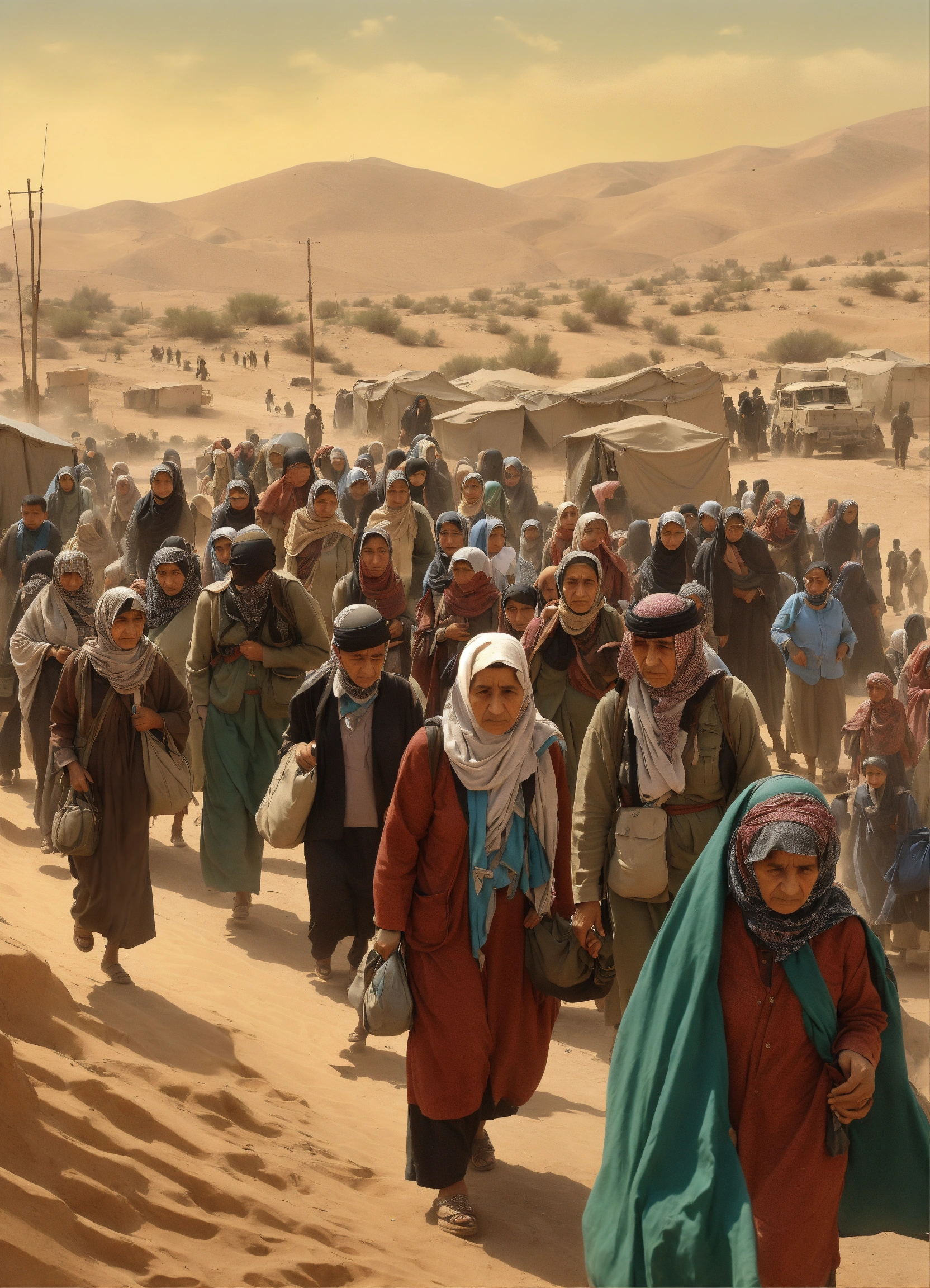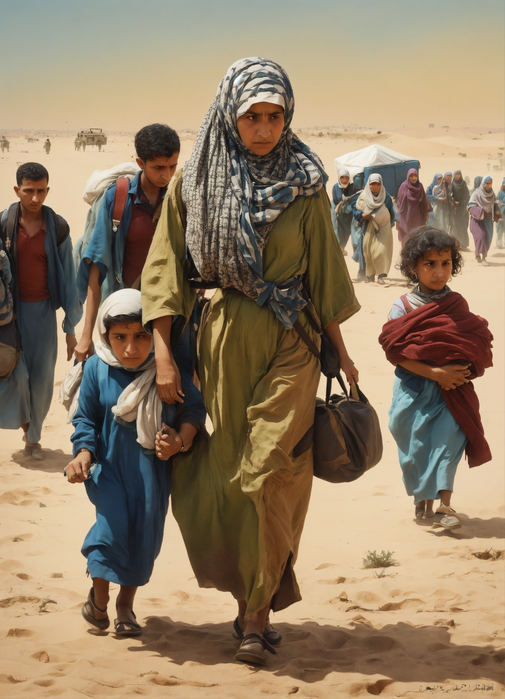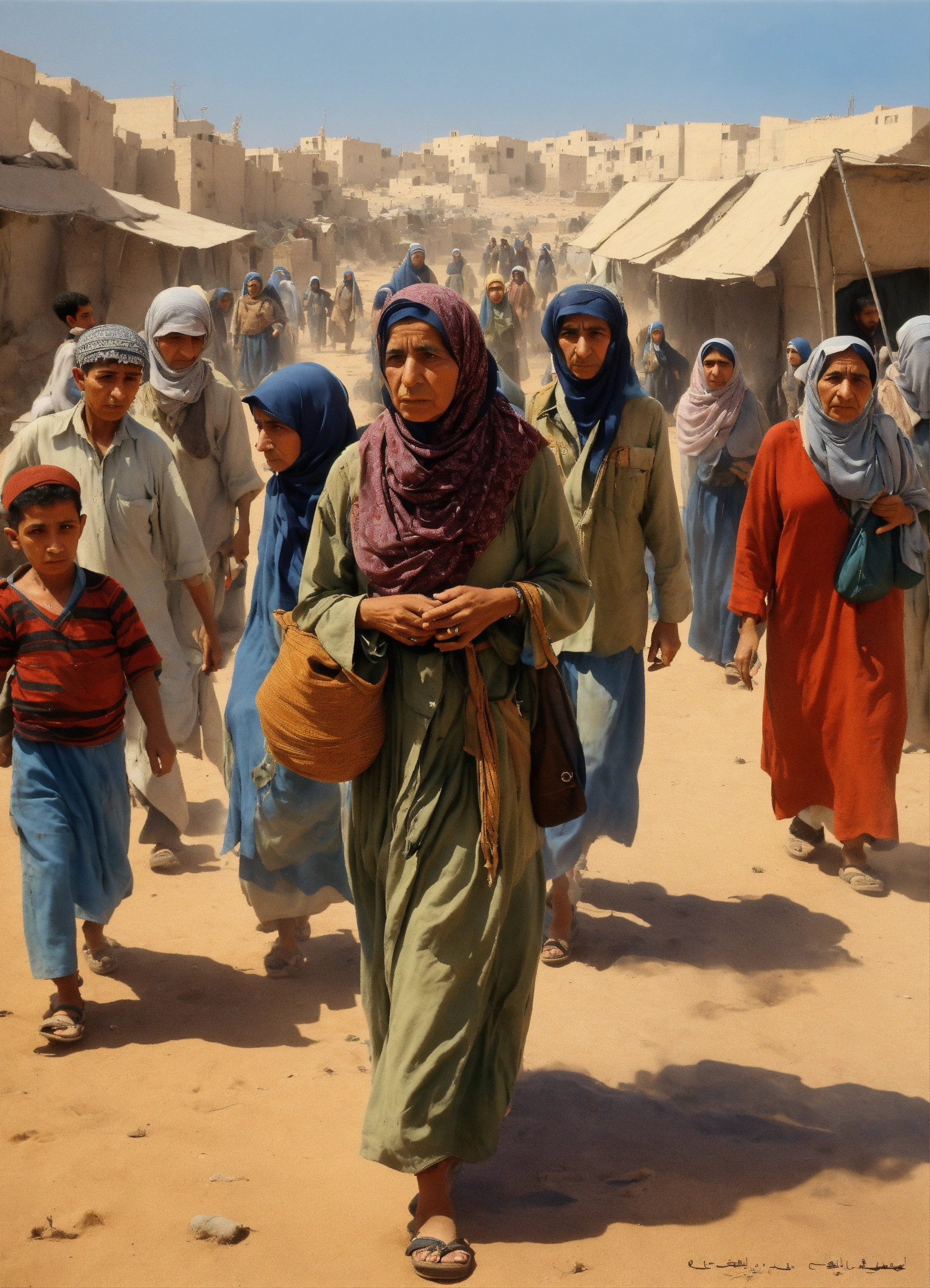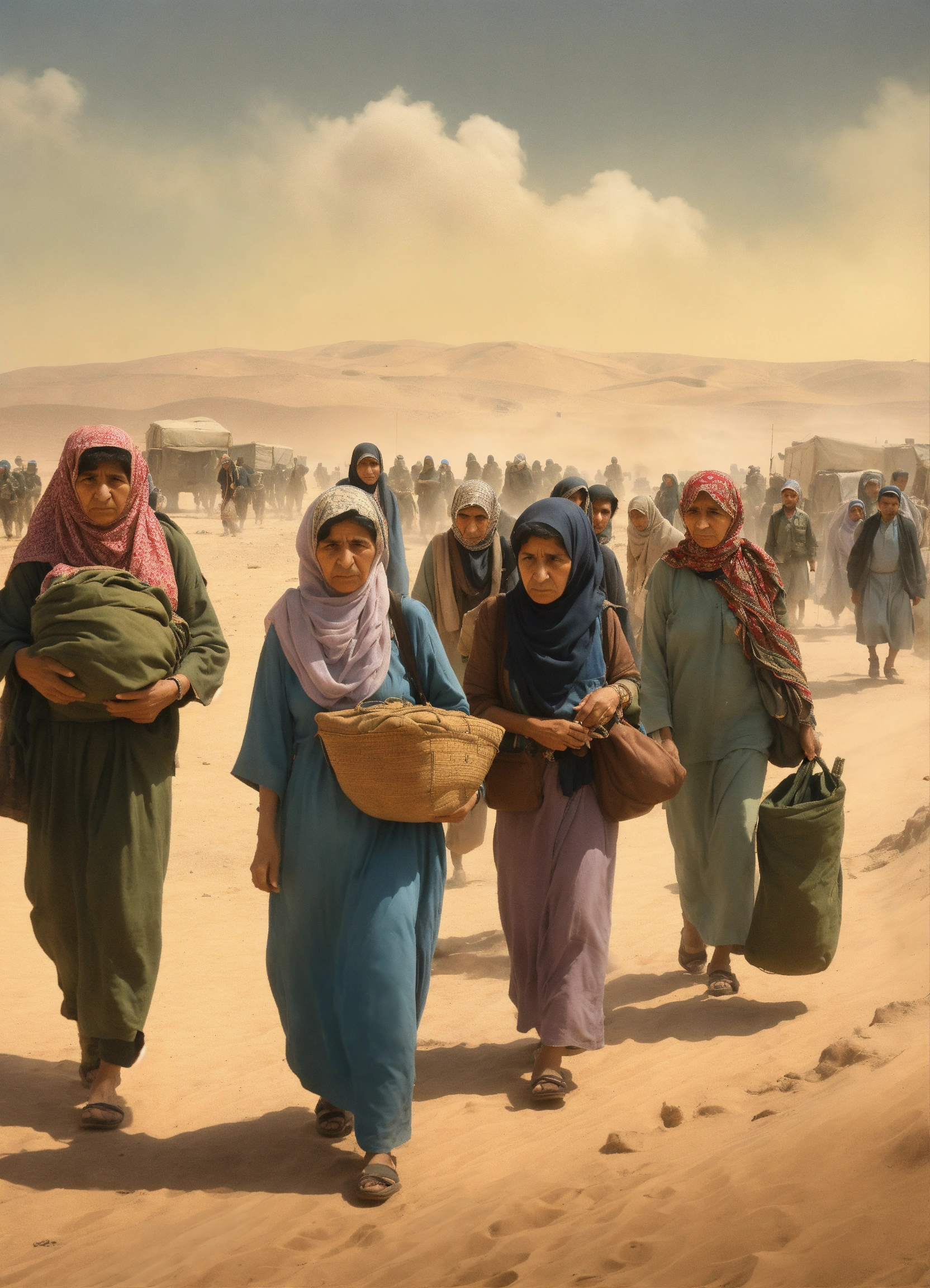 "a design depicting palestinian refugees of various ages, both young and old, walking subdued with sadness evident on their faces in groups. they carry their belongings and have been displaced from the desert by israeli soldiers who stand armed along the way, following the 1948 war."