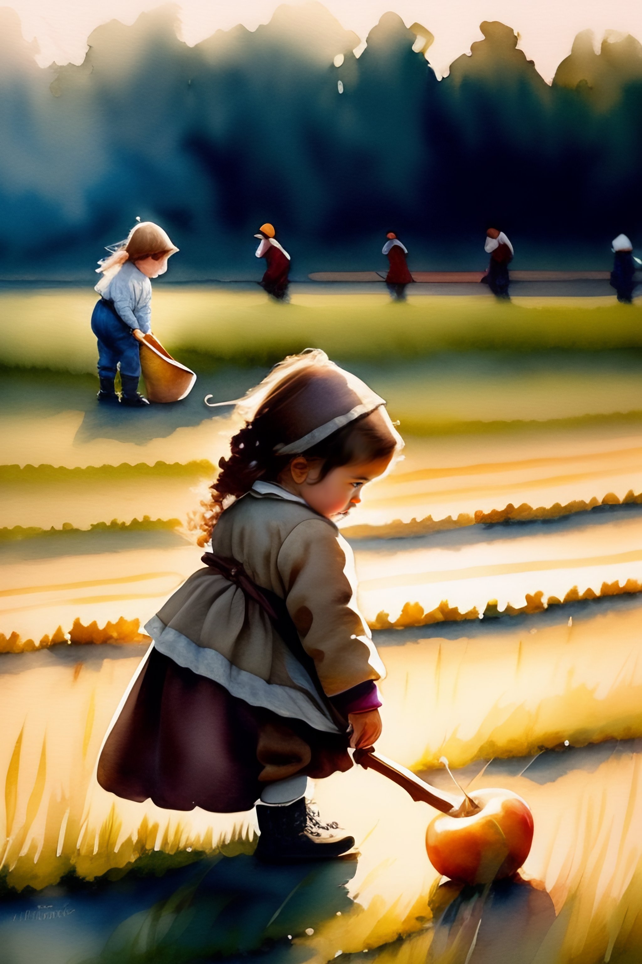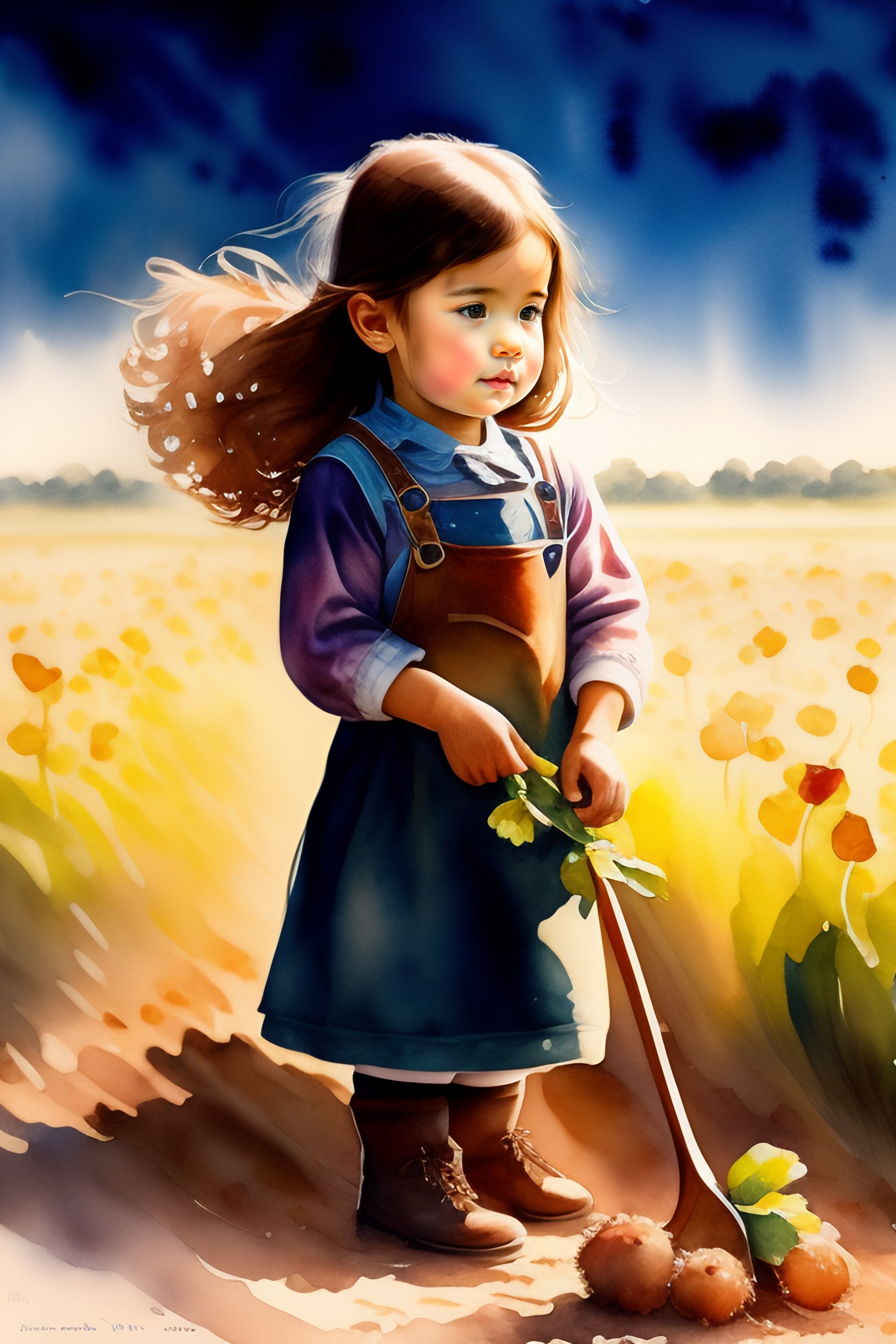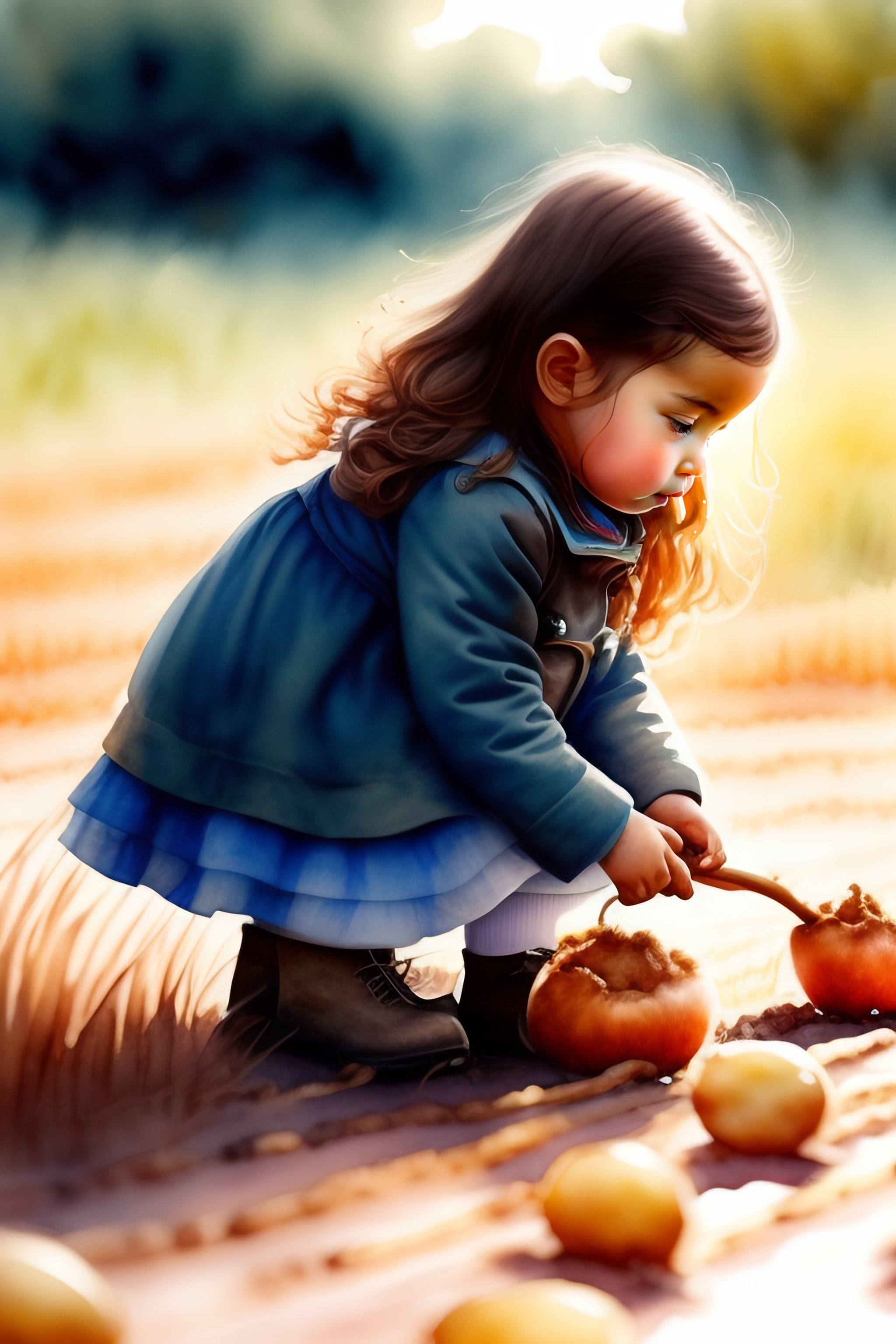 A watercolor of a long straight brown hair little girl picking potatoes in a ploughed field, watercolor pen by brad mesina trending on artstation