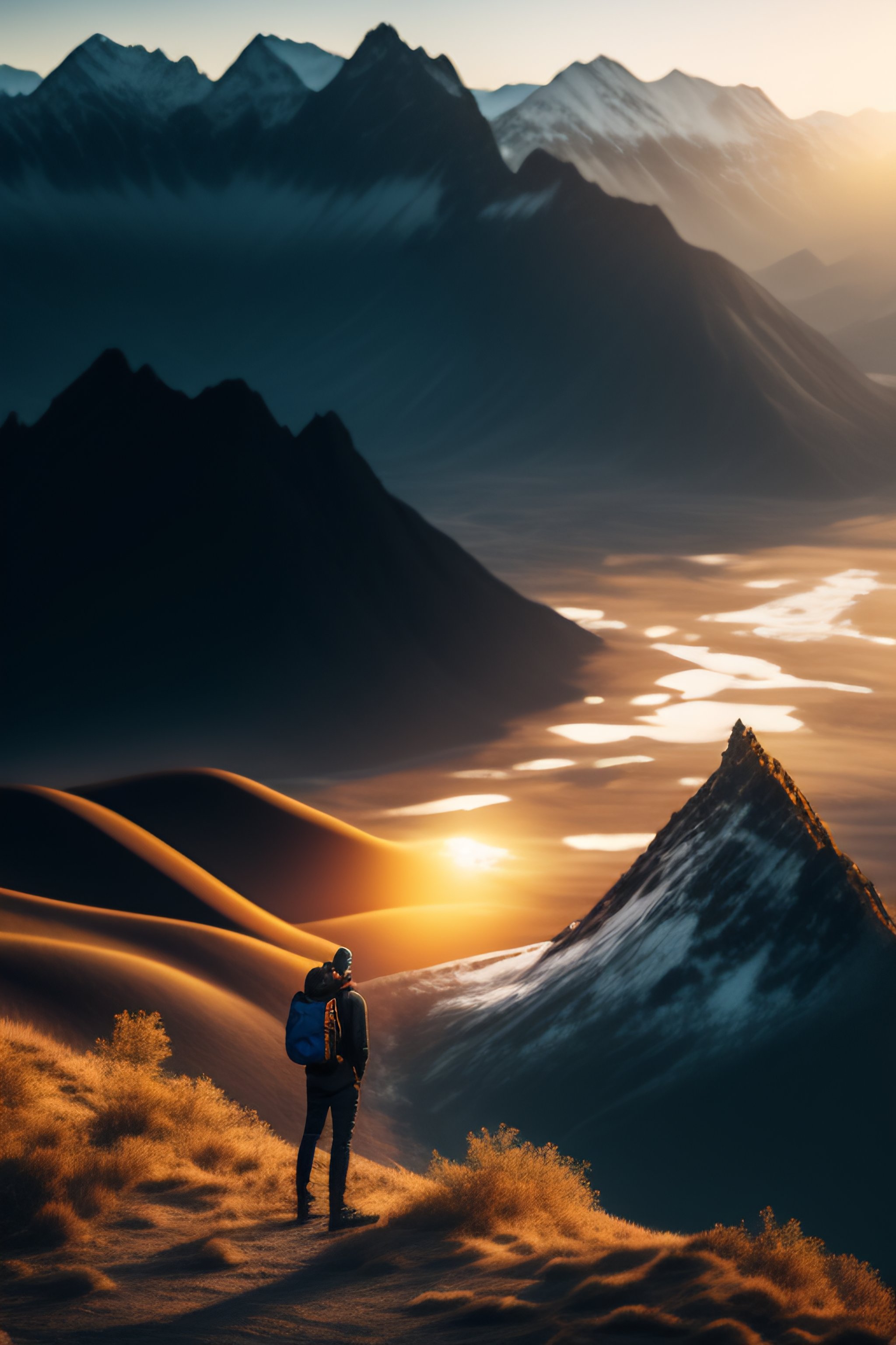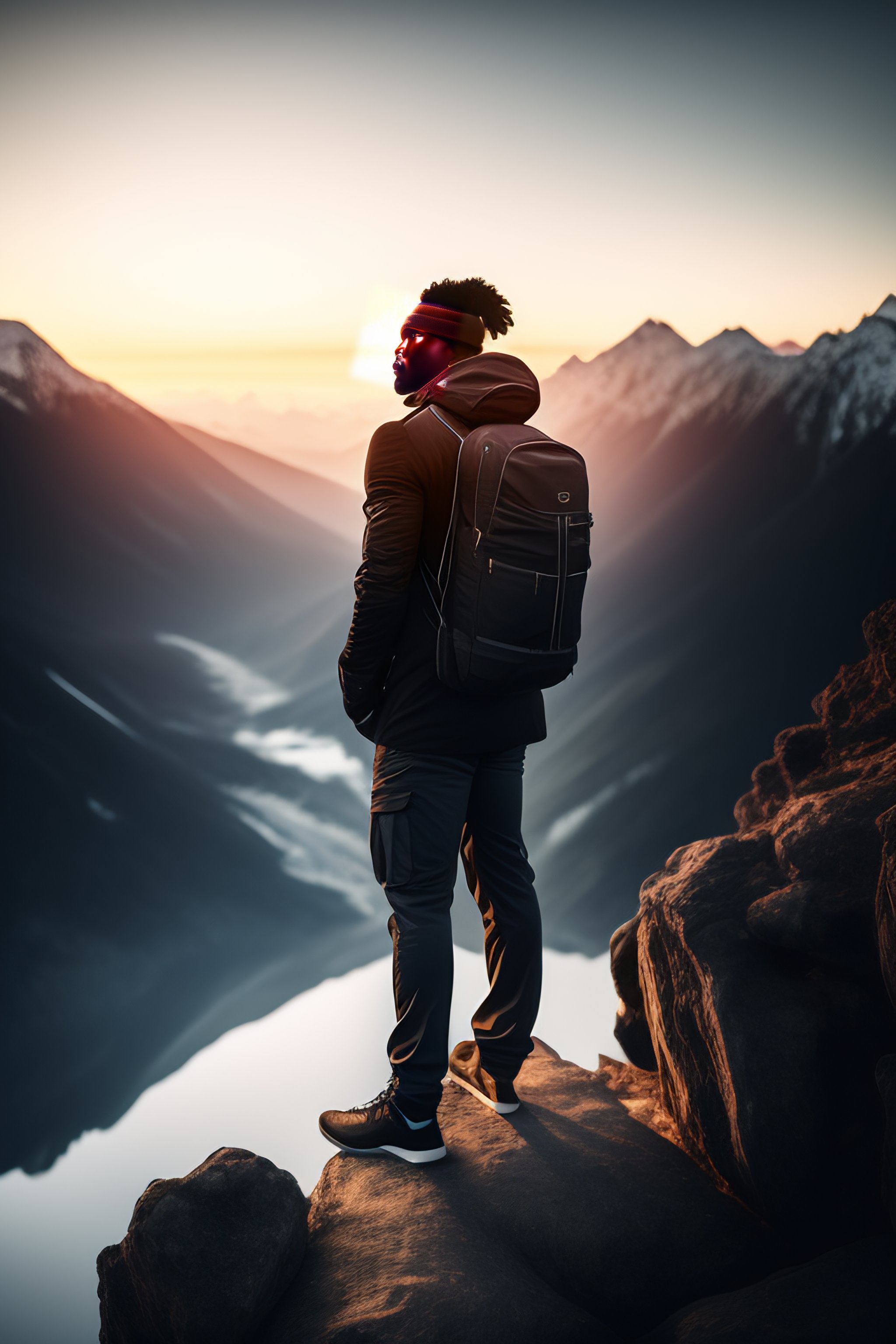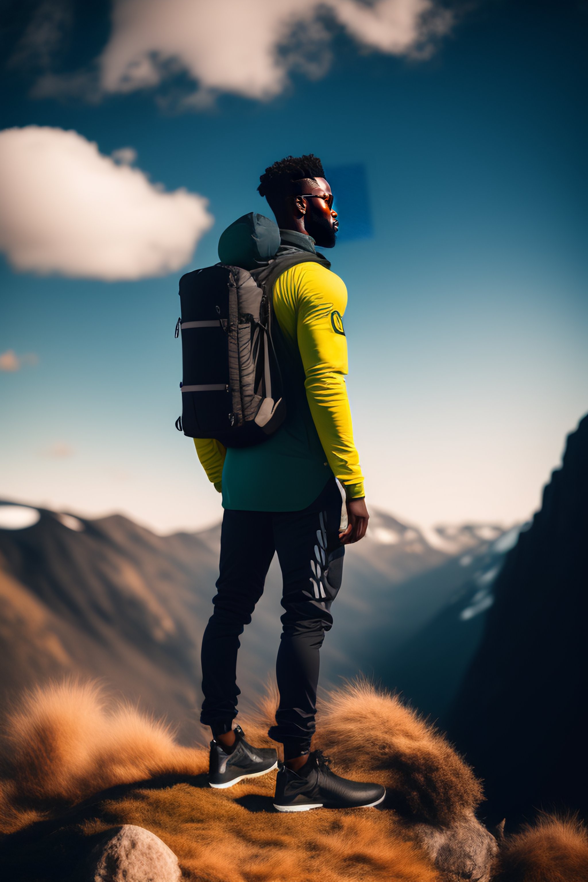 Realistic photo of black person standing on top of the mountain - highly detailed, crisp quality and smooth reflections, natural quality render