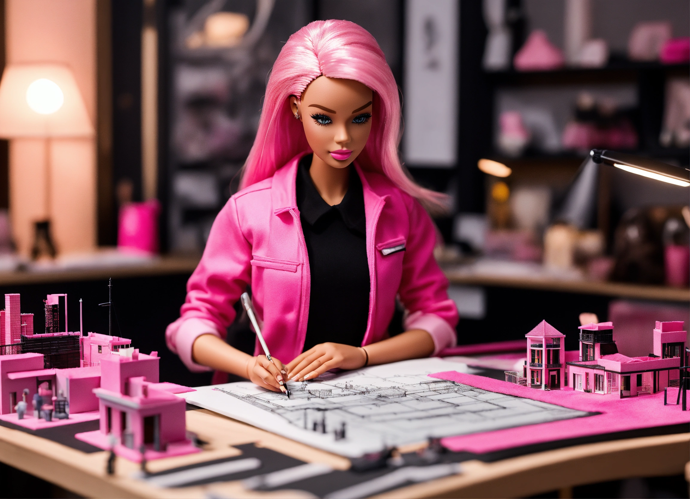 Barbie dolls, career as a architecture designer, pink, and black fashionable, gorgeous, working in her studio drawing architecture designs
